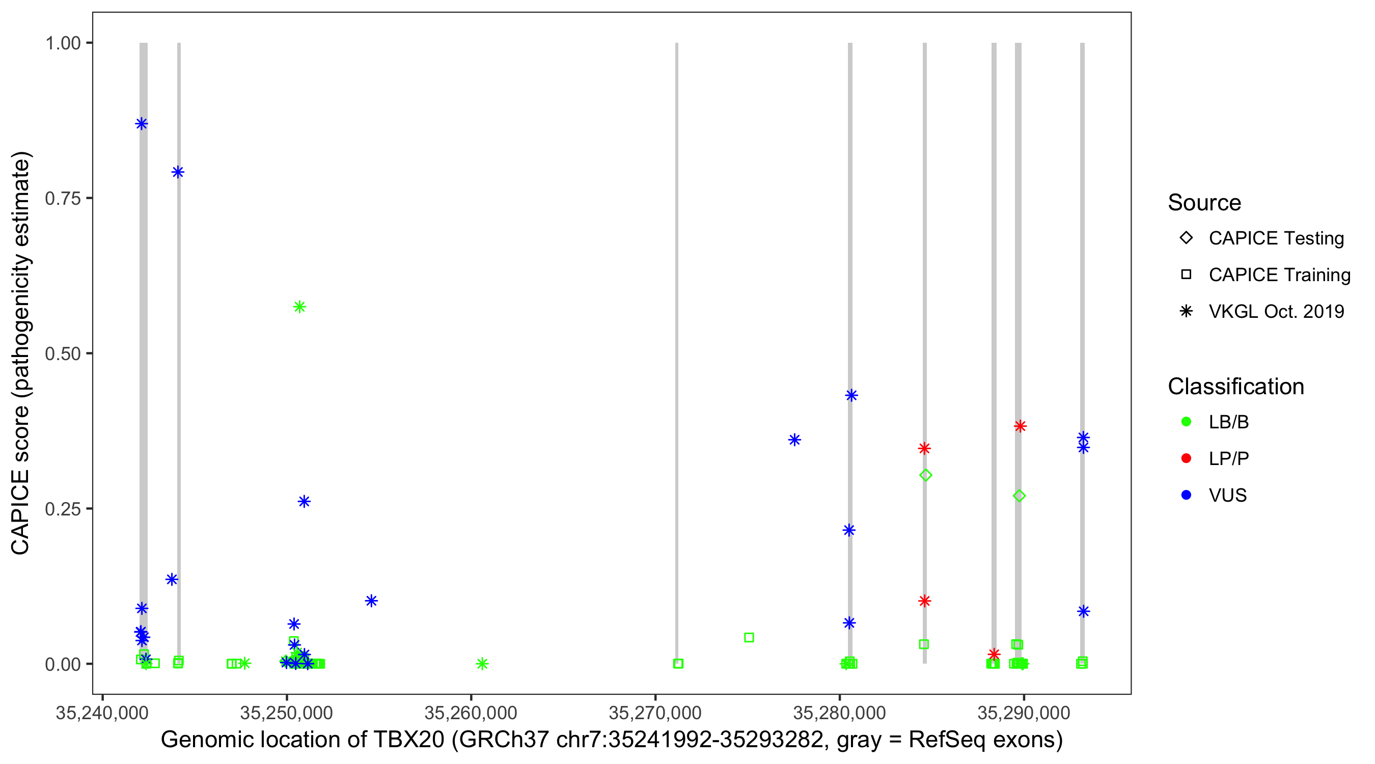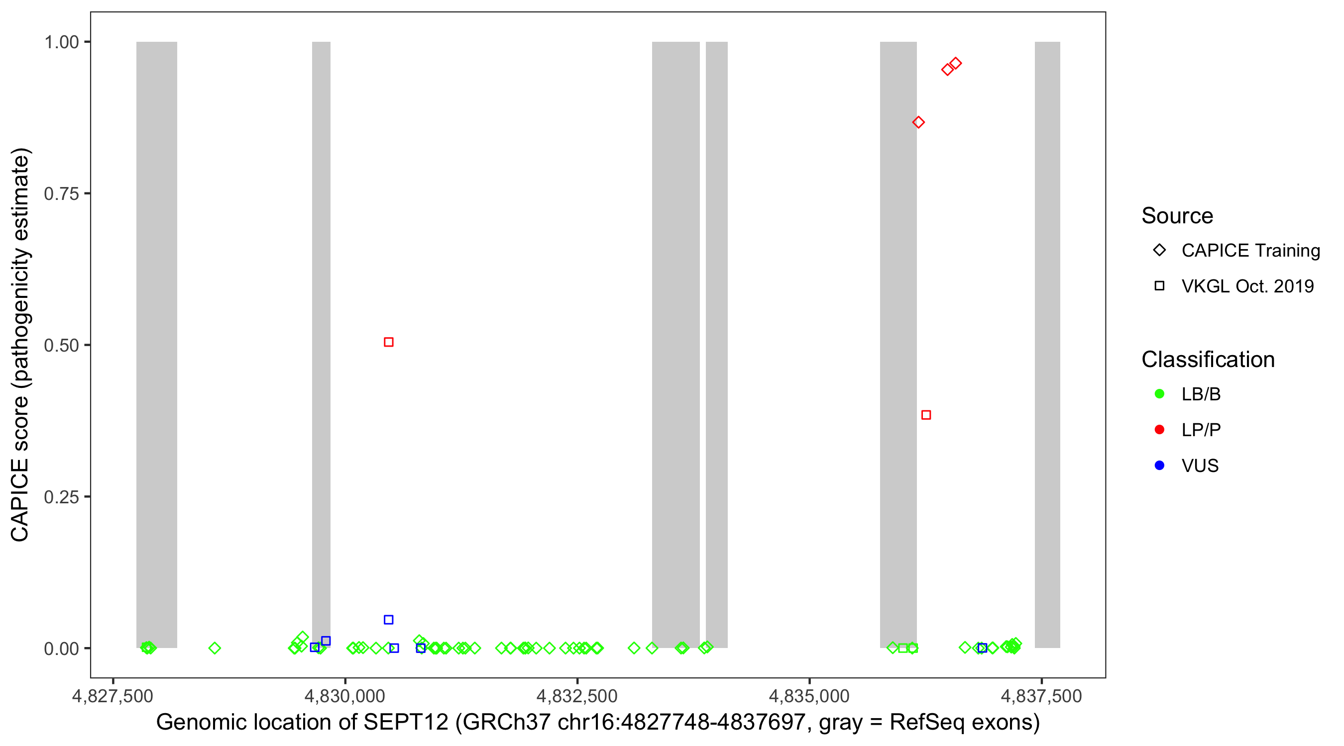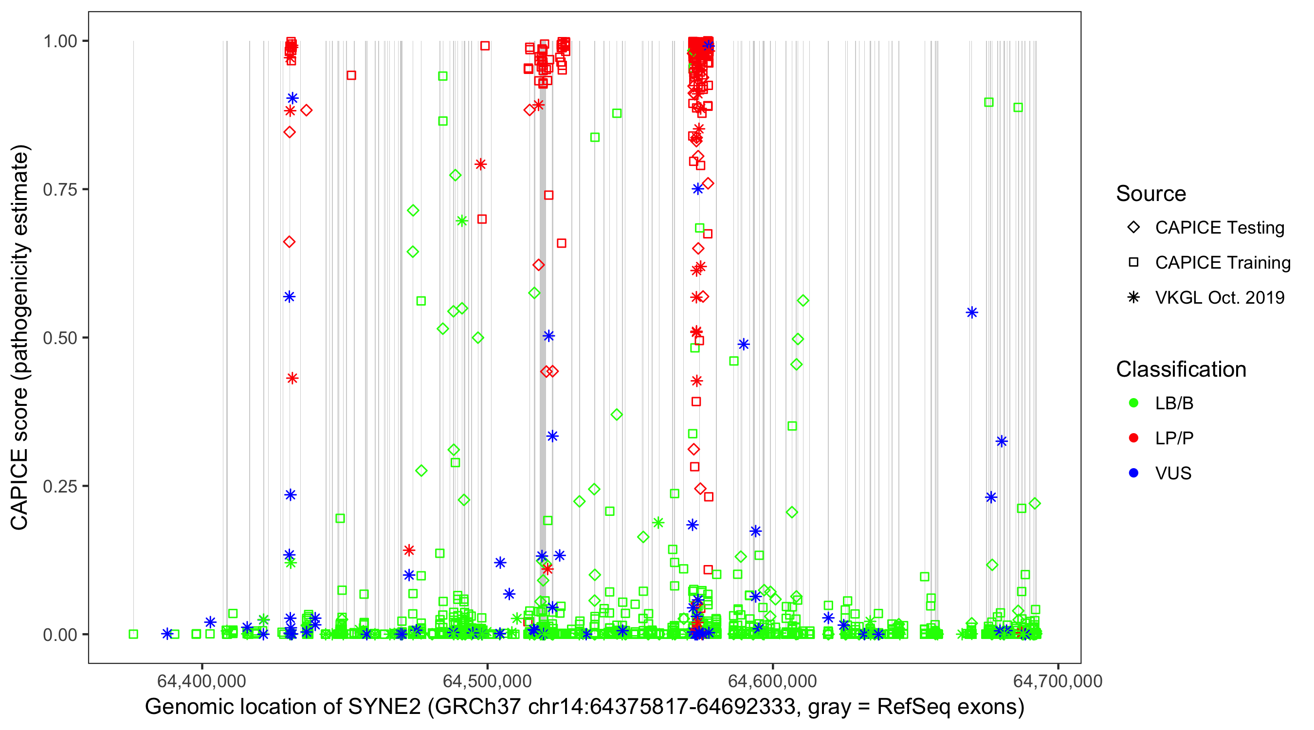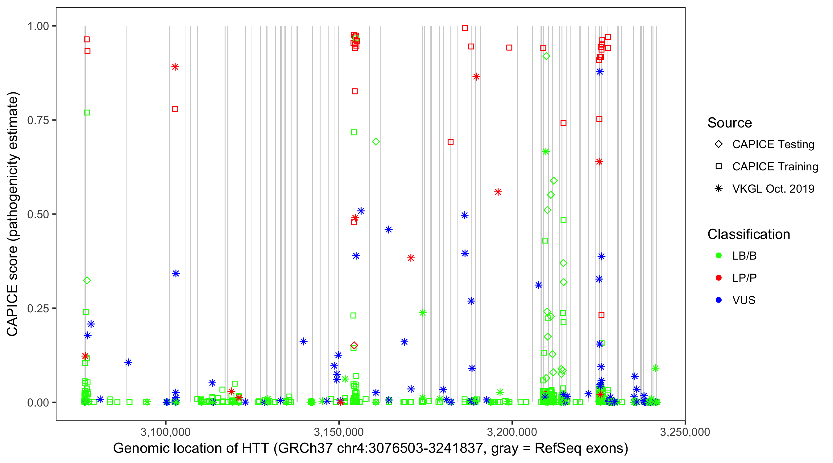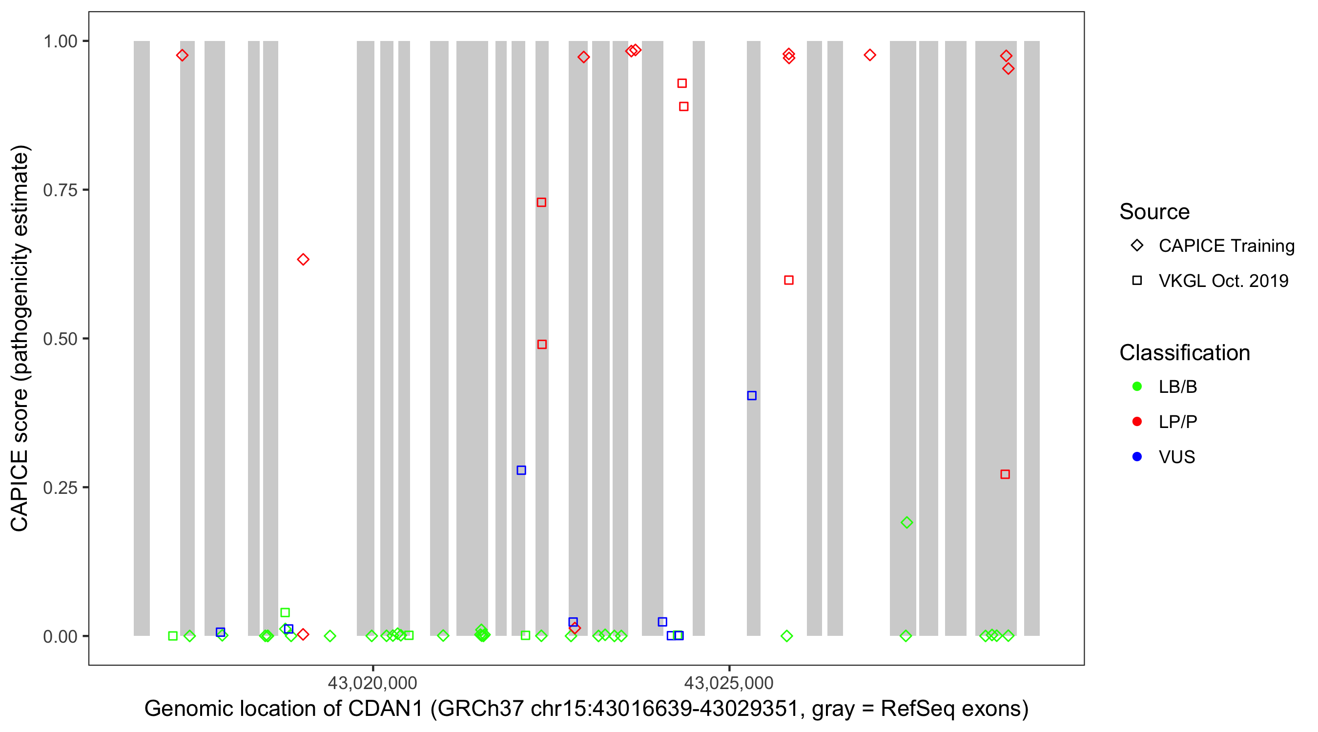 Shown are CAPICE train/test variants plus VKGL Oct 2019.