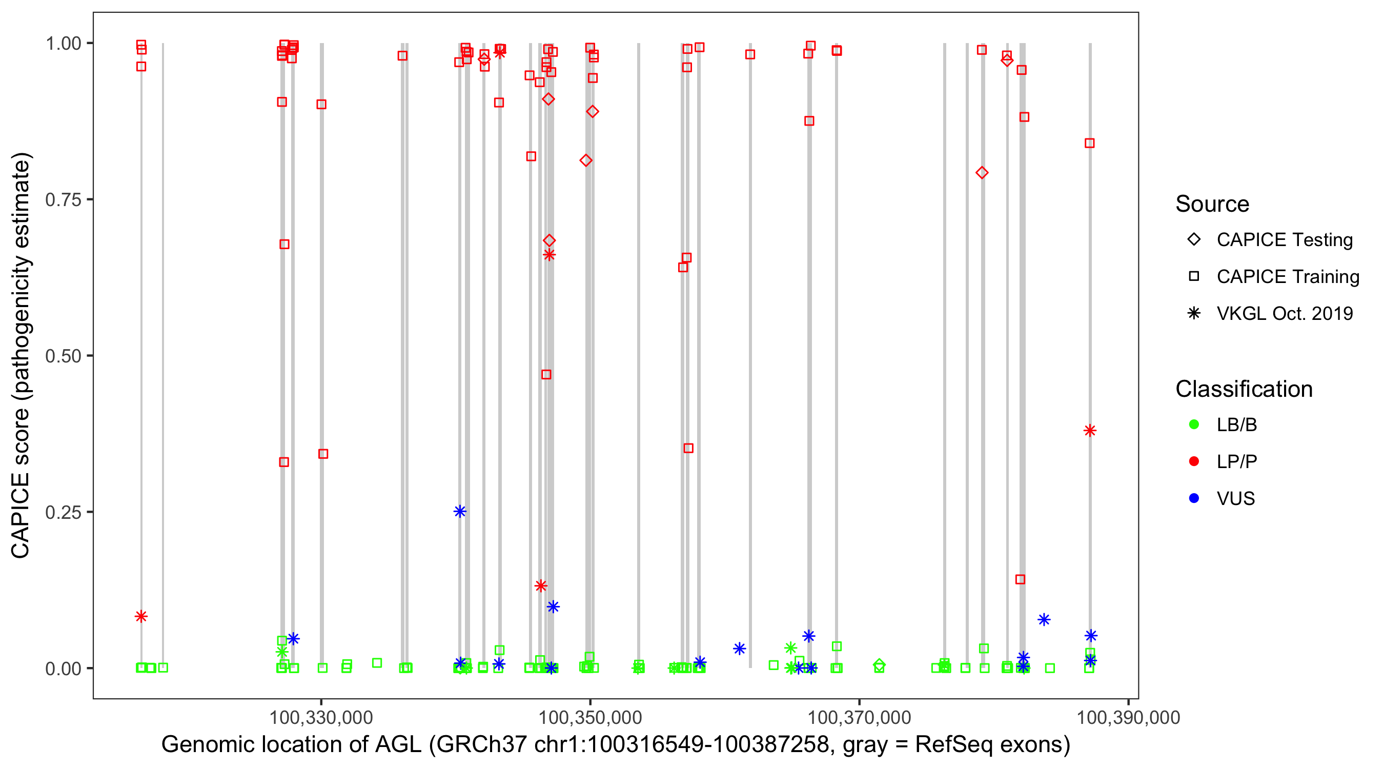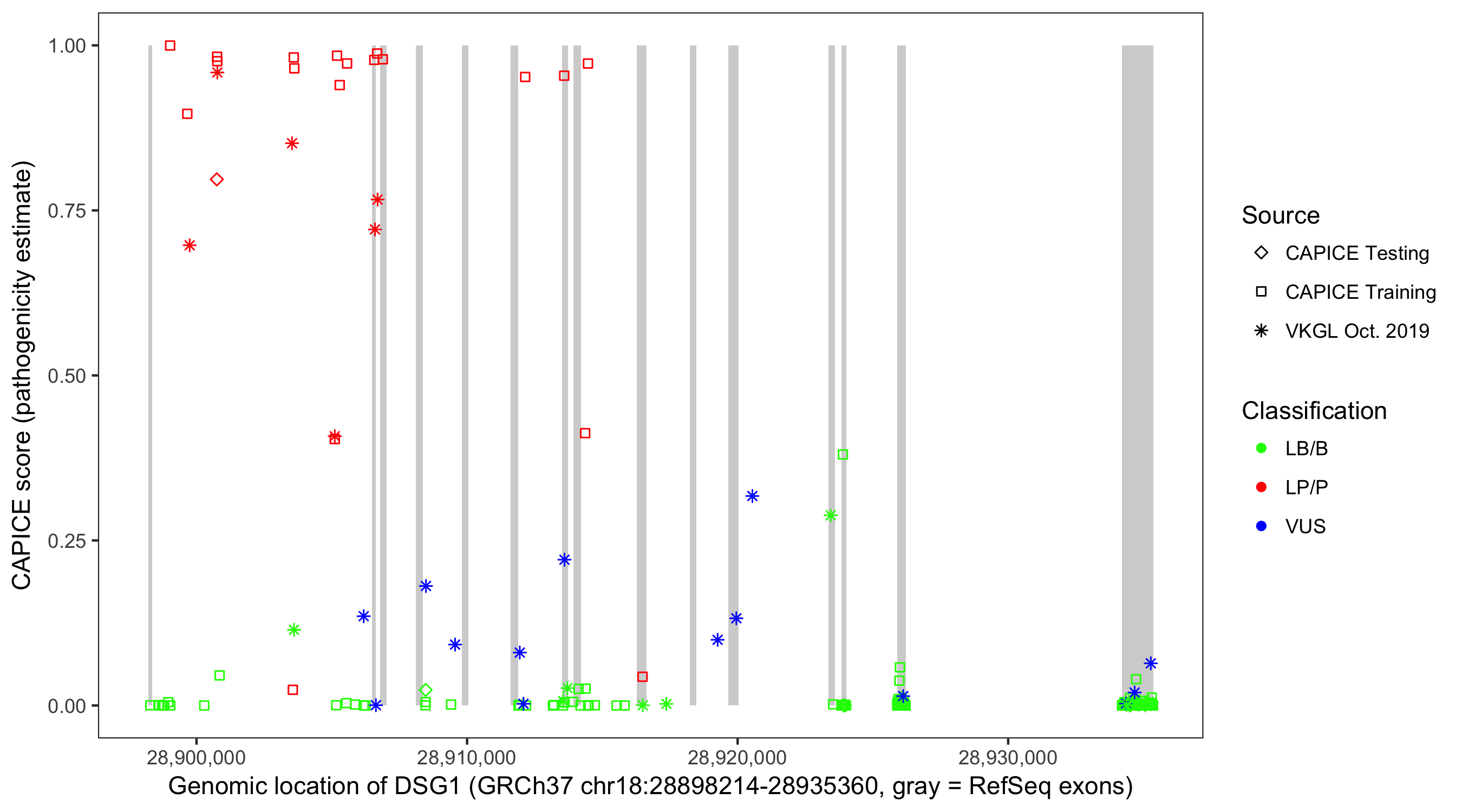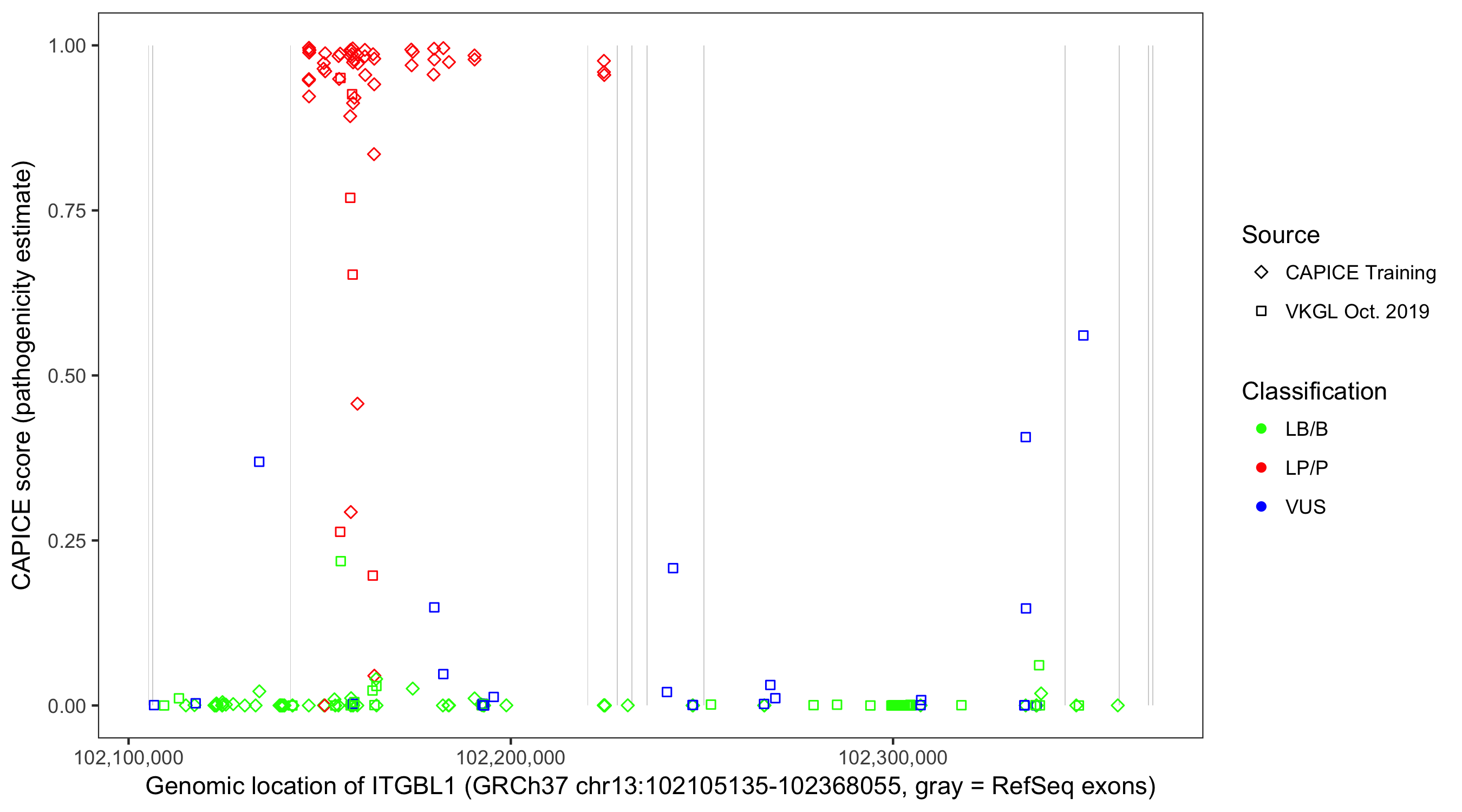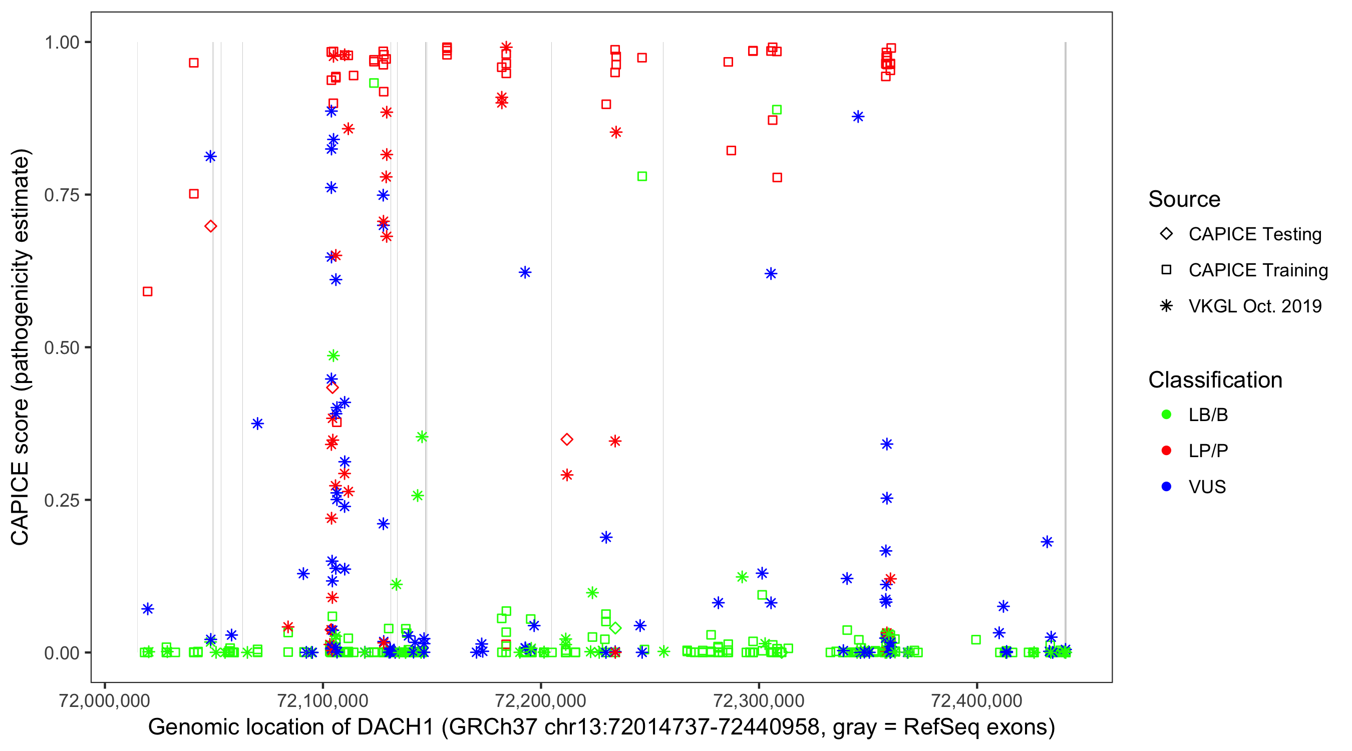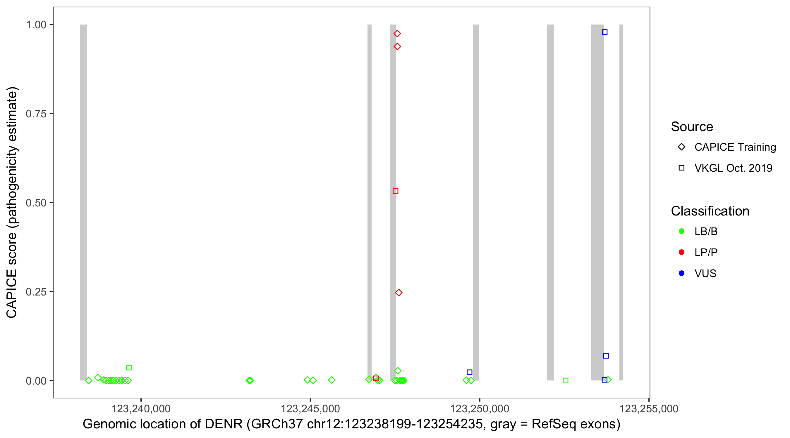 Shown are CAPICE train/test variants plus VKGL Oct 2019.