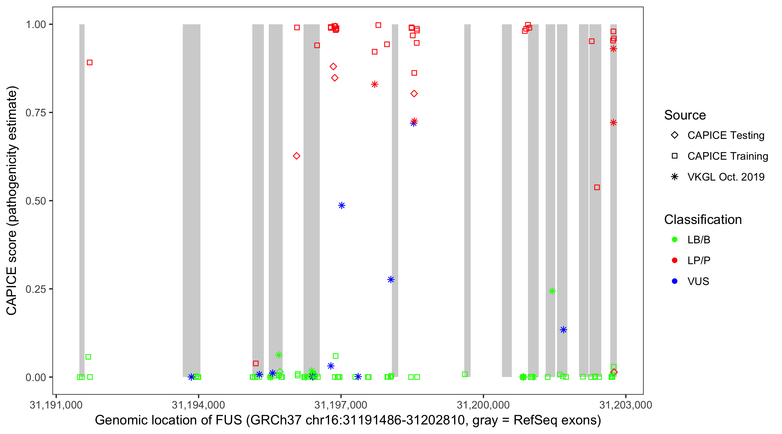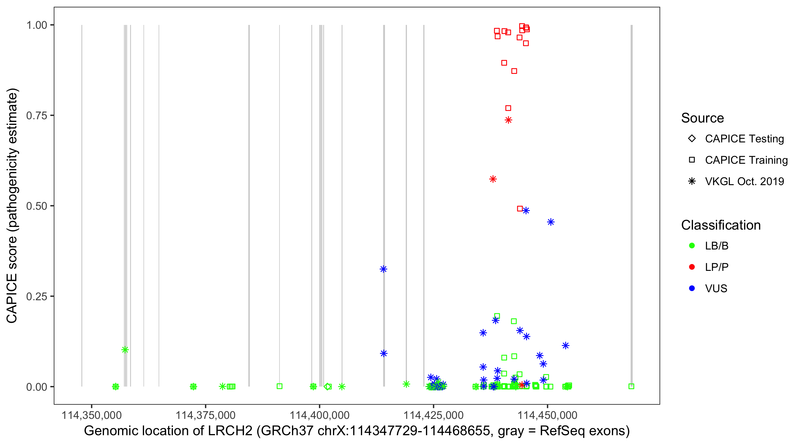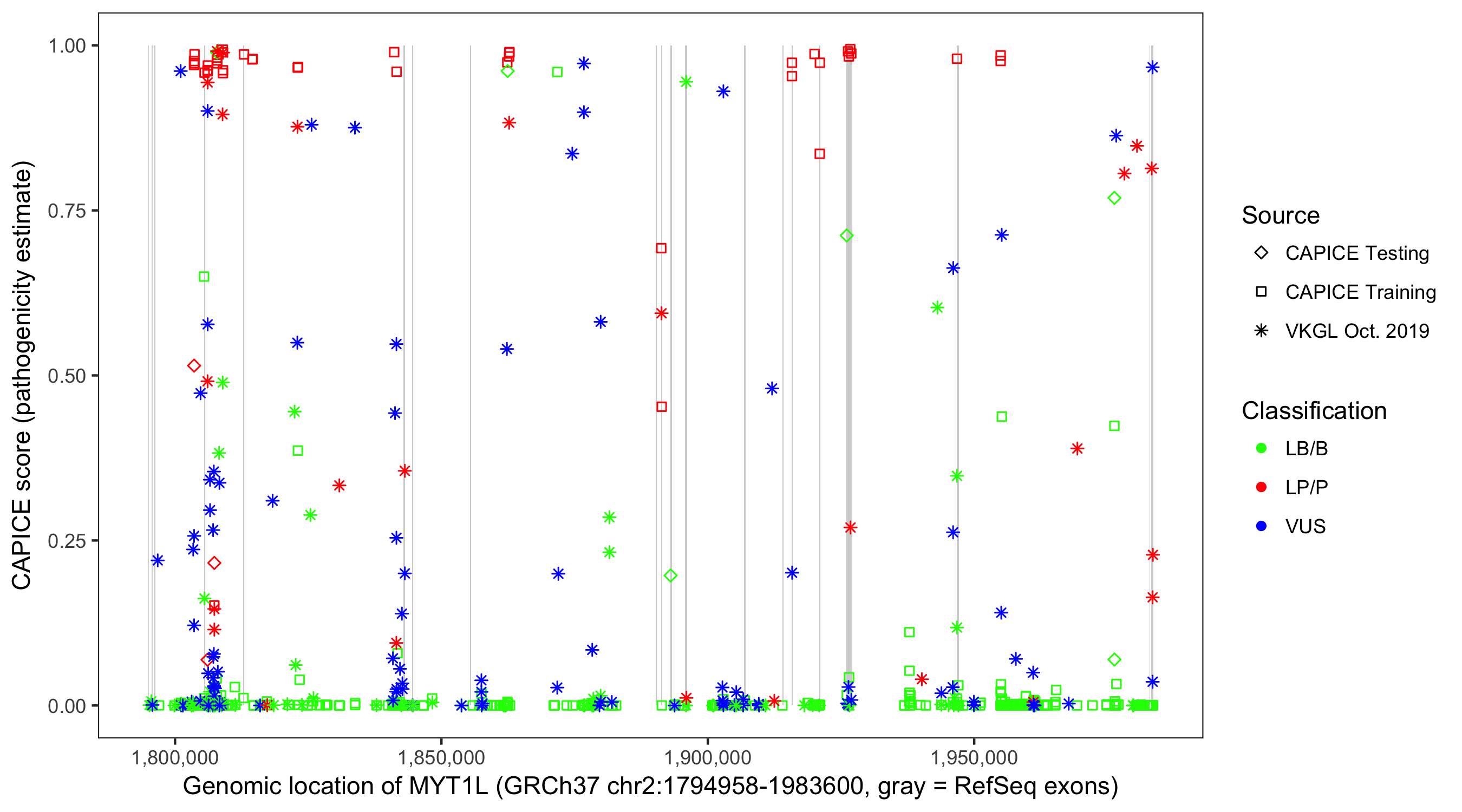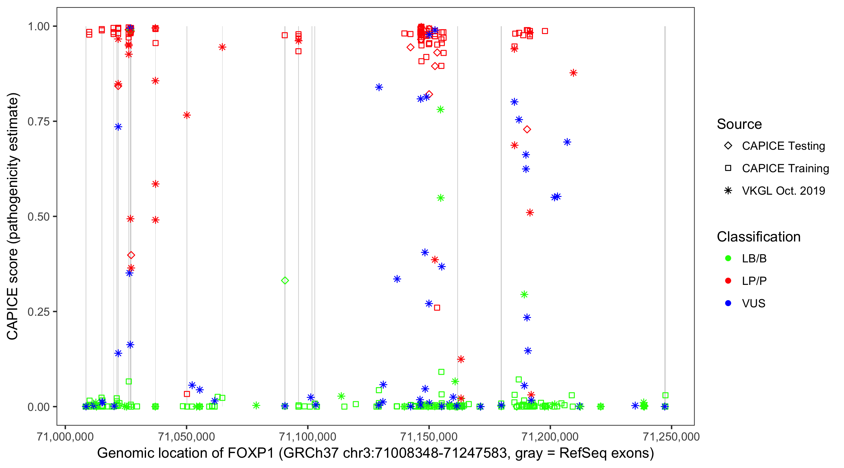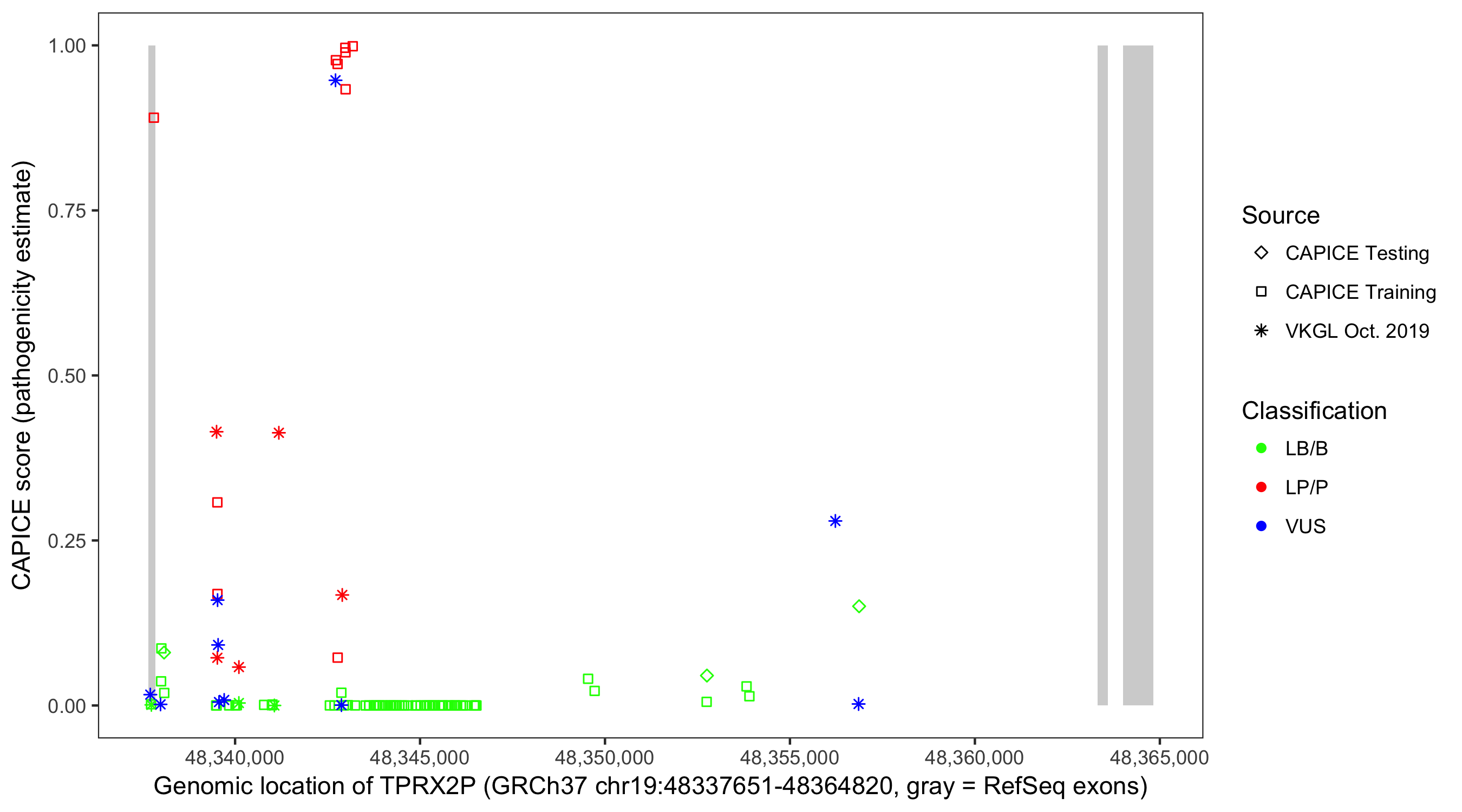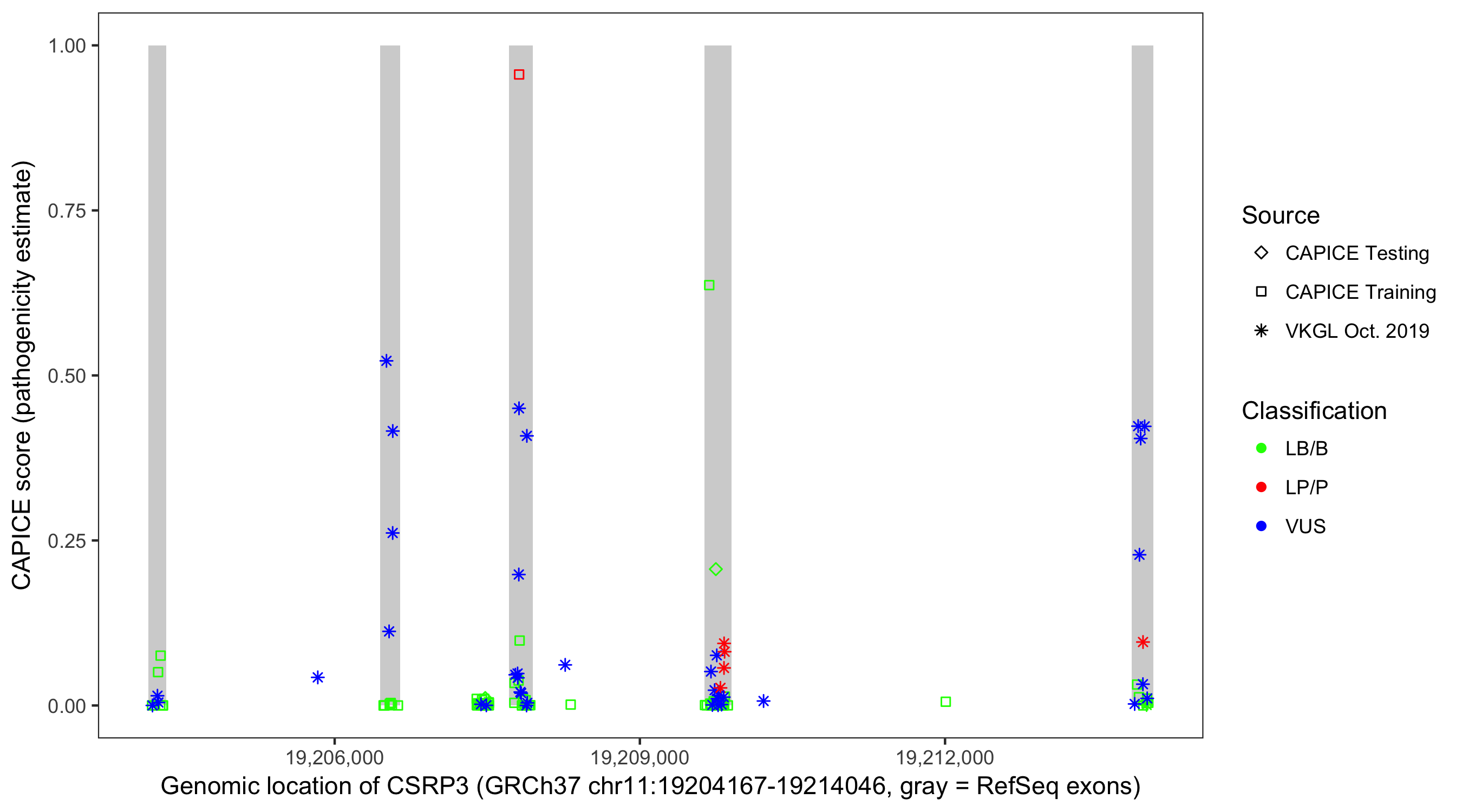 Shown are CAPICE train/test variants plus VKGL Oct 2019.