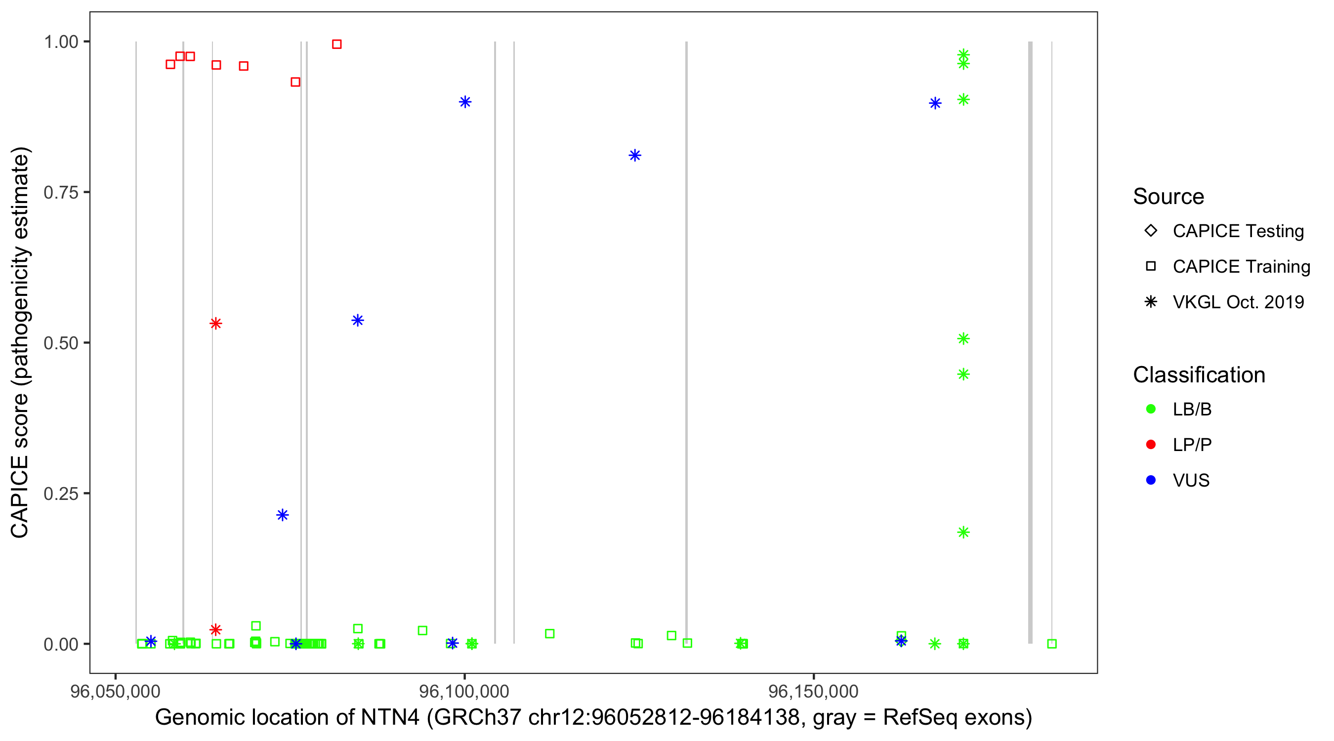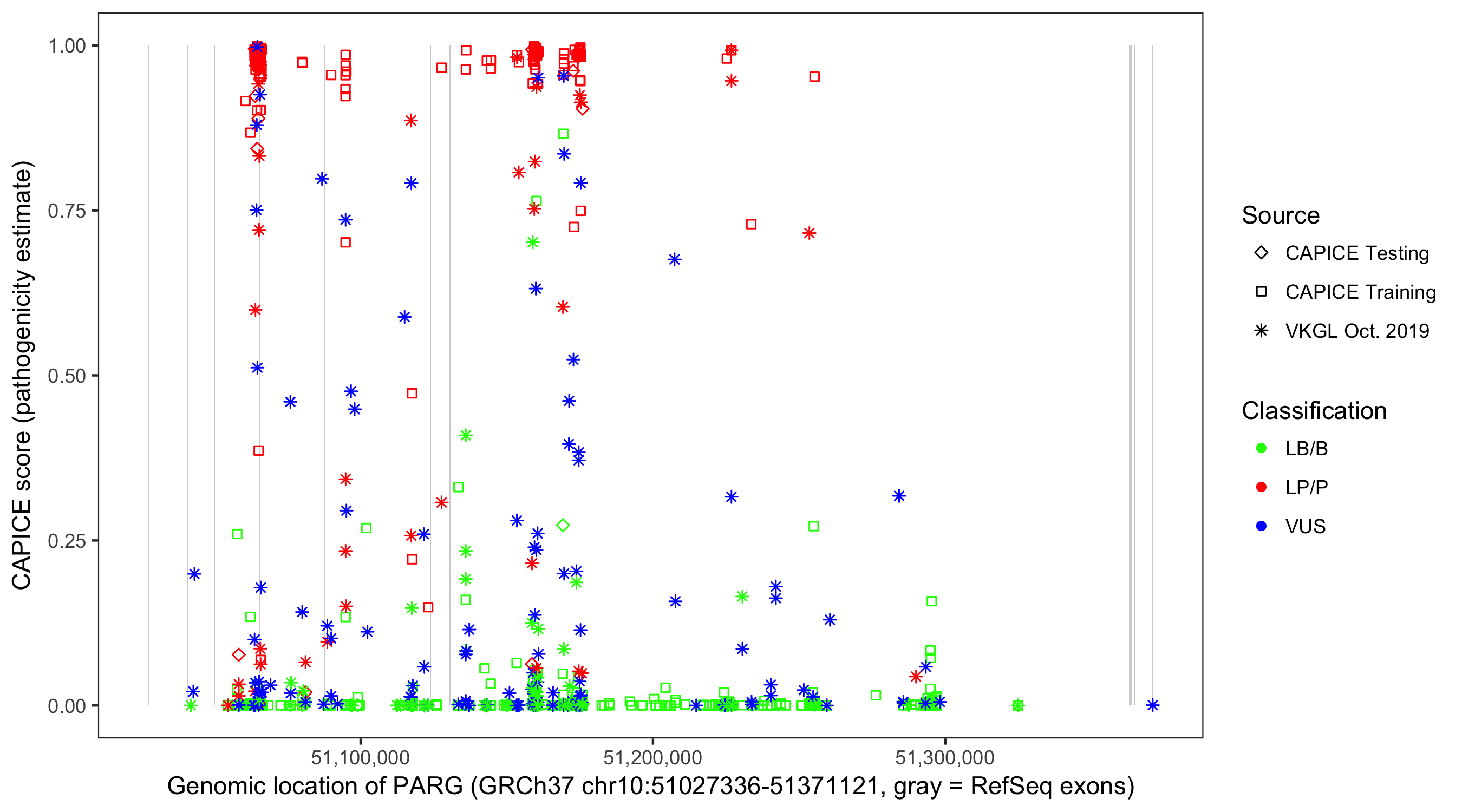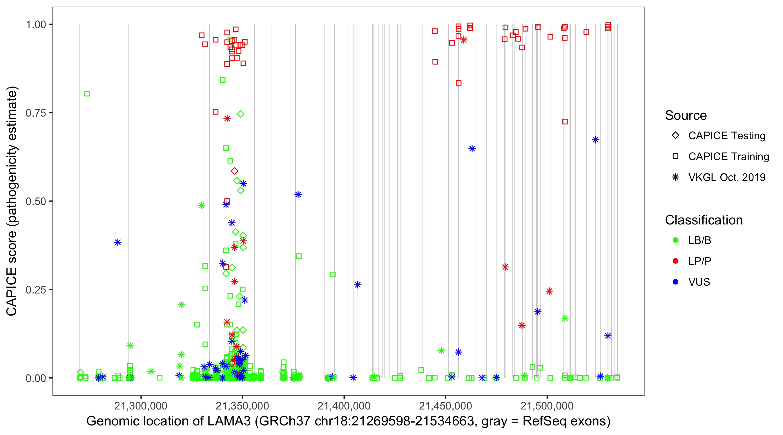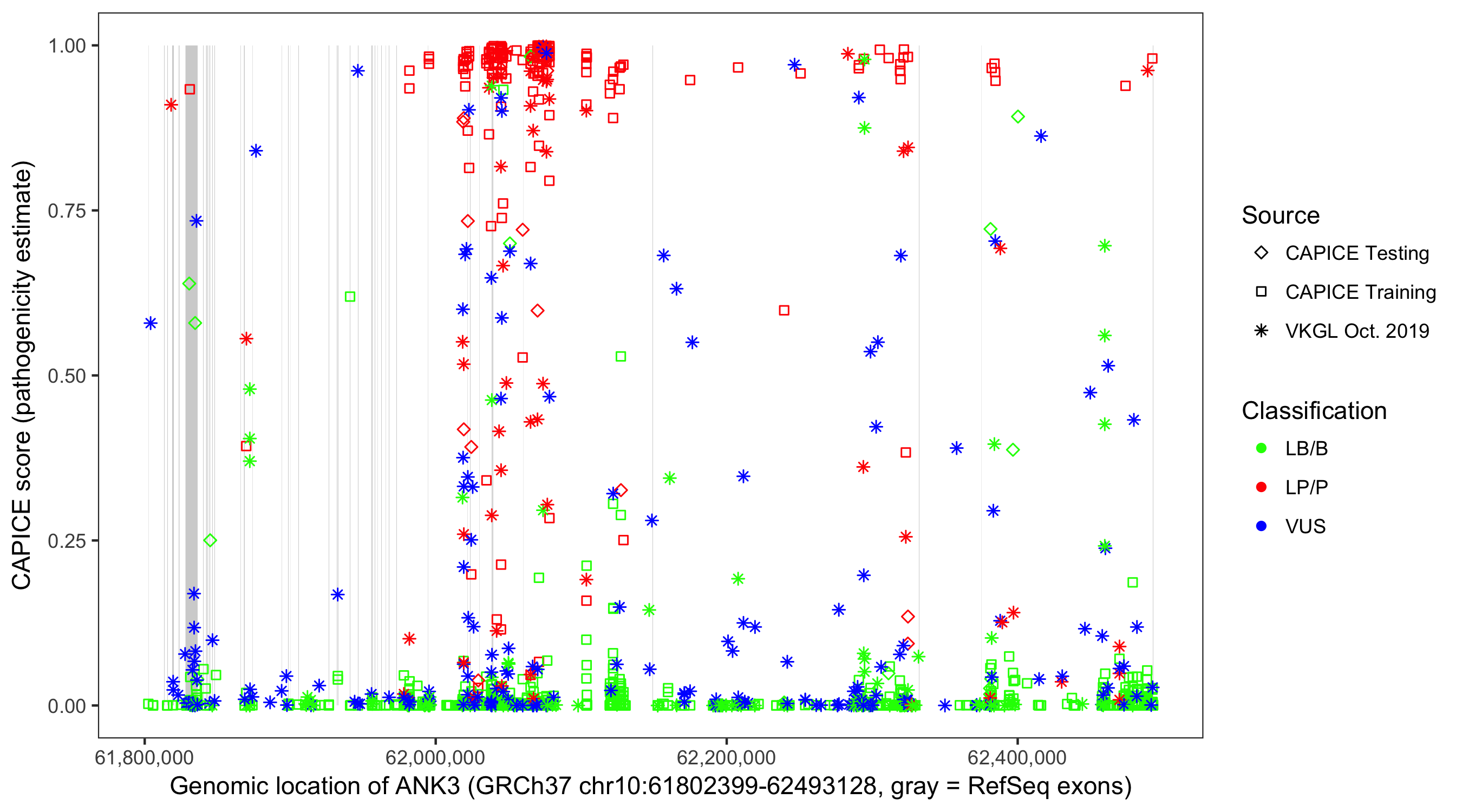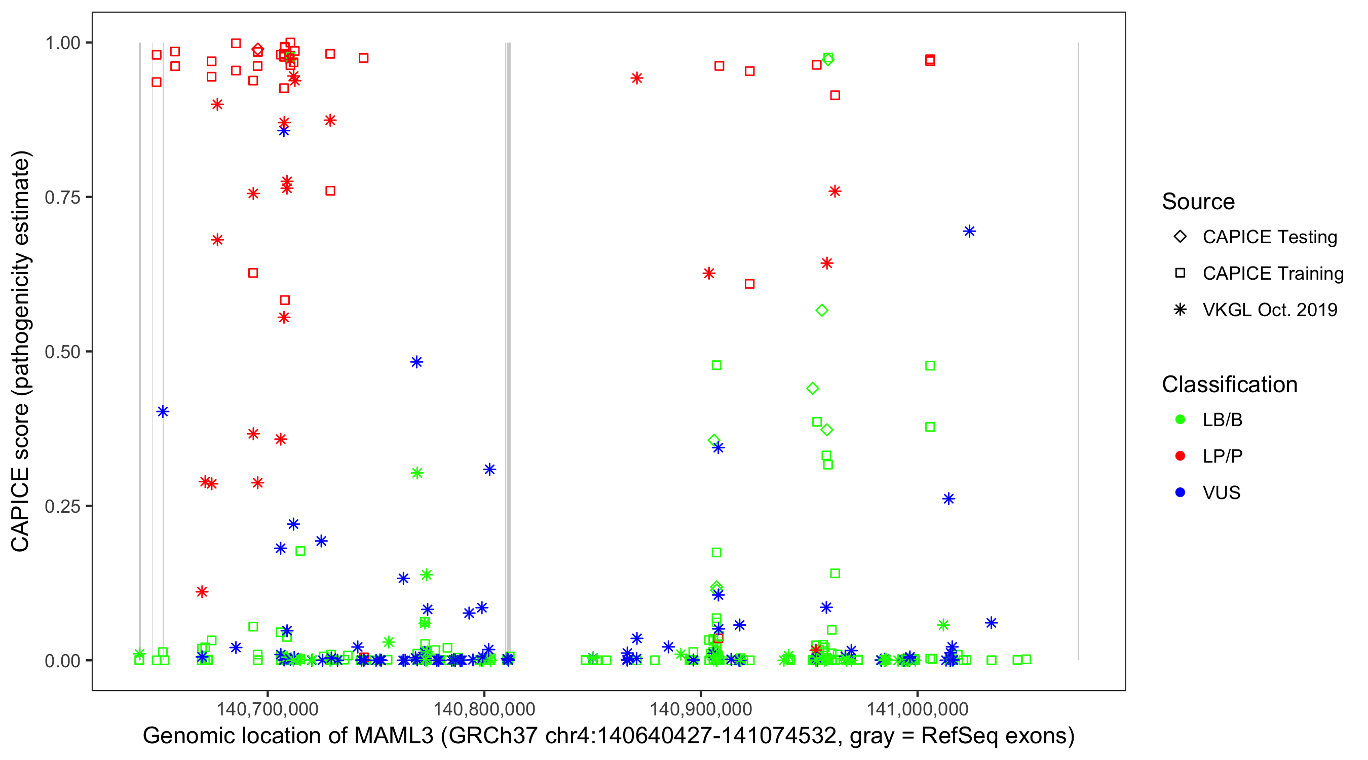 Shown are CAPICE train/test variants plus VKGL Oct 2019.