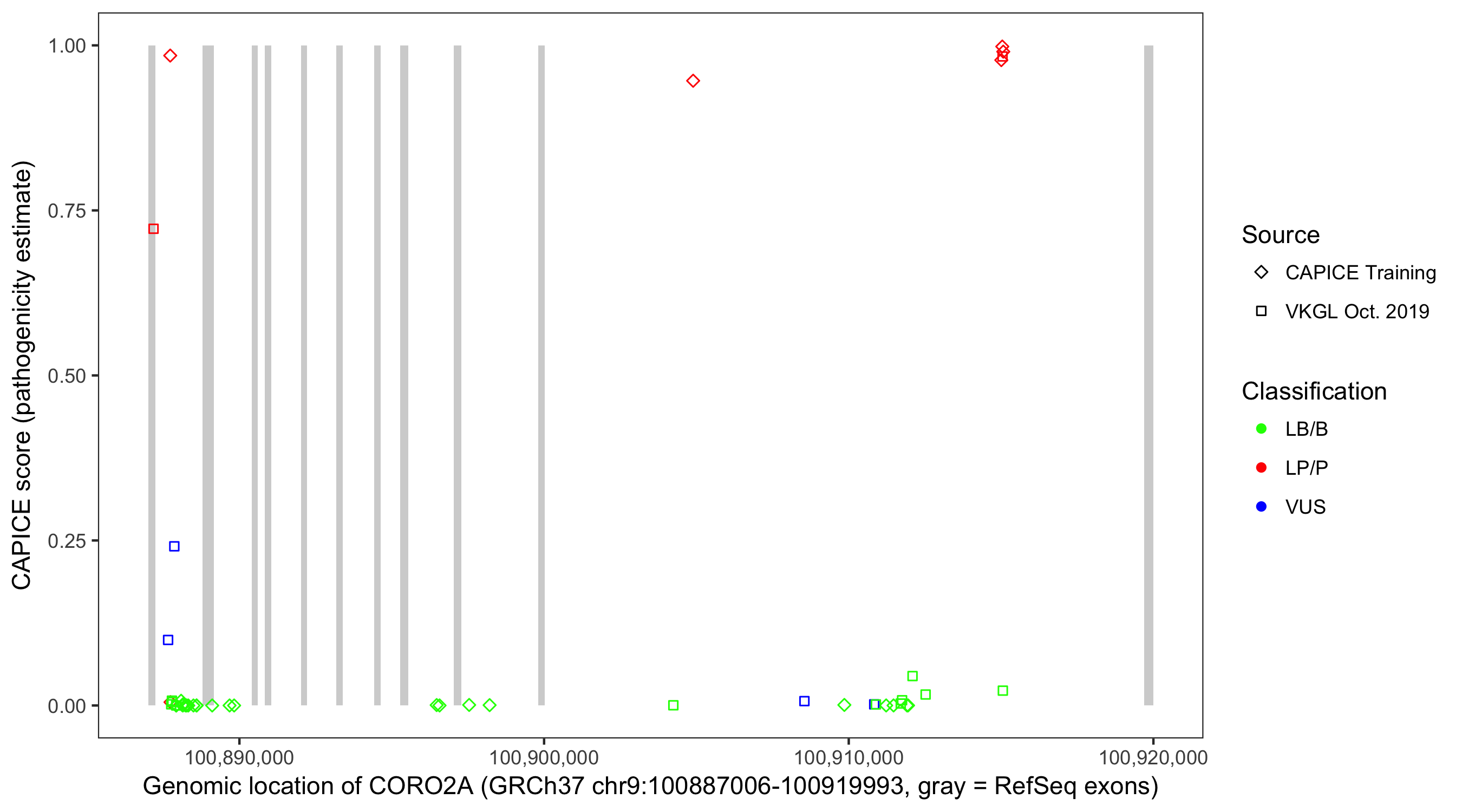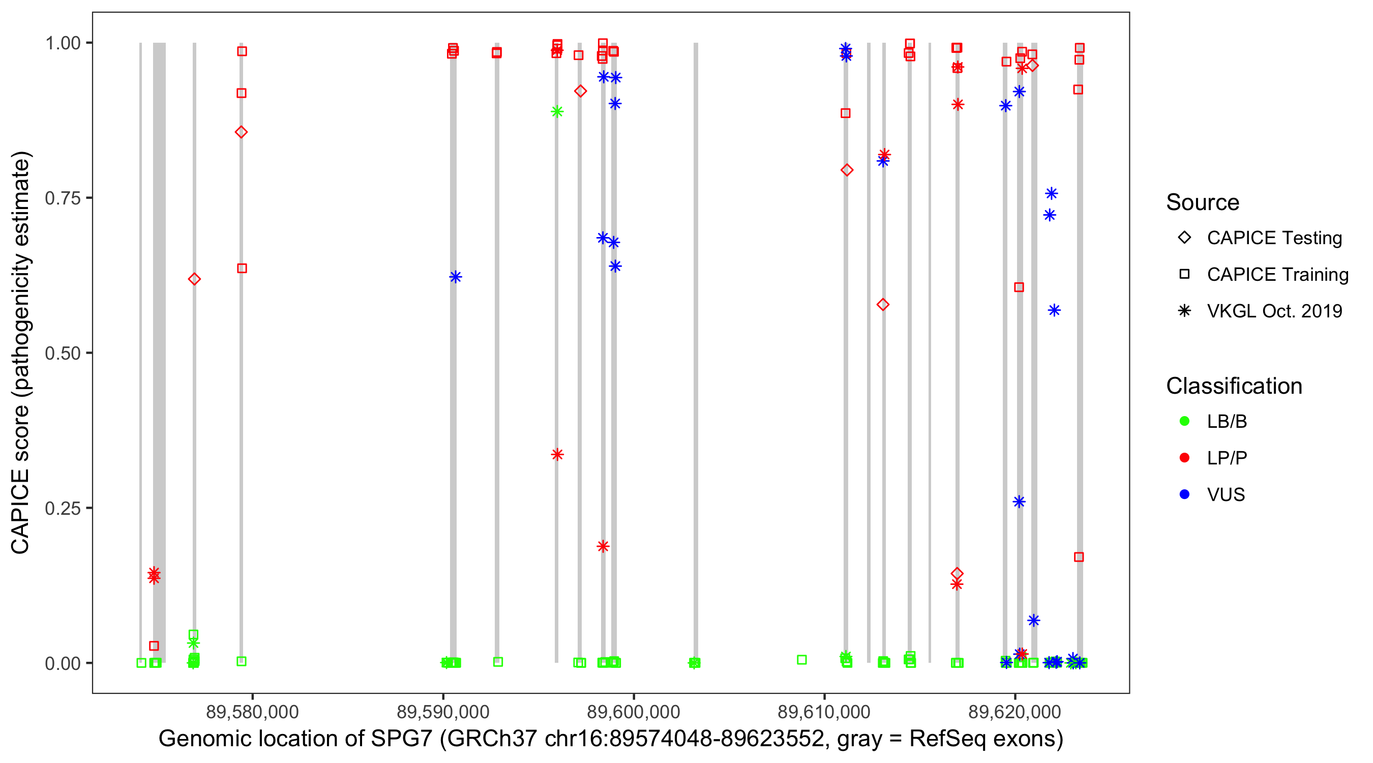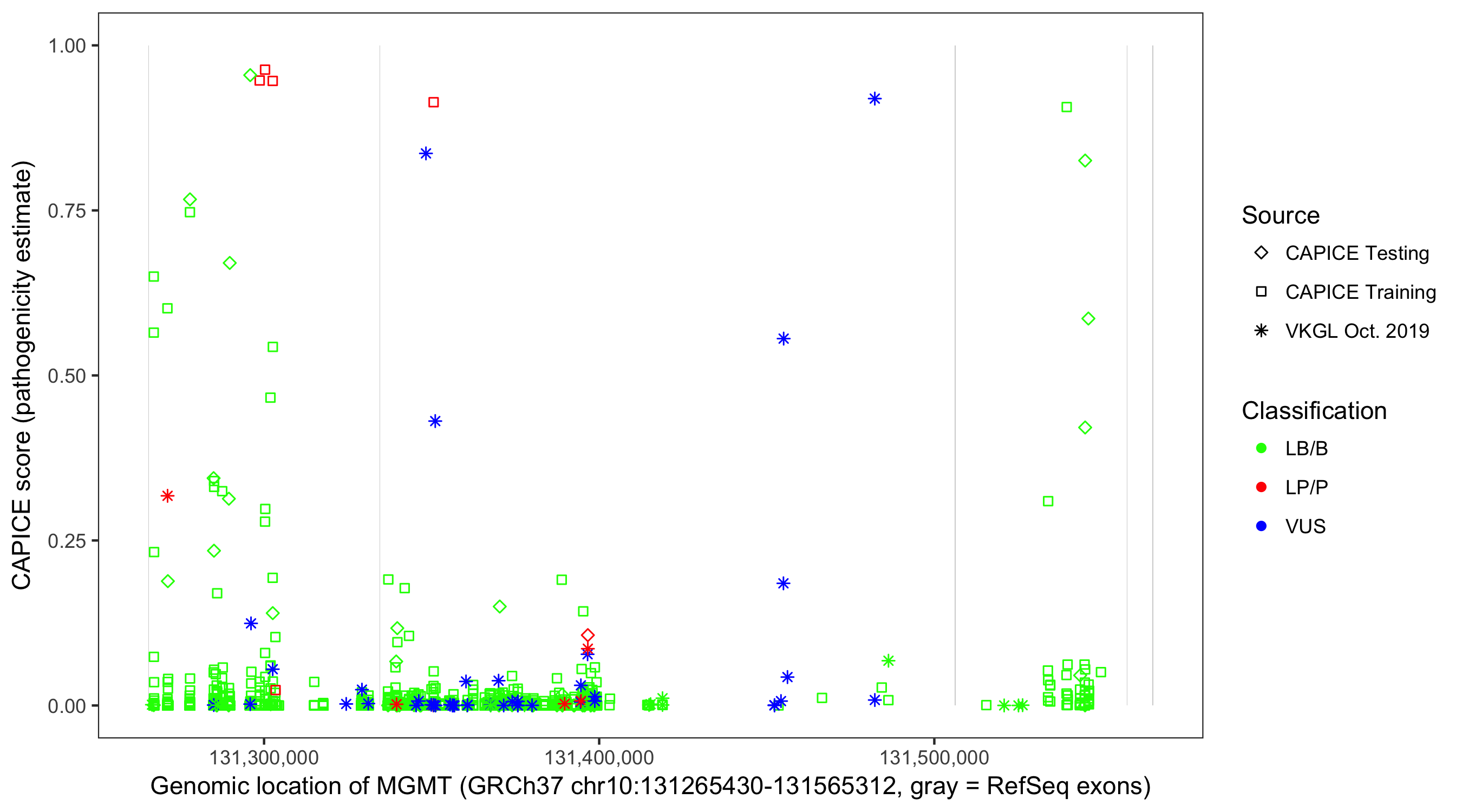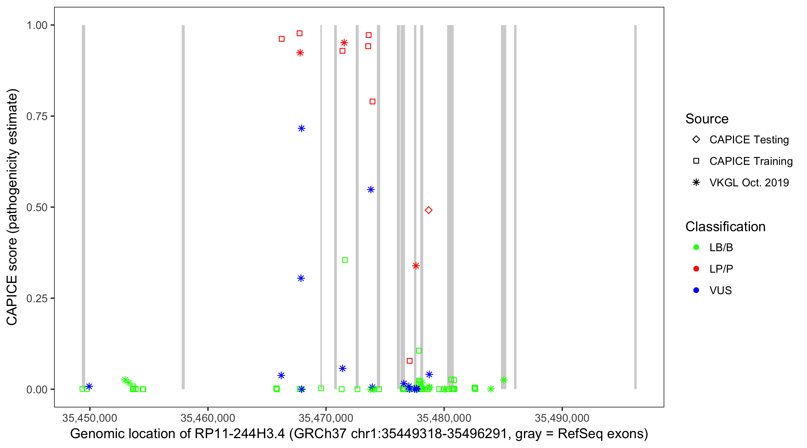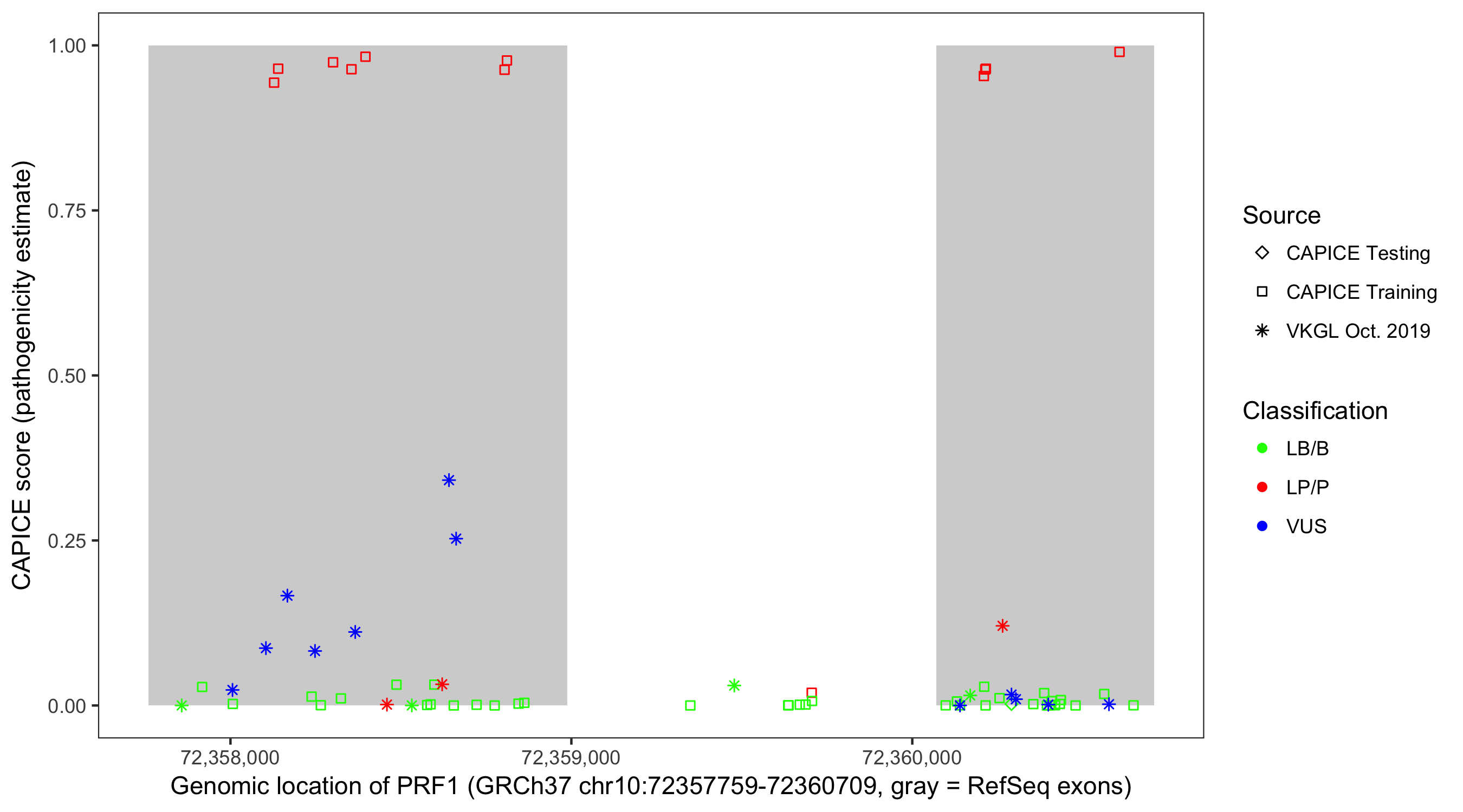 Shown are CAPICE train/test variants plus VKGL Oct 2019.