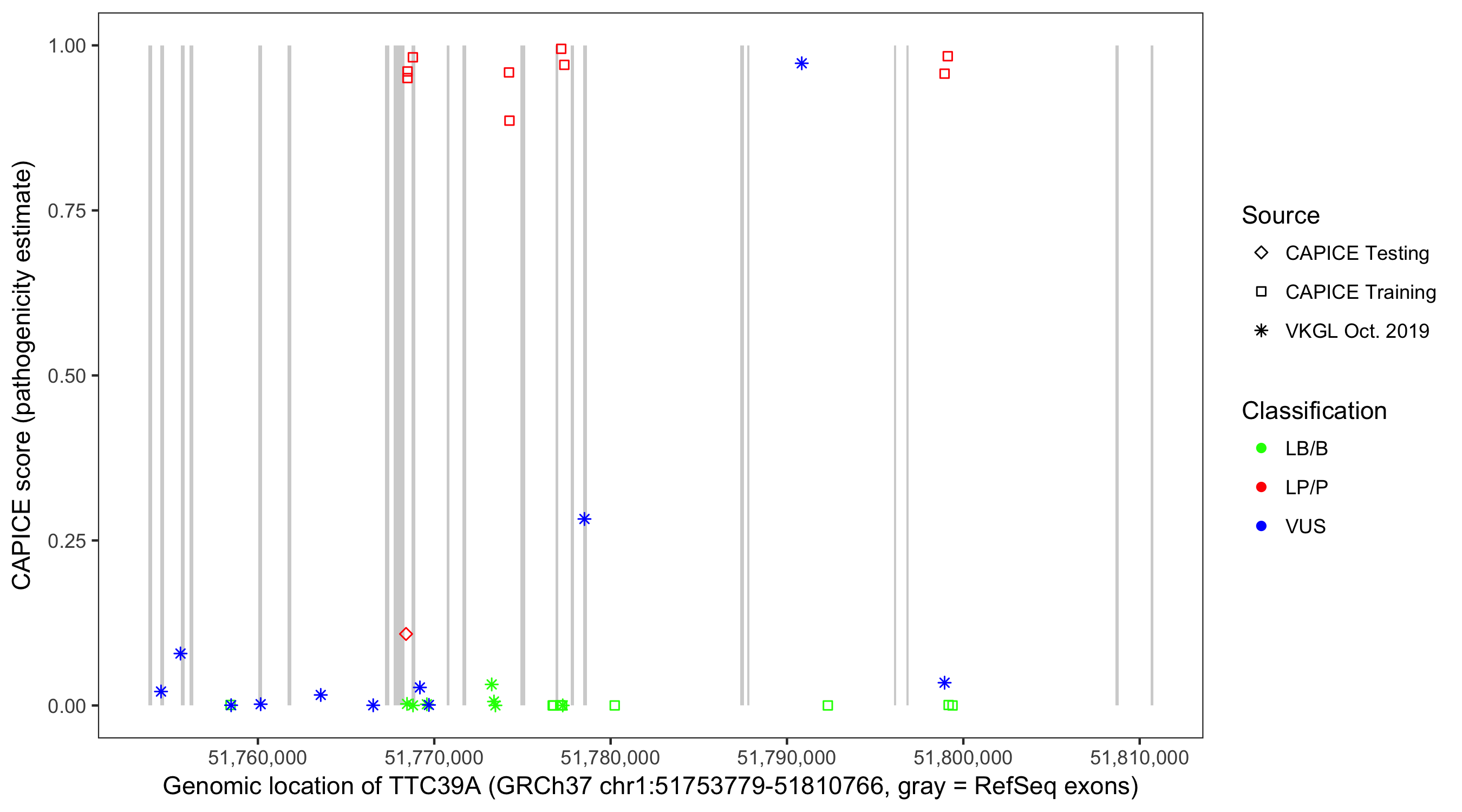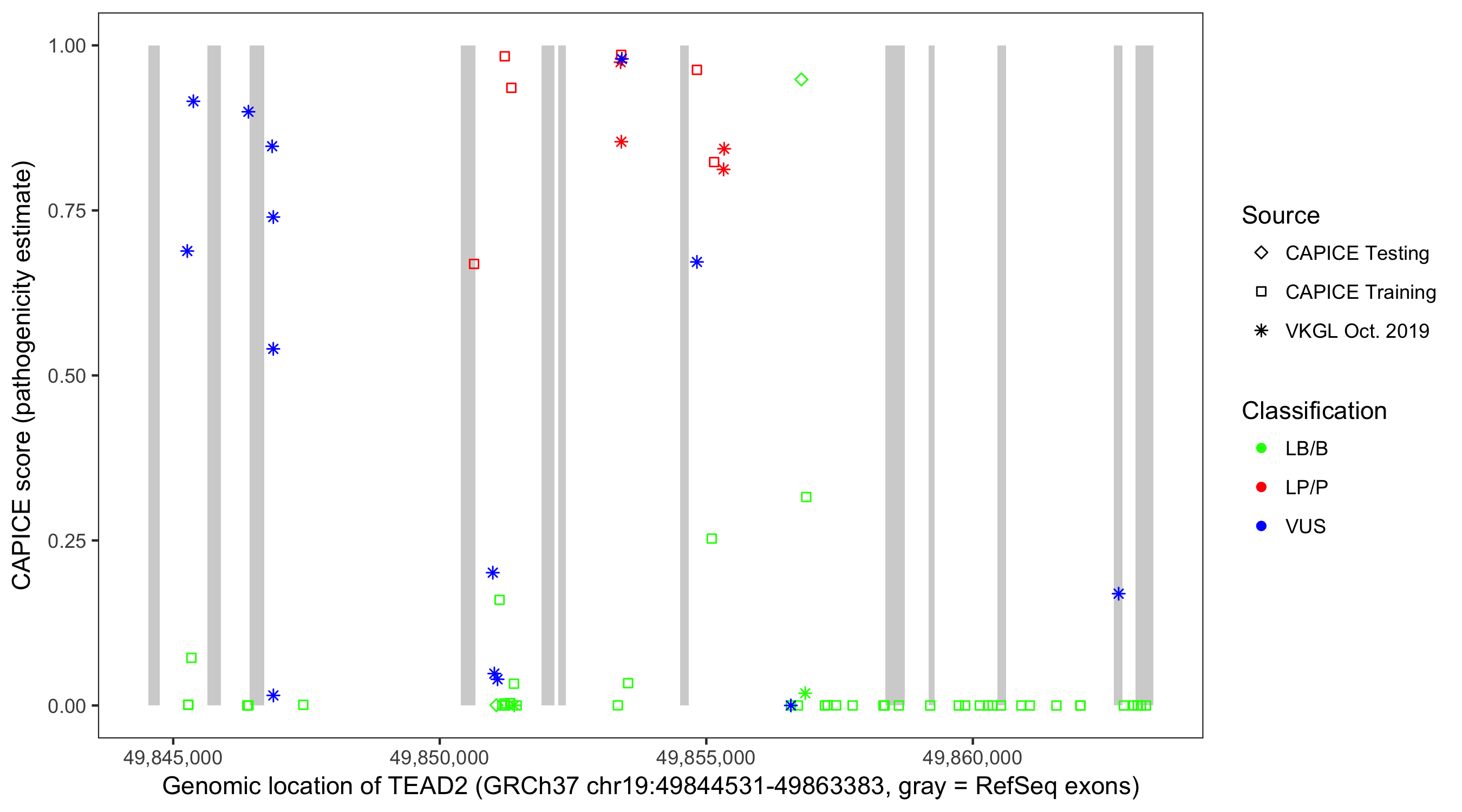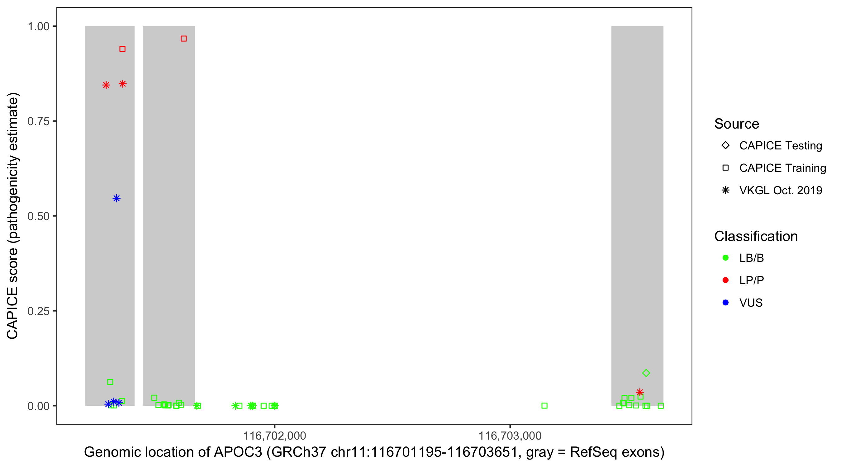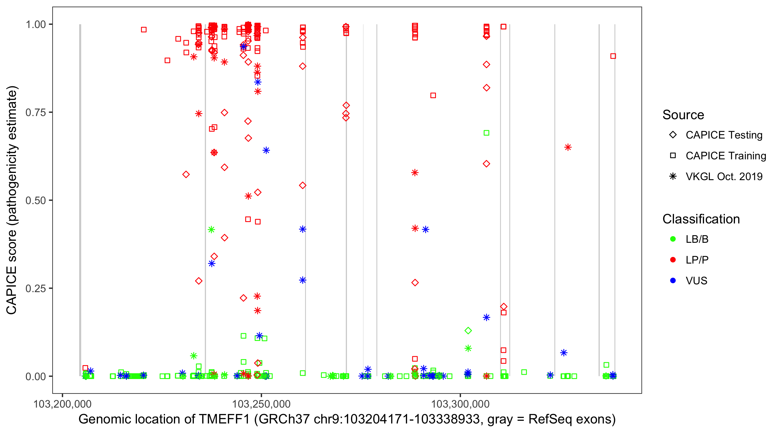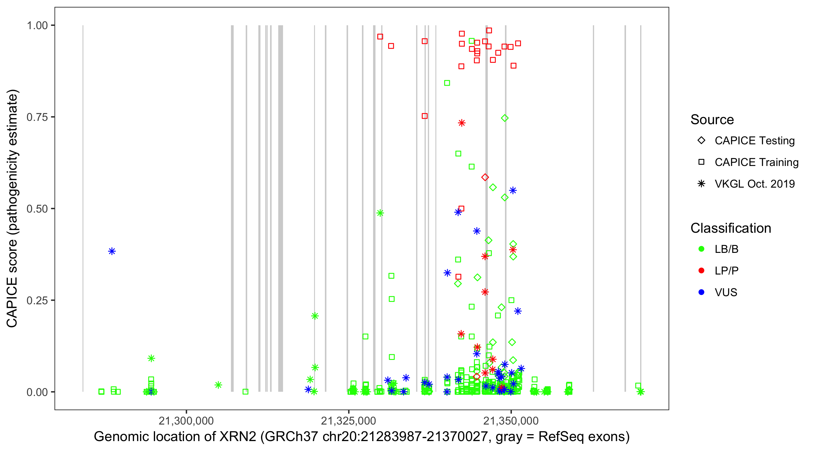 Shown are CAPICE train/test variants plus VKGL Oct 2019.