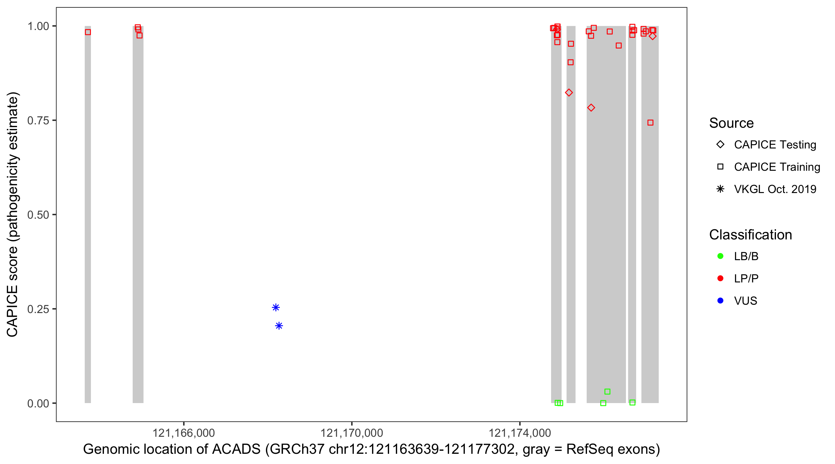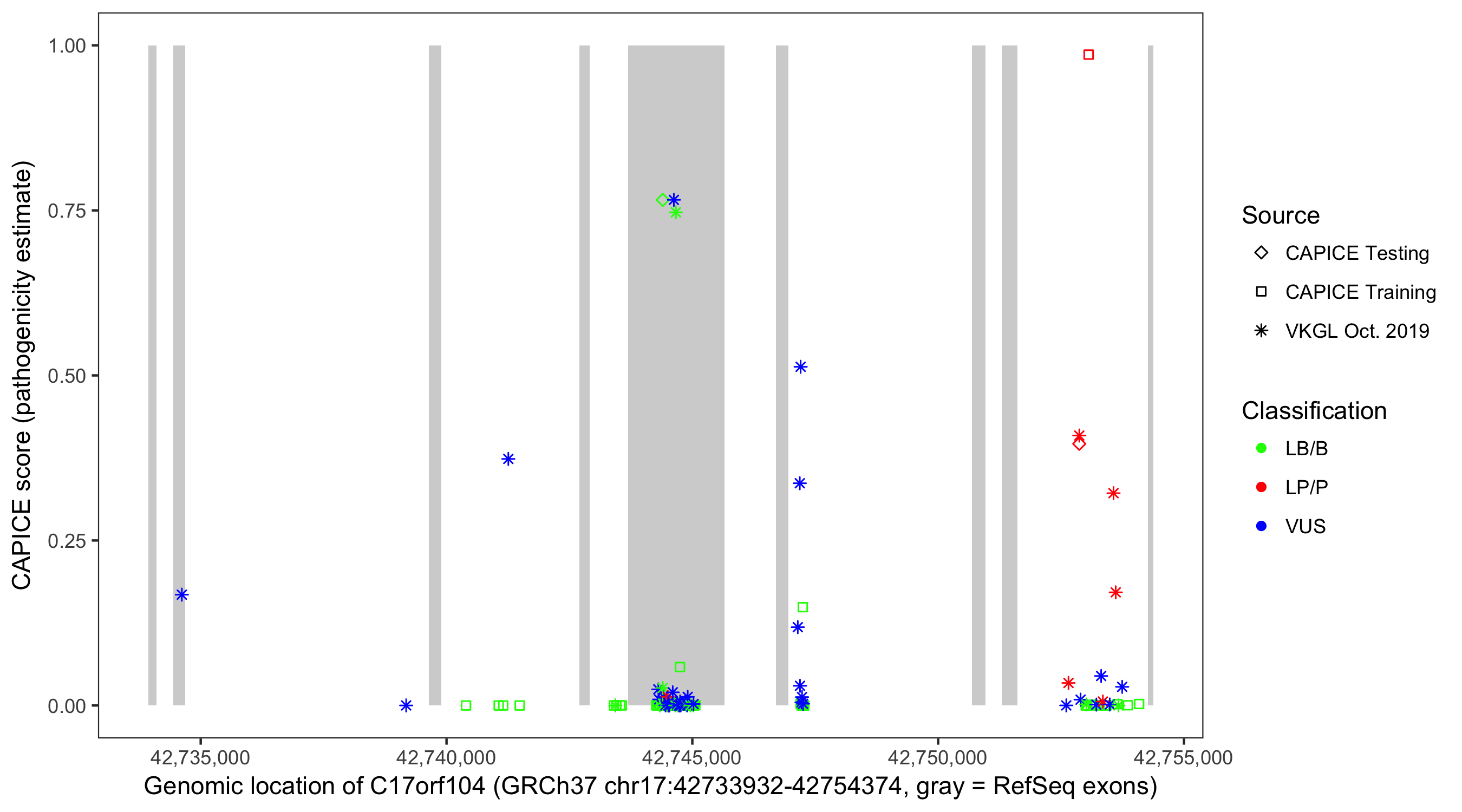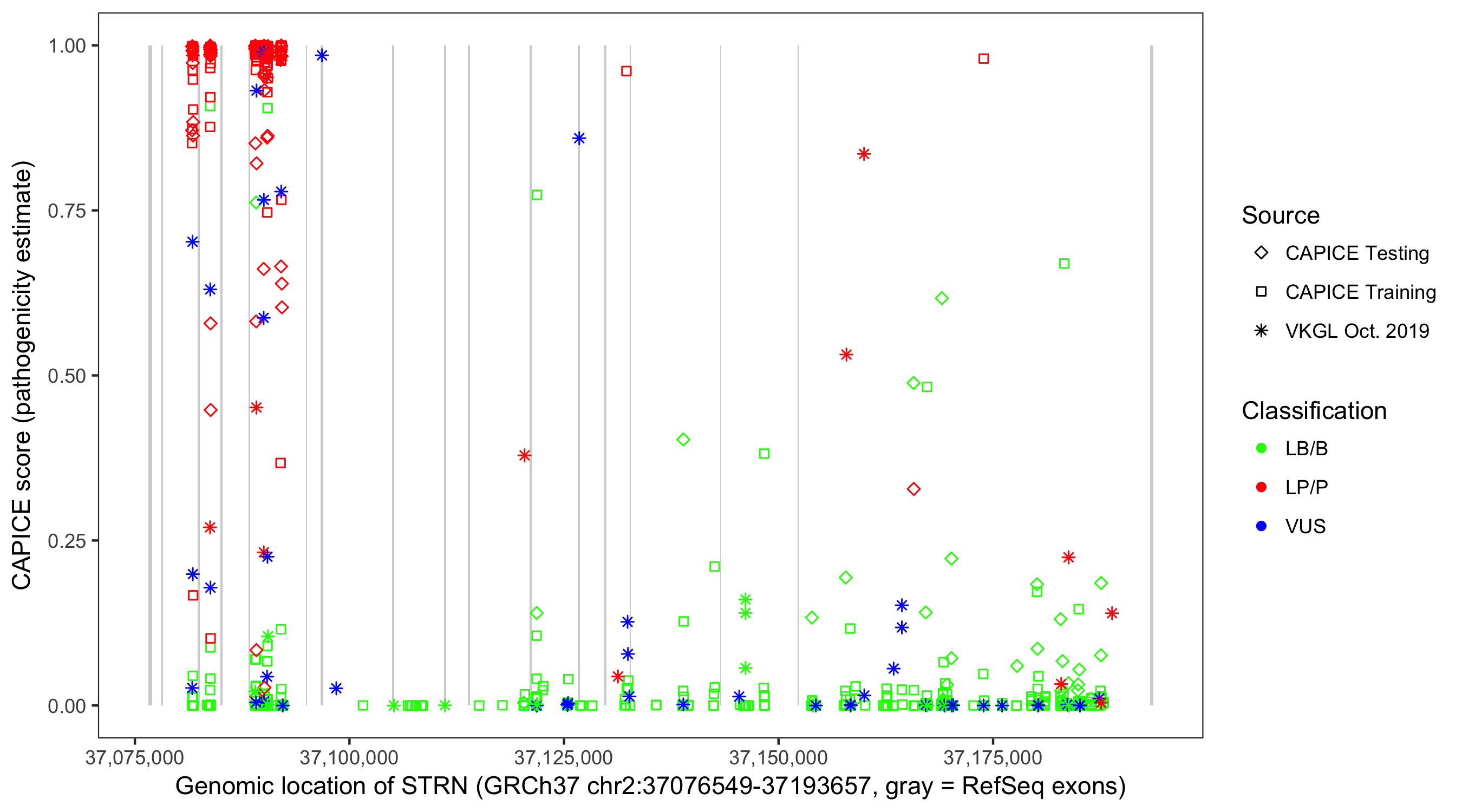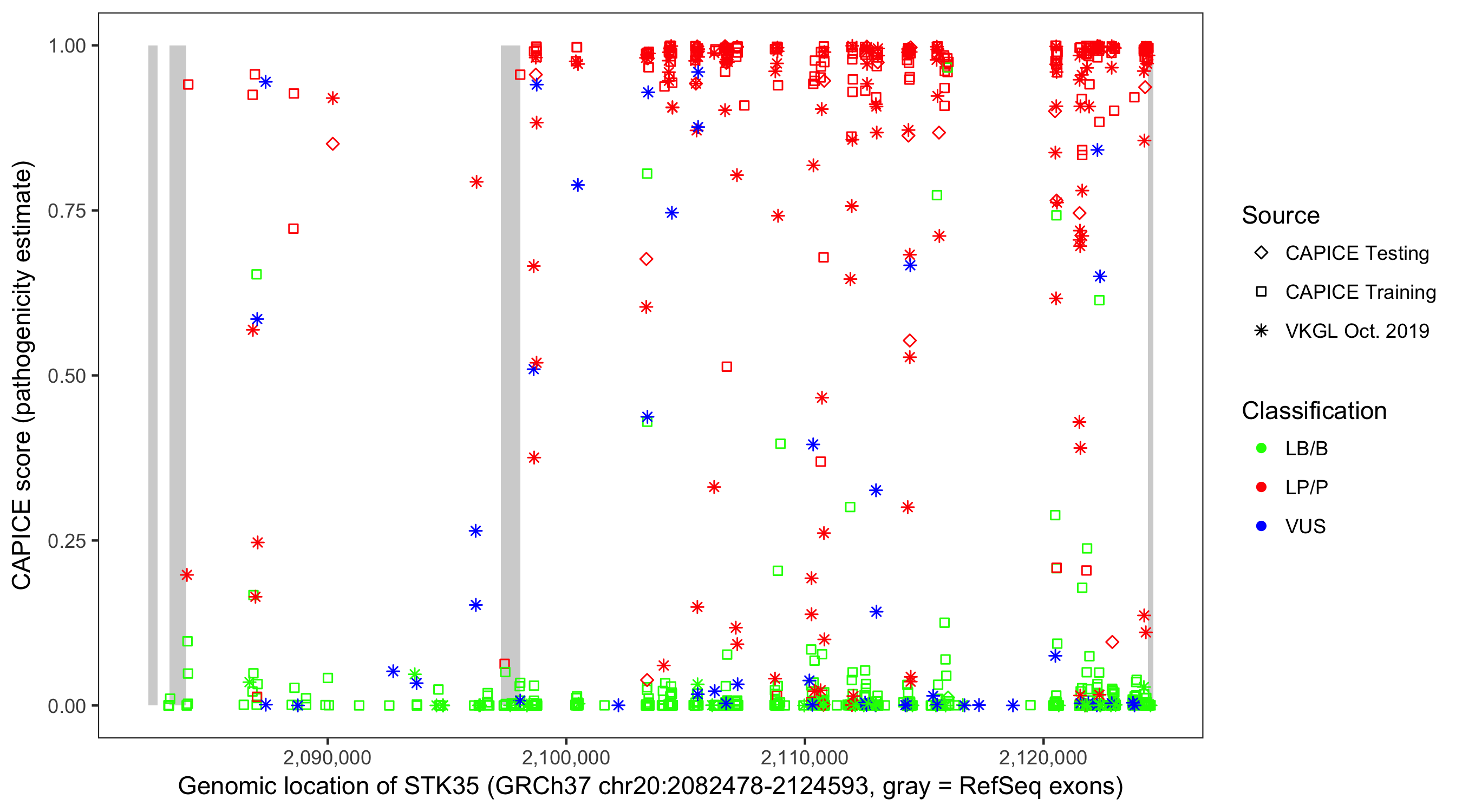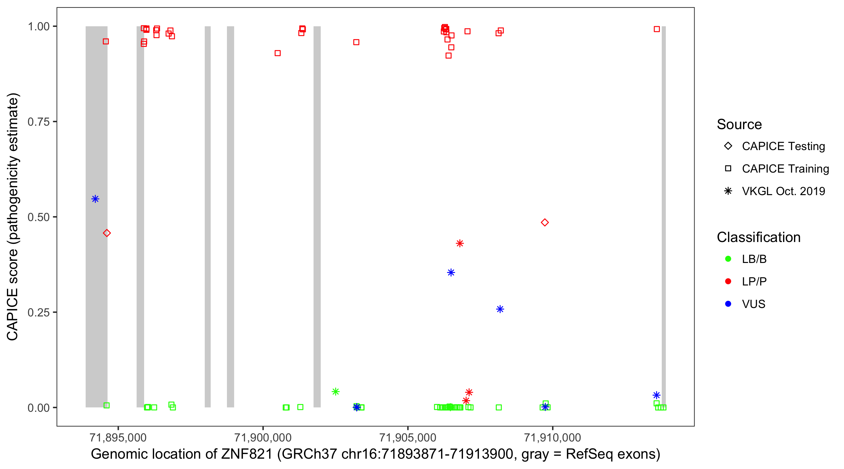 Shown are CAPICE train/test variants plus VKGL Oct 2019.