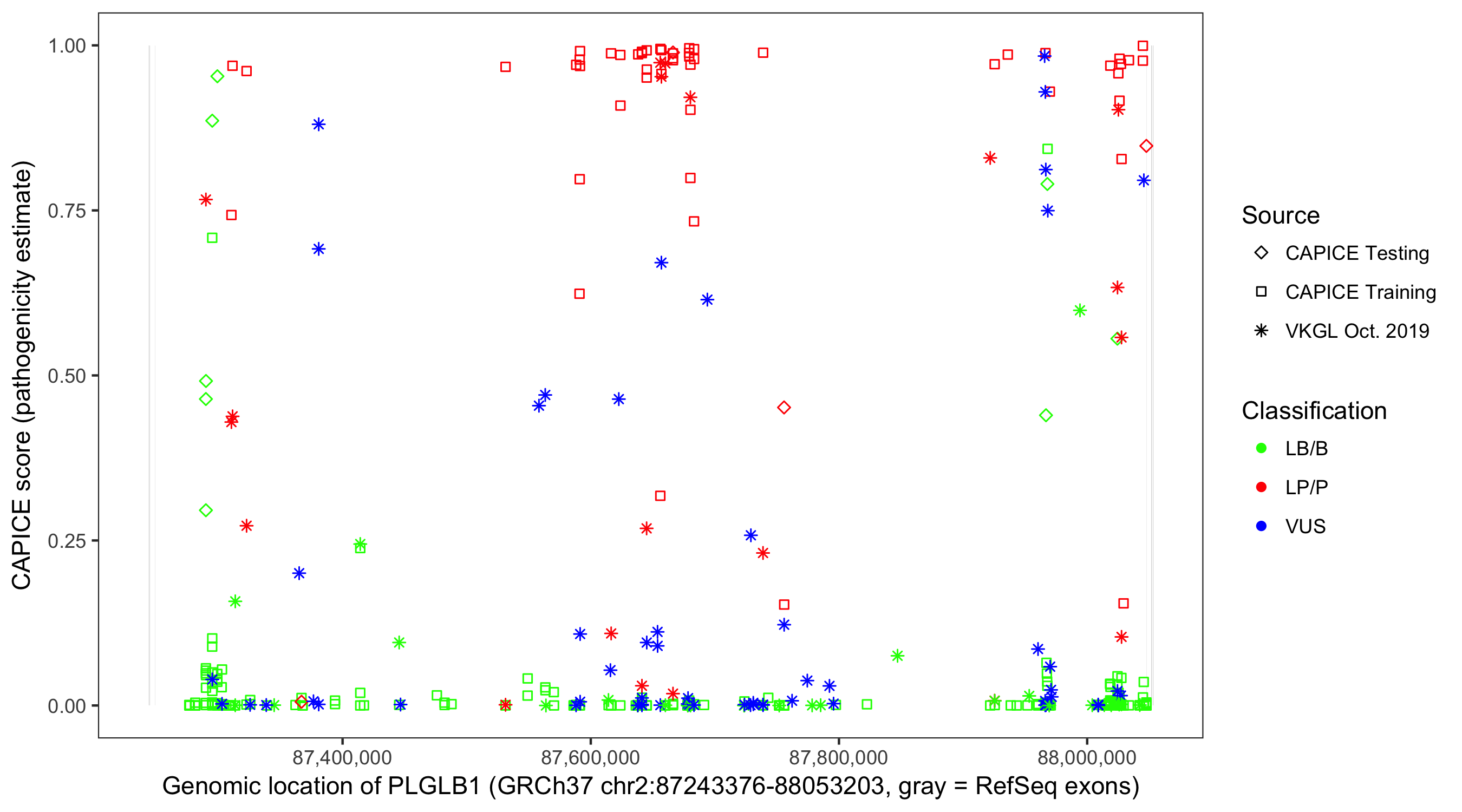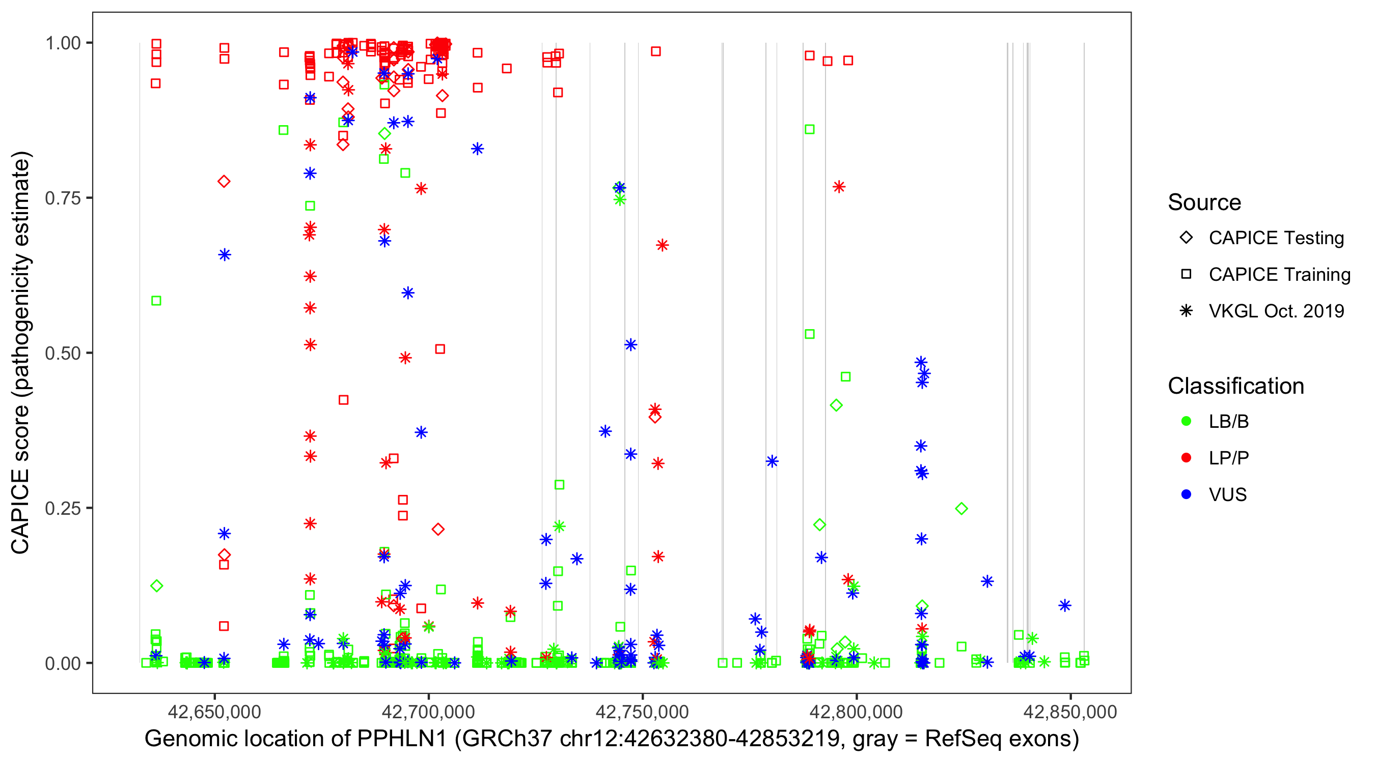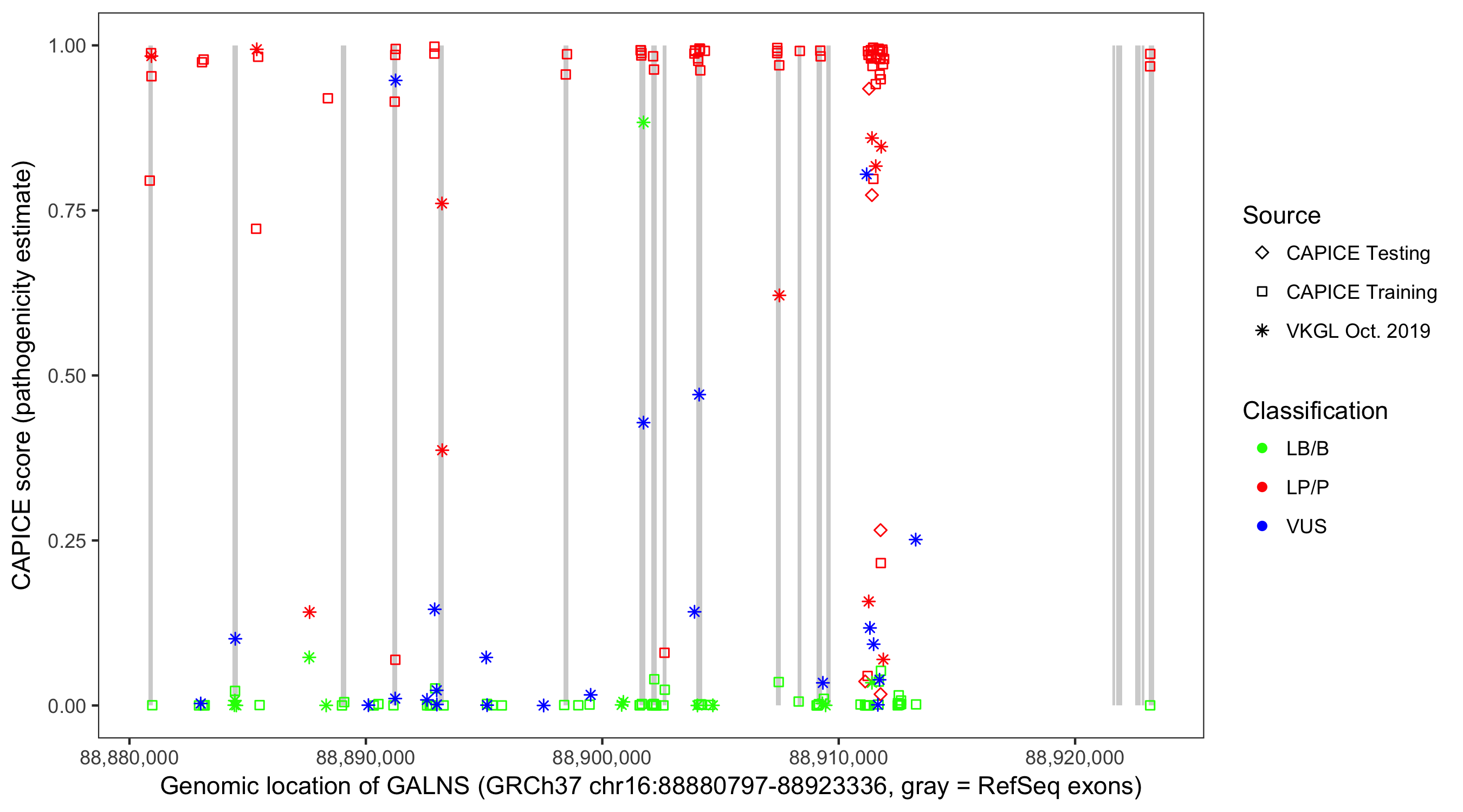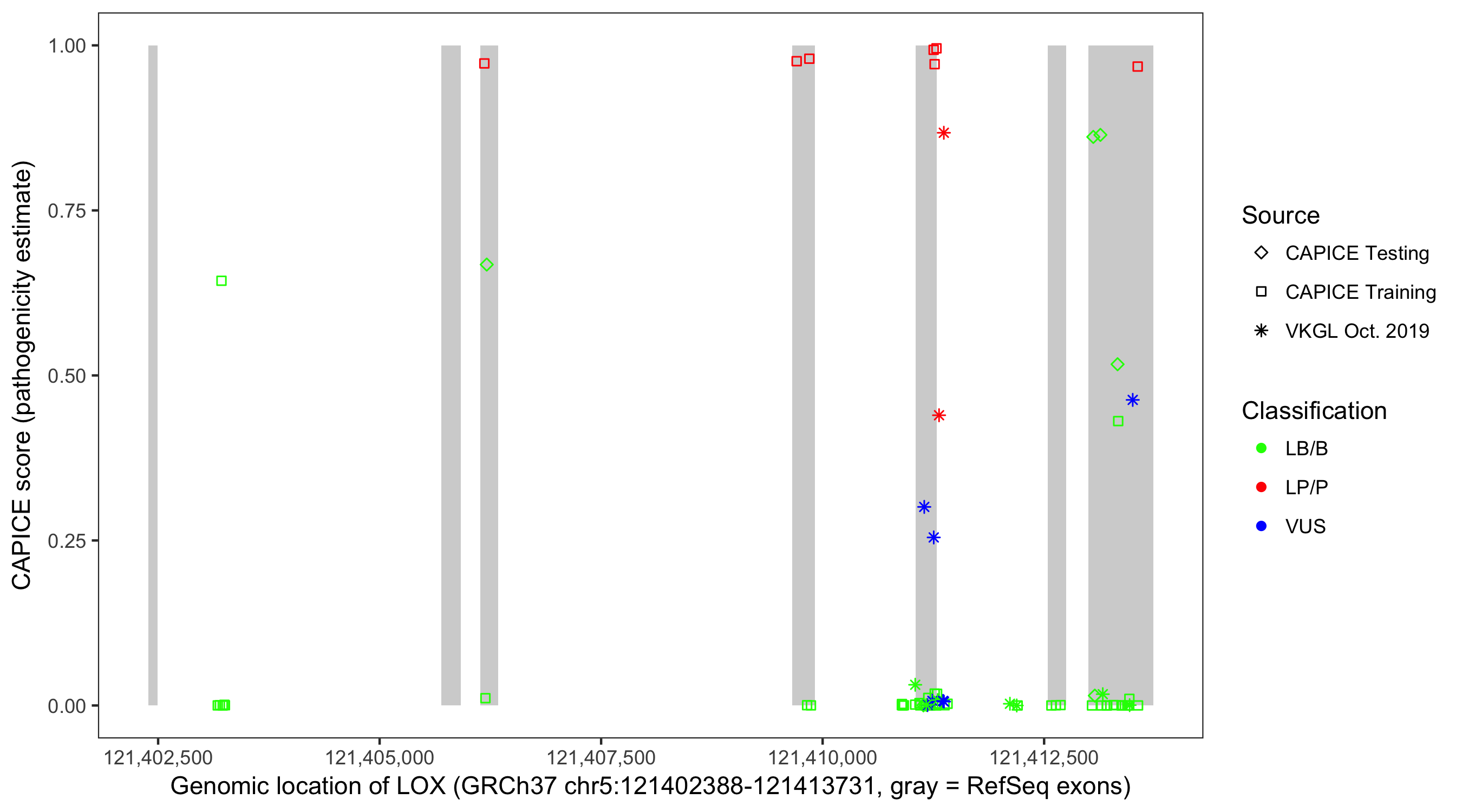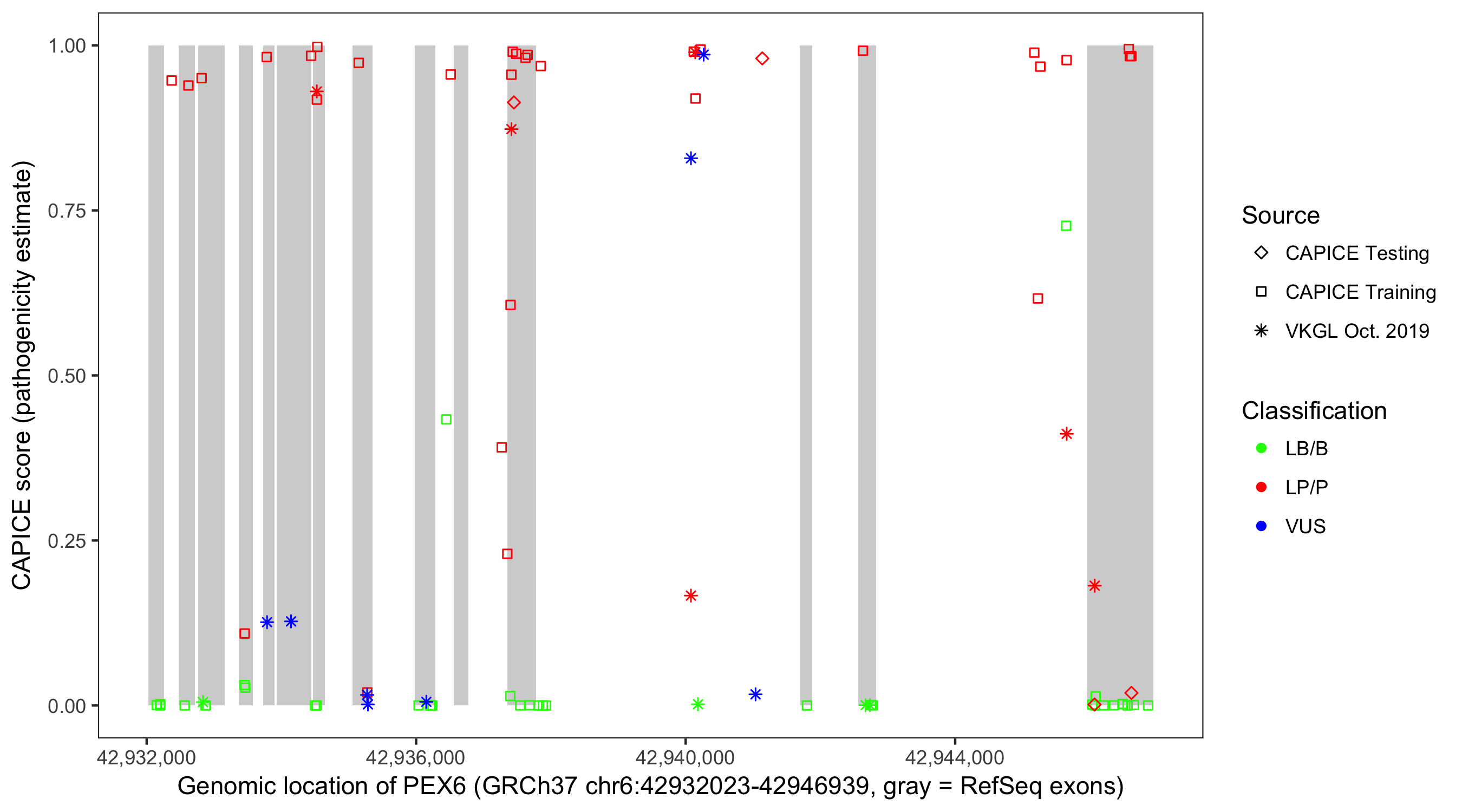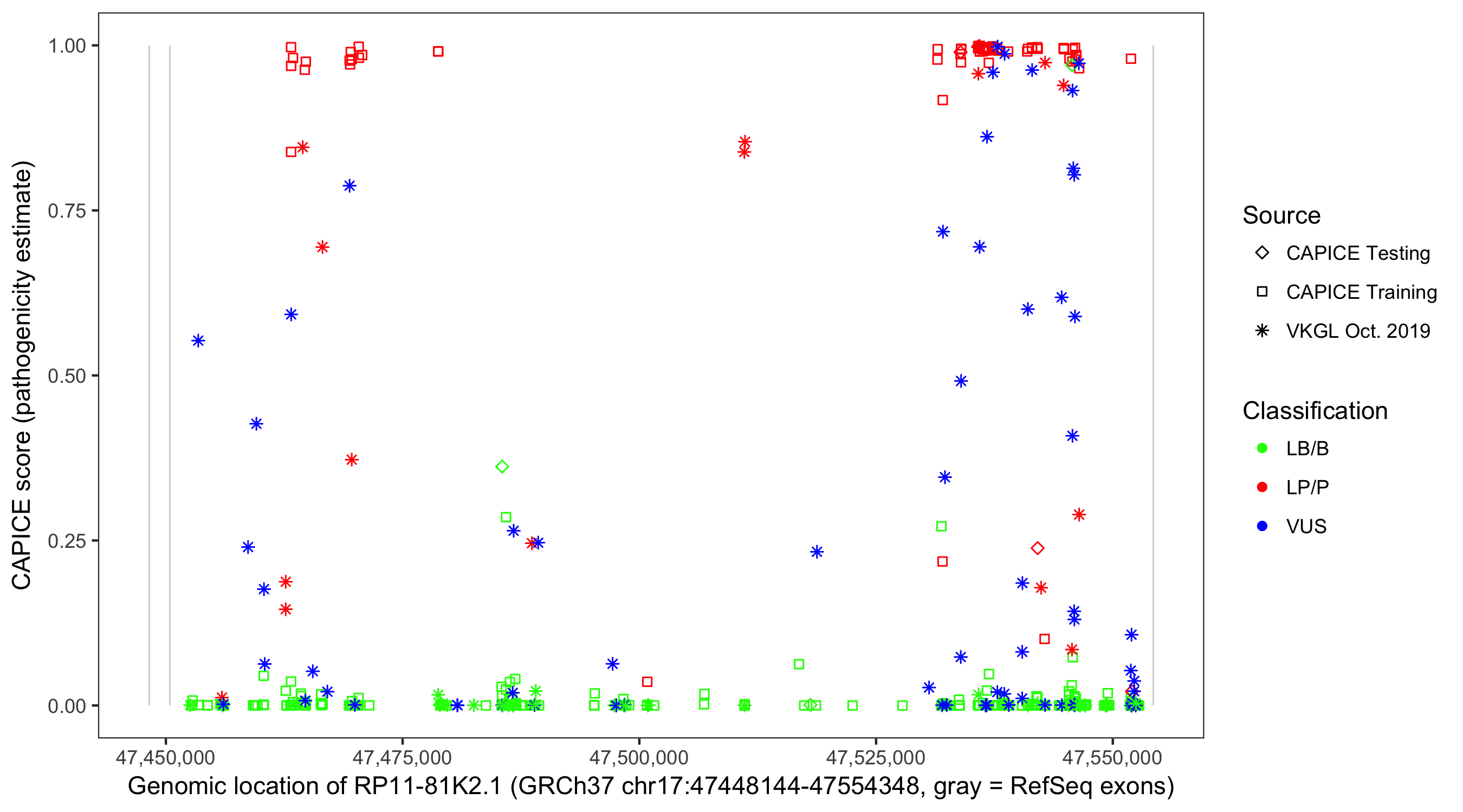 Shown are CAPICE train/test variants plus VKGL Oct 2019.