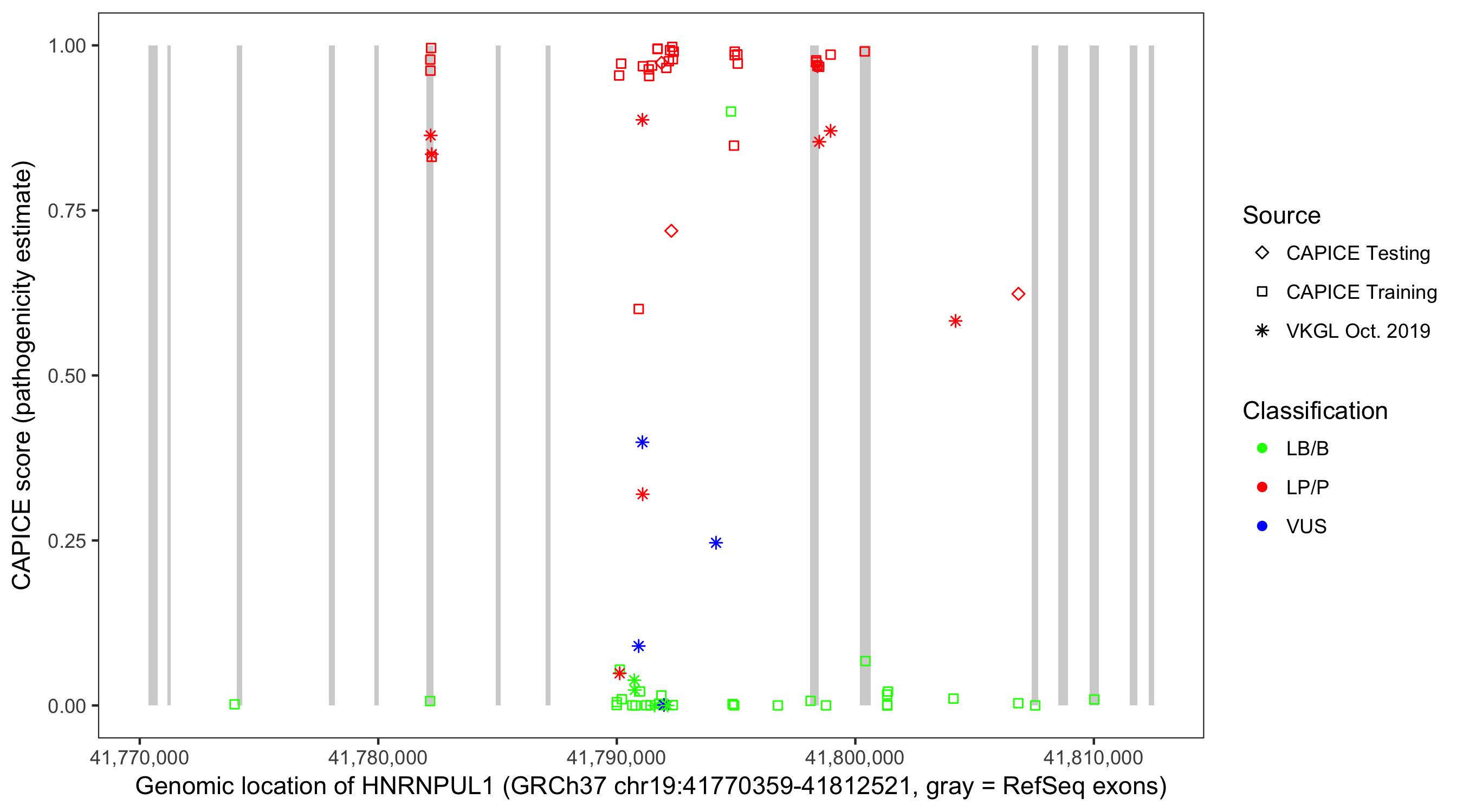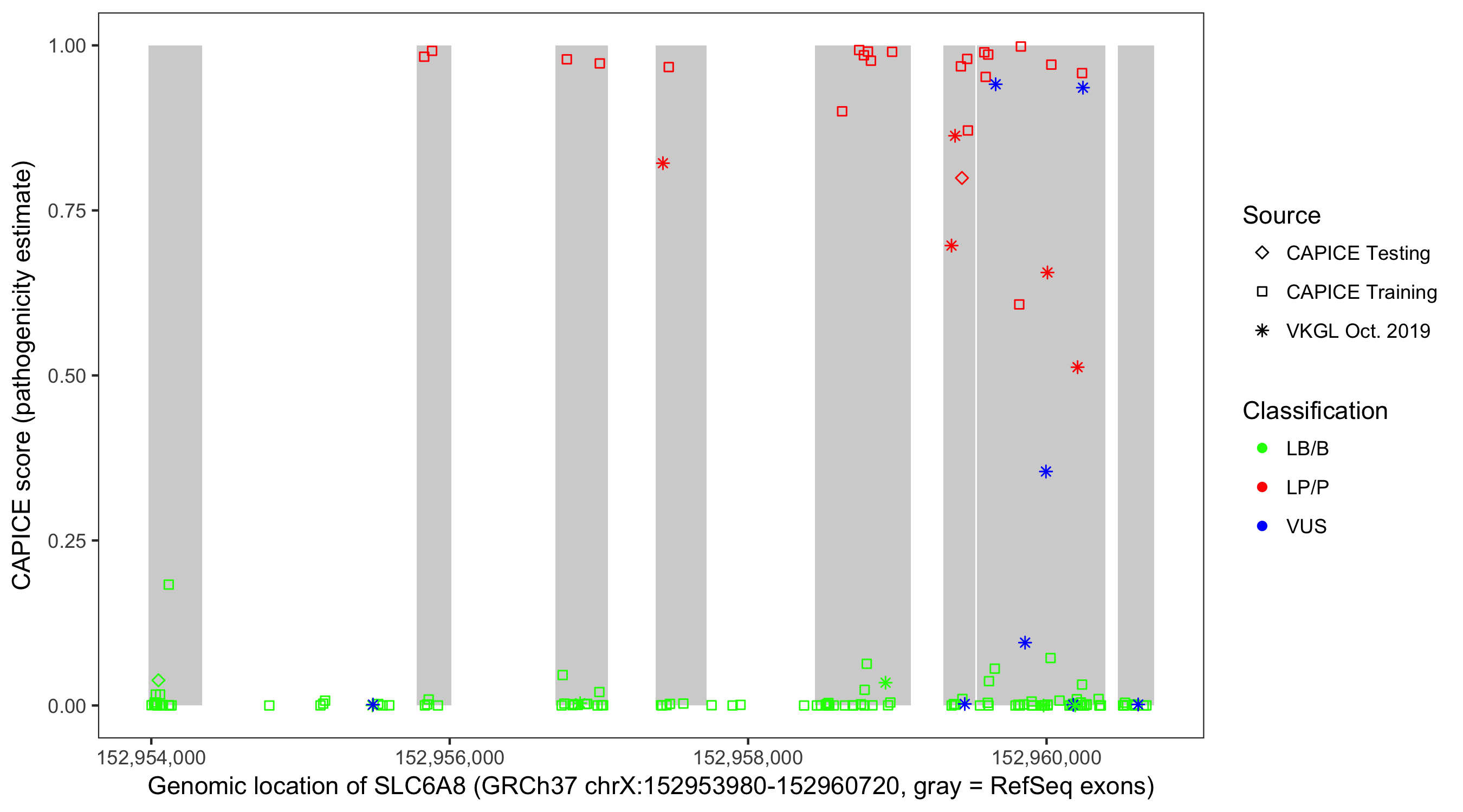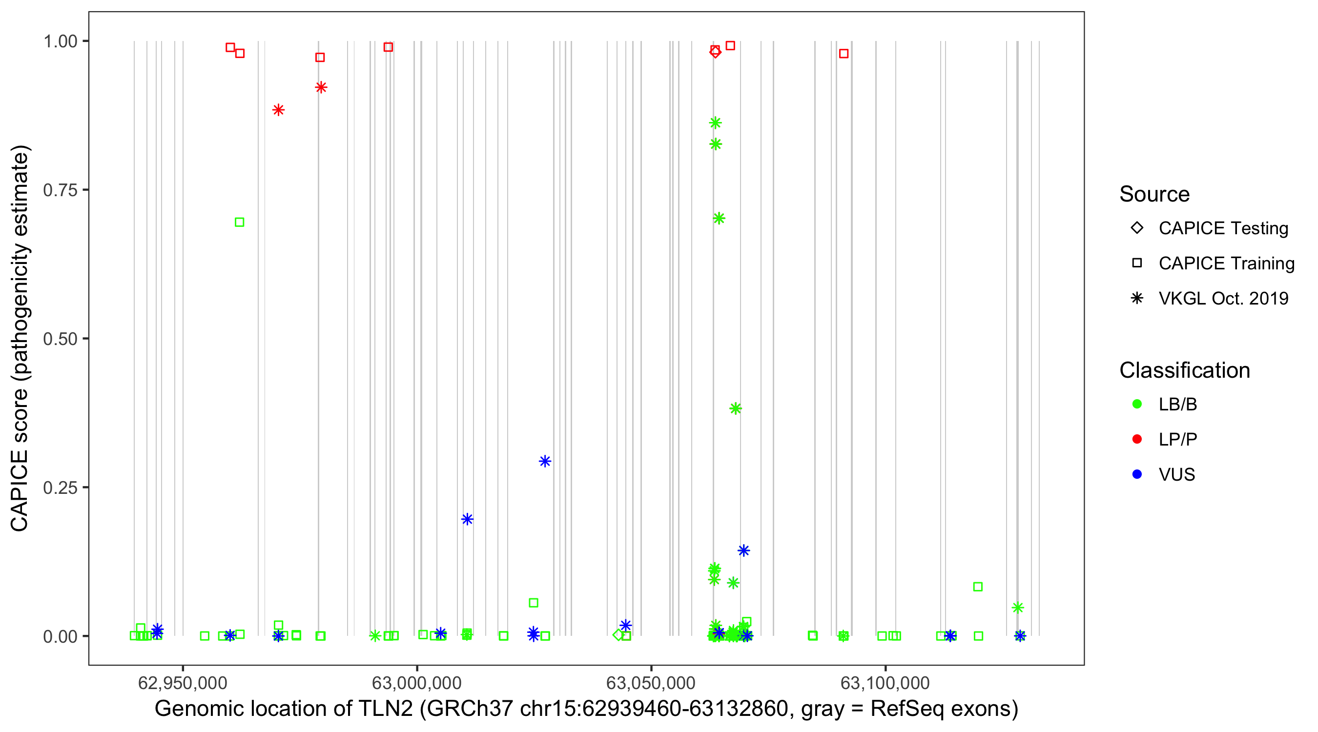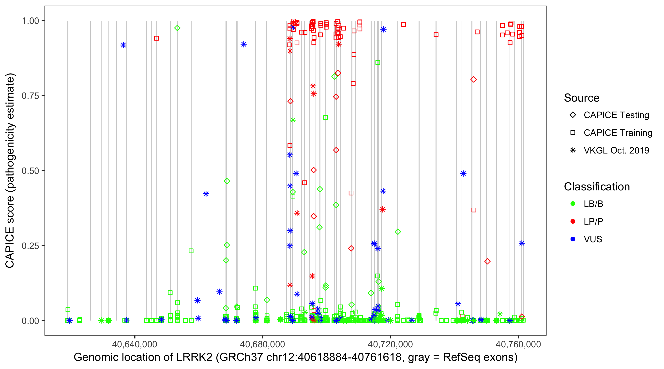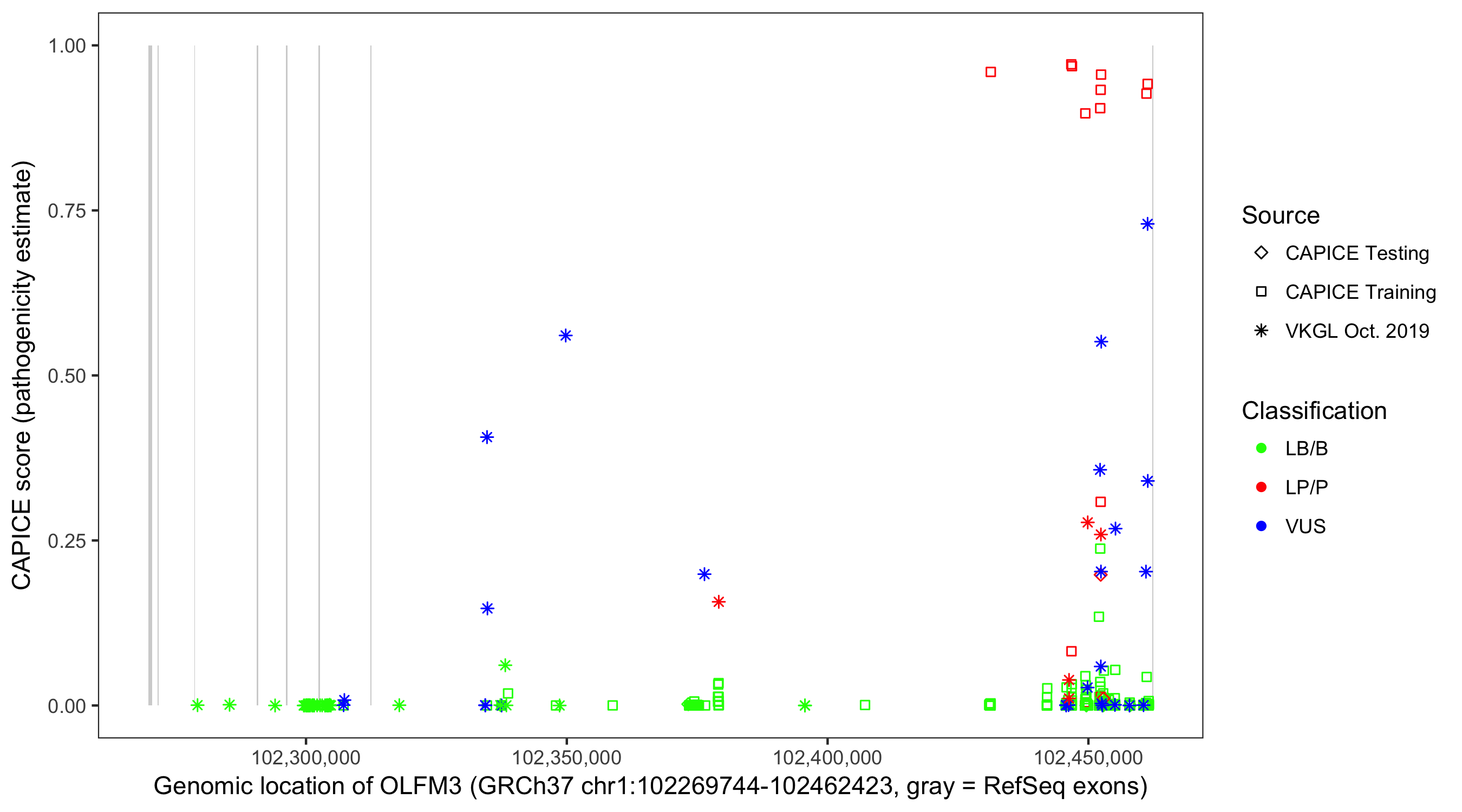 Shown are CAPICE train/test variants plus VKGL Oct 2019.