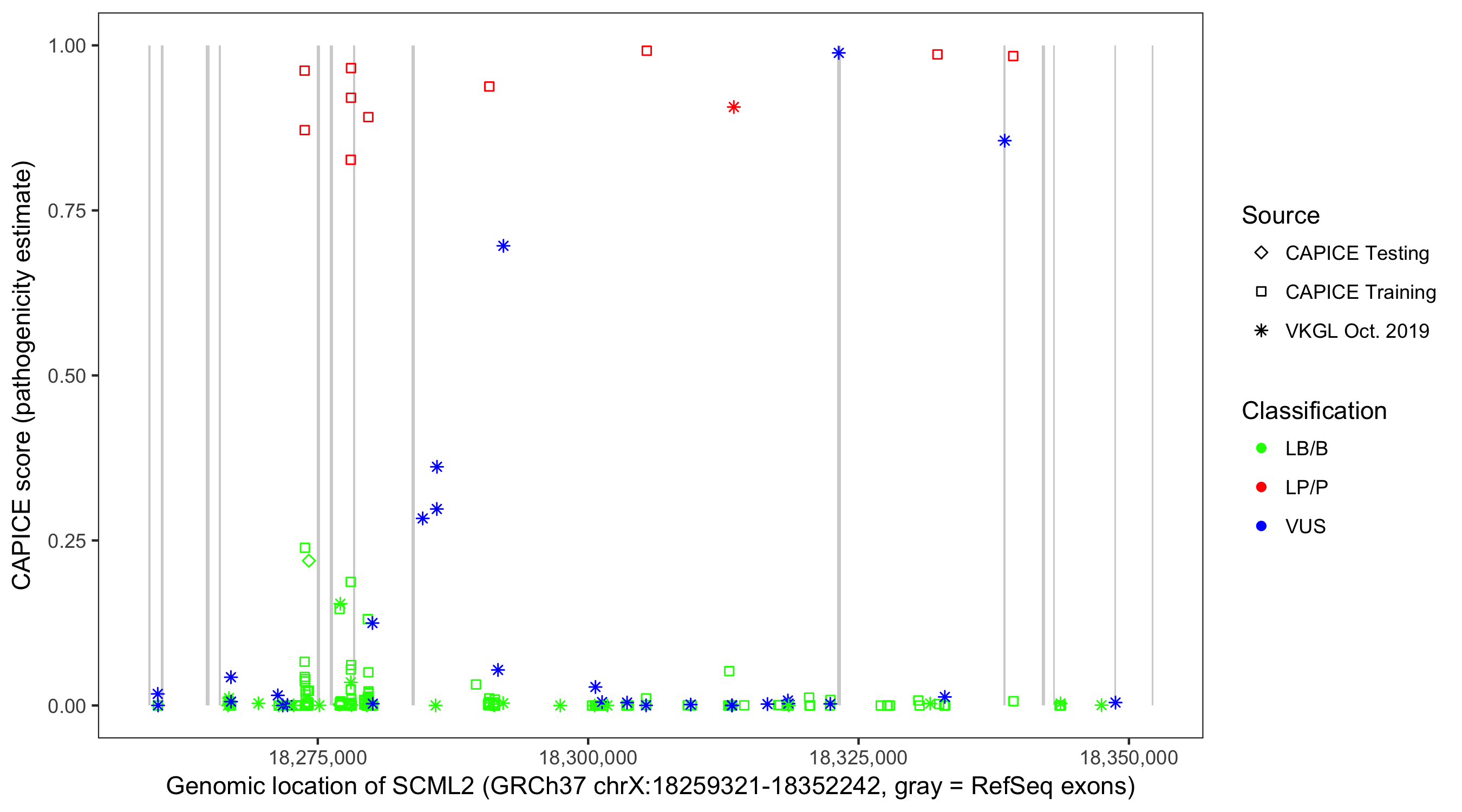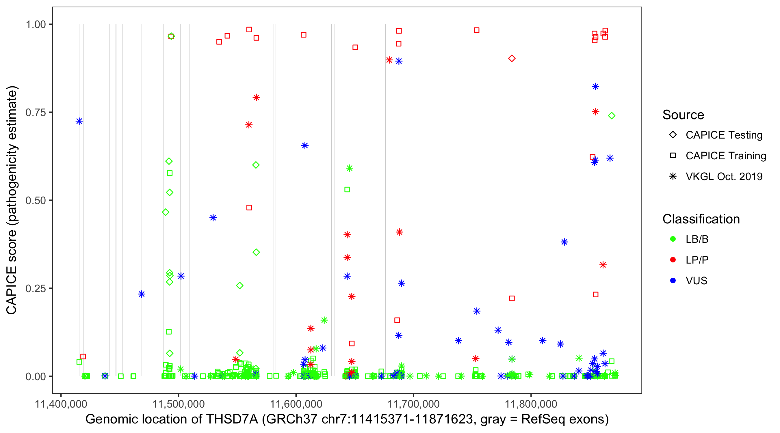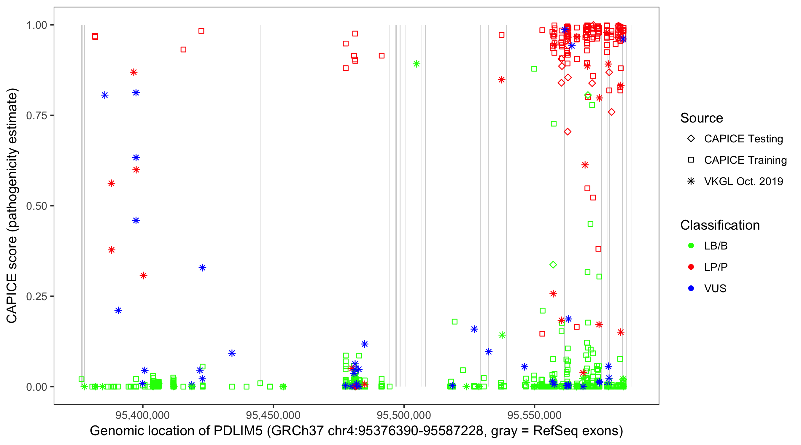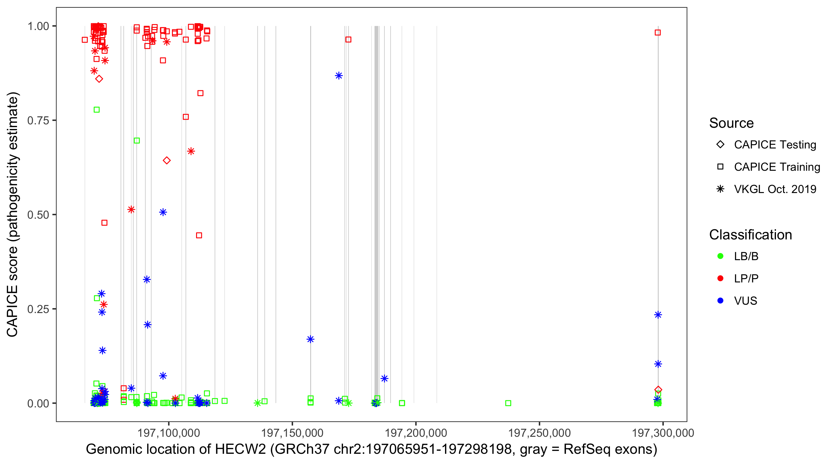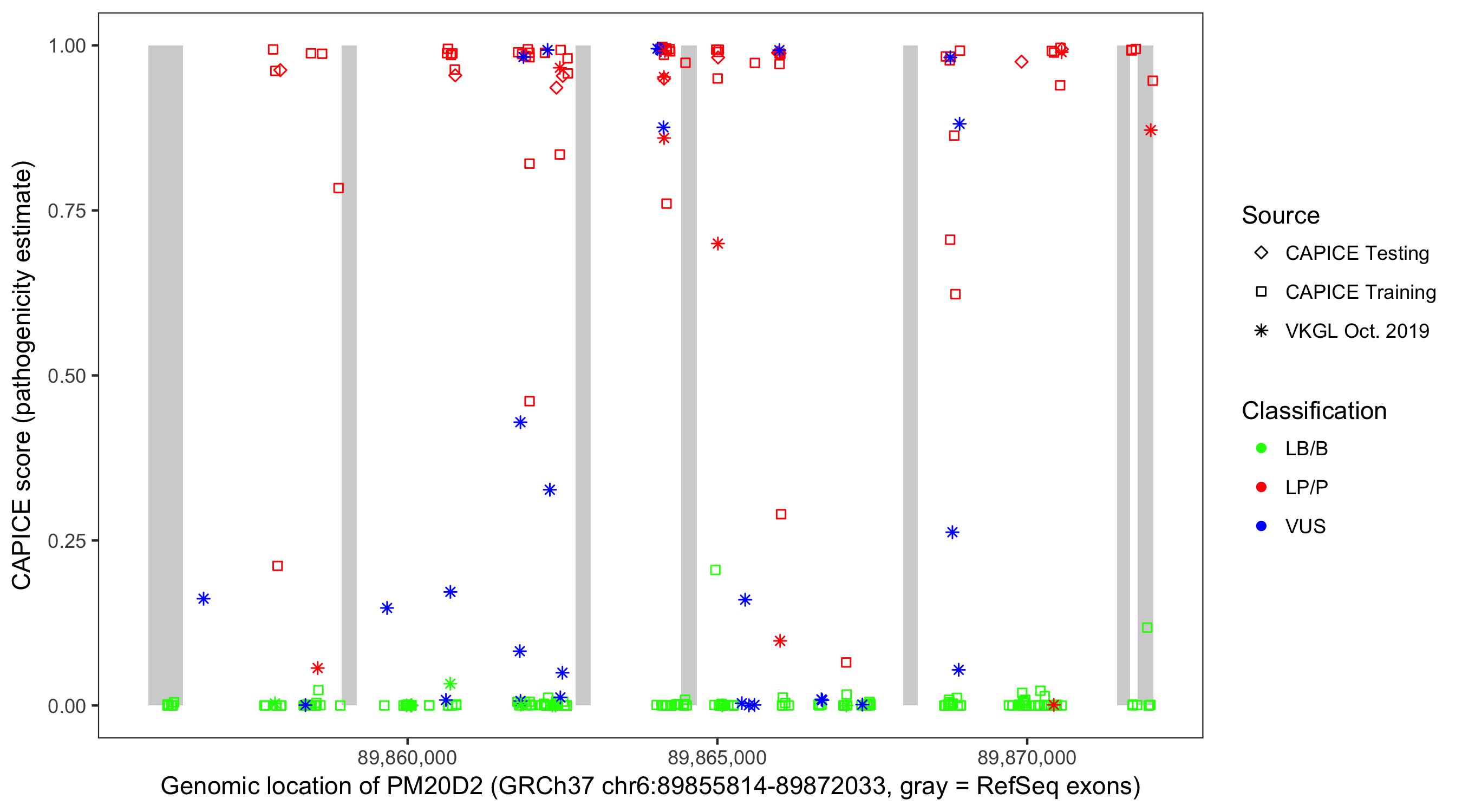 Shown are CAPICE train/test variants plus VKGL Oct 2019.