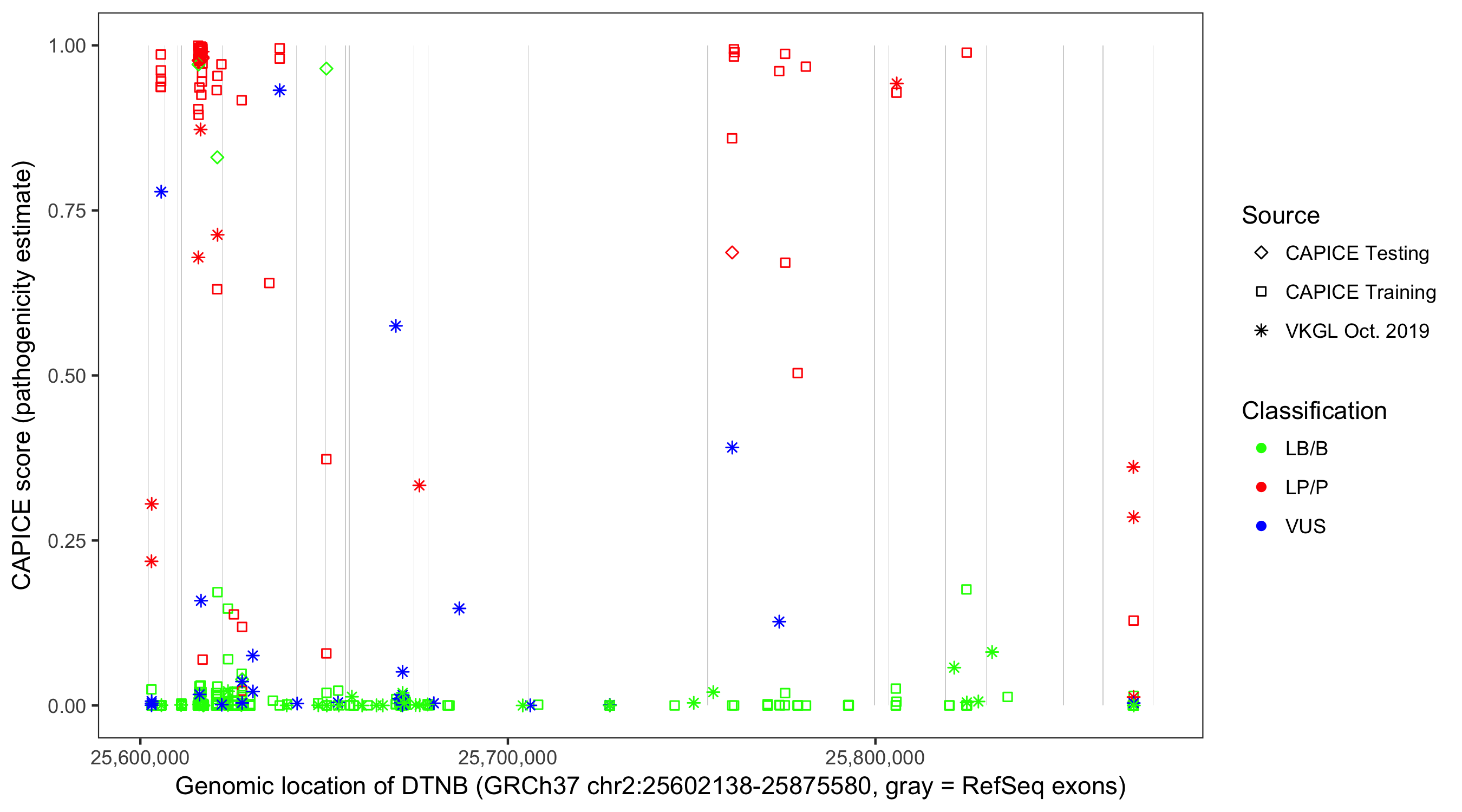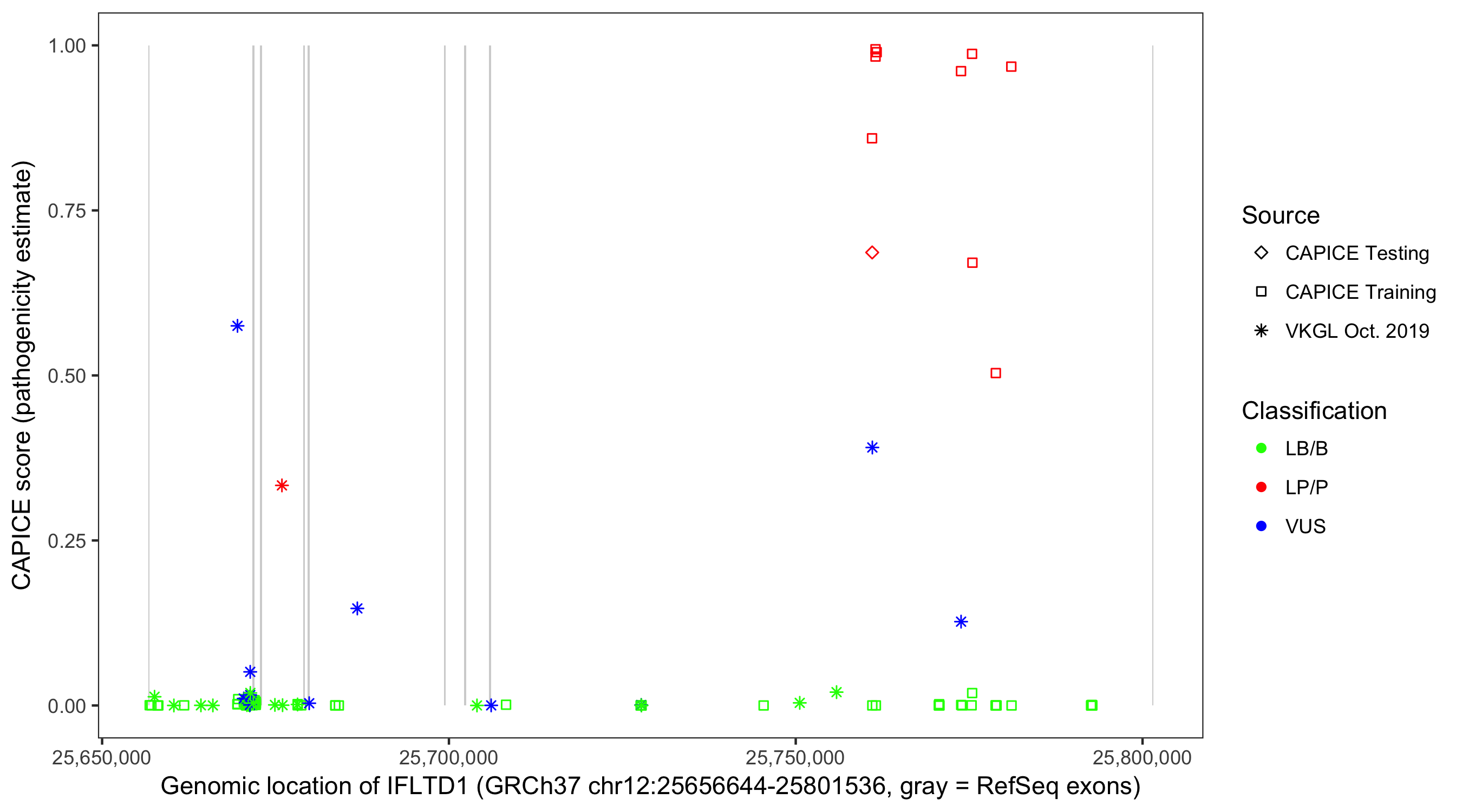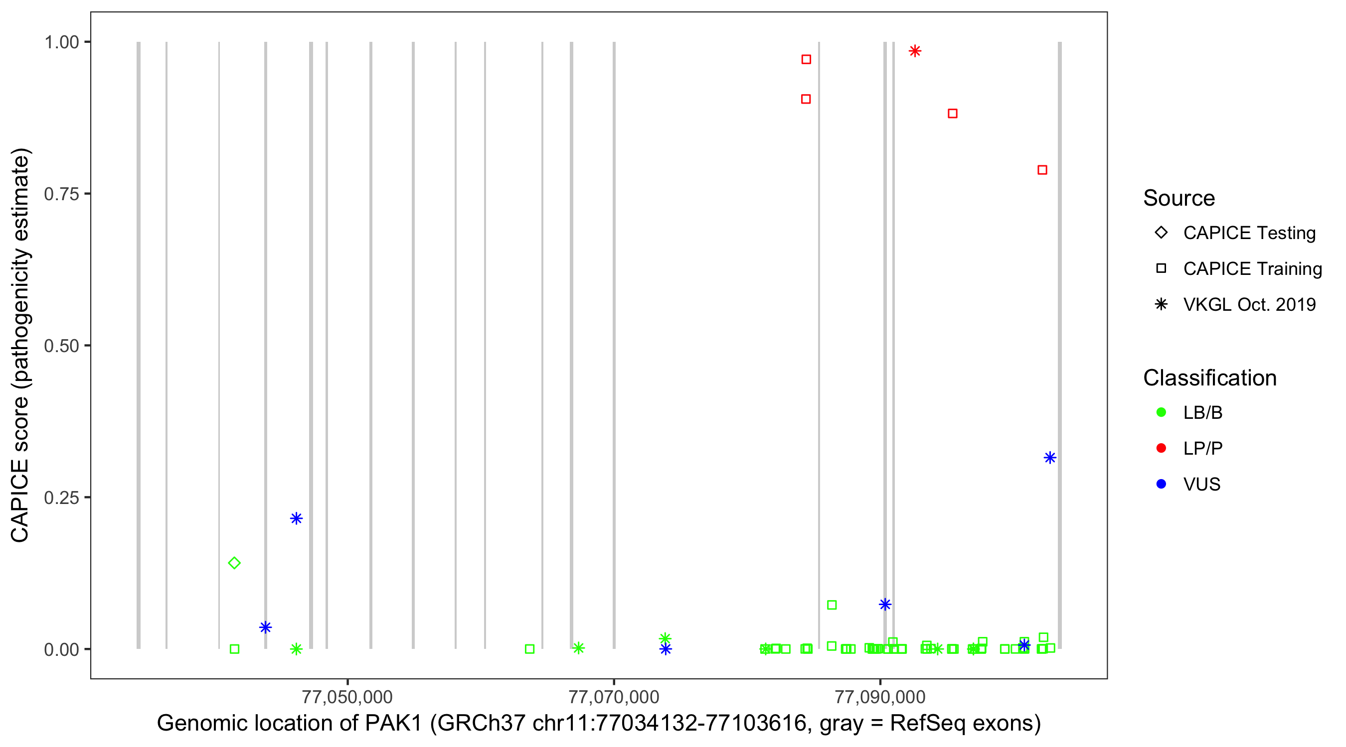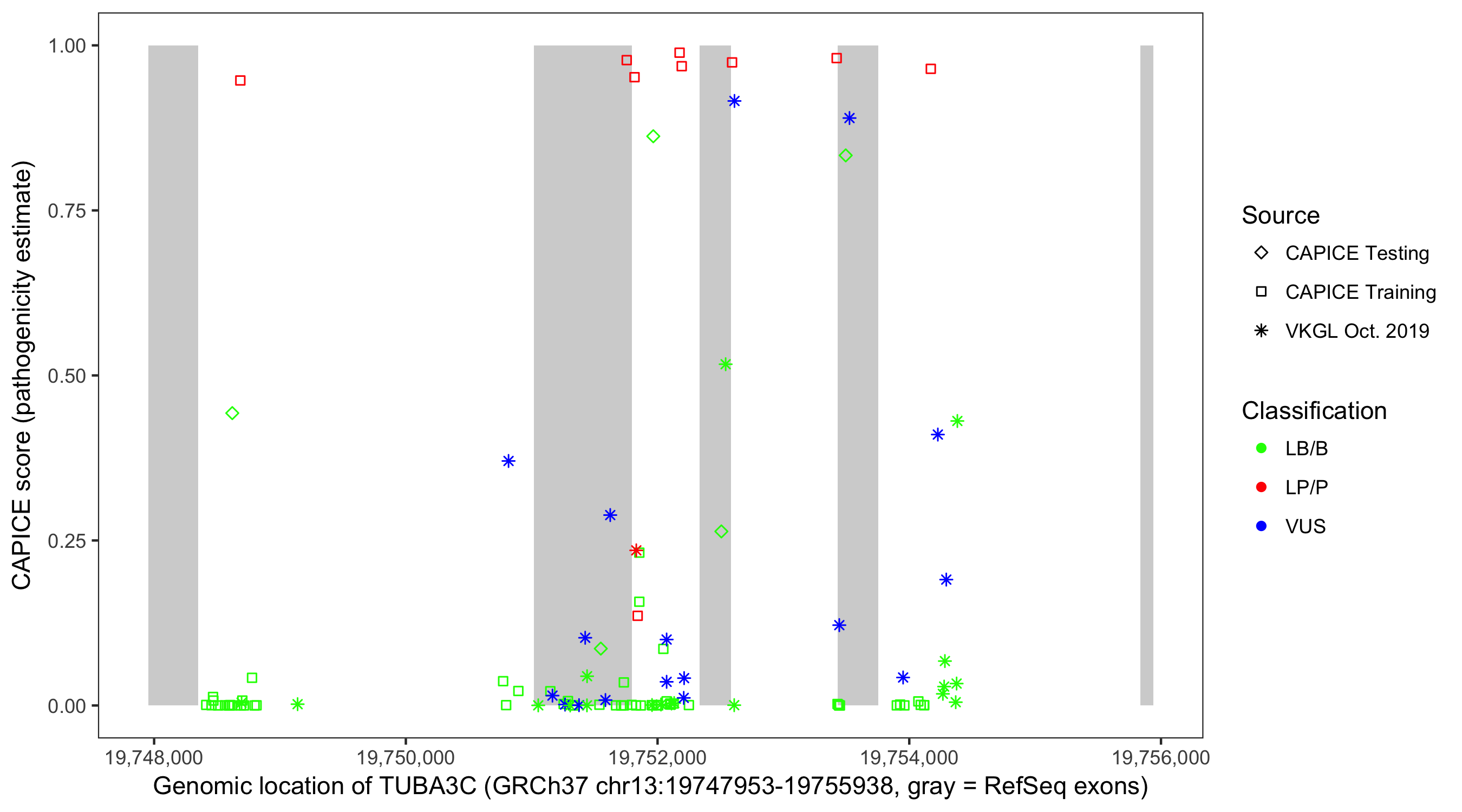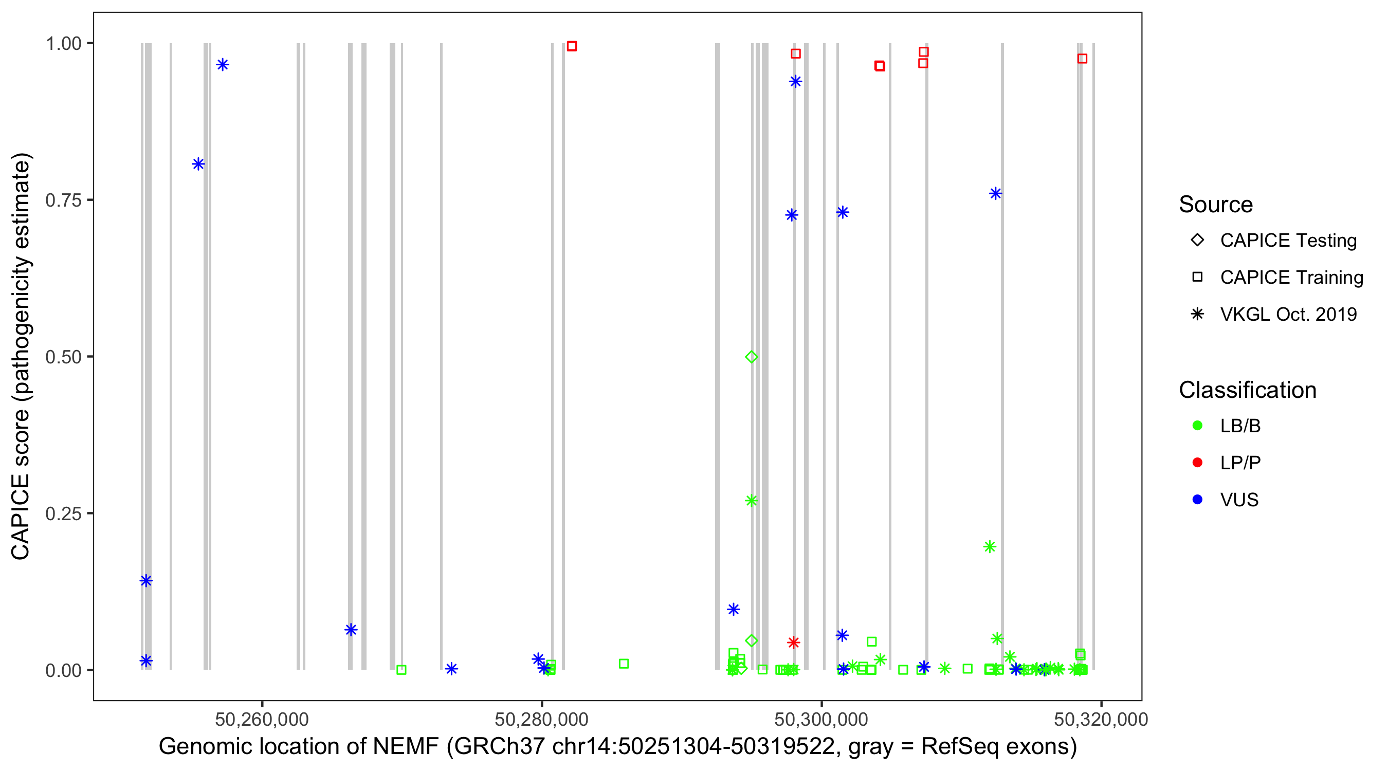 Shown are CAPICE train/test variants plus VKGL Oct 2019.