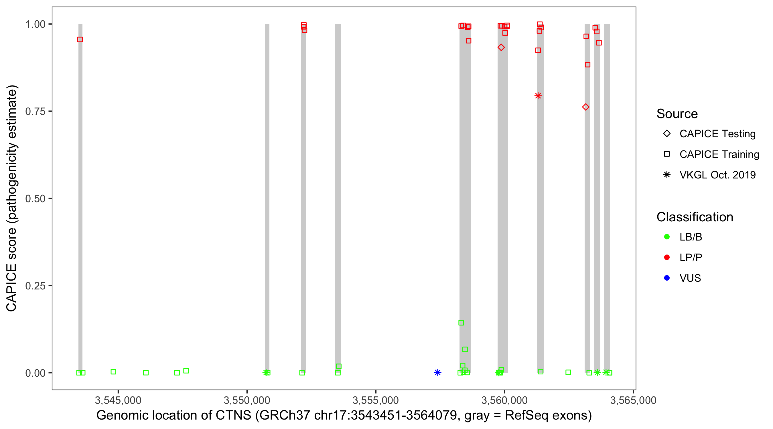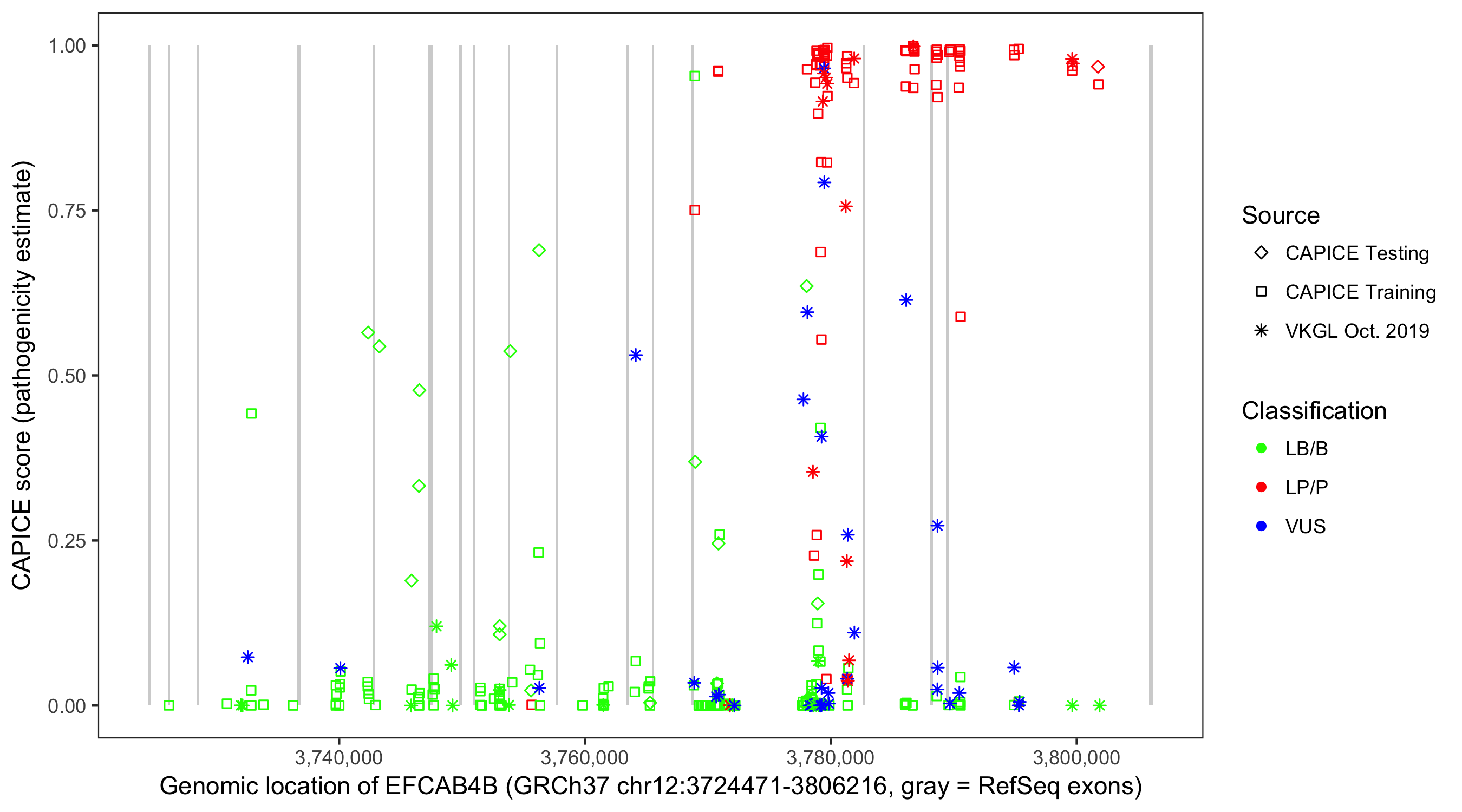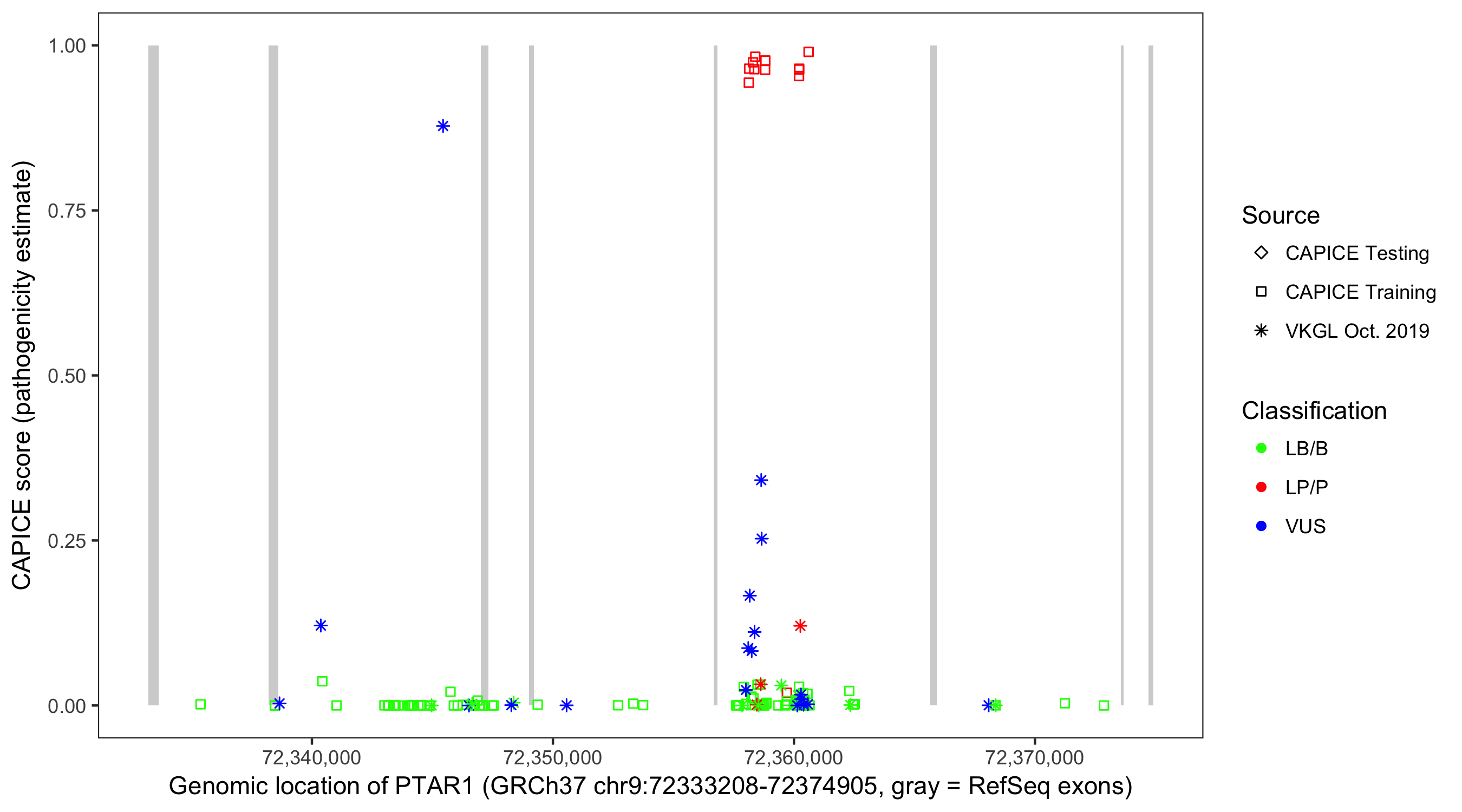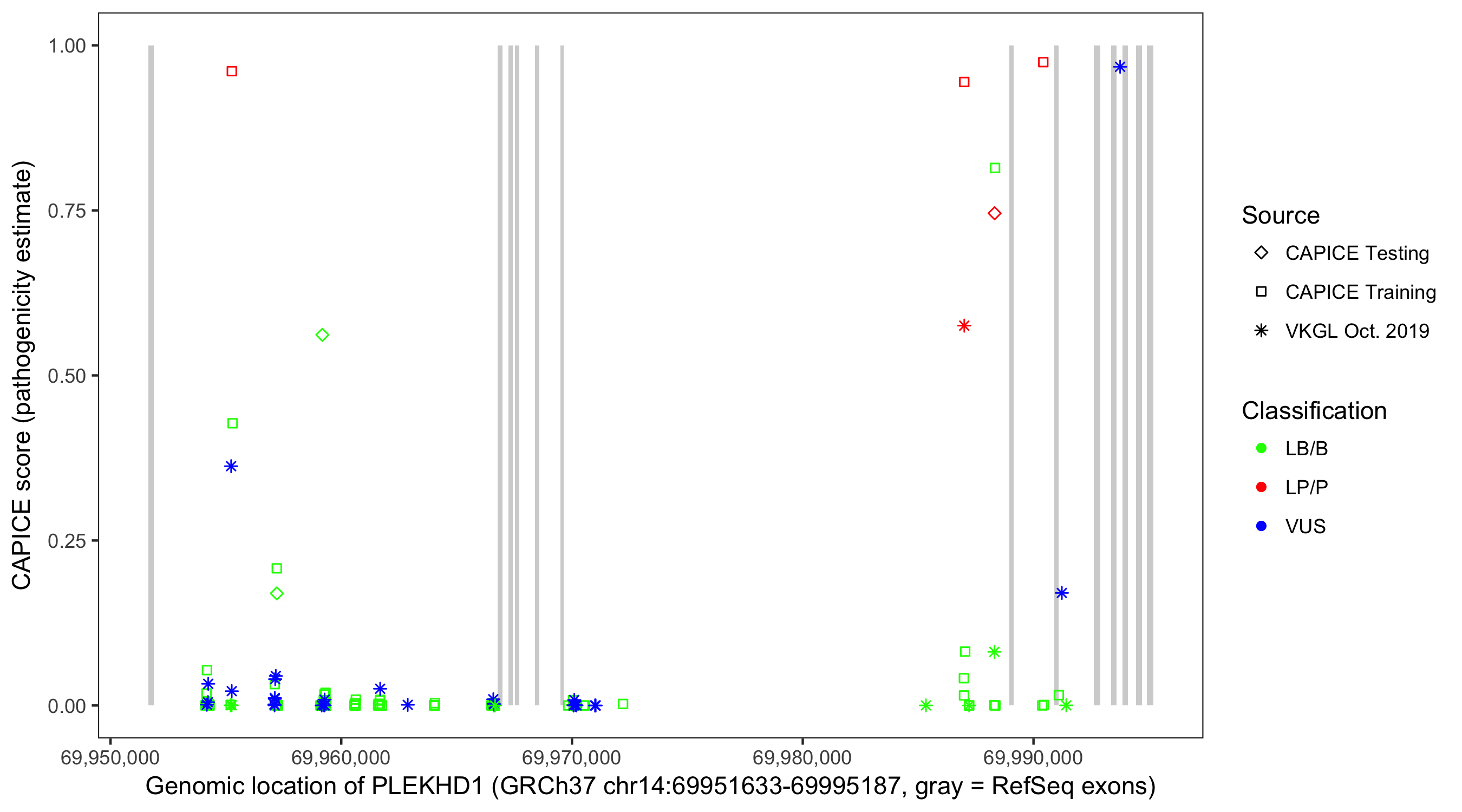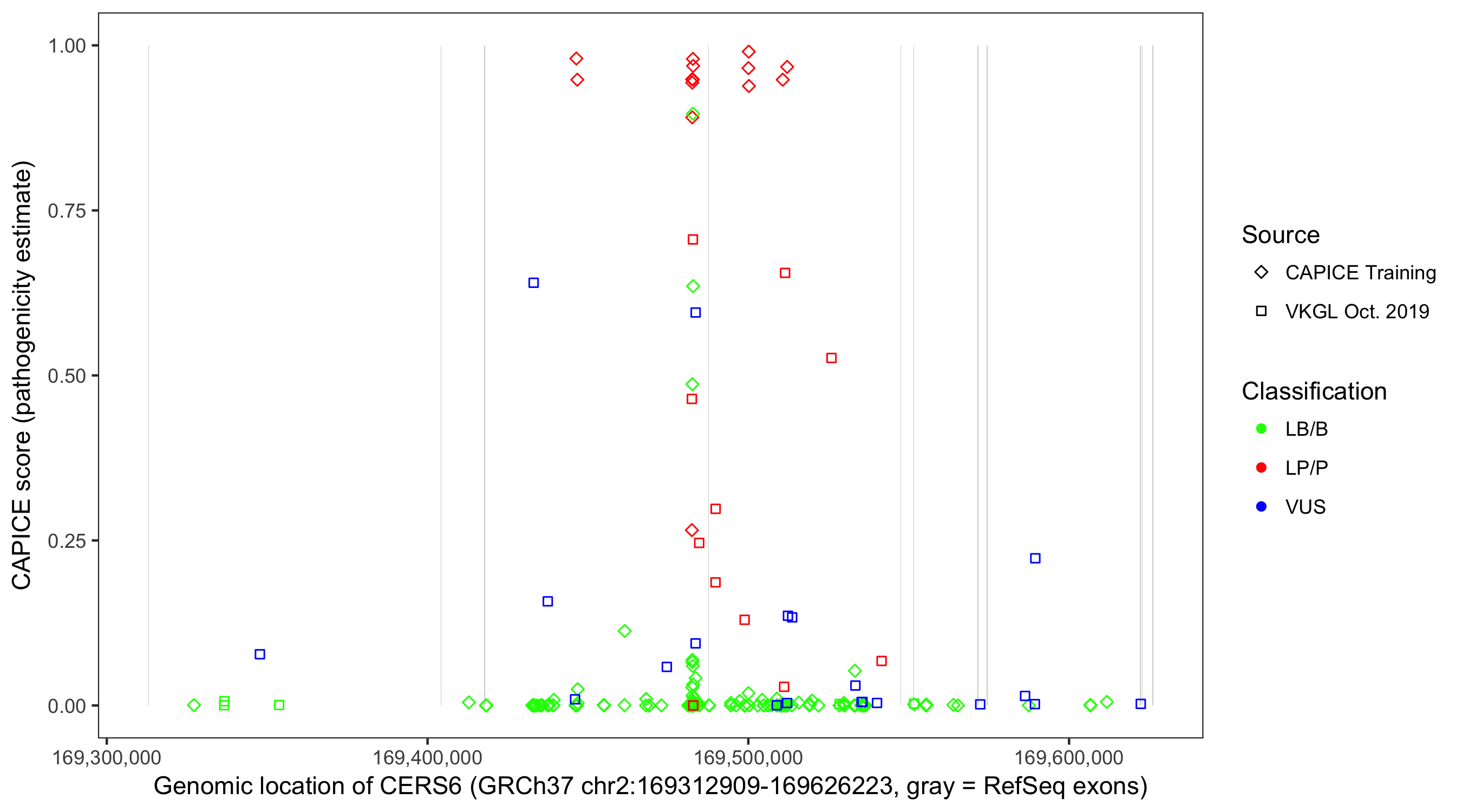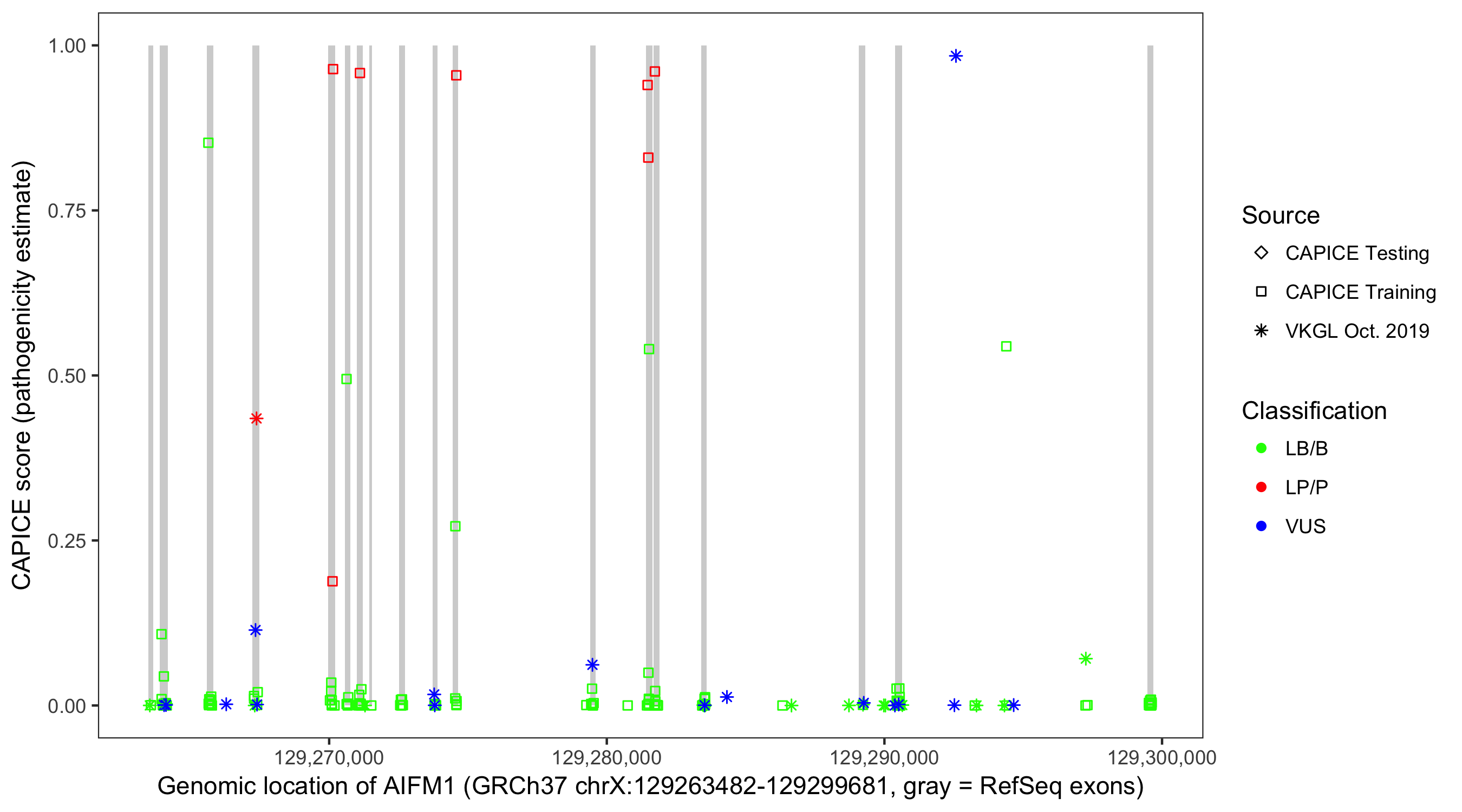 Shown are CAPICE train/test variants plus VKGL Oct 2019.
