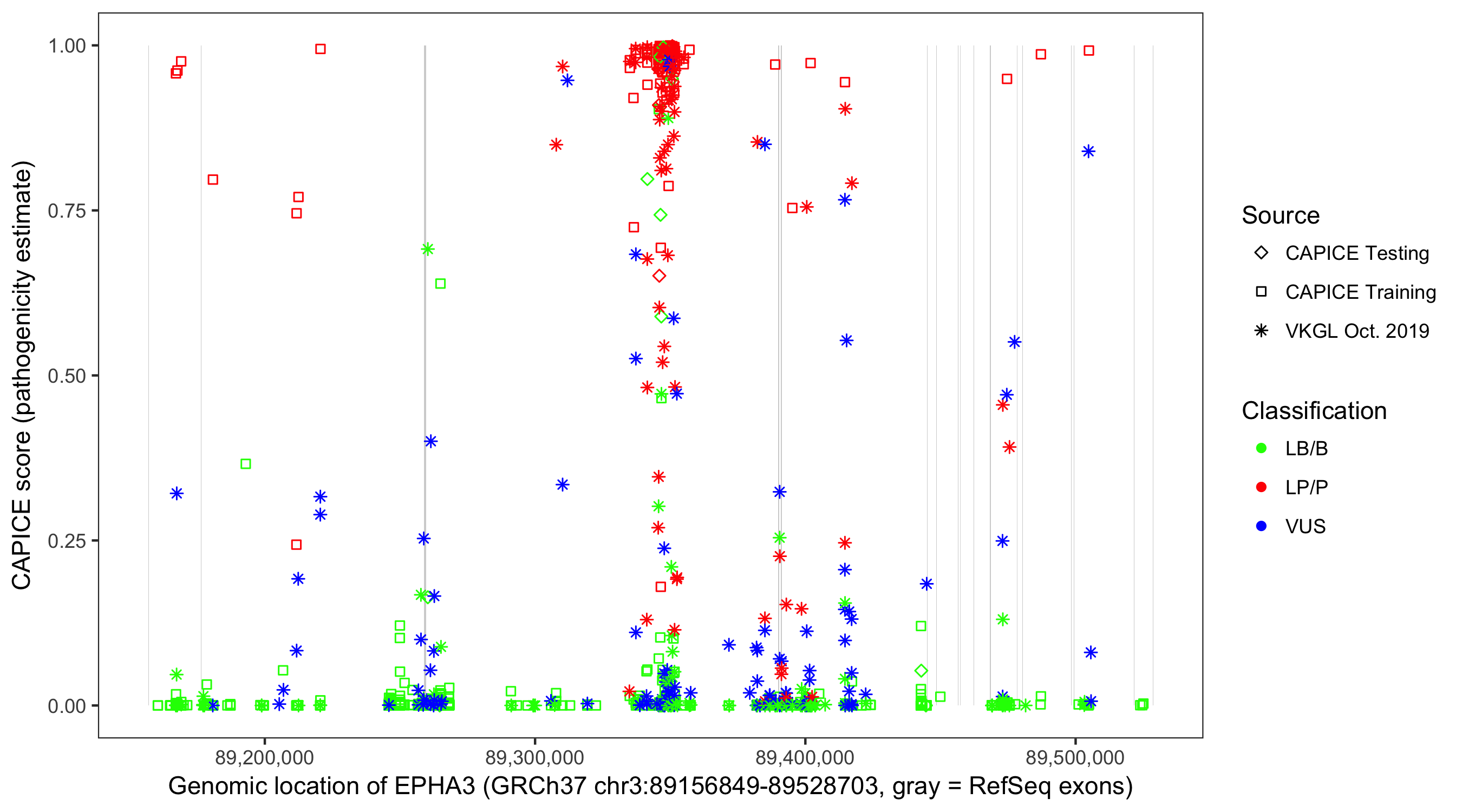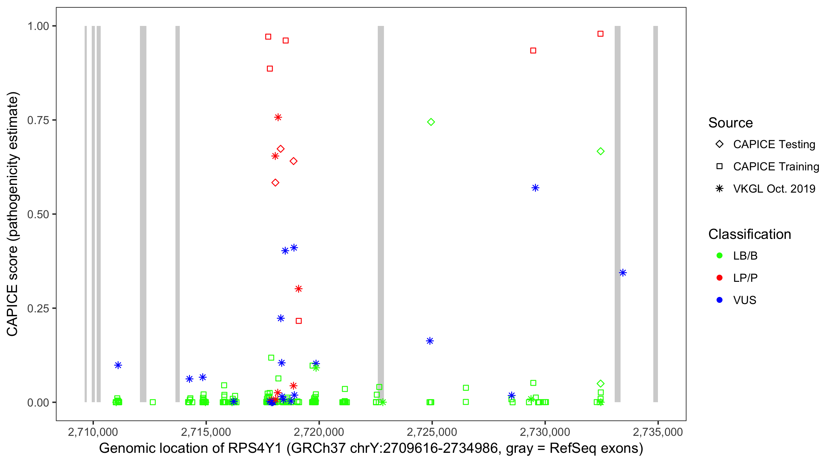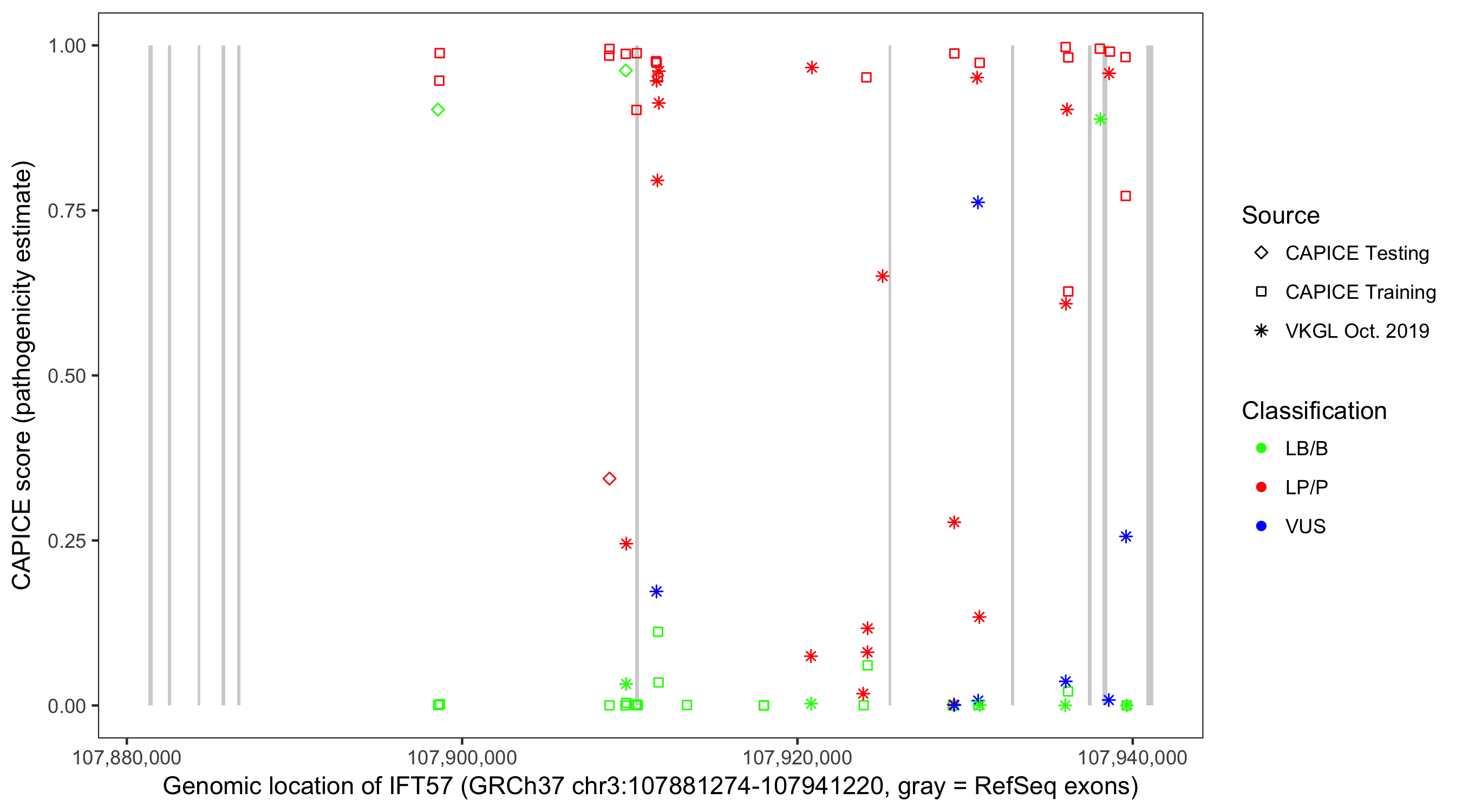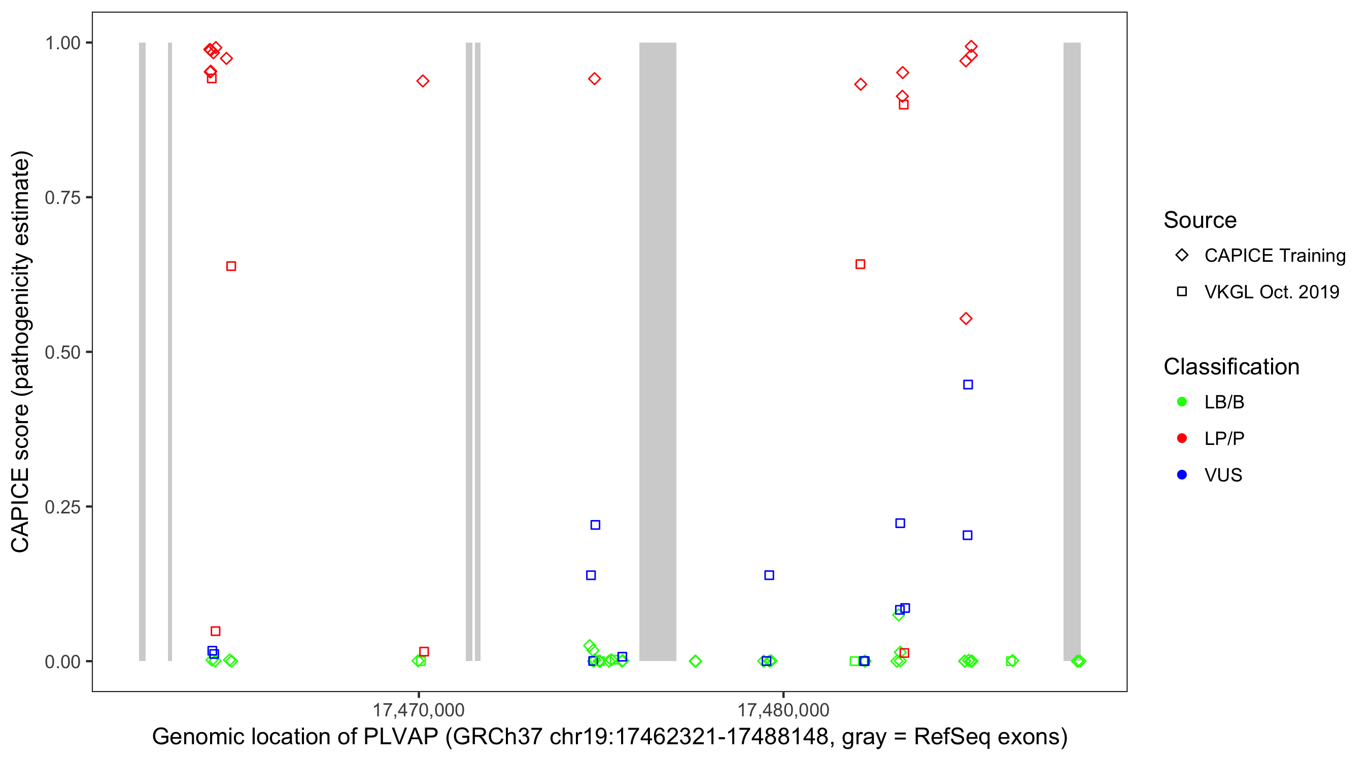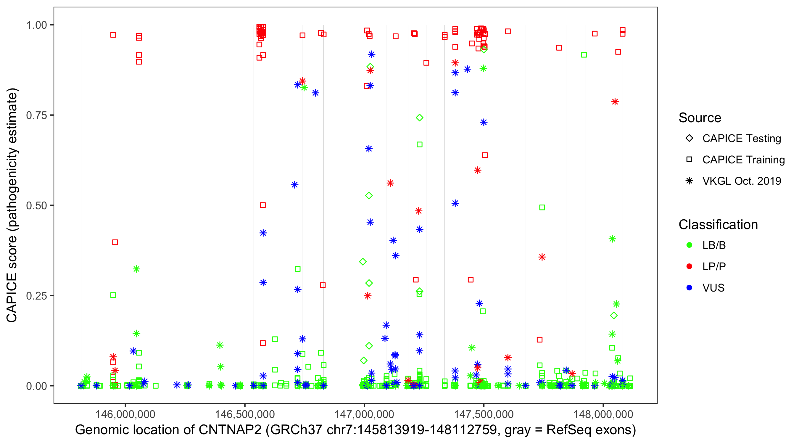 Shown are CAPICE train/test variants plus VKGL Oct 2019.