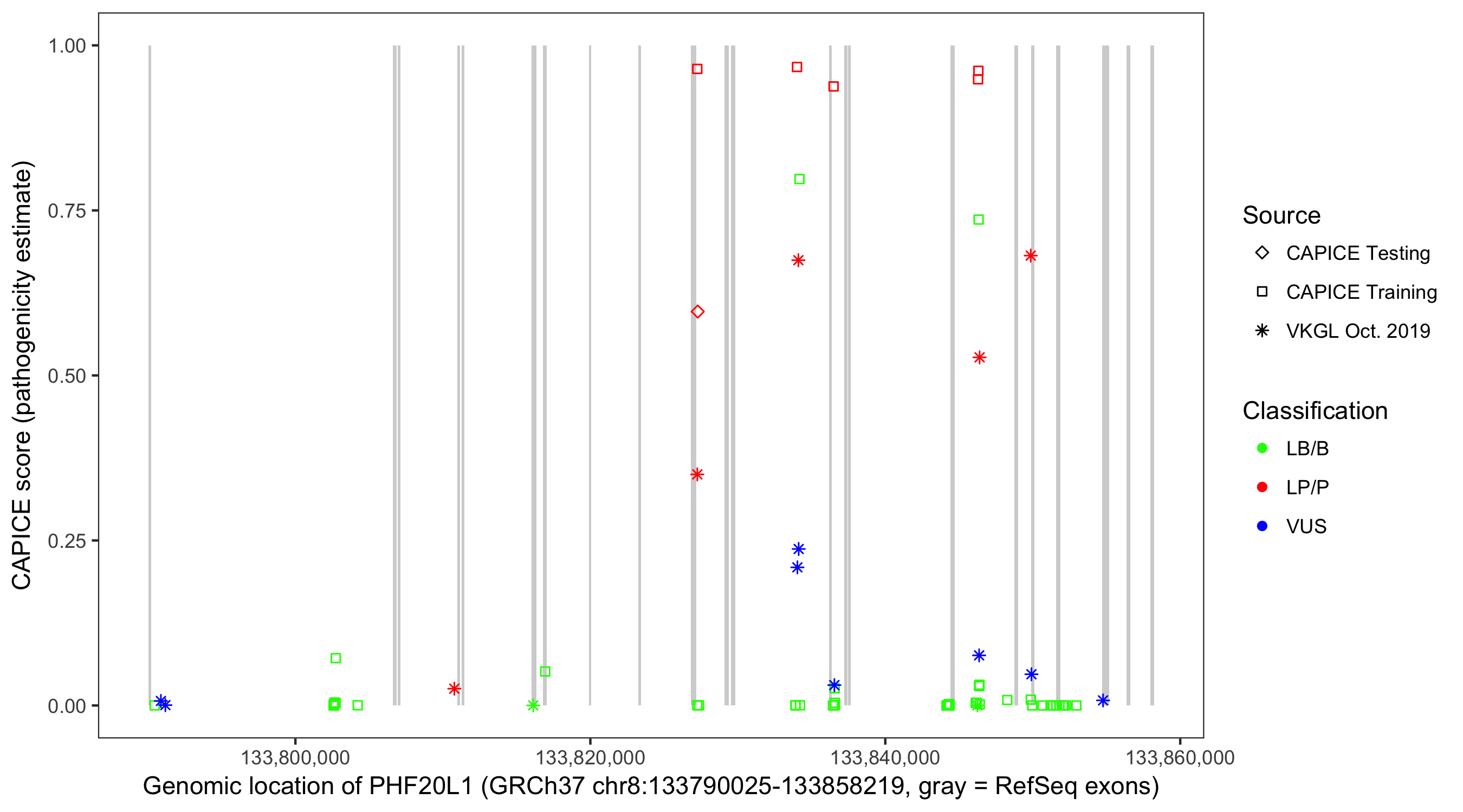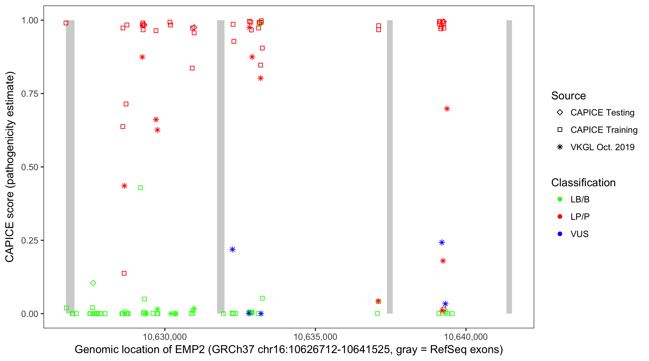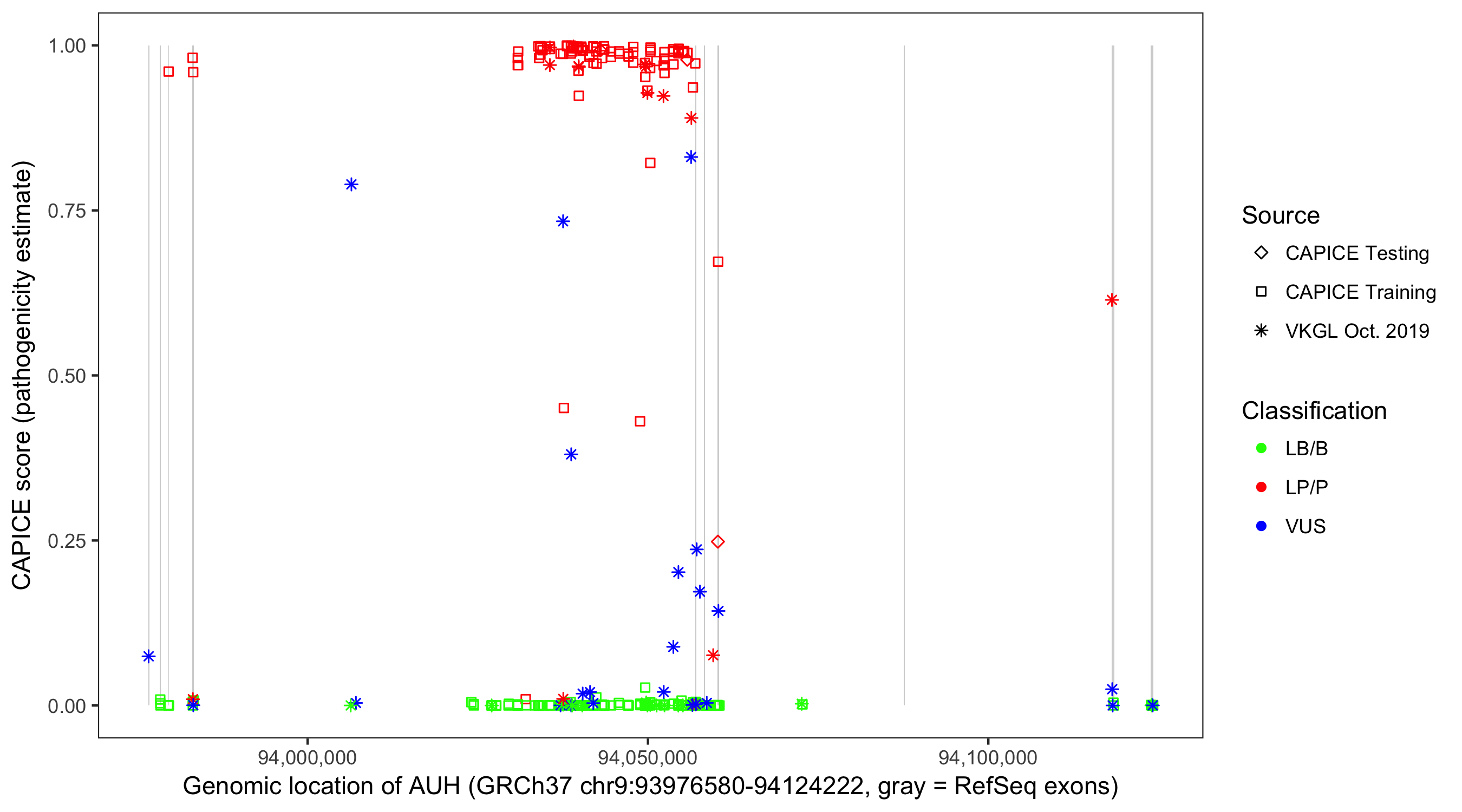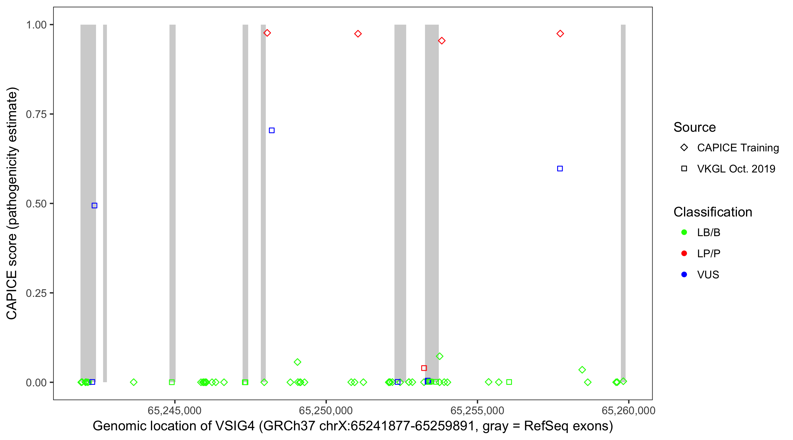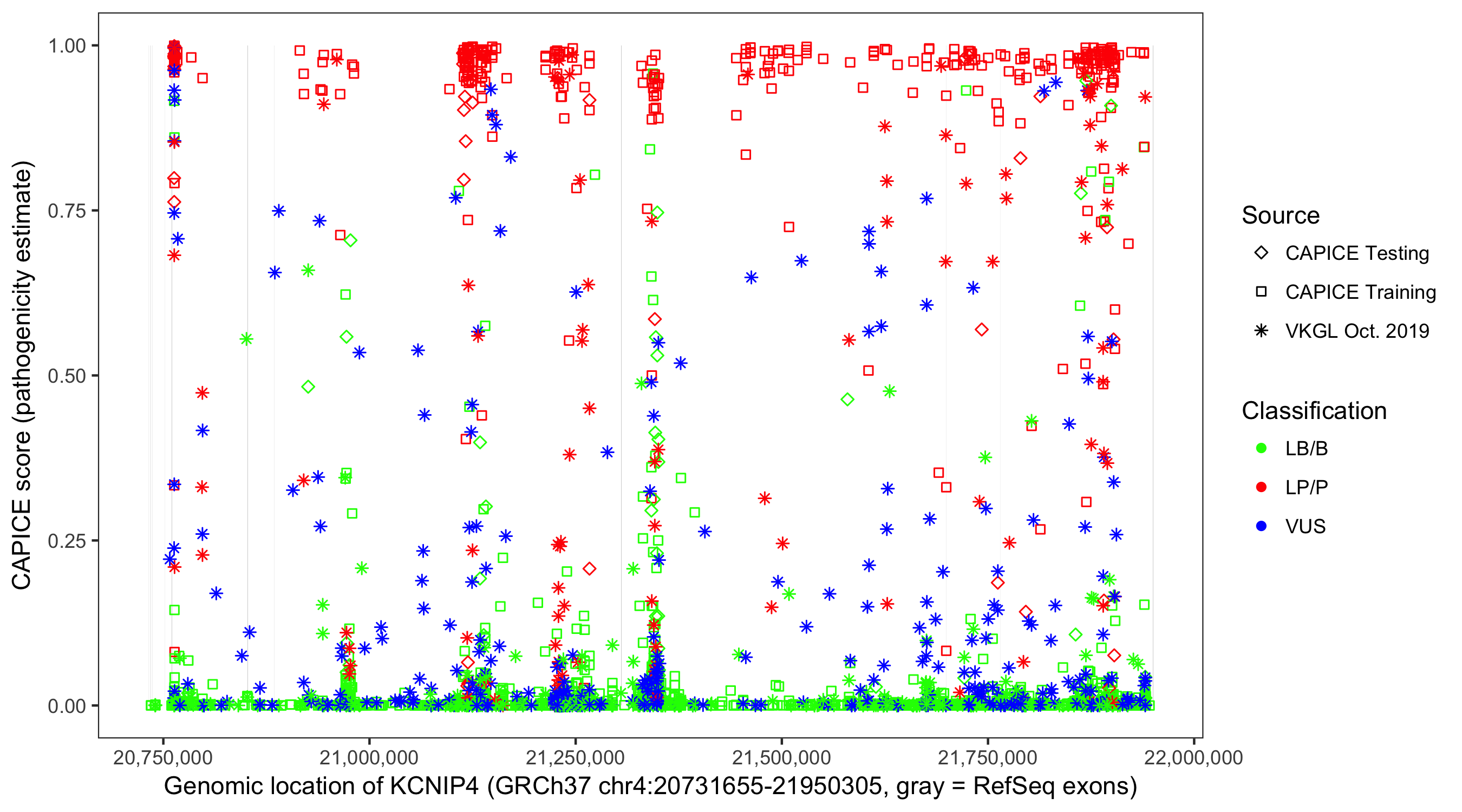 Shown are CAPICE train/test variants plus VKGL Oct 2019.