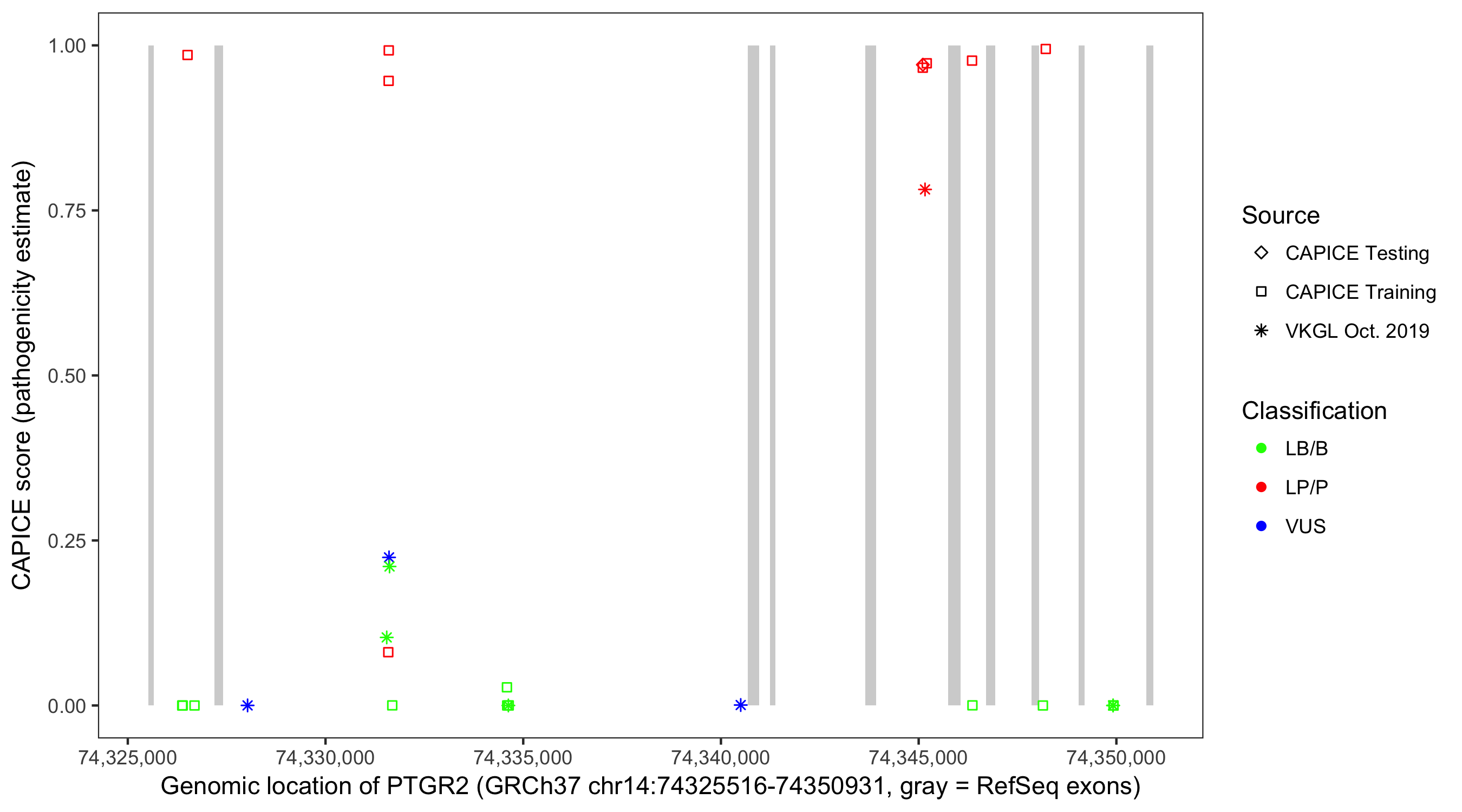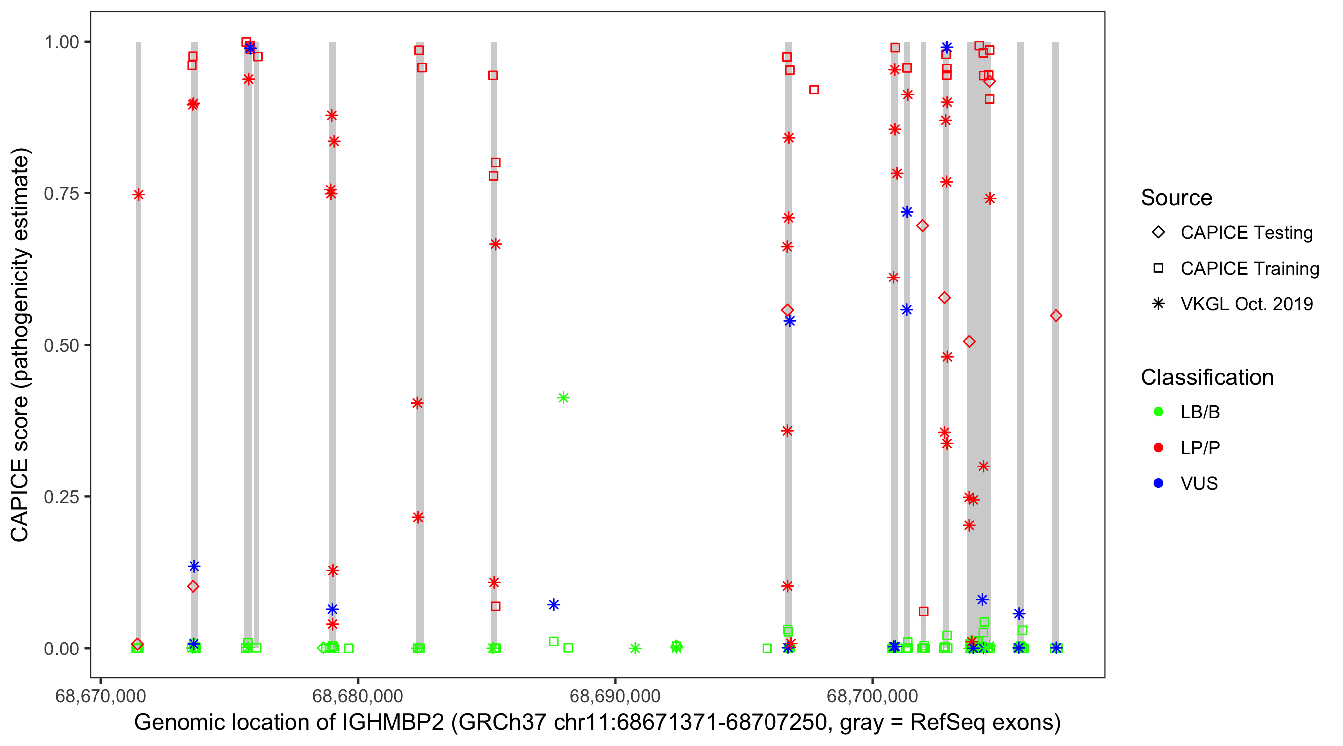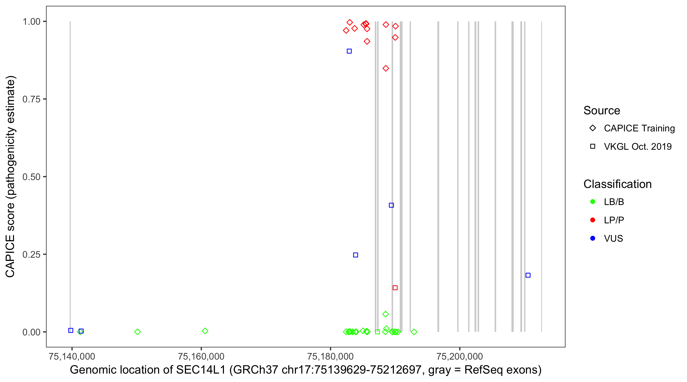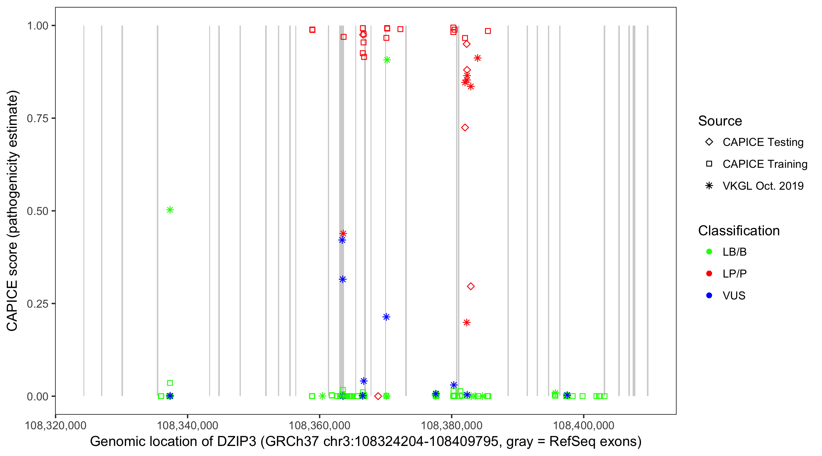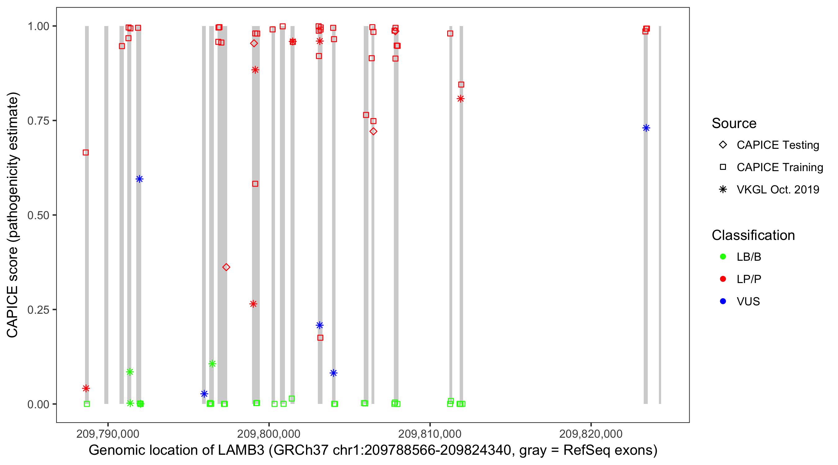 Shown are CAPICE train/test variants plus VKGL Oct 2019.