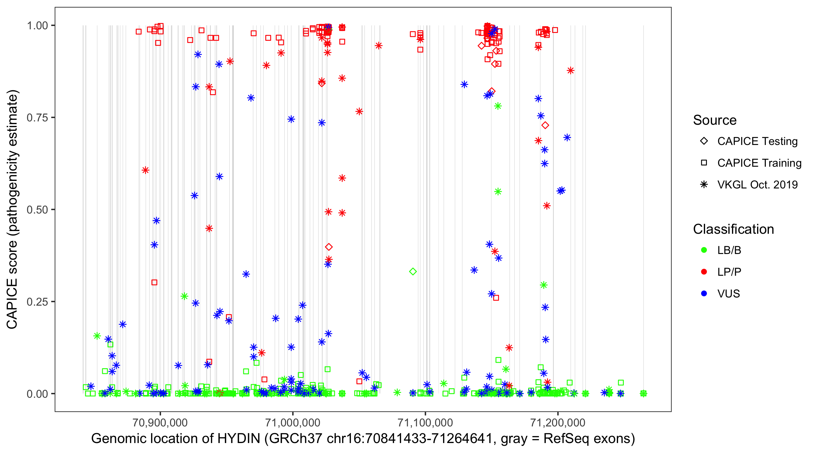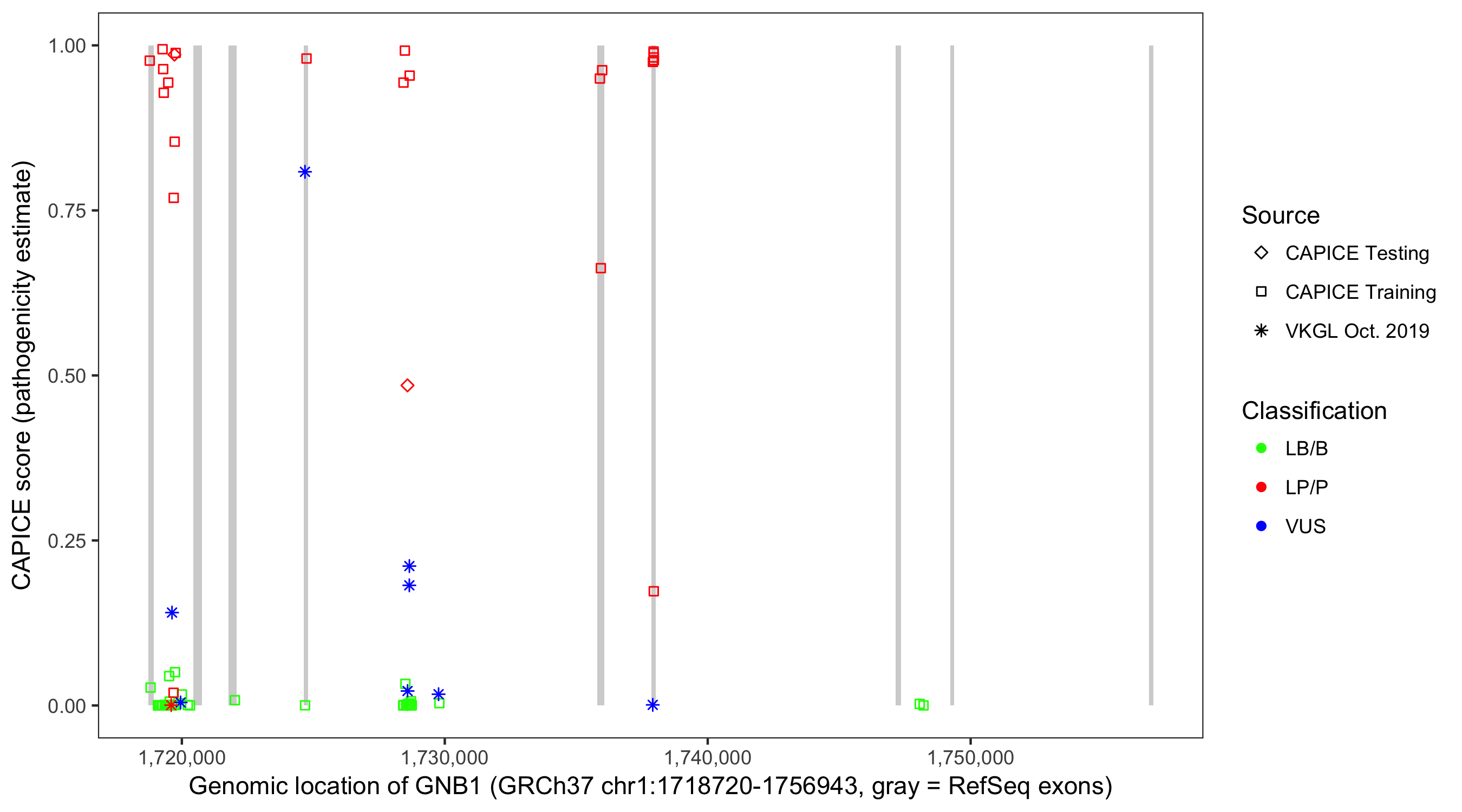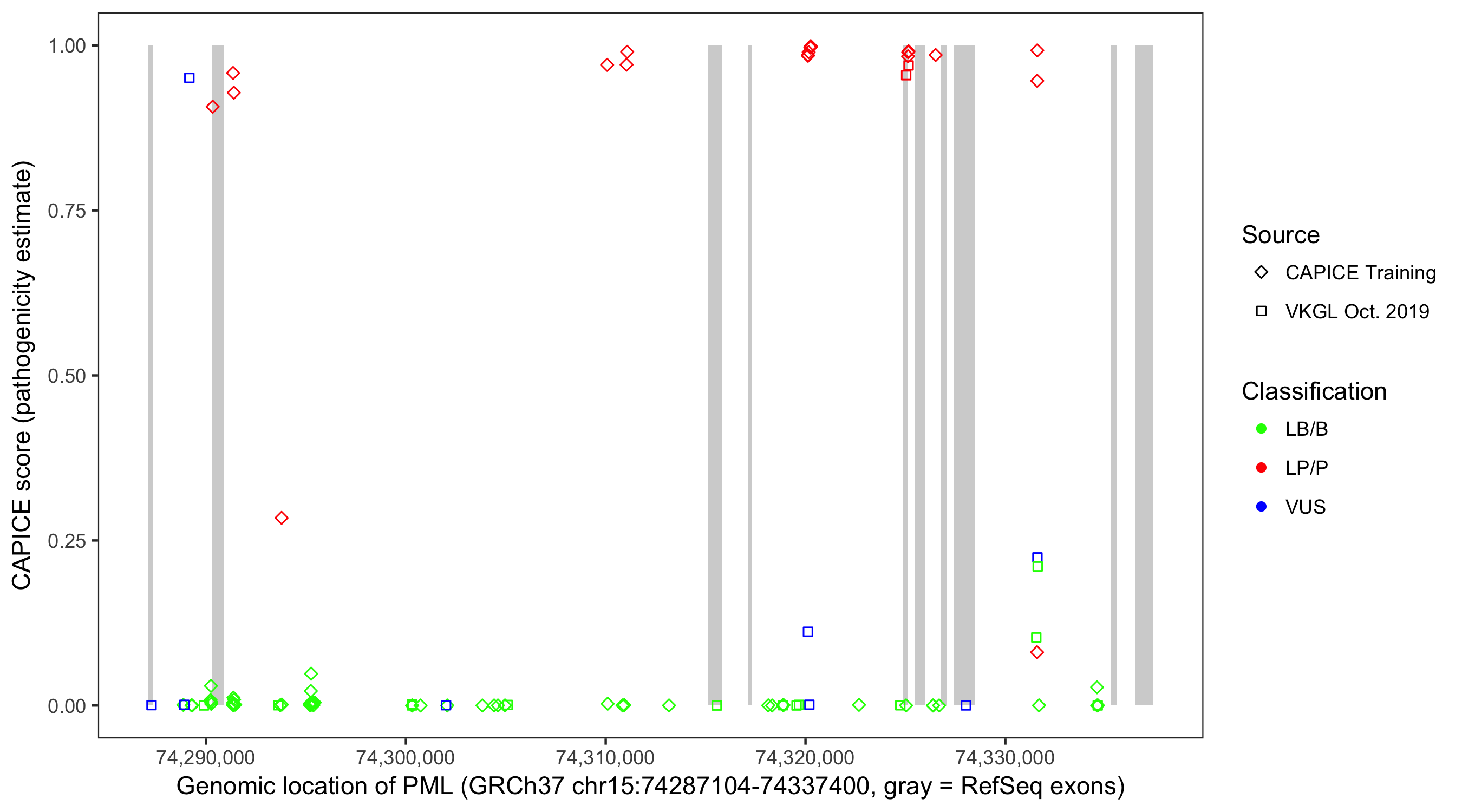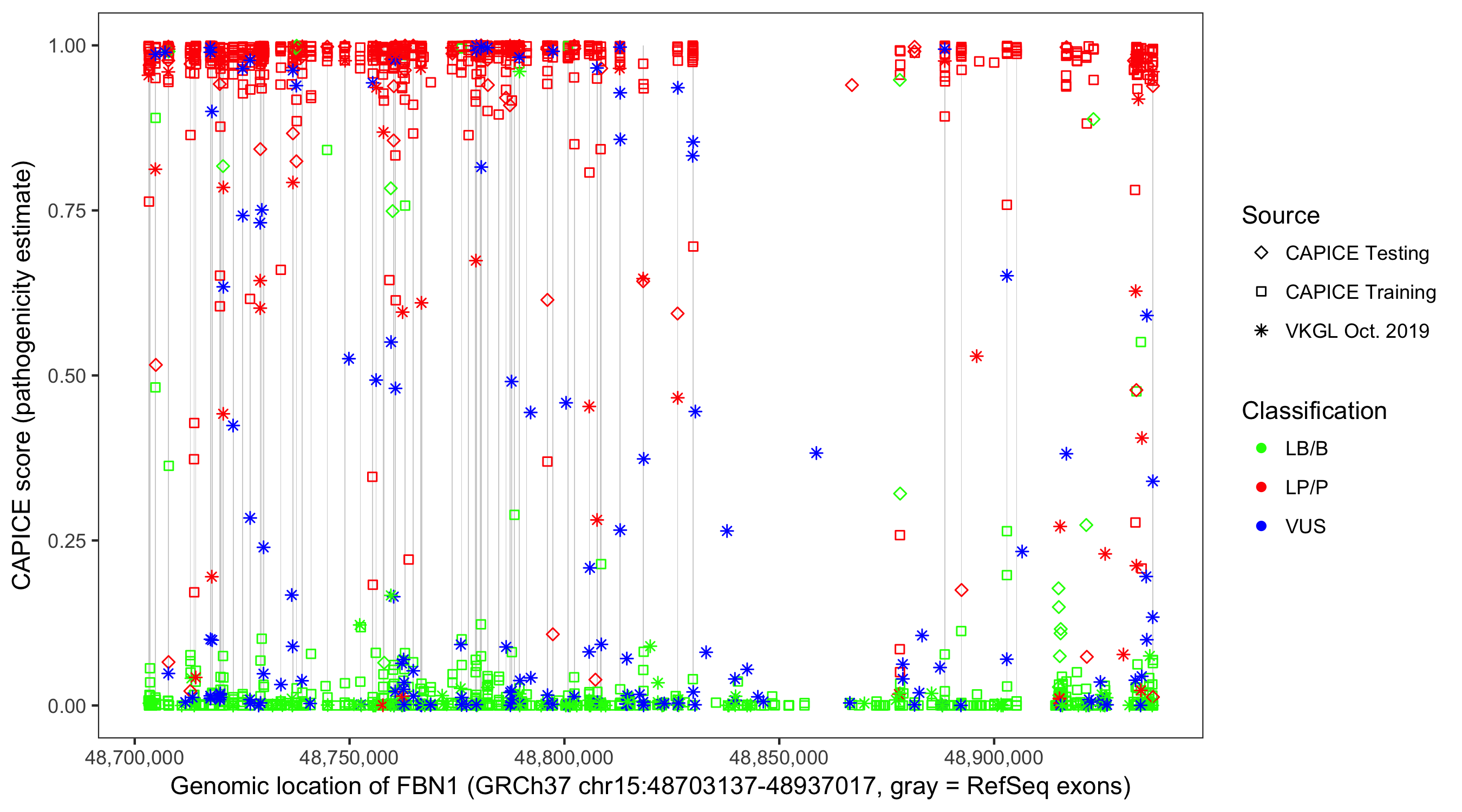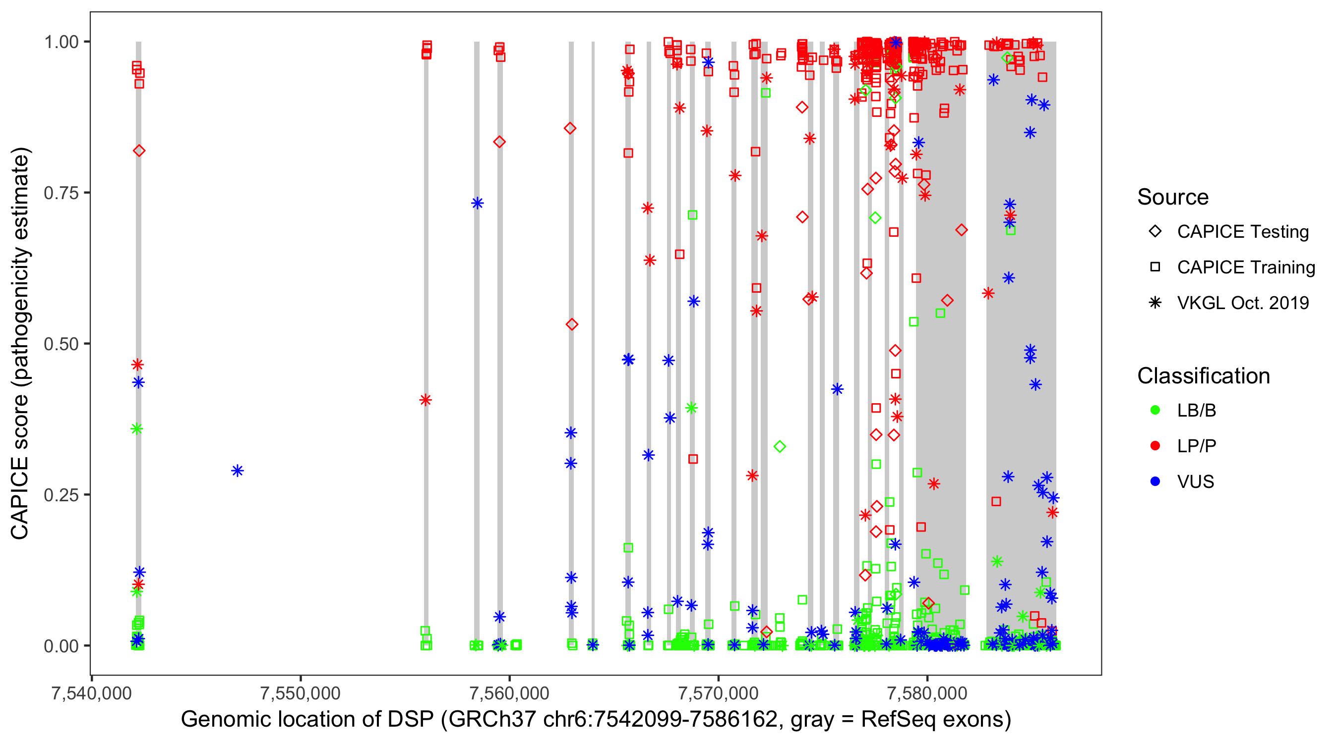 Shown are CAPICE train/test variants plus VKGL Oct 2019.