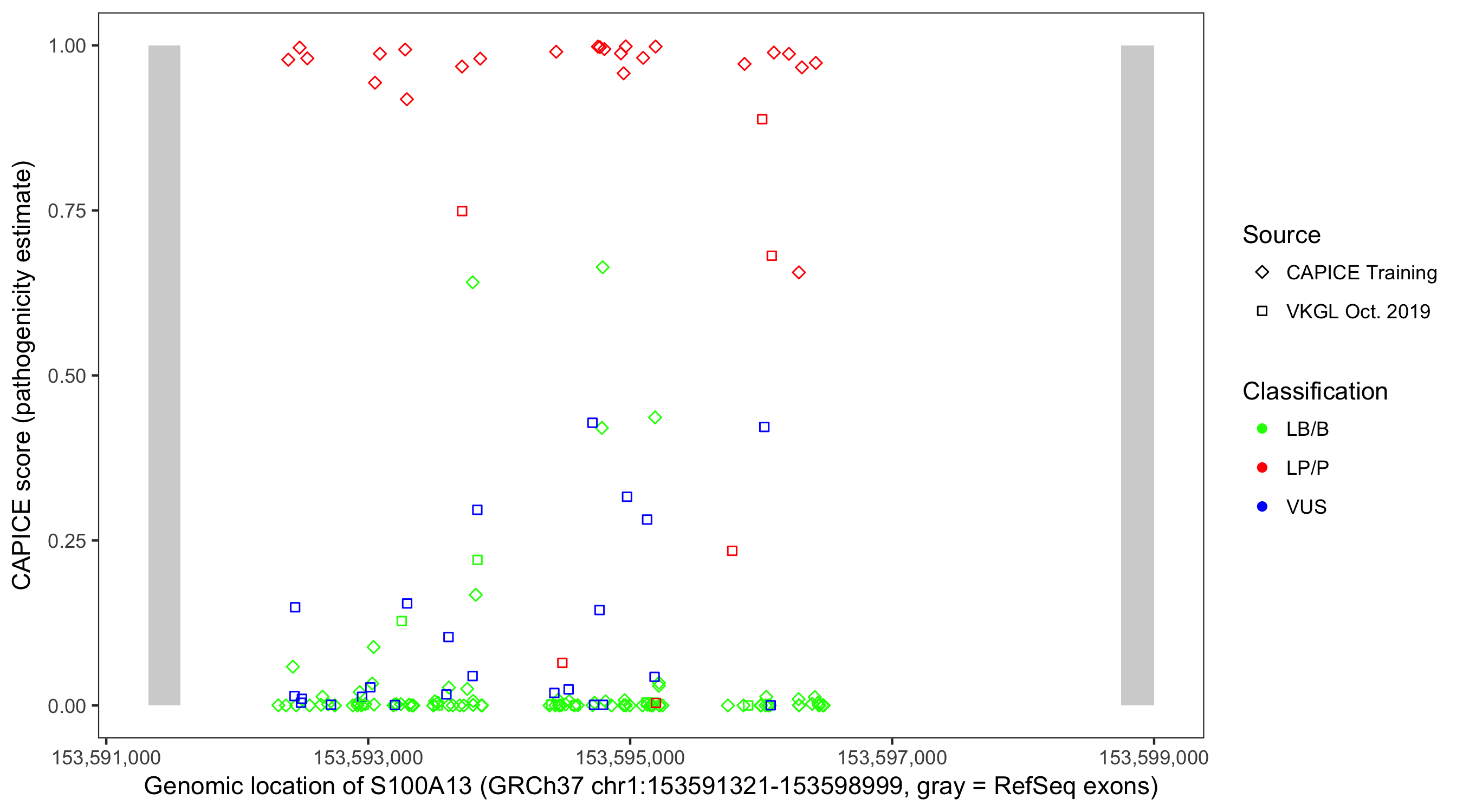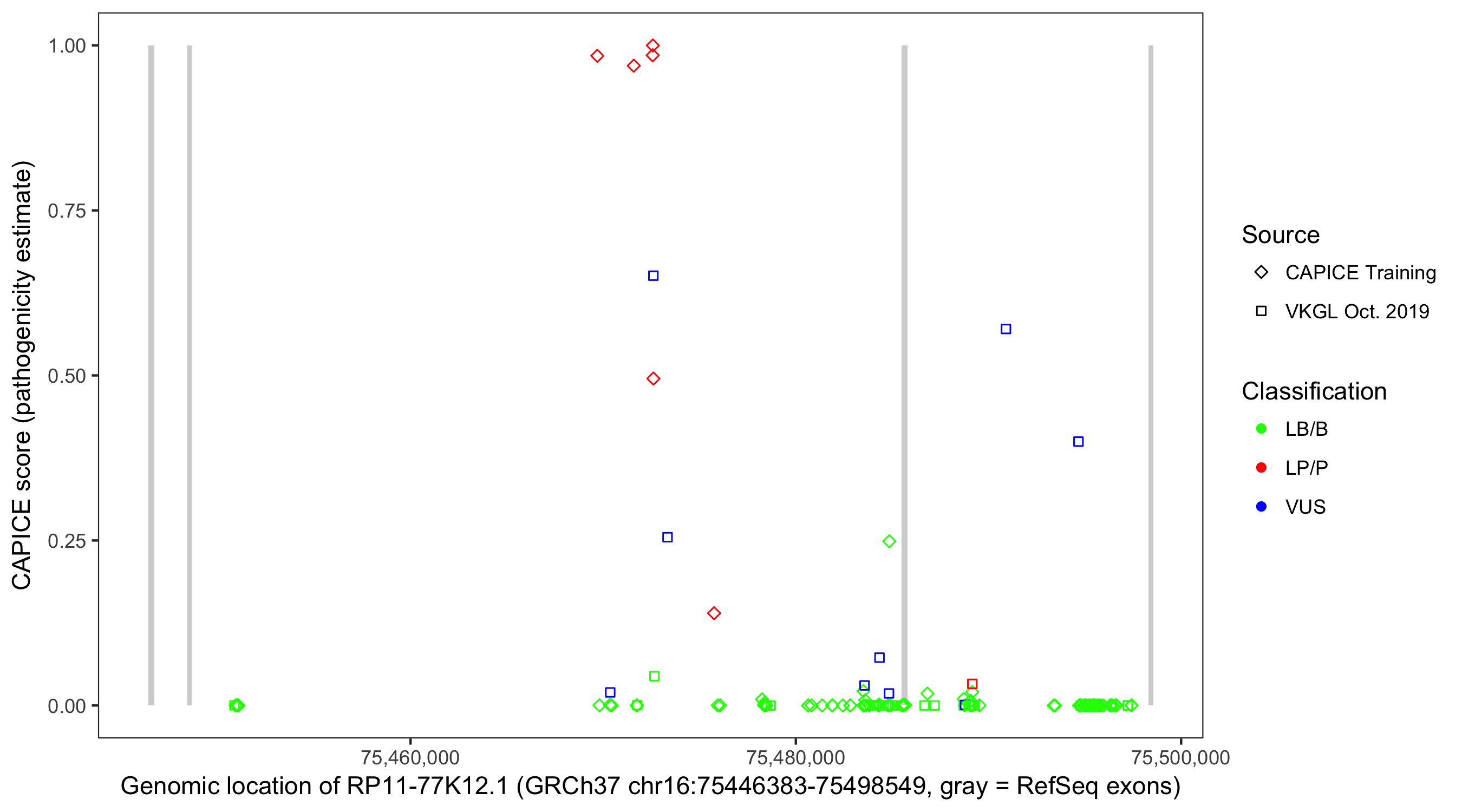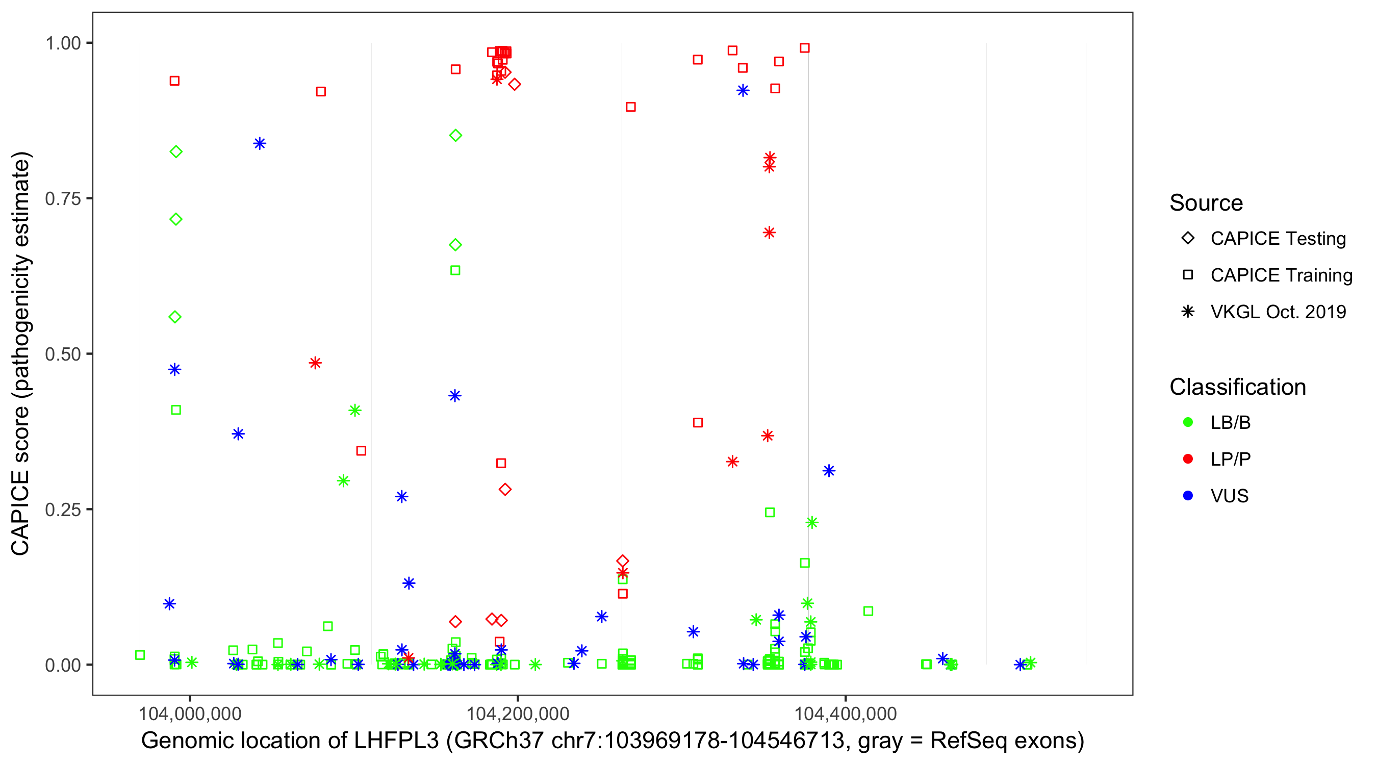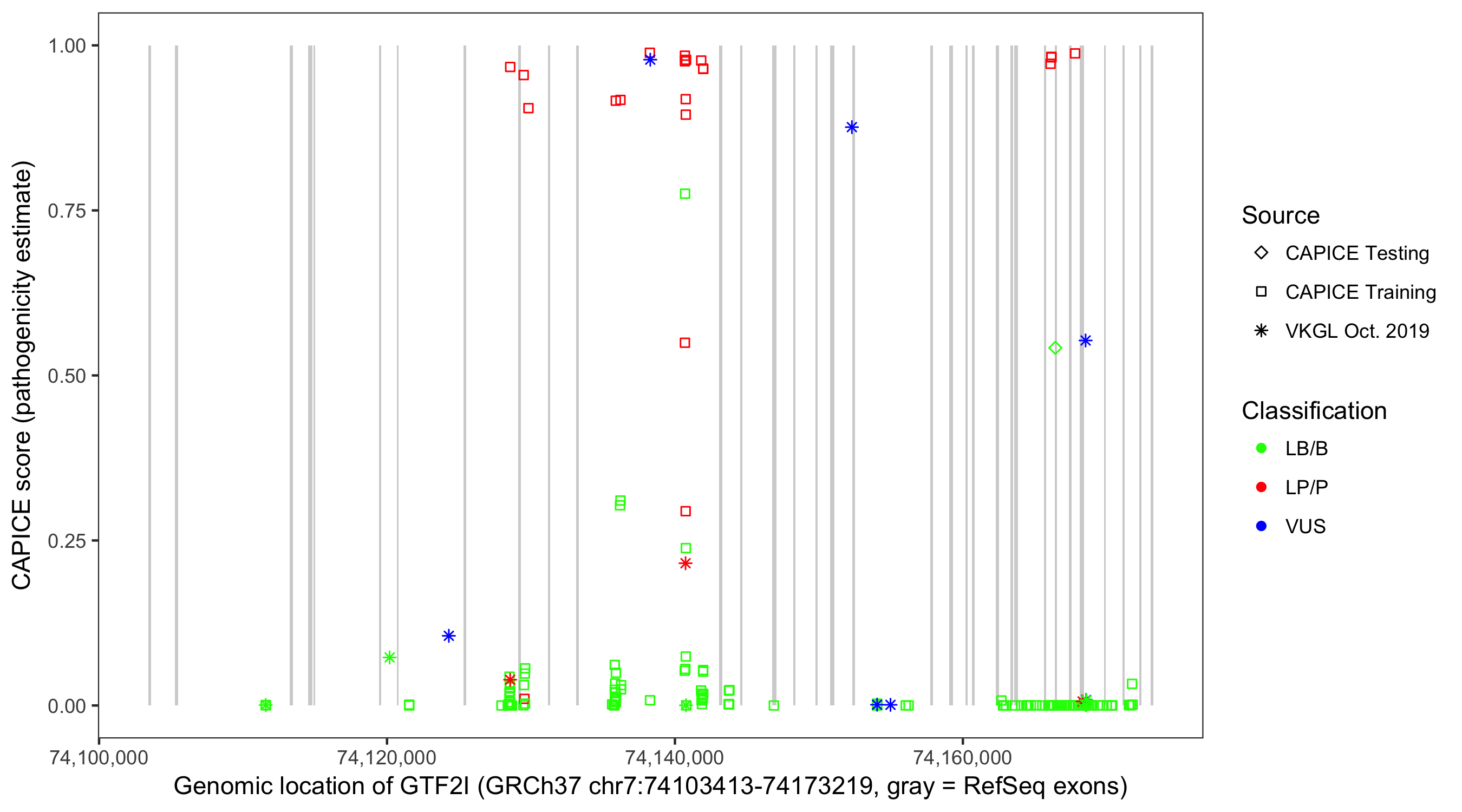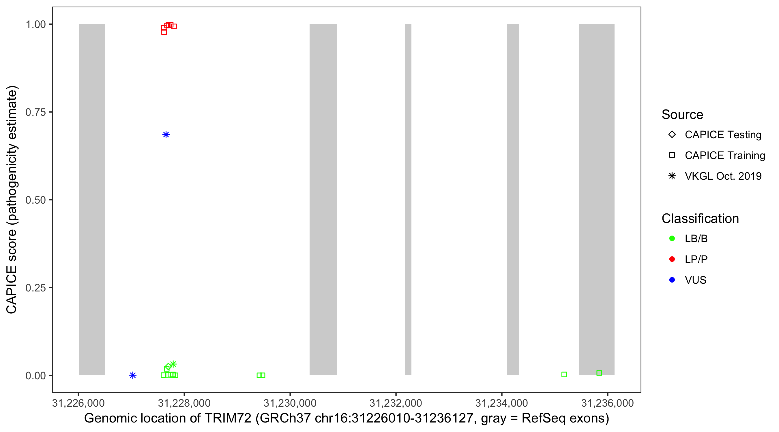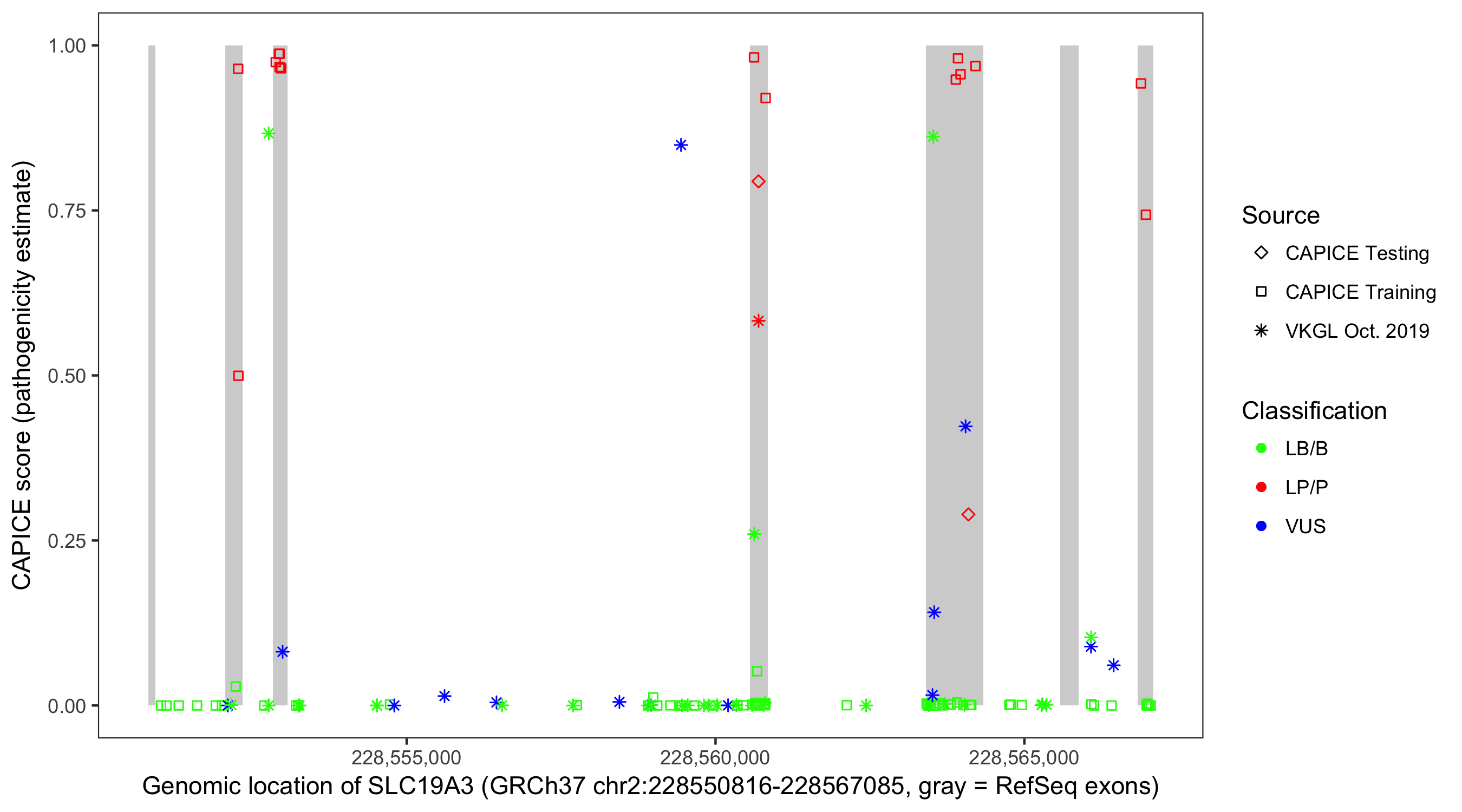 Shown are CAPICE train/test variants plus VKGL Oct 2019.