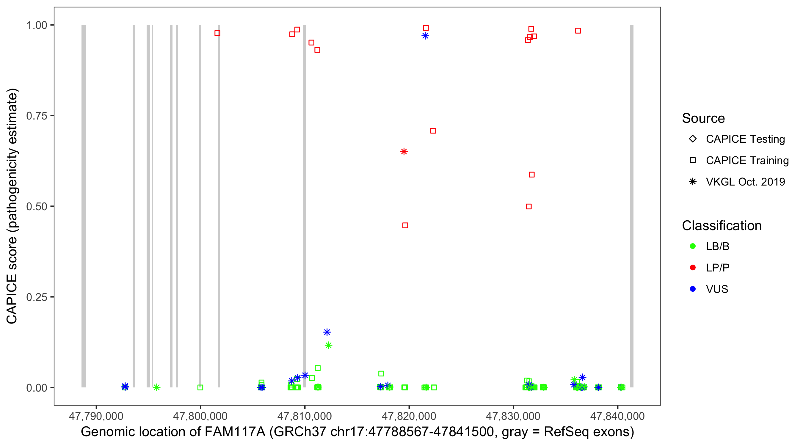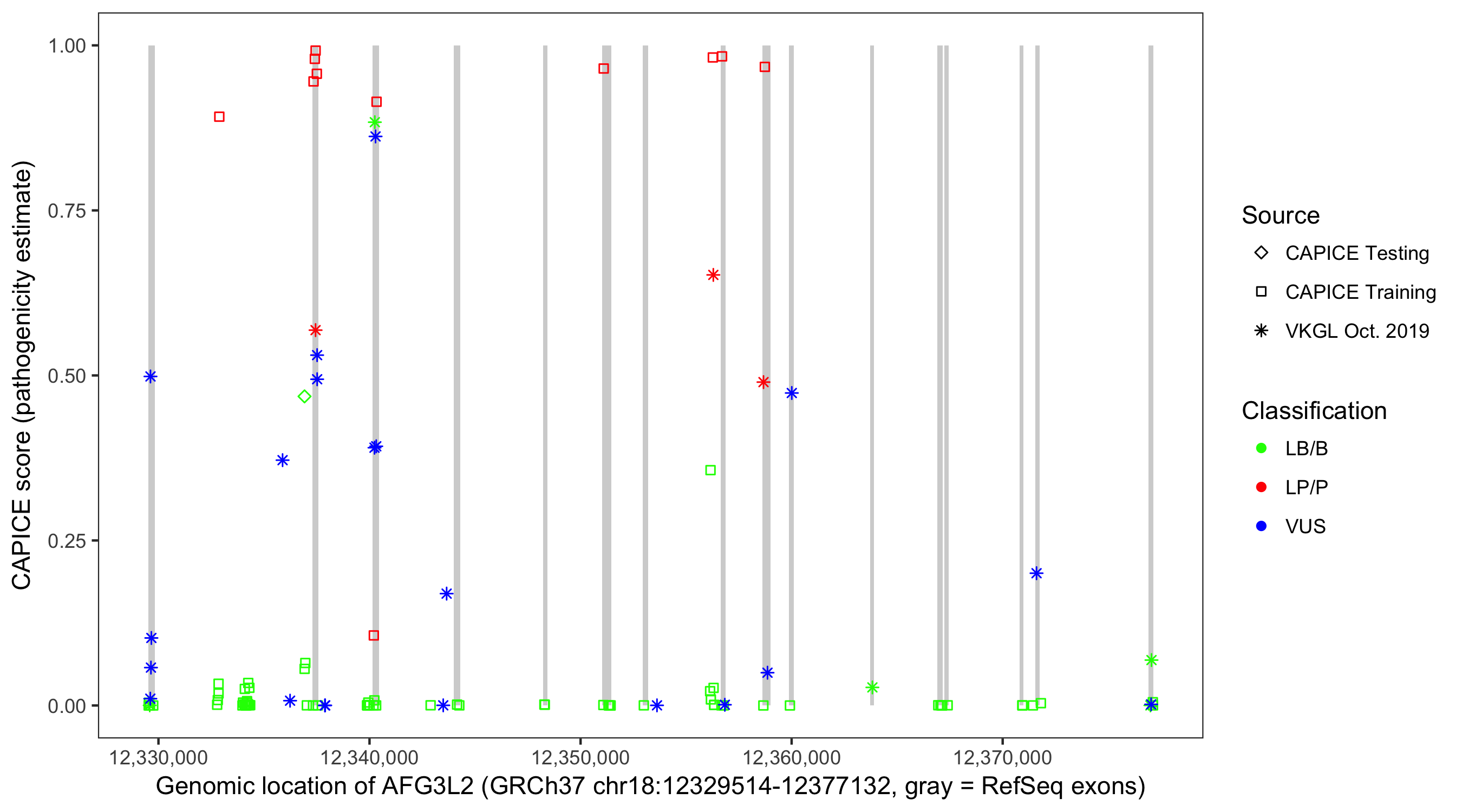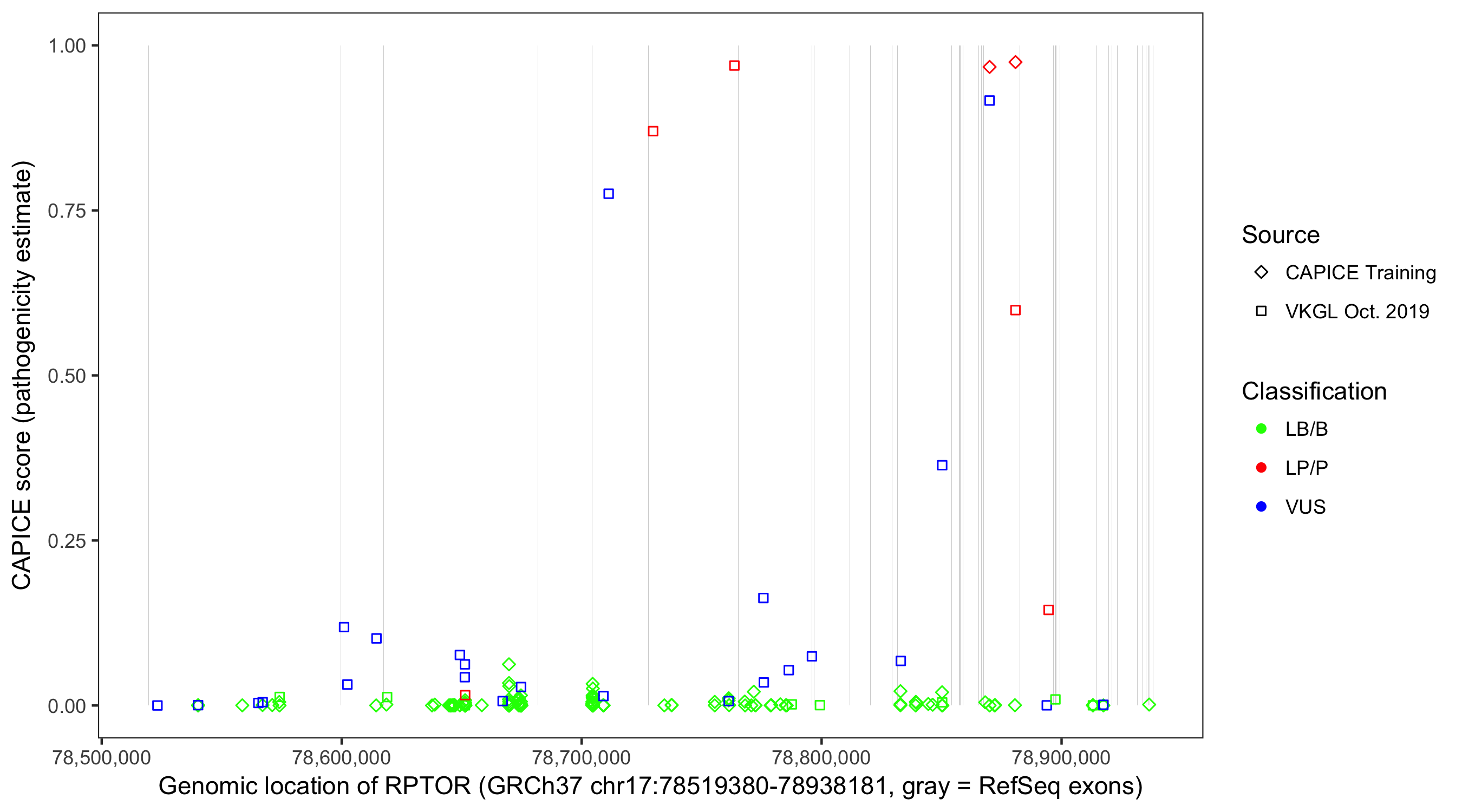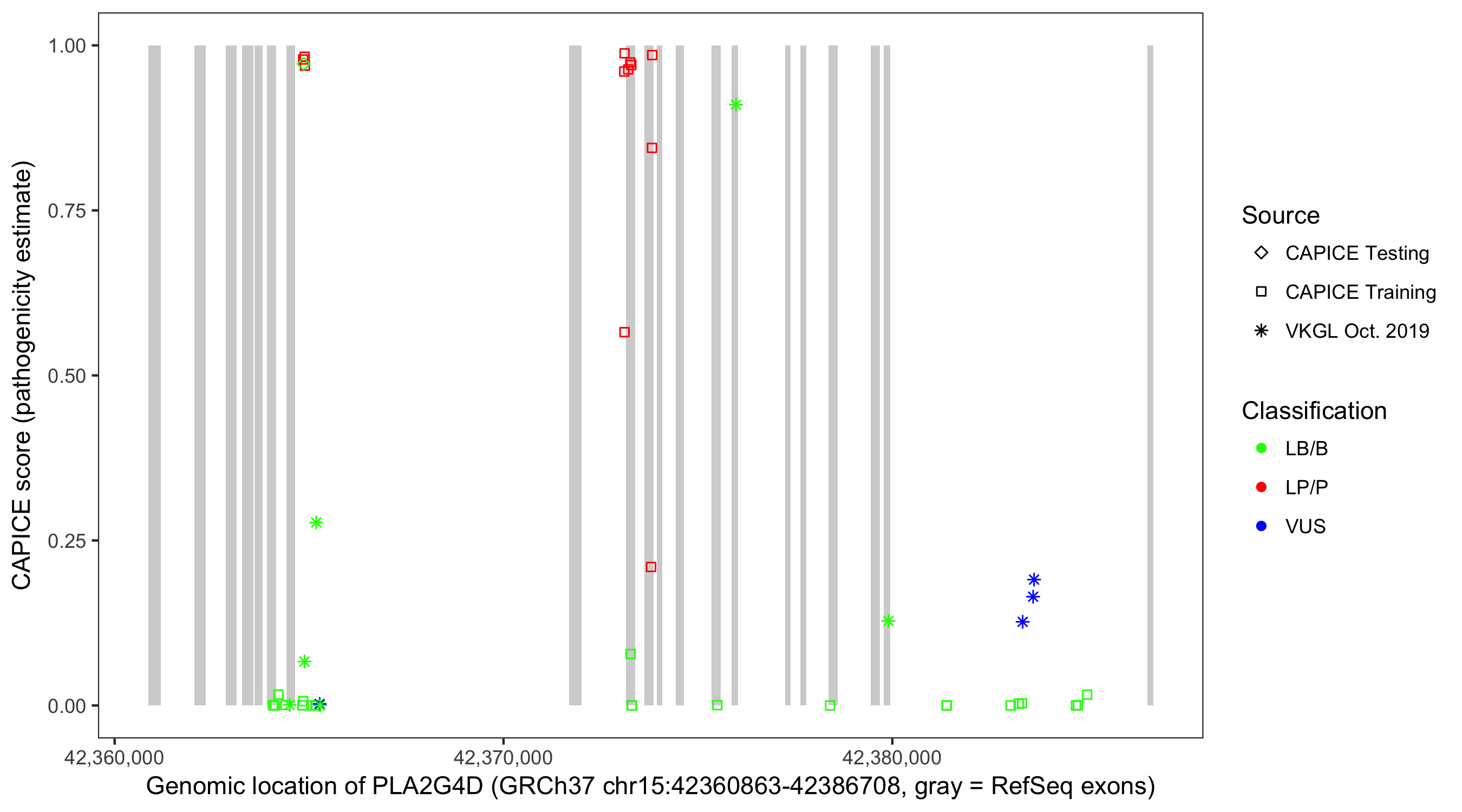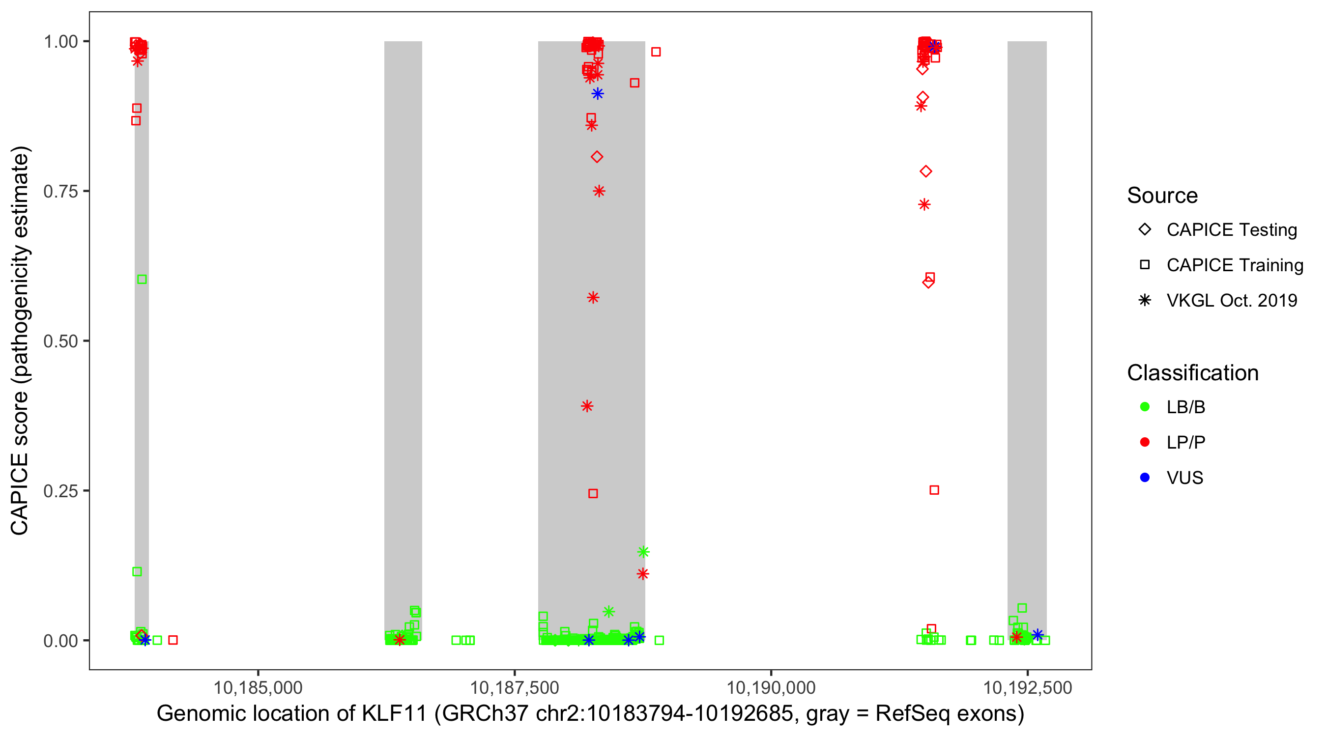 Shown are CAPICE train/test variants plus VKGL Oct 2019.