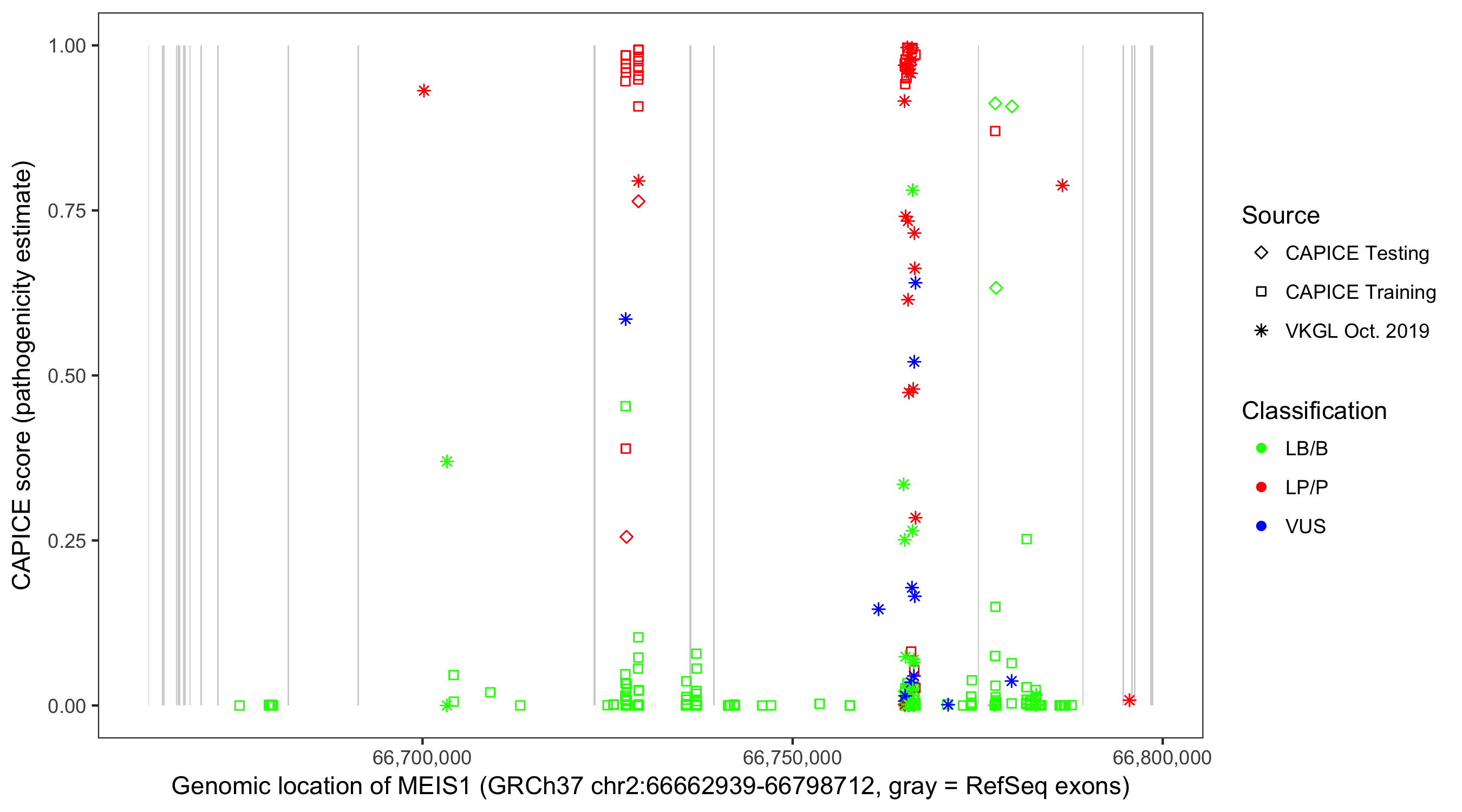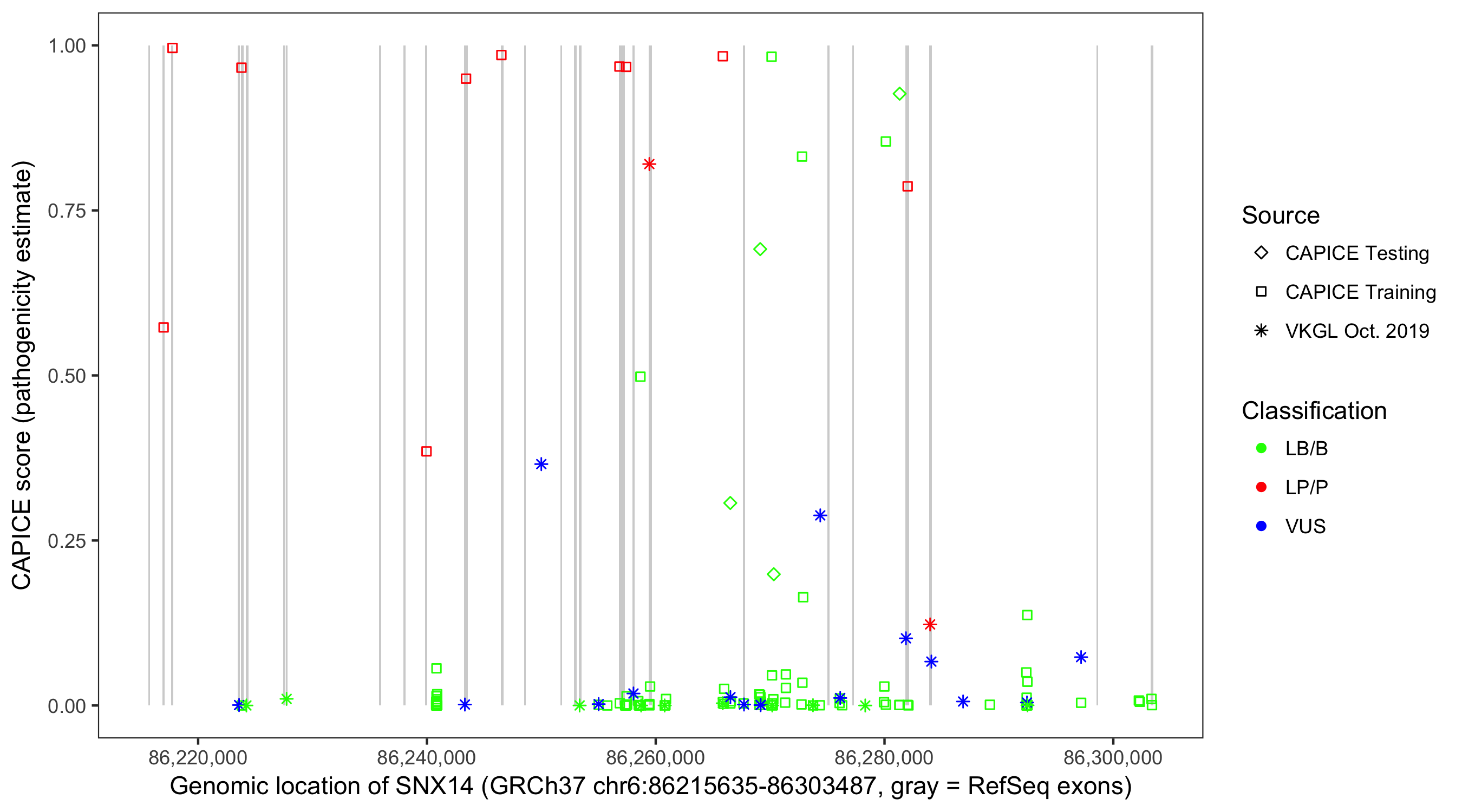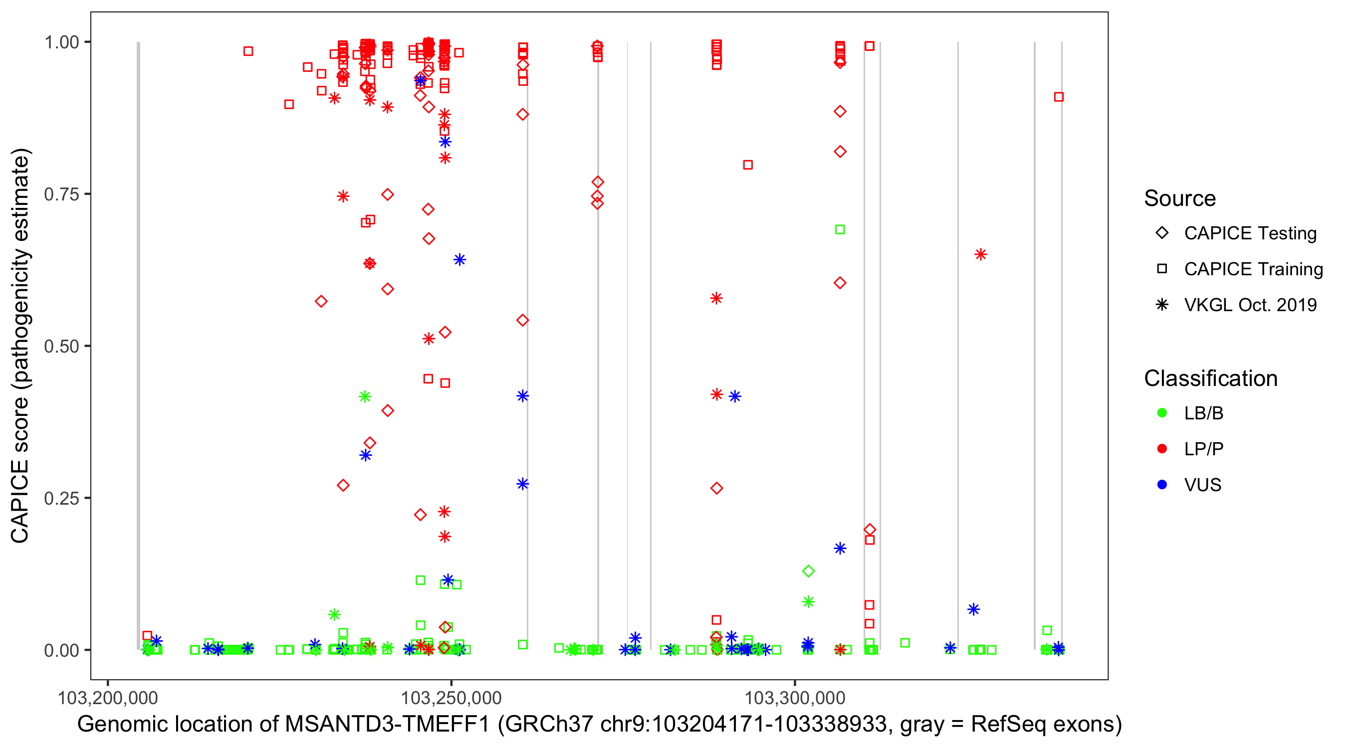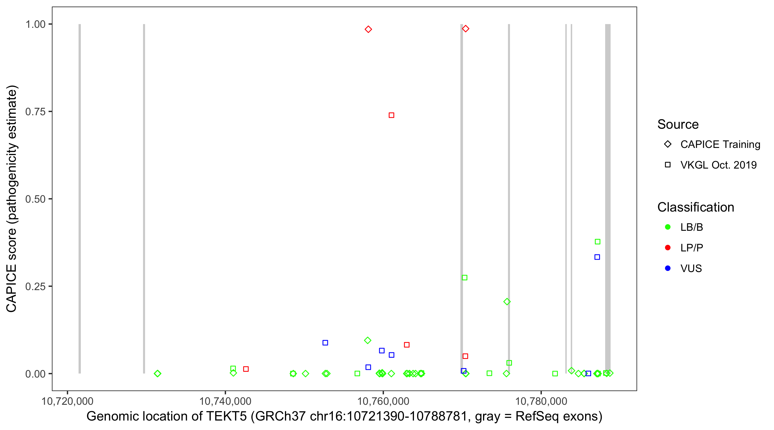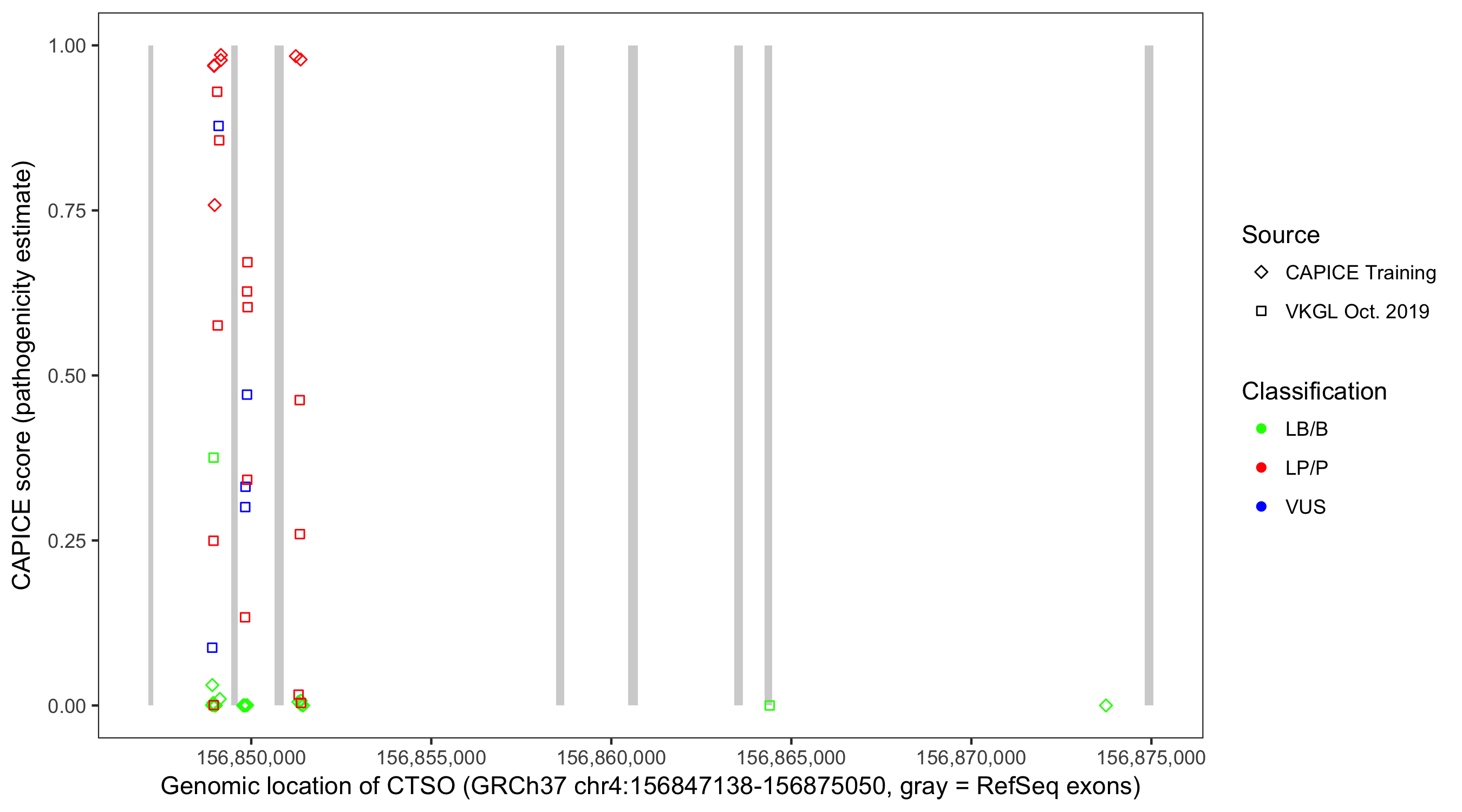 Shown are CAPICE train/test variants plus VKGL Oct 2019.