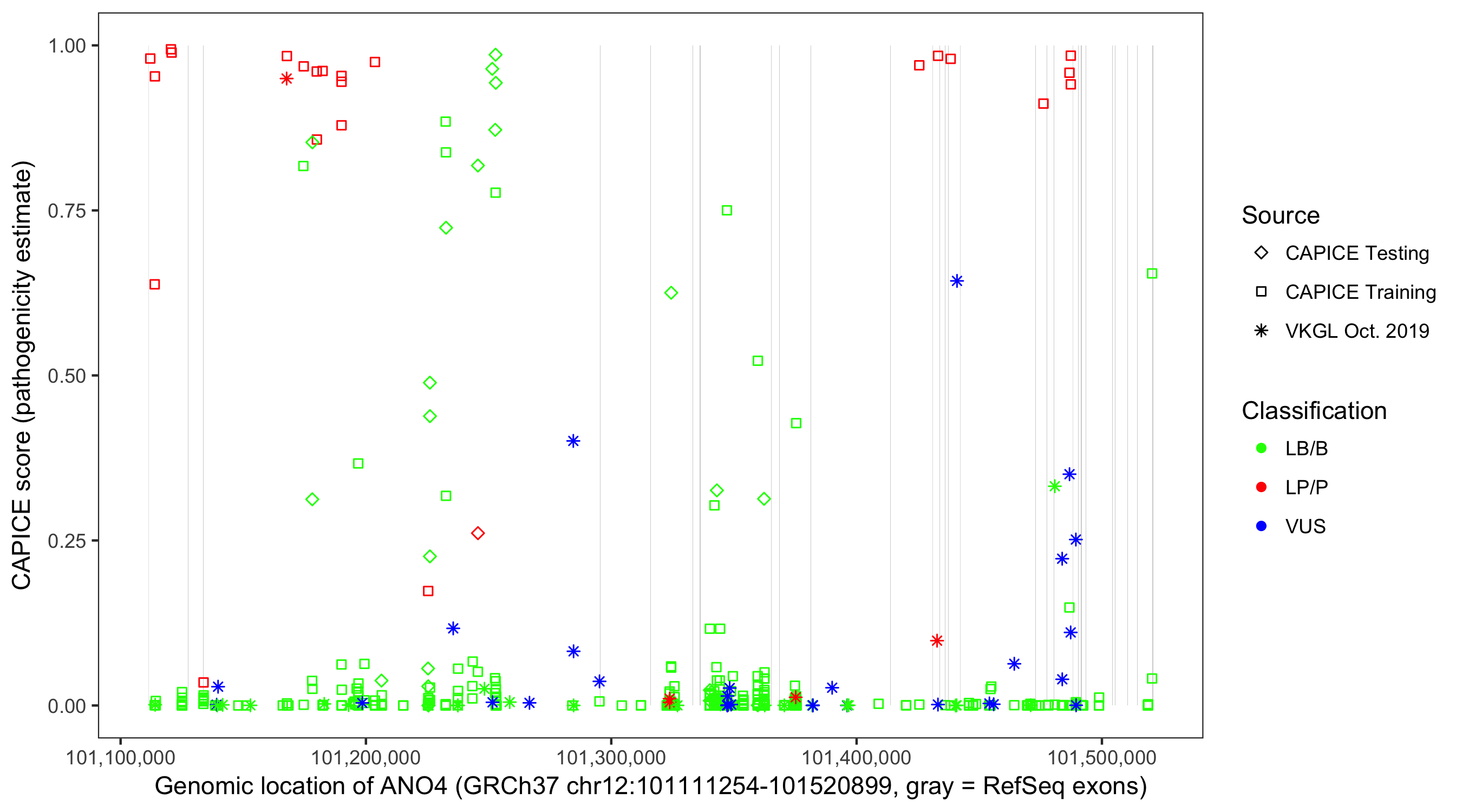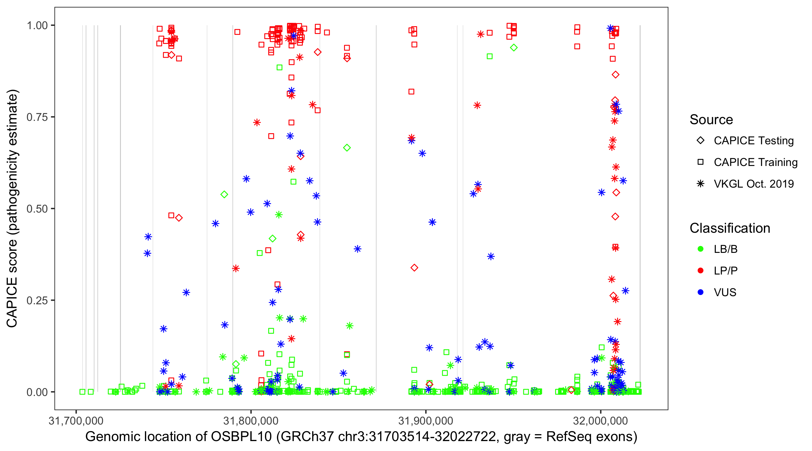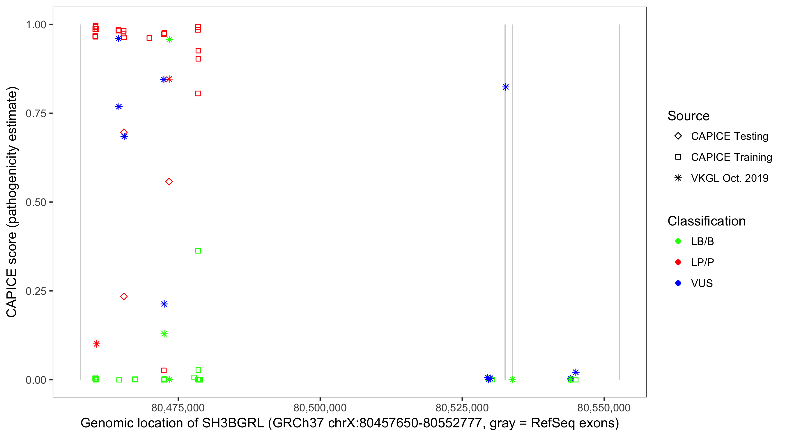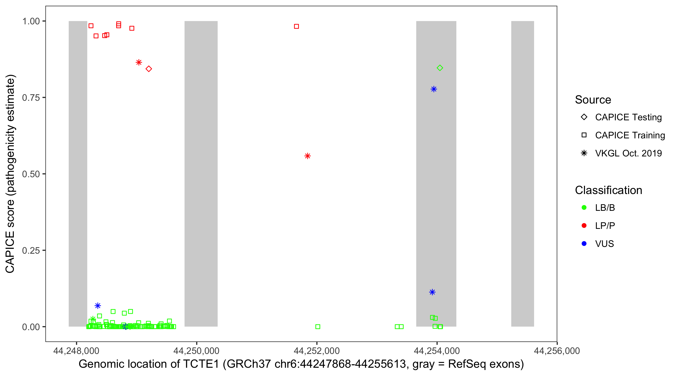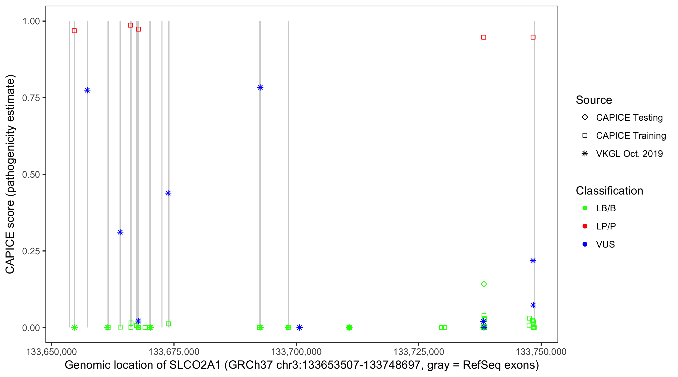 Shown are CAPICE train/test variants plus VKGL Oct 2019.