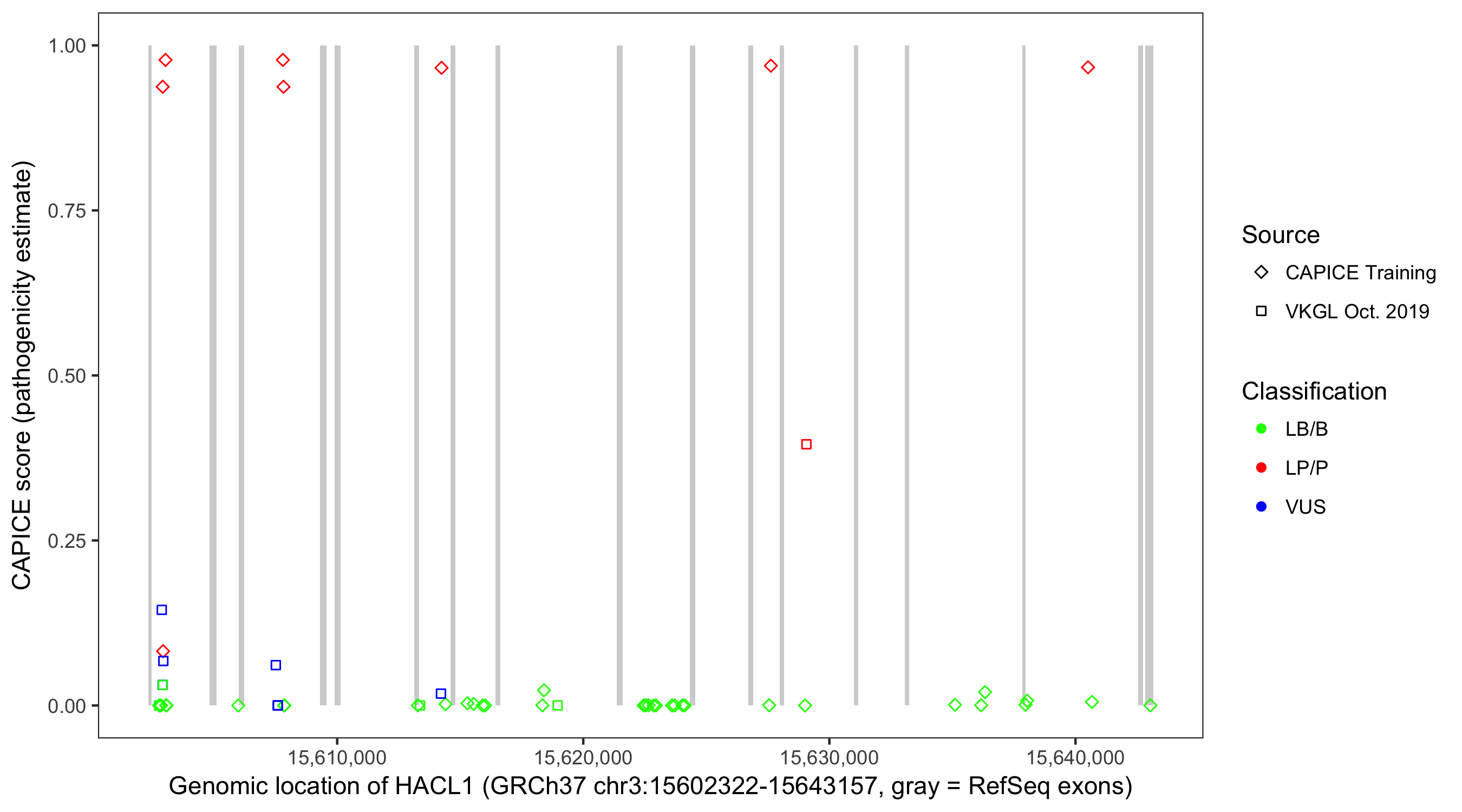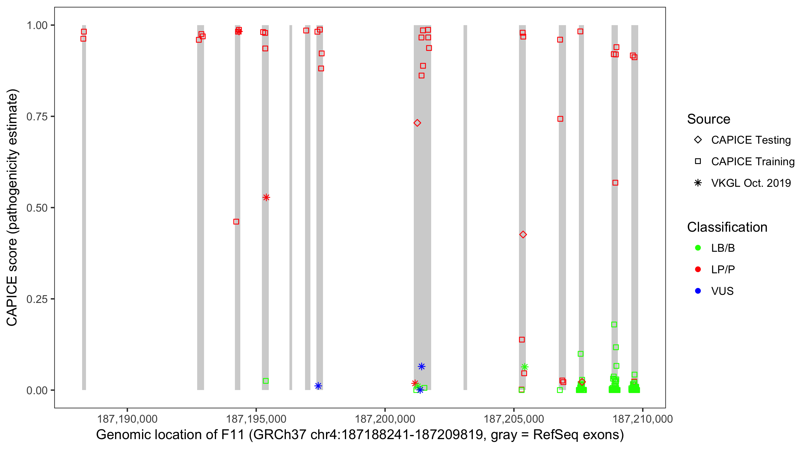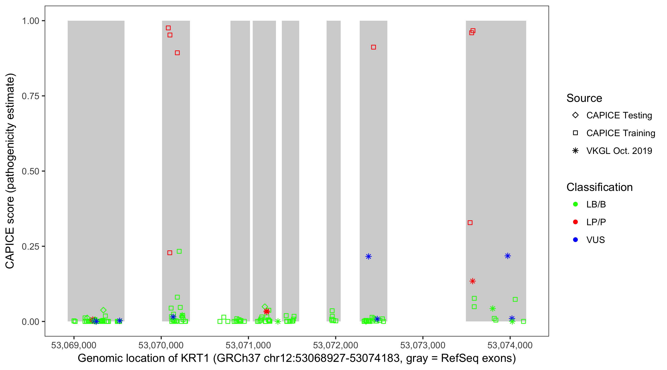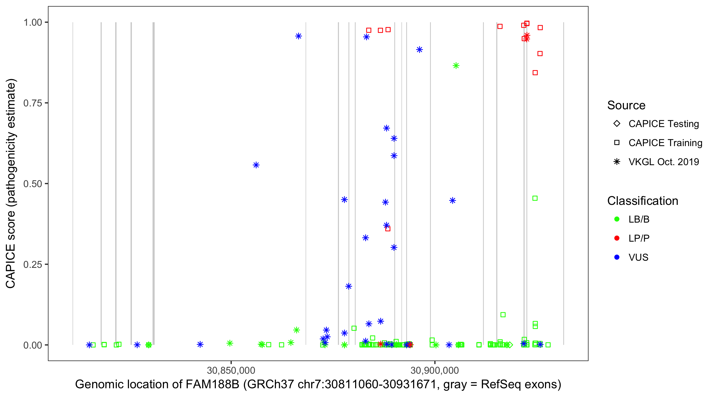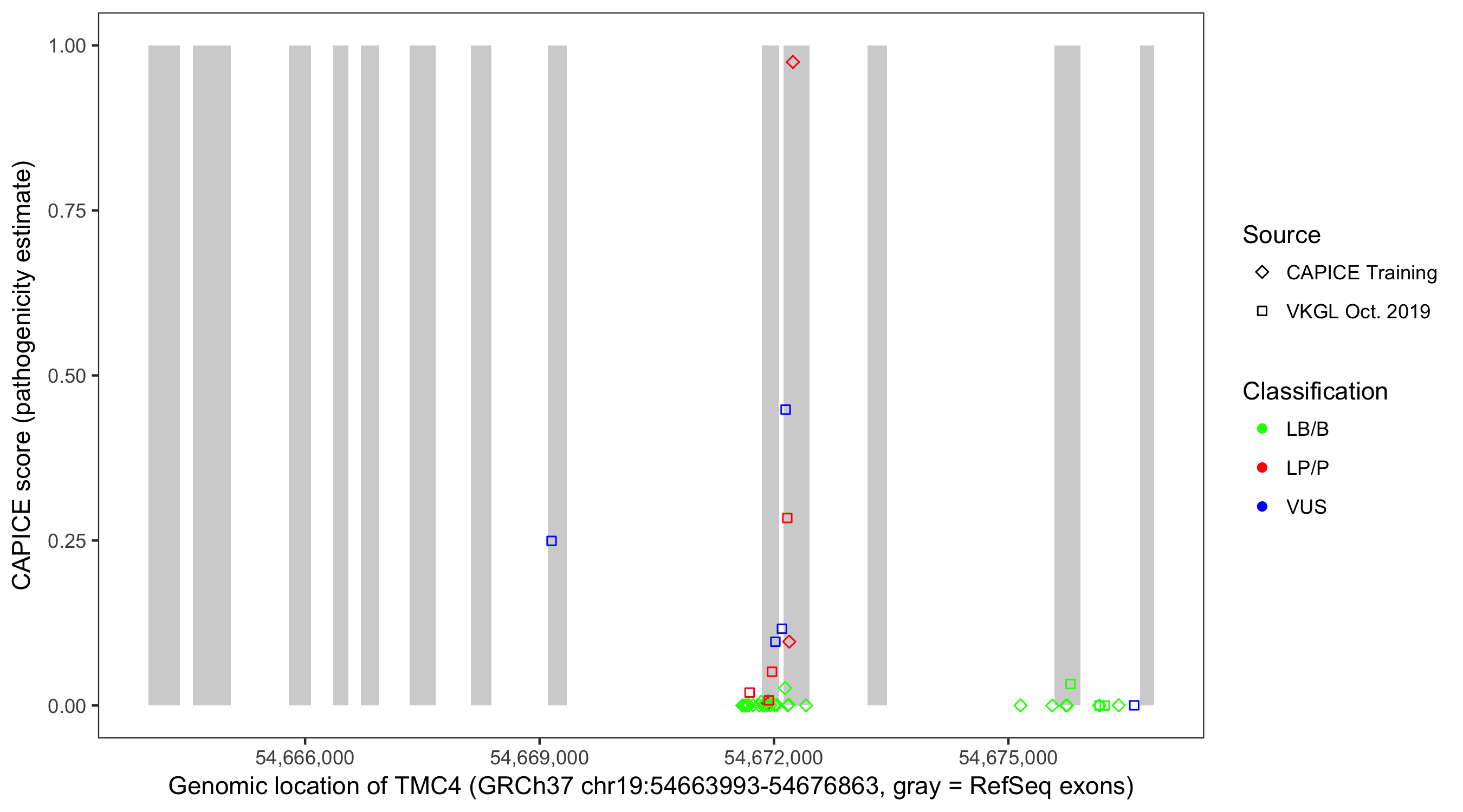 Shown are CAPICE train/test variants plus VKGL Oct 2019.
