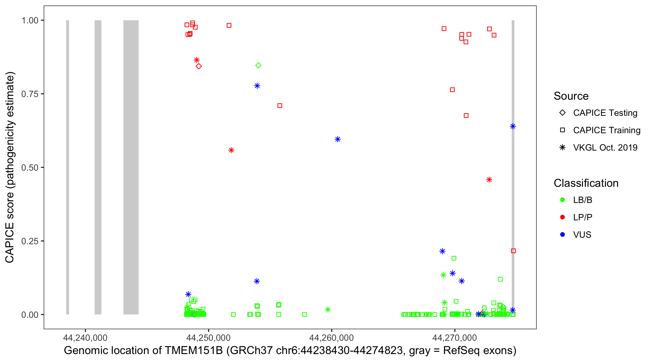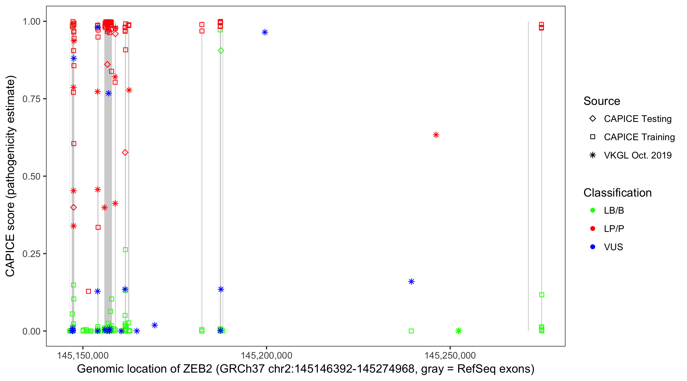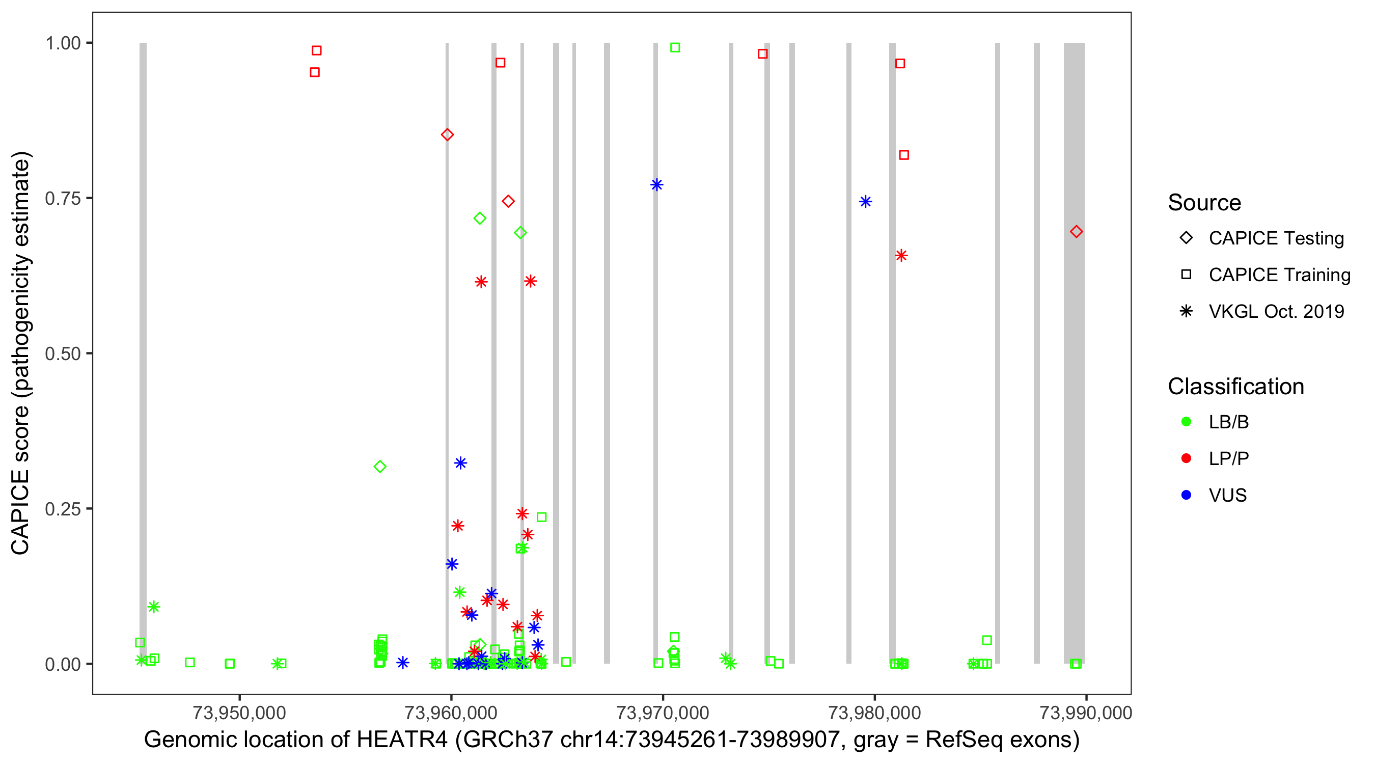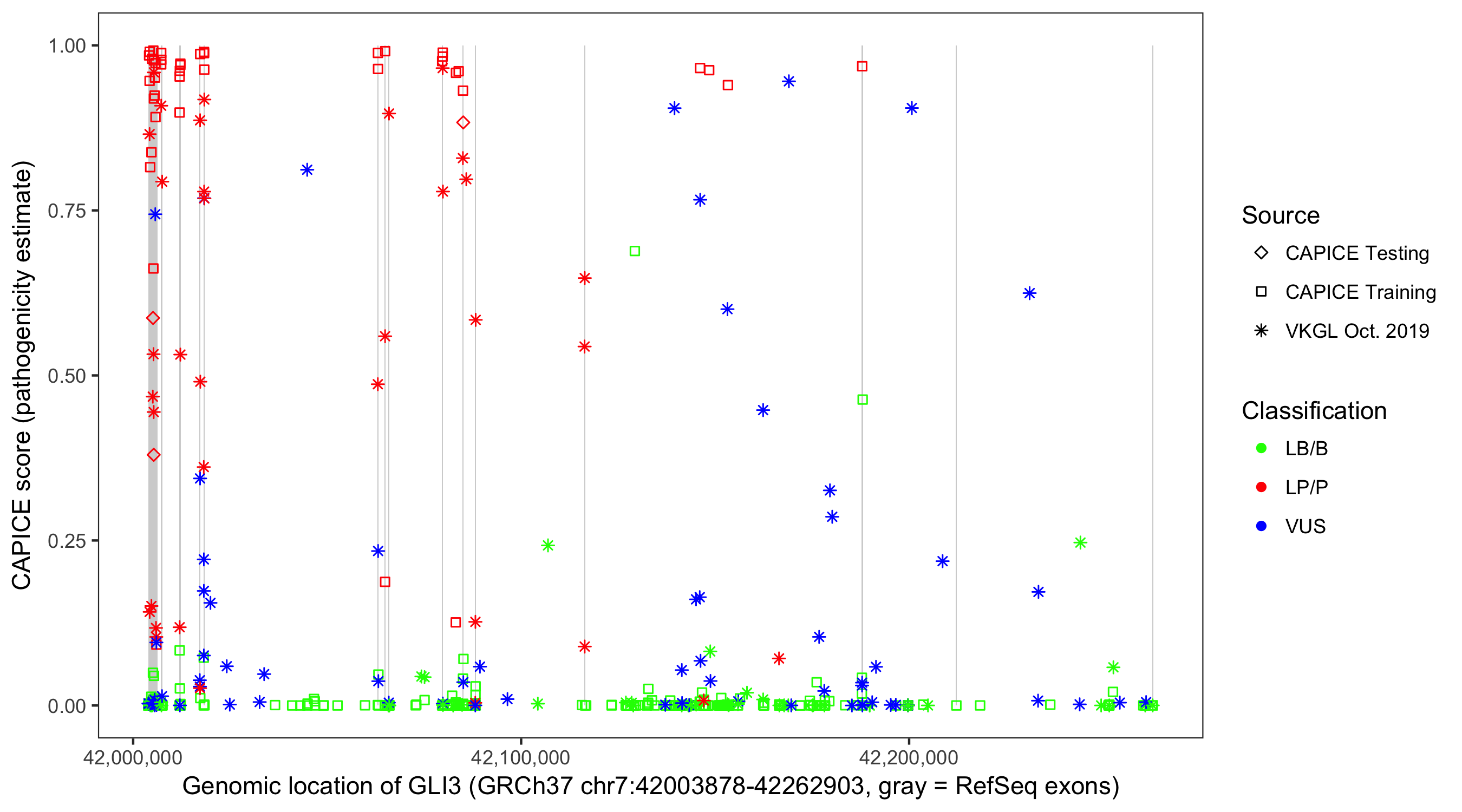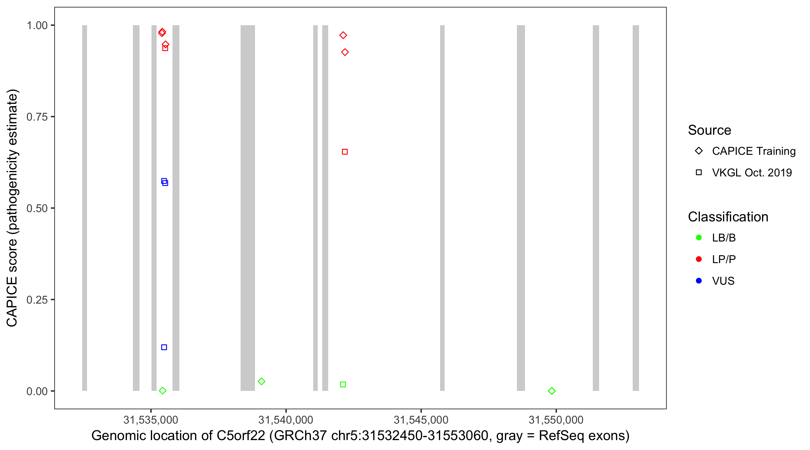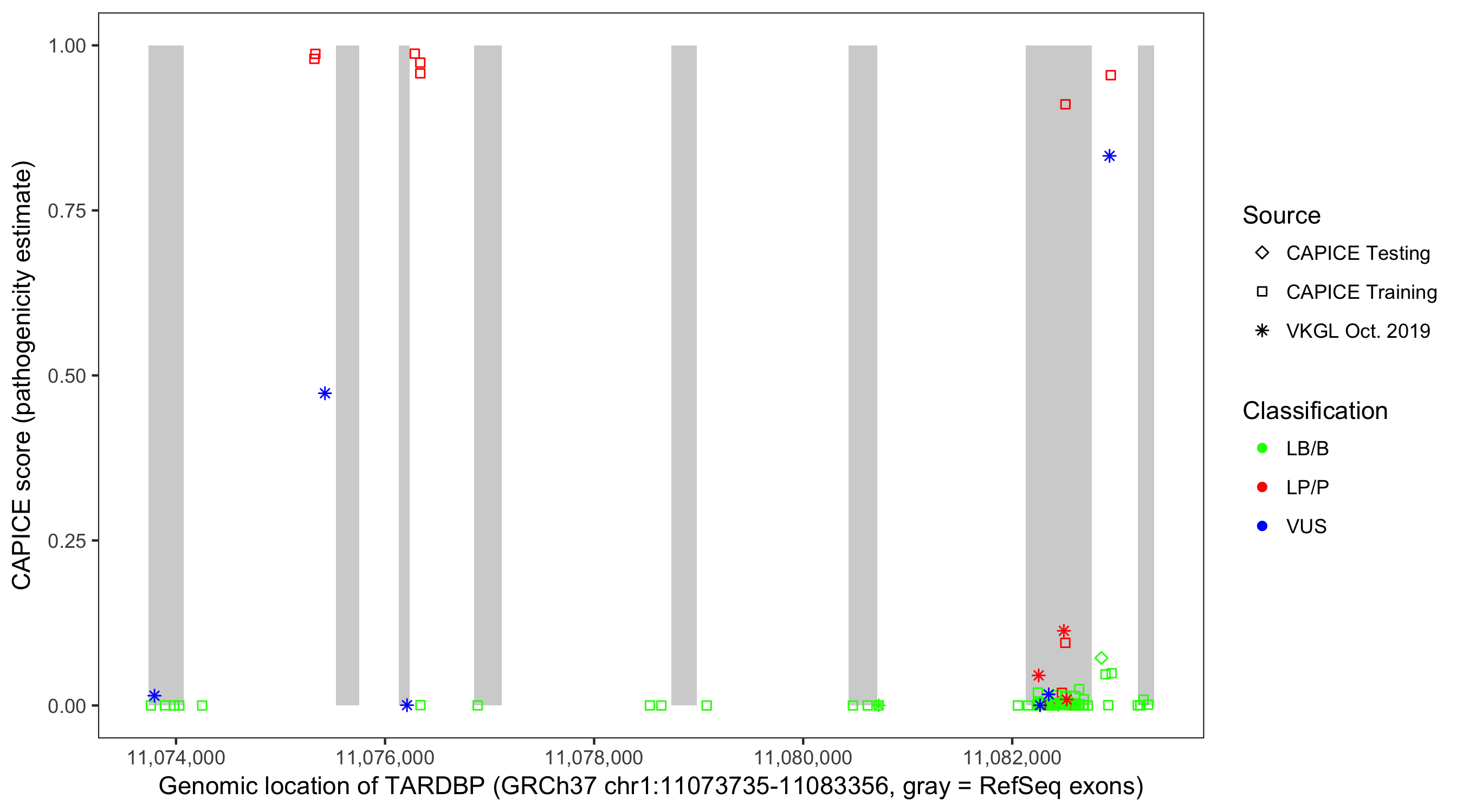 Shown are CAPICE train/test variants plus VKGL Oct 2019.
