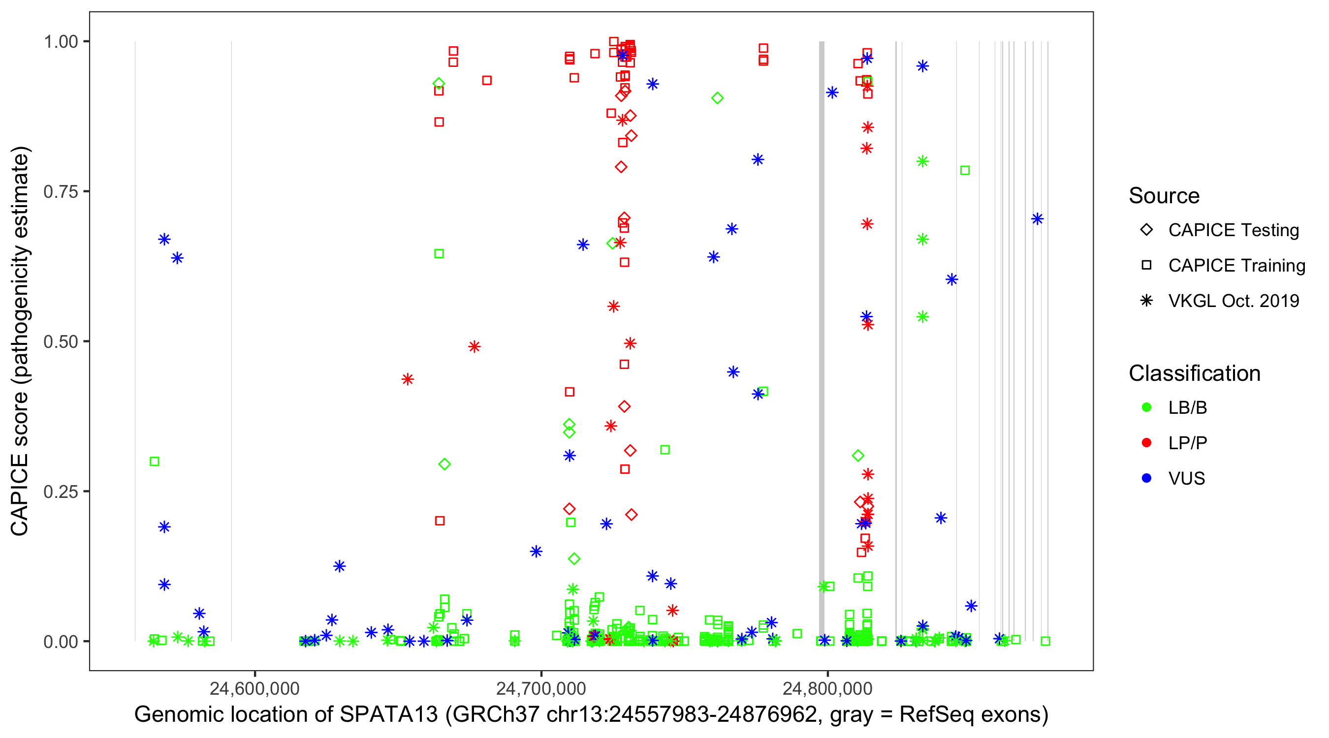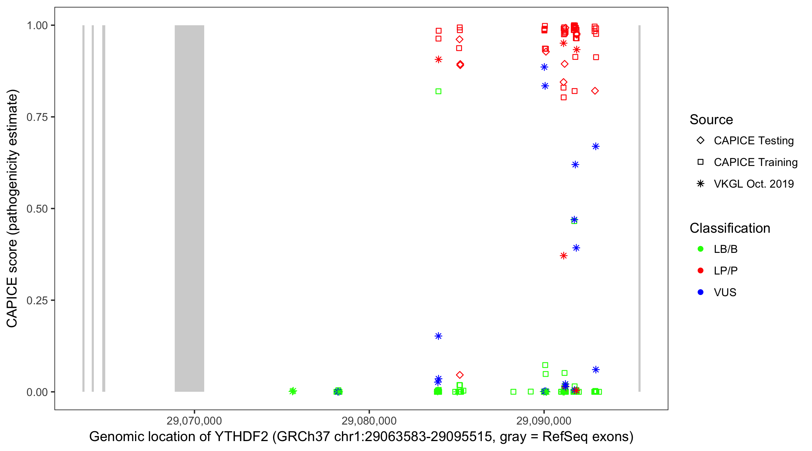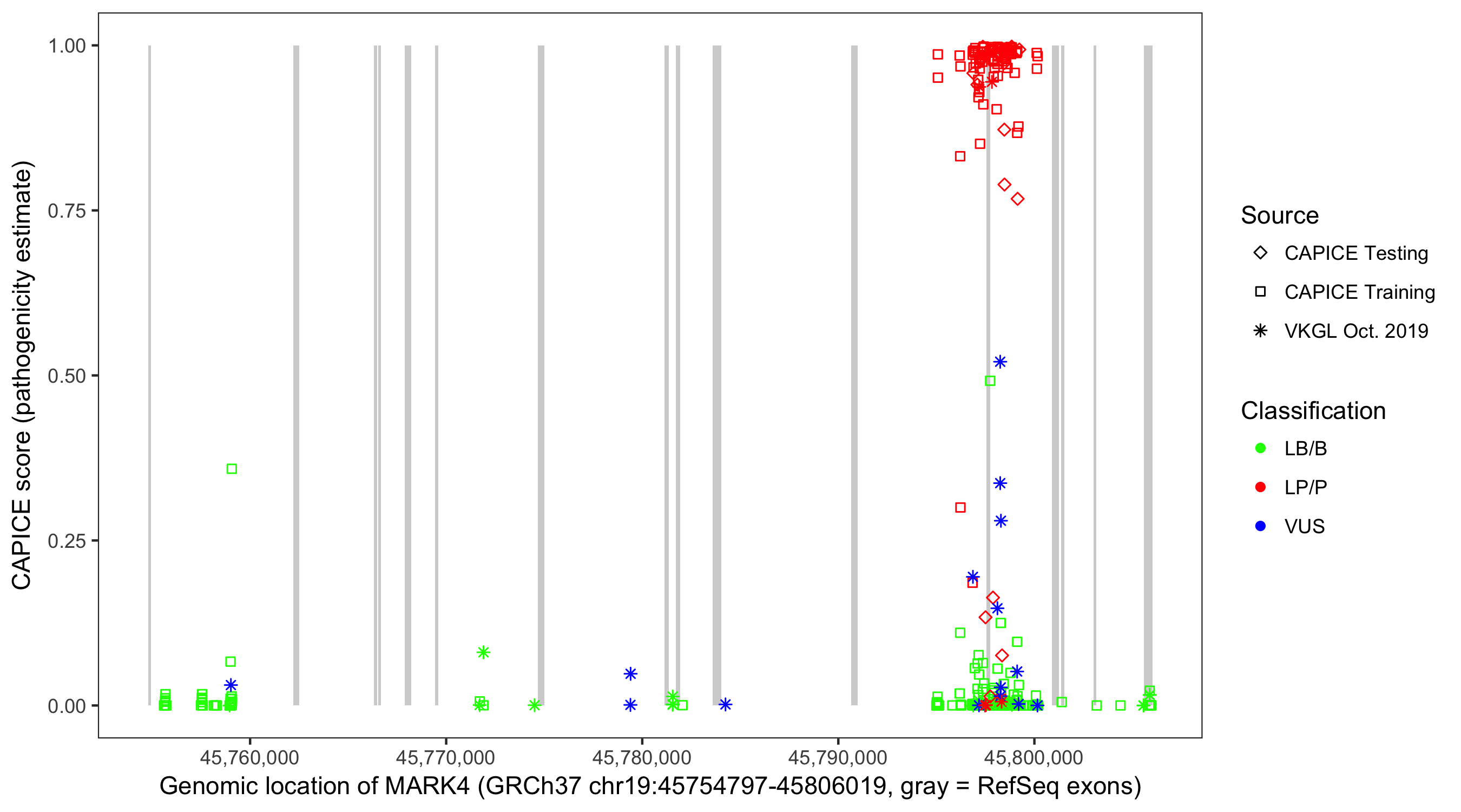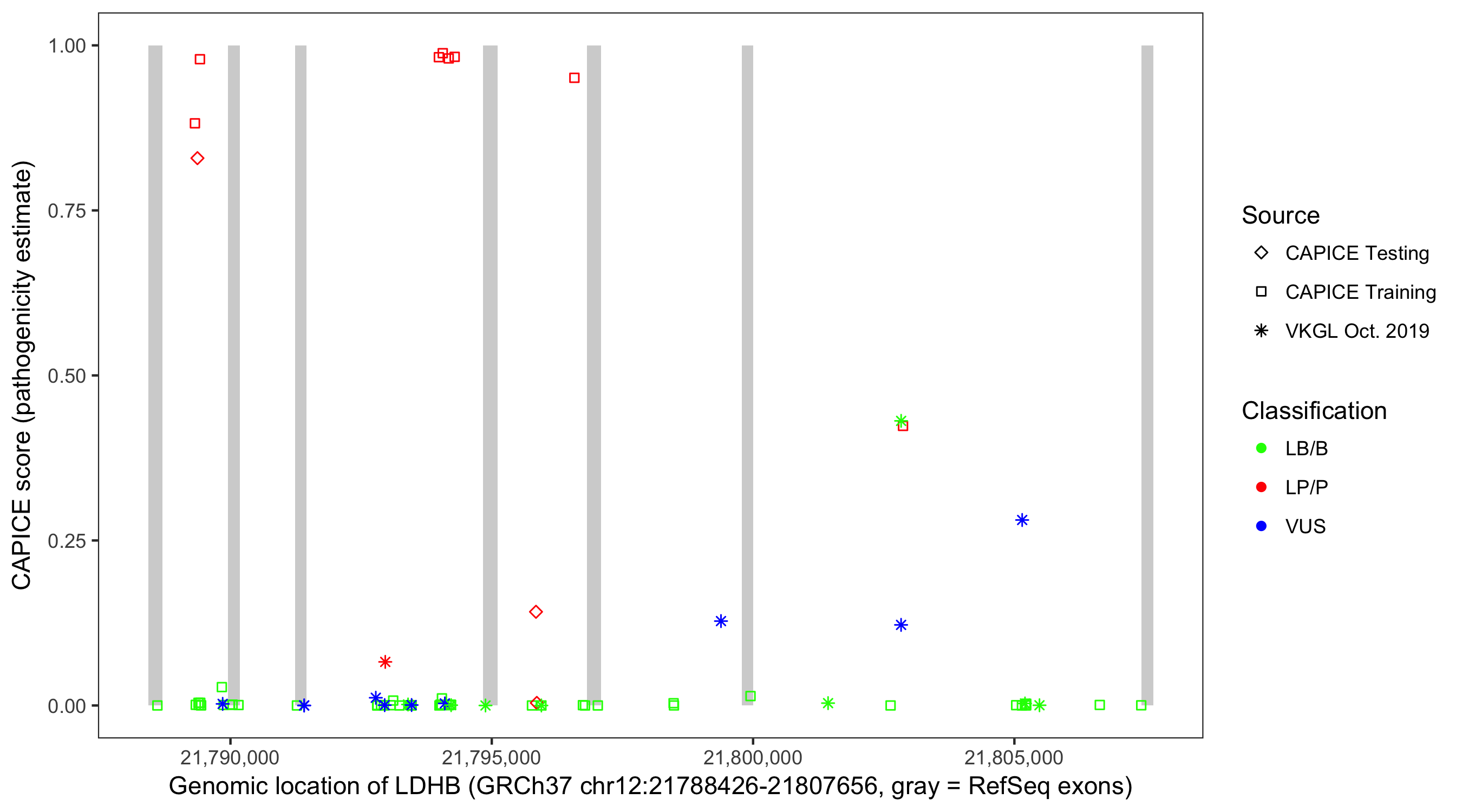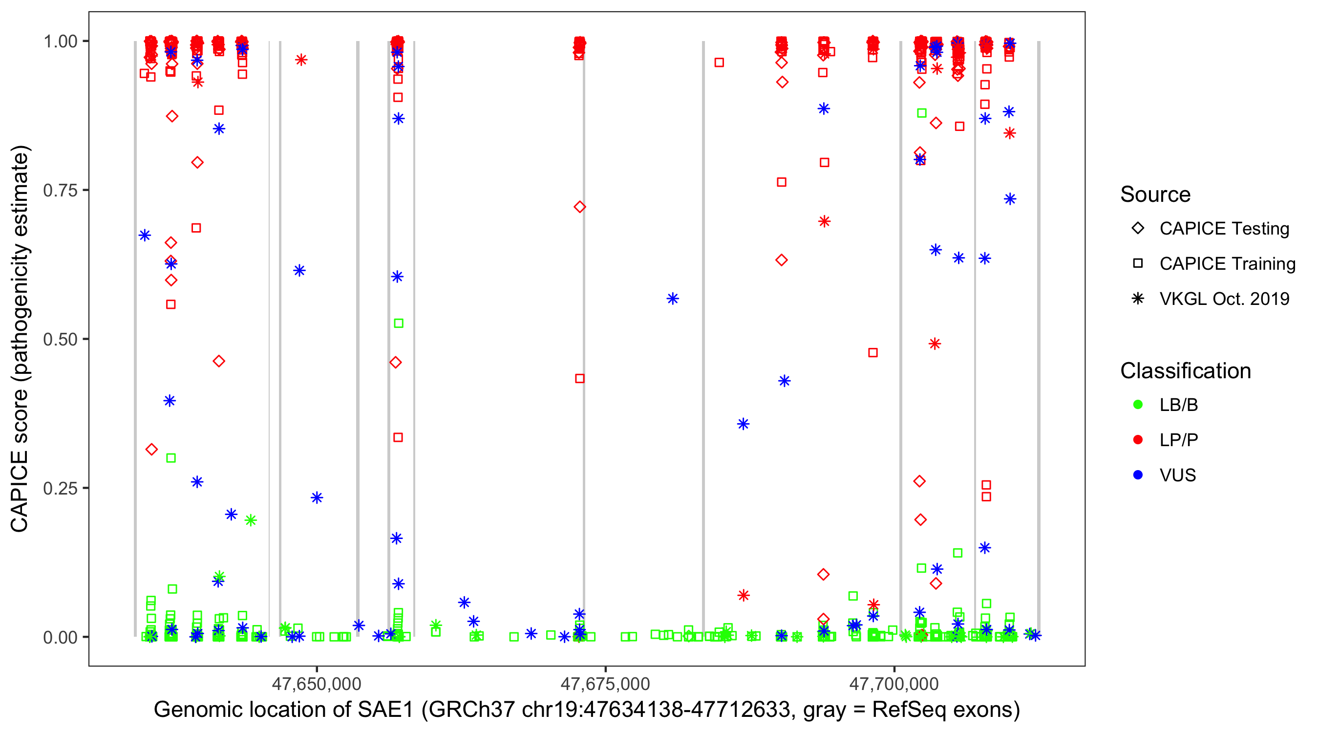 Shown are CAPICE train/test variants plus VKGL Oct 2019.