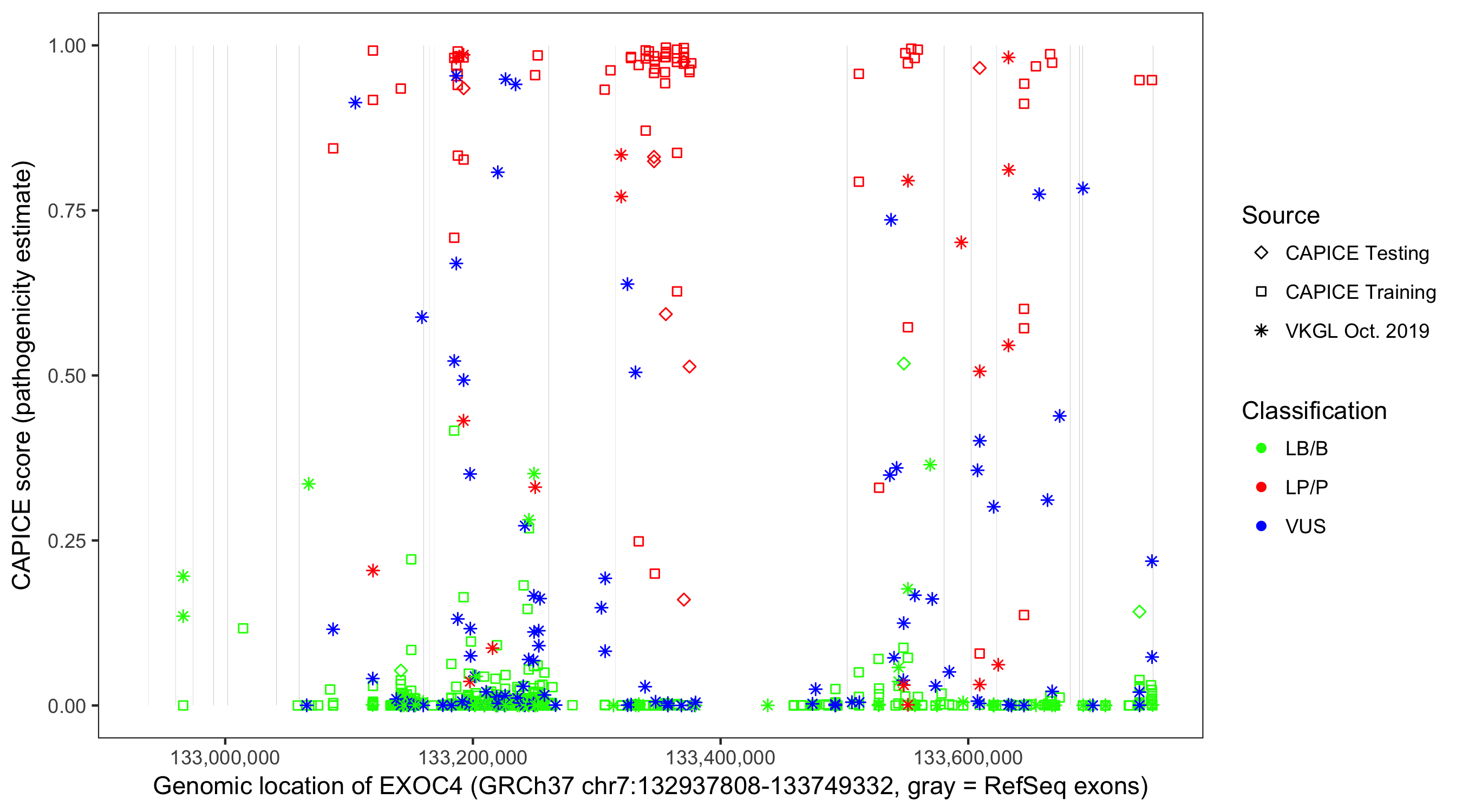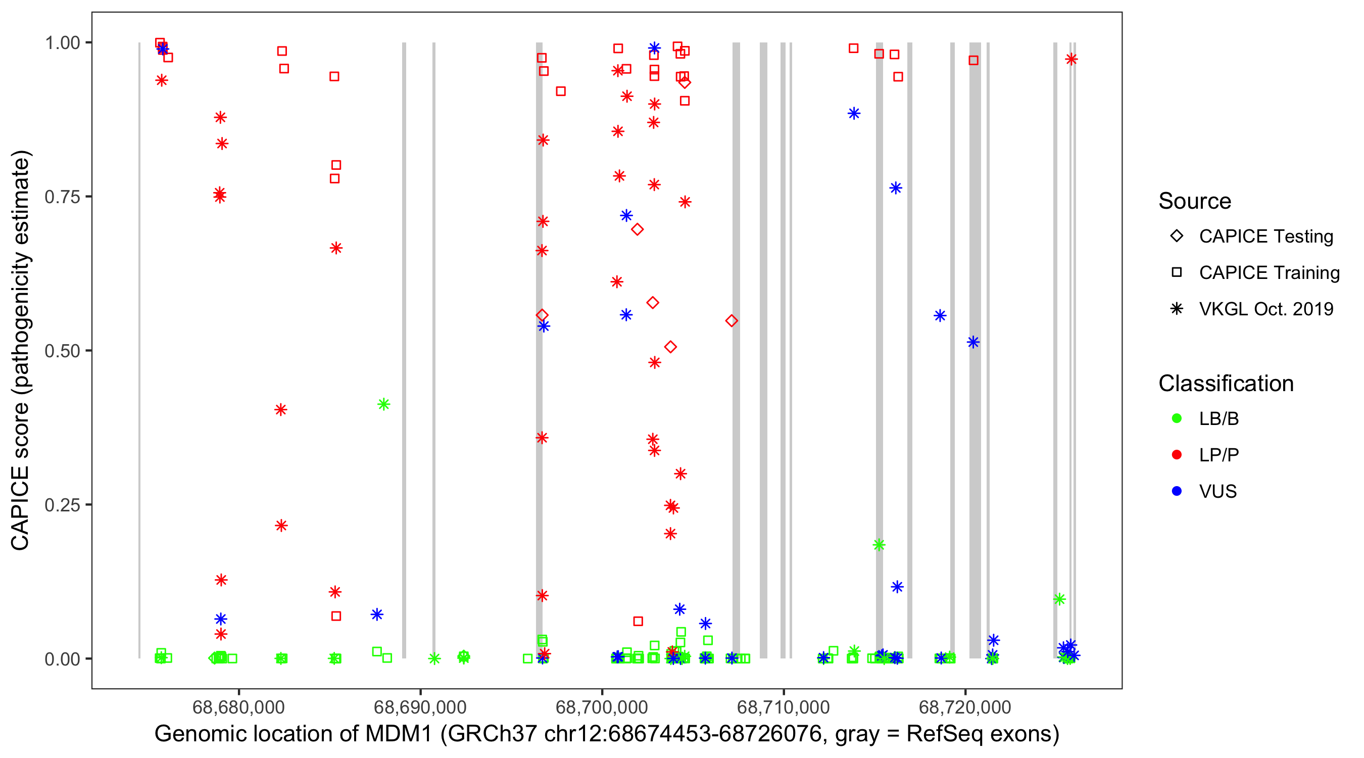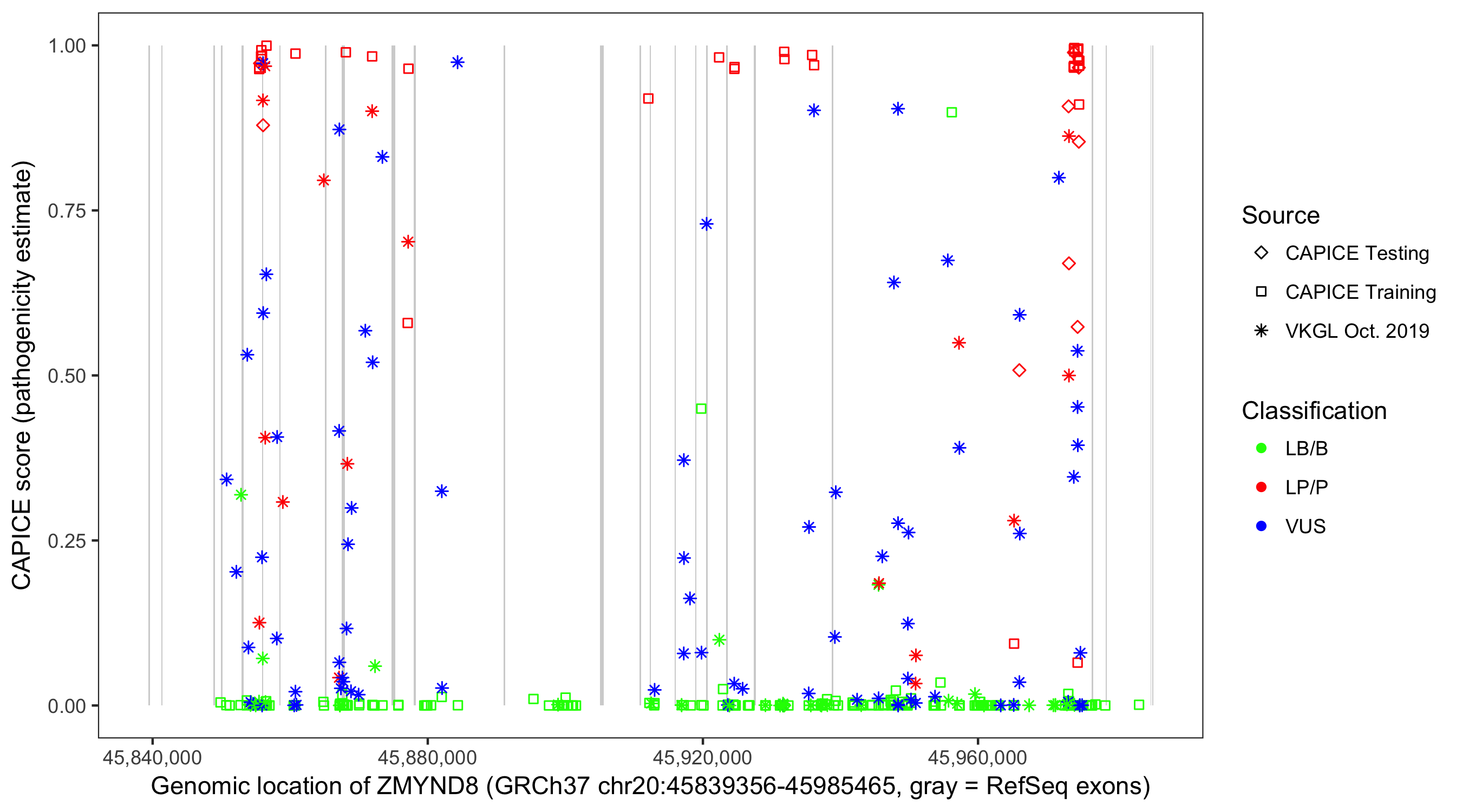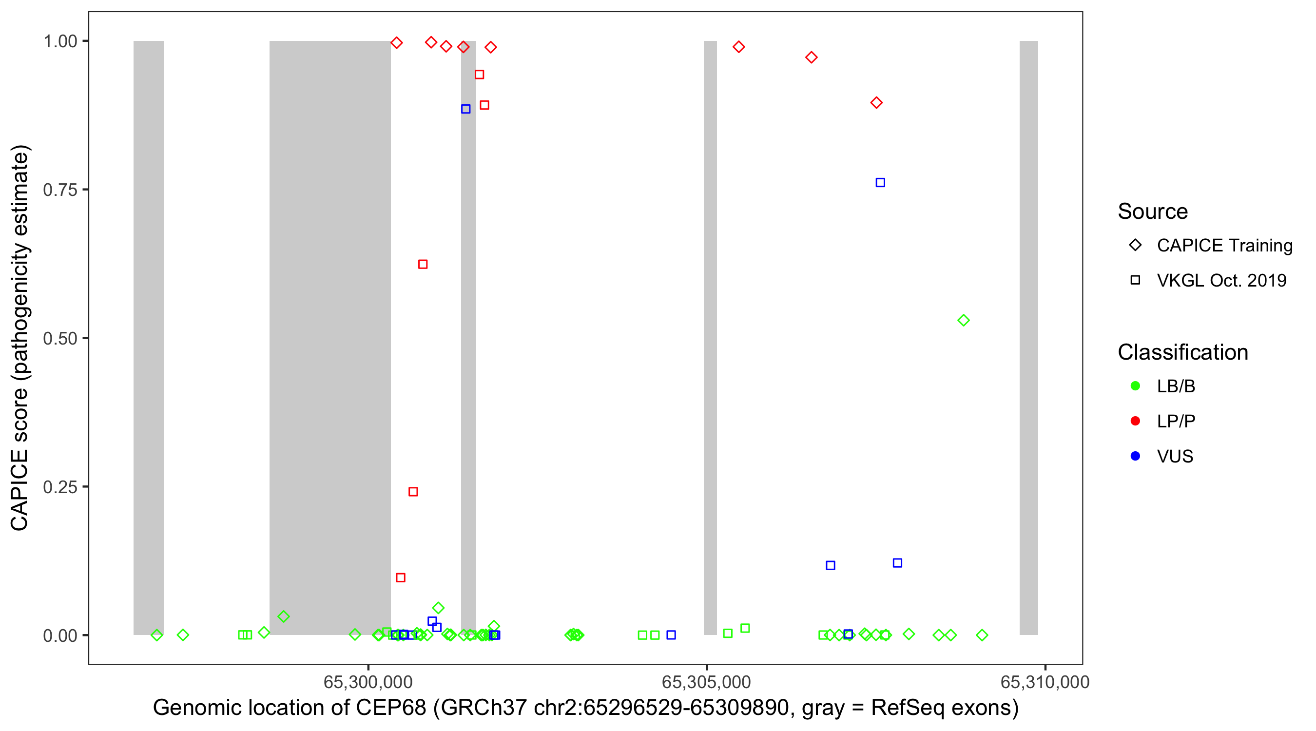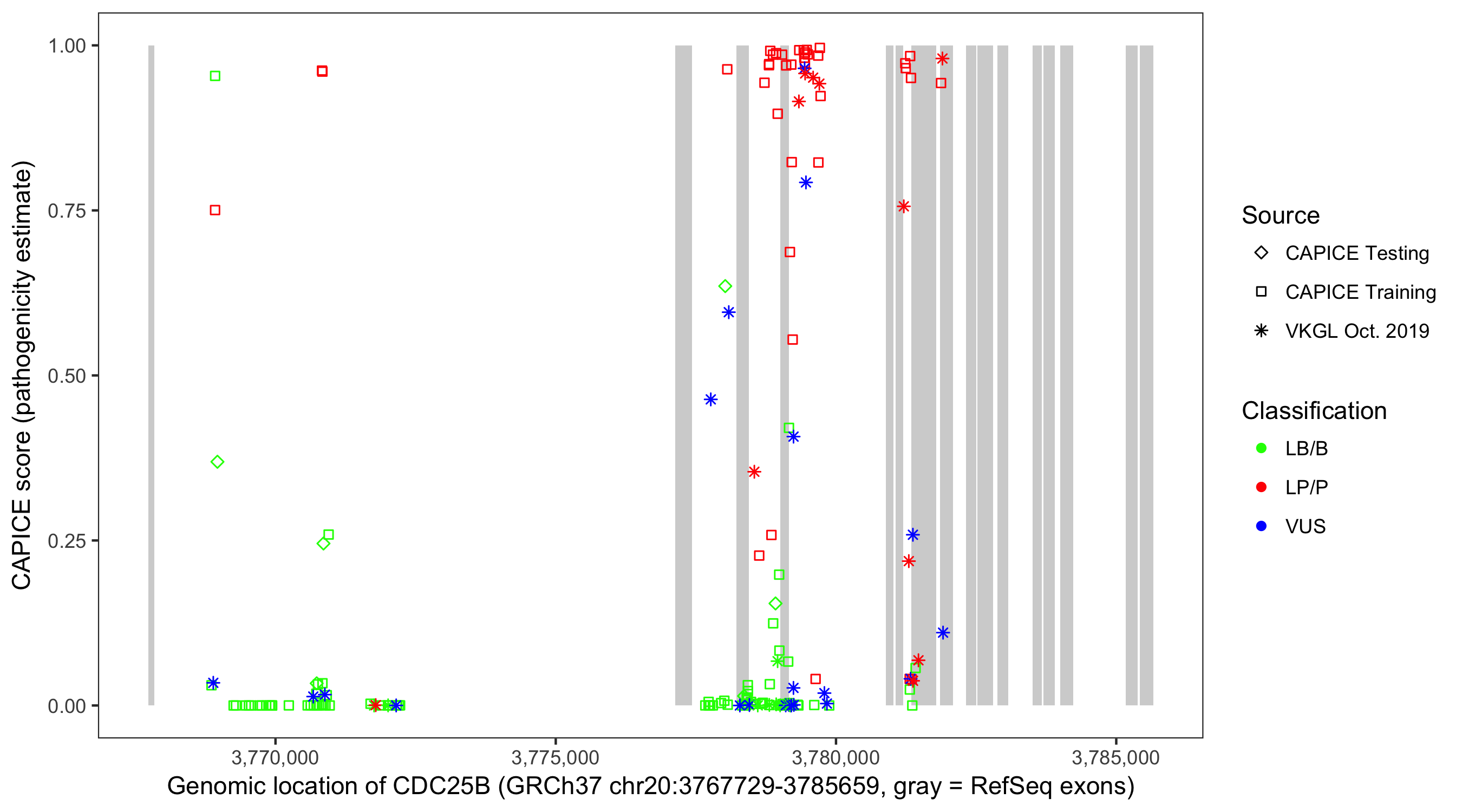Shown are CAPICE train/test variants plus VKGL Oct 2019.