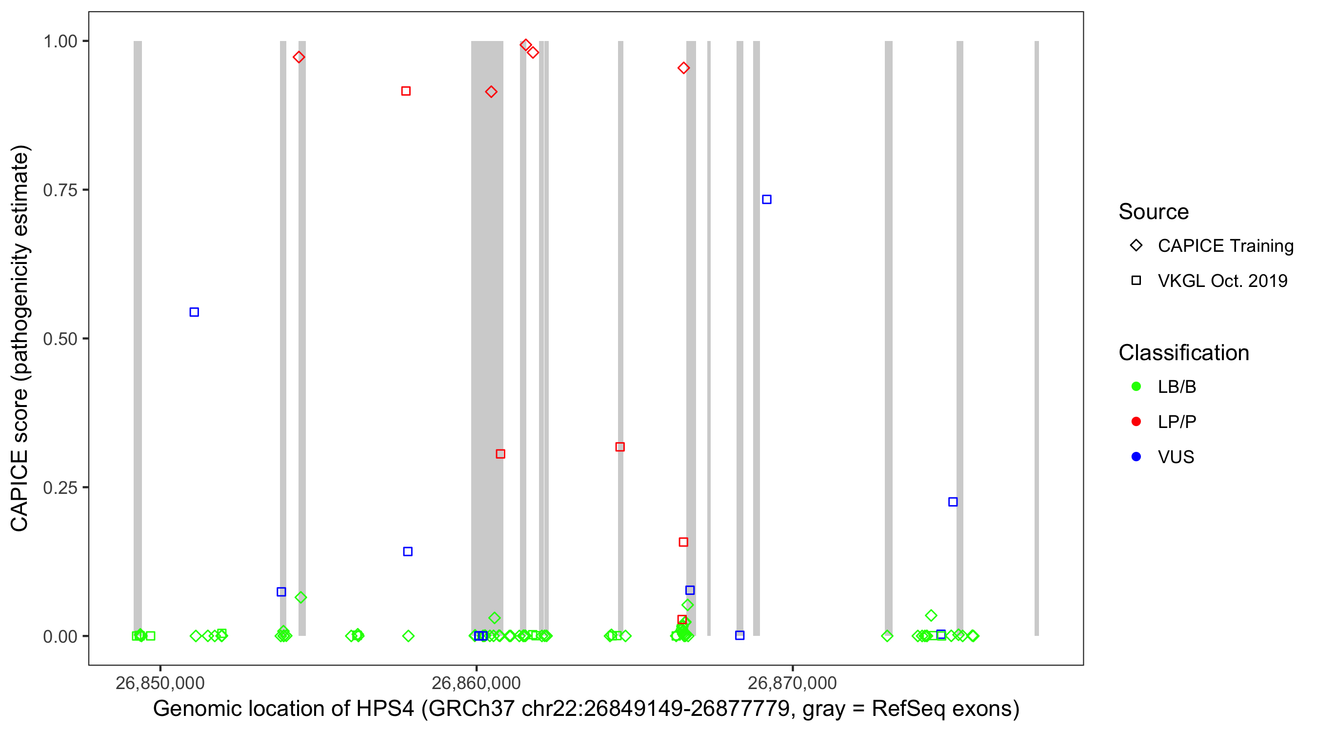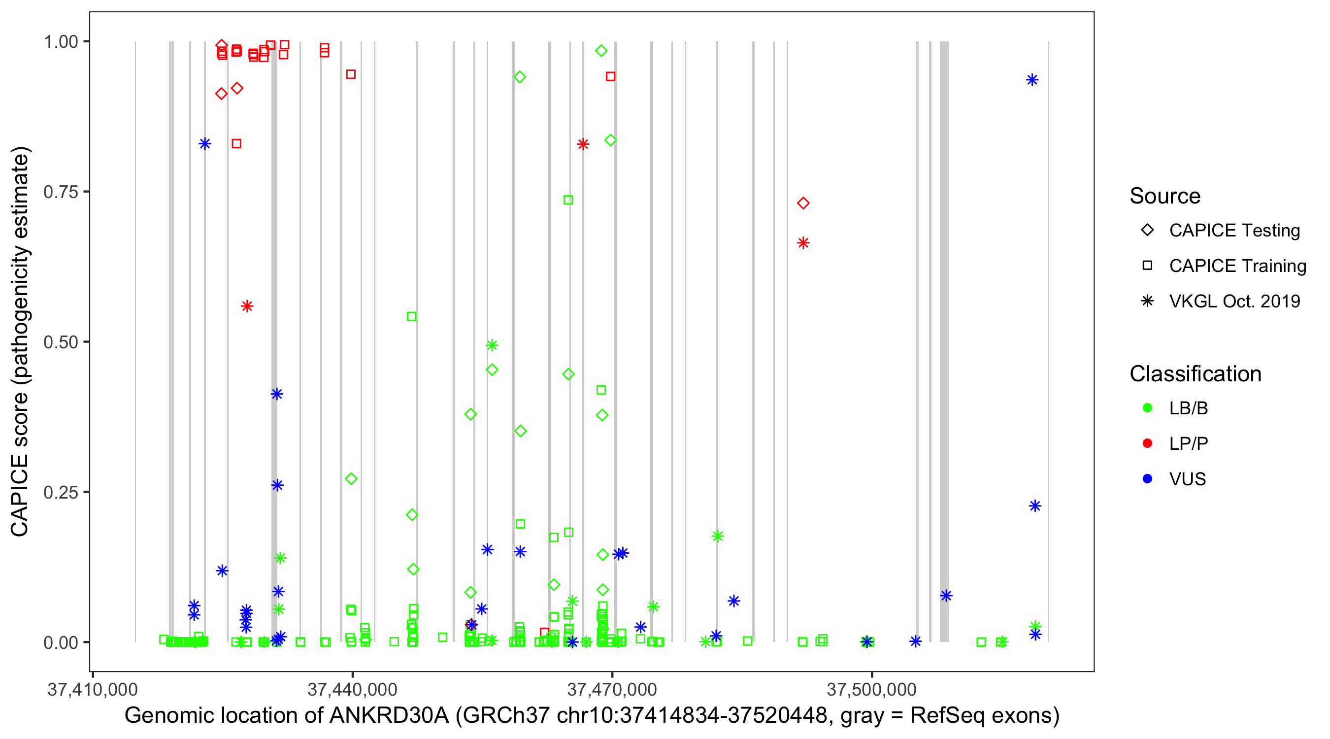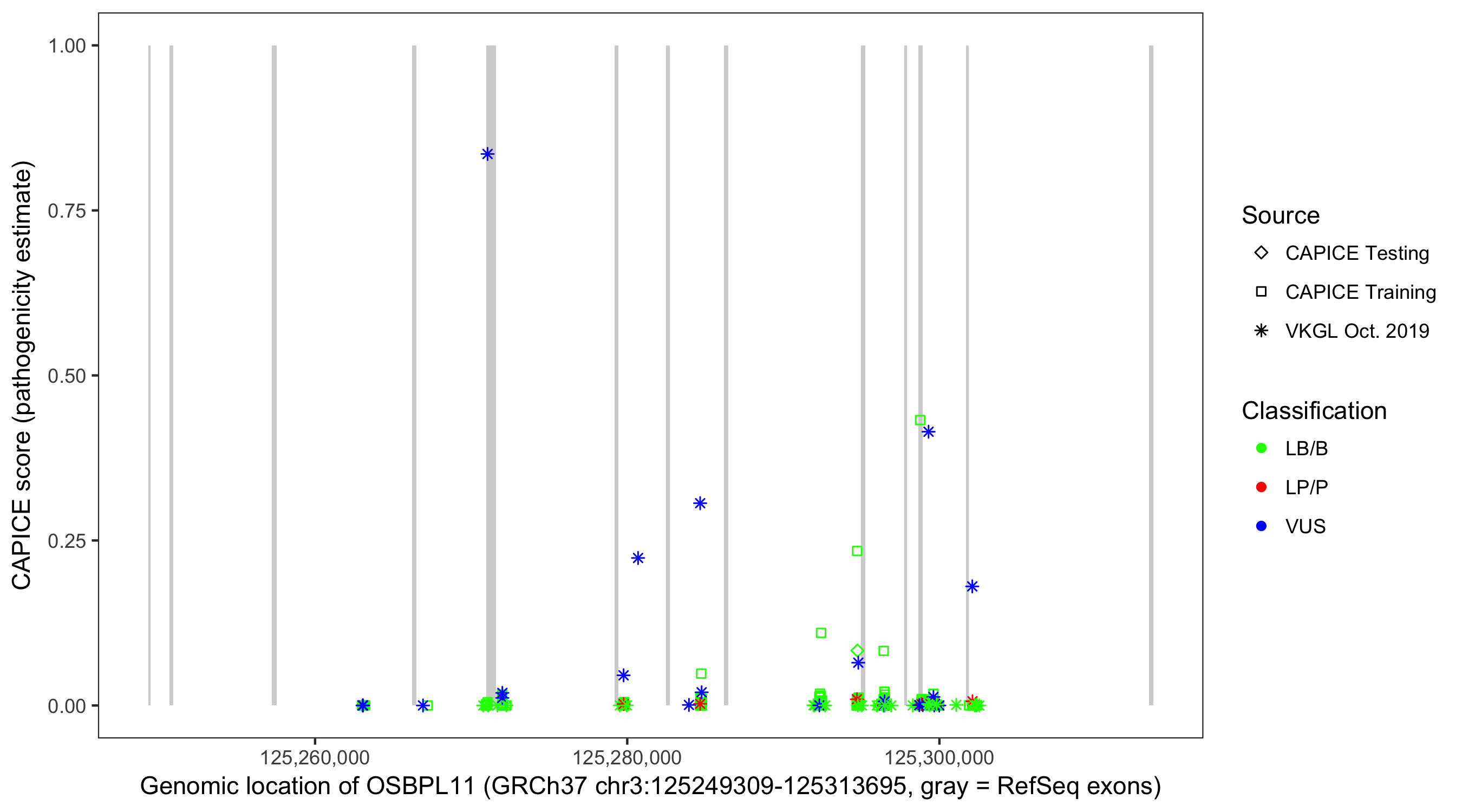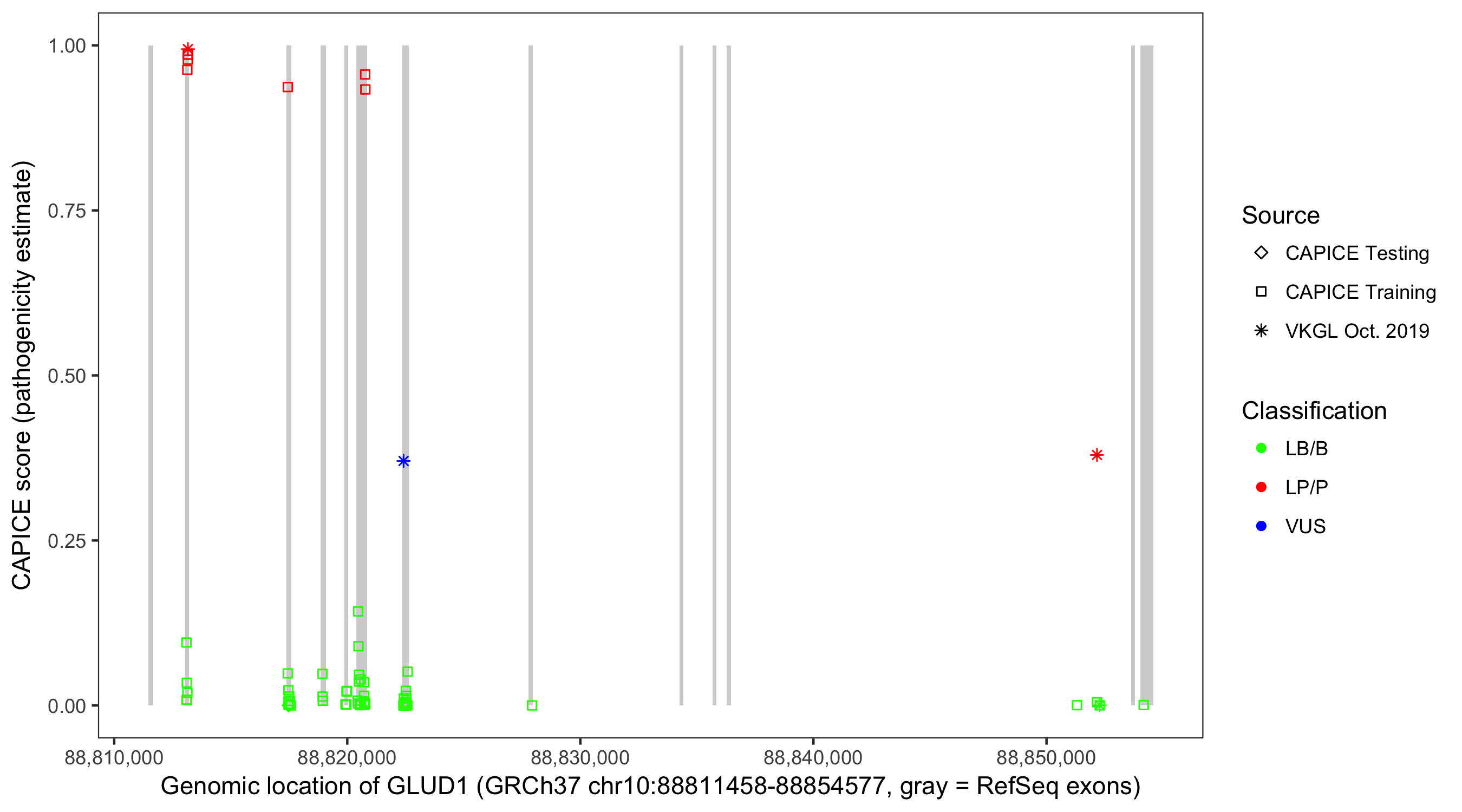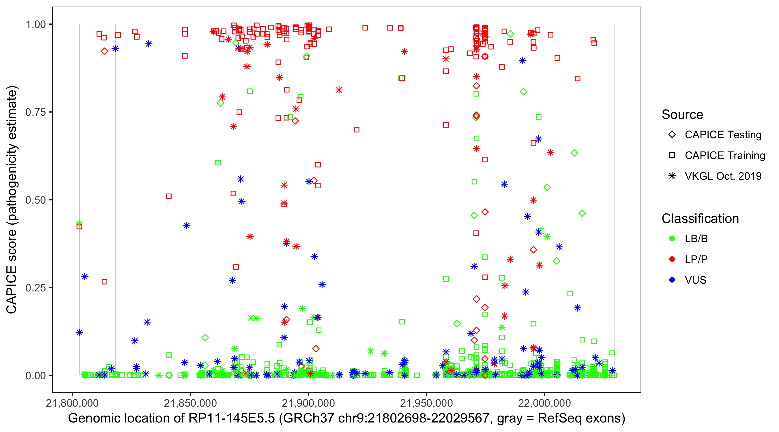 Shown are CAPICE train/test variants plus VKGL Oct 2019.