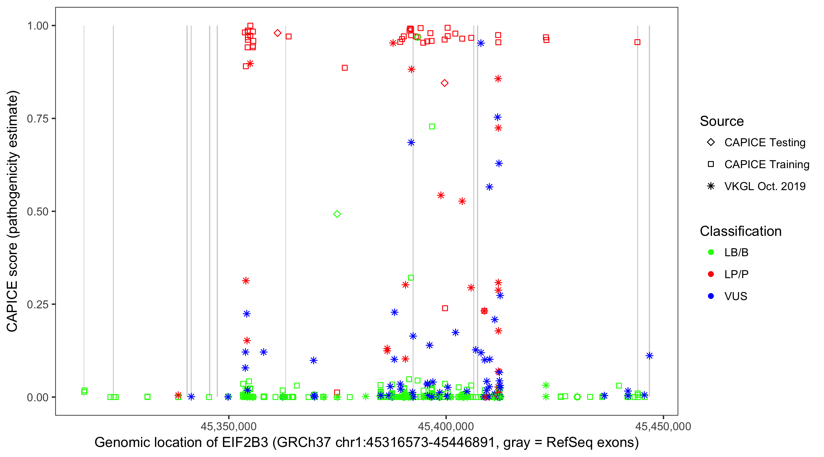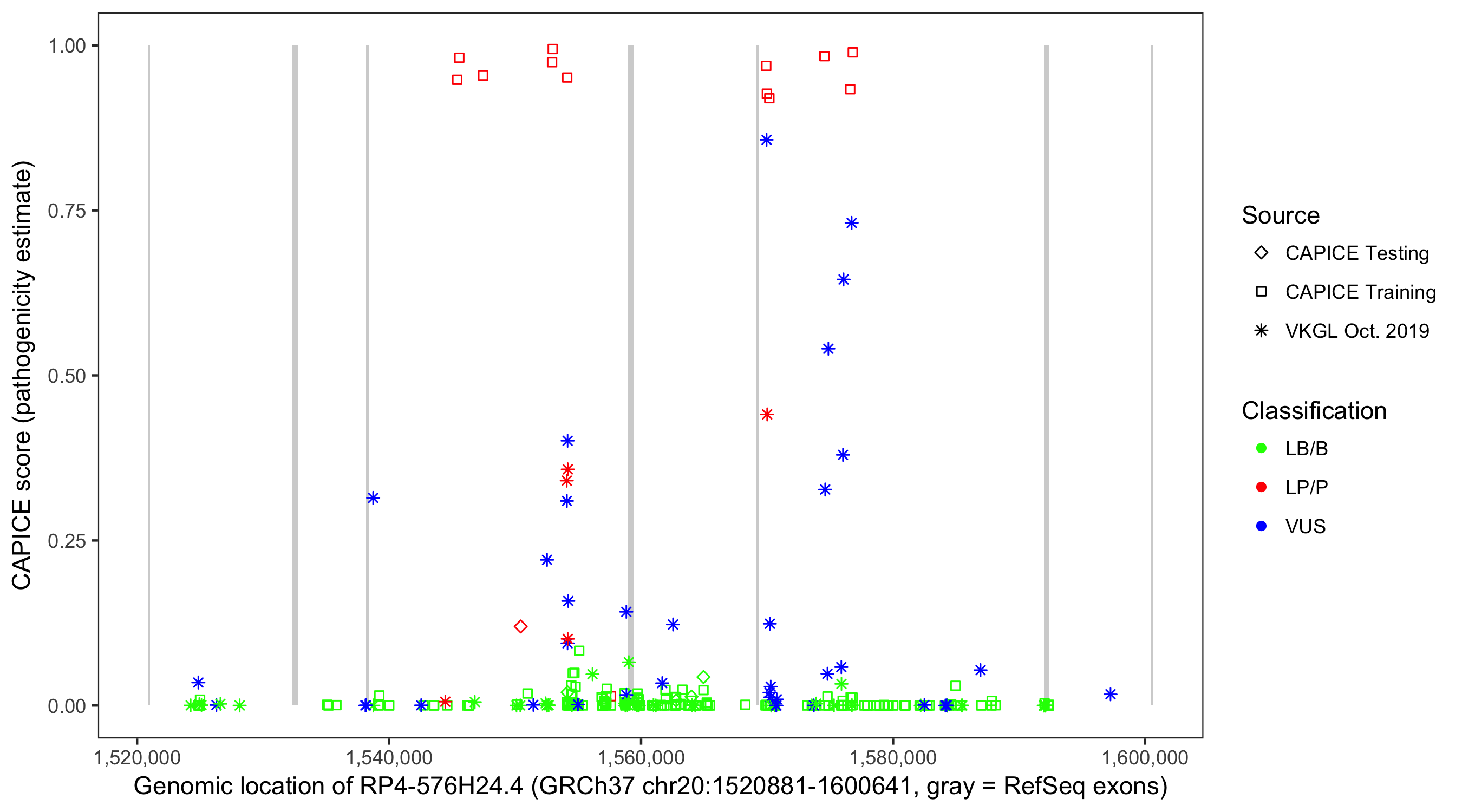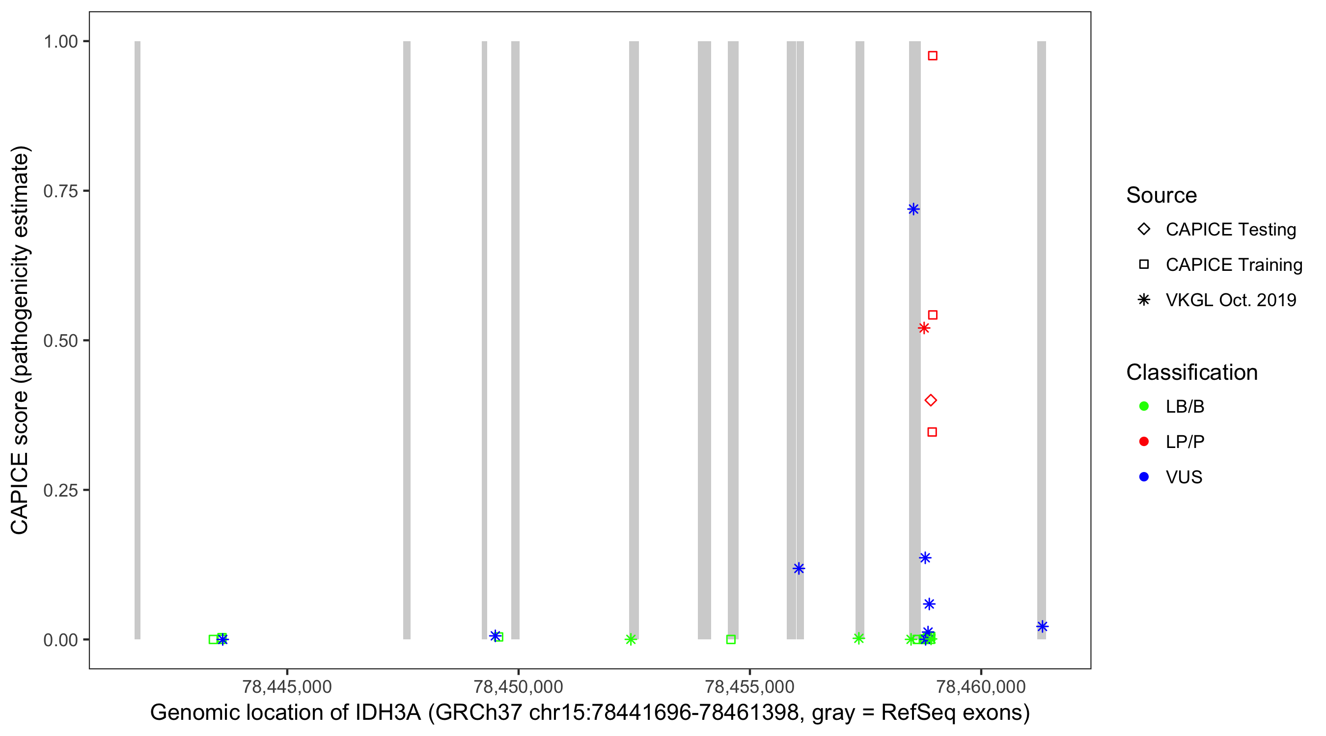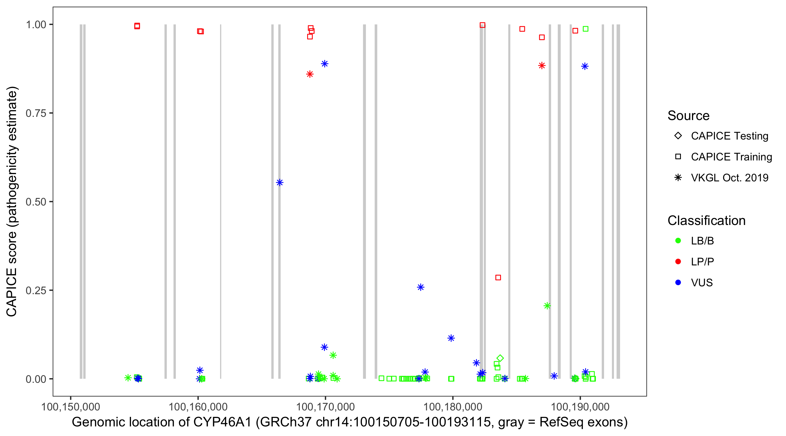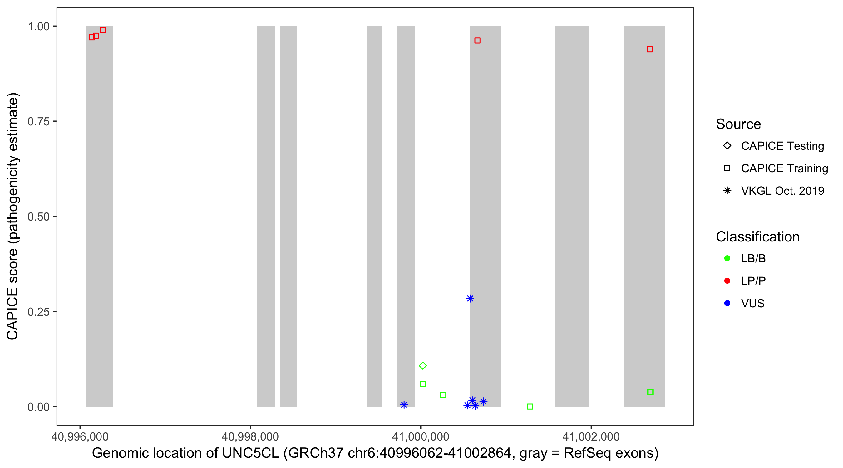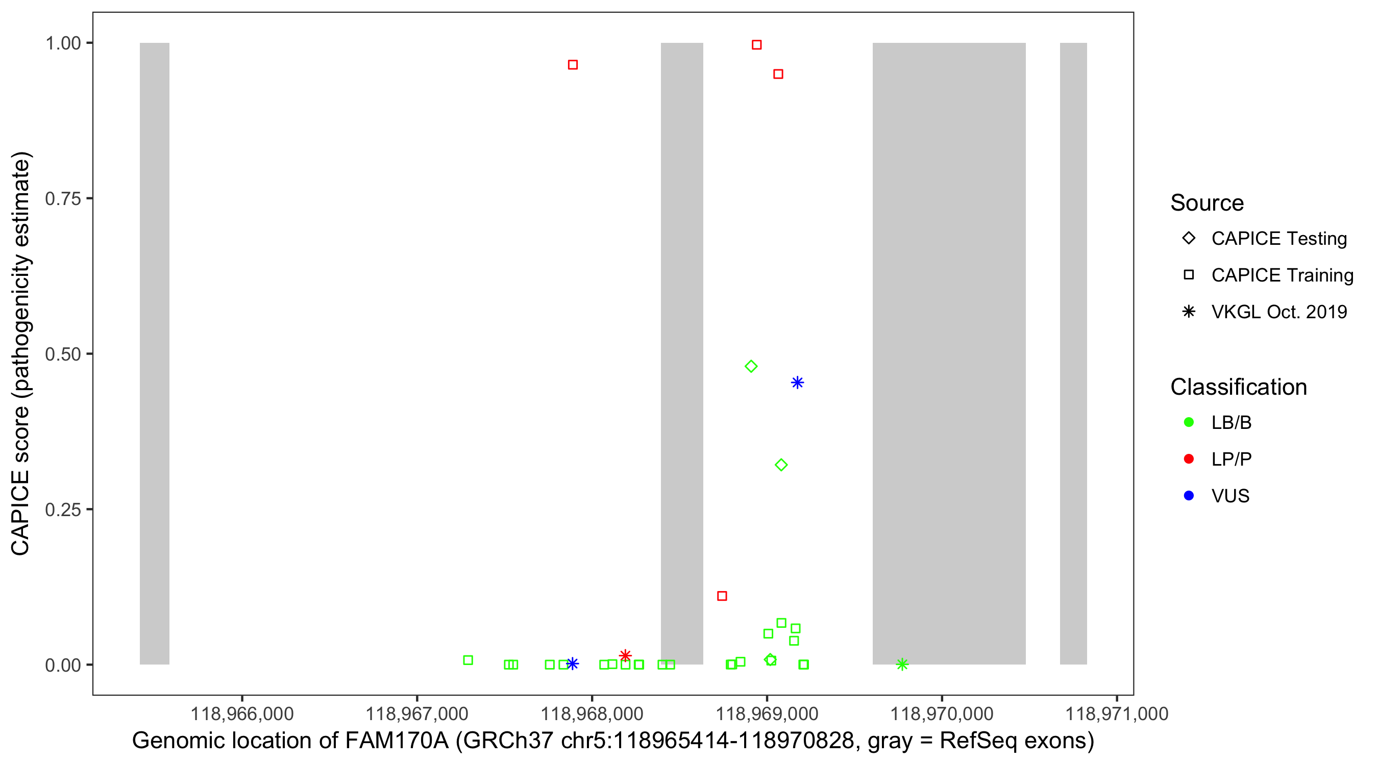 Shown are CAPICE train/test variants plus VKGL Oct 2019.