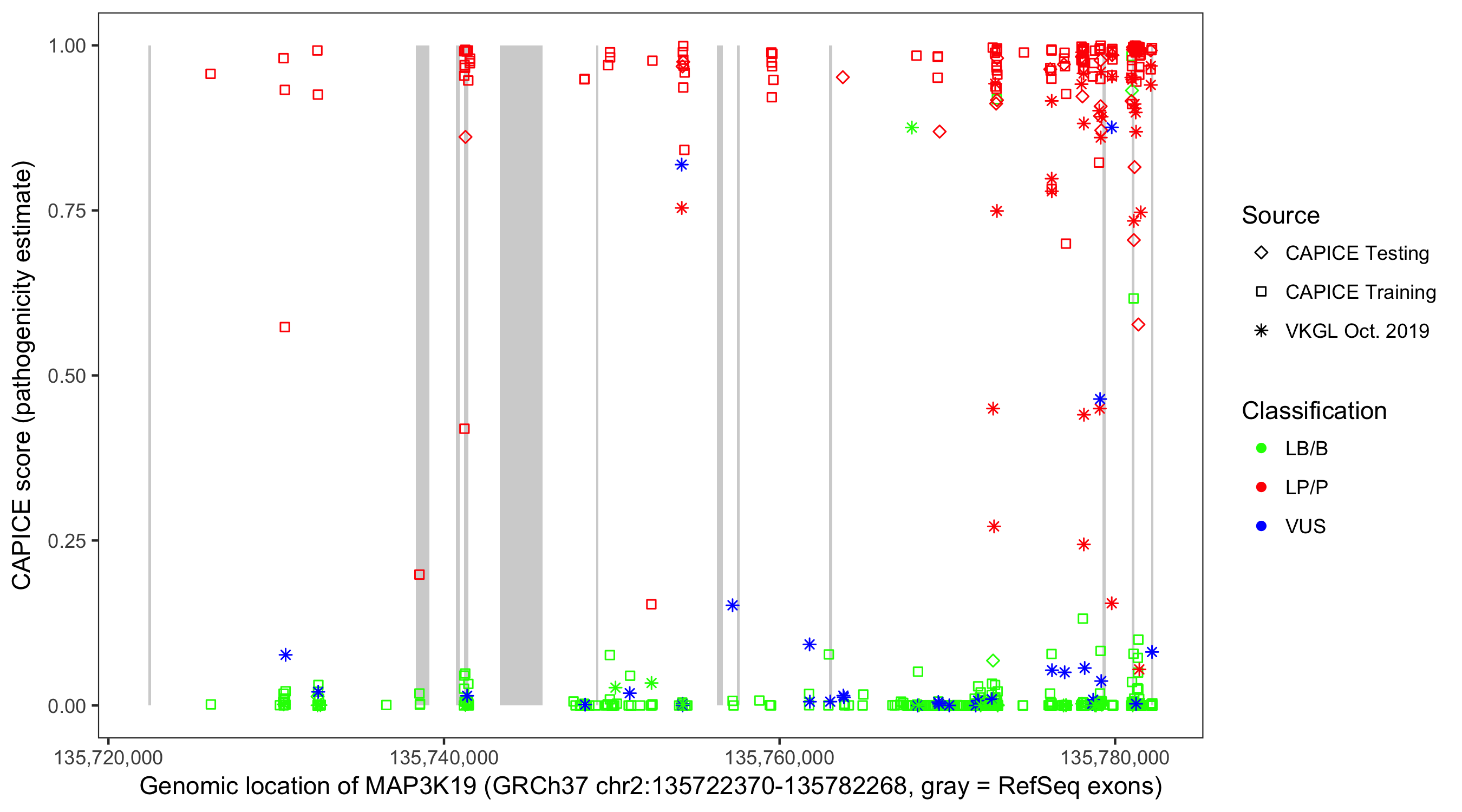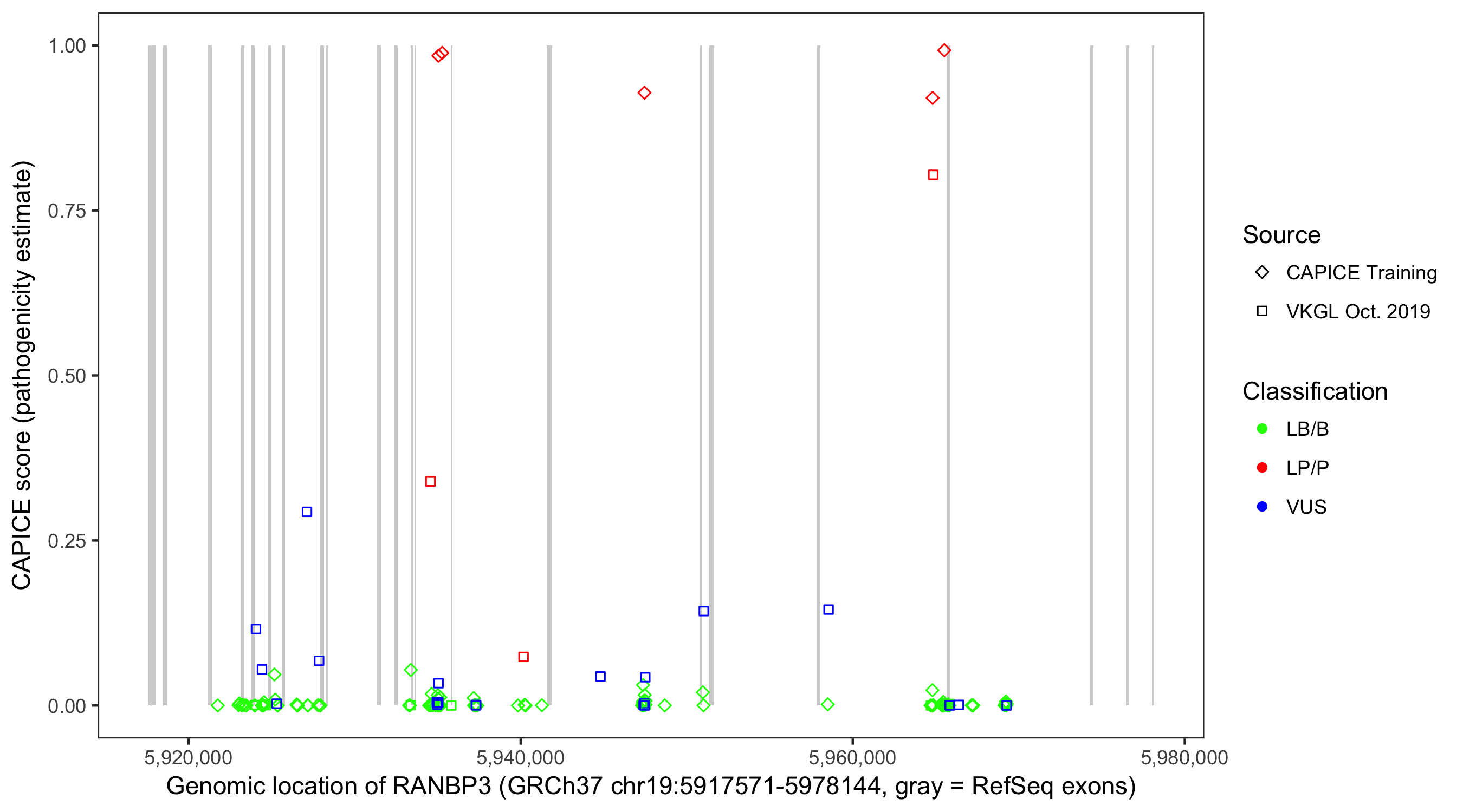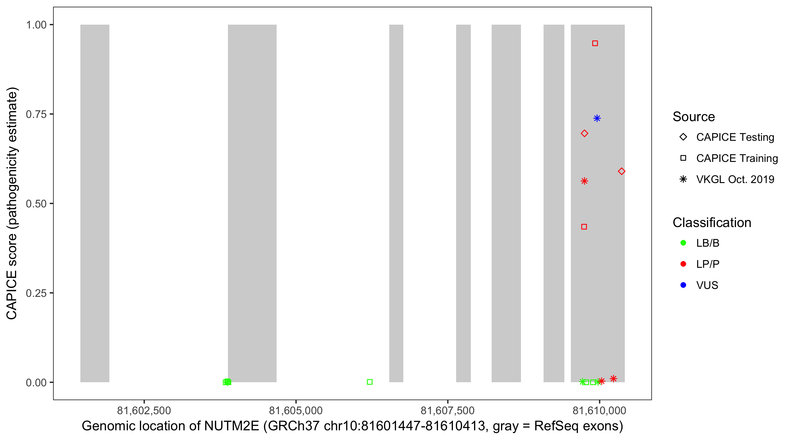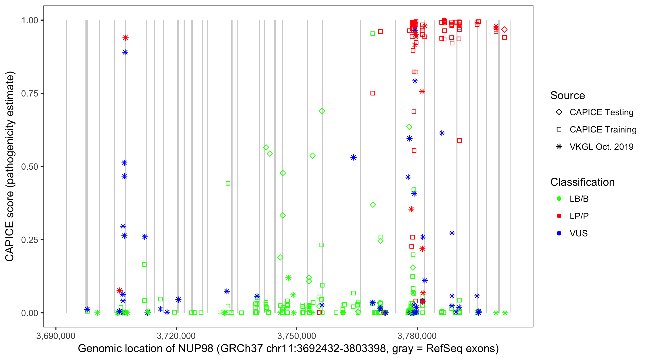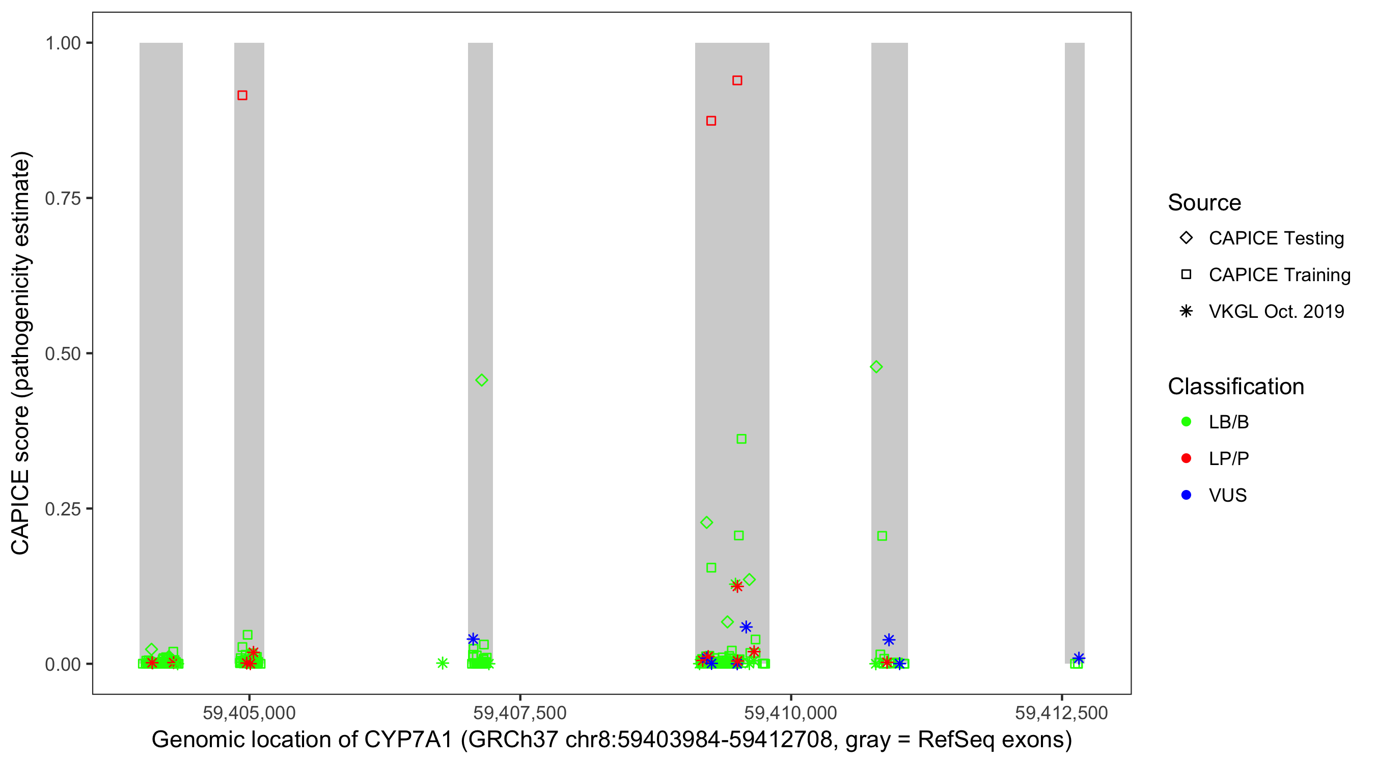 Shown are CAPICE train/test variants plus VKGL Oct 2019.