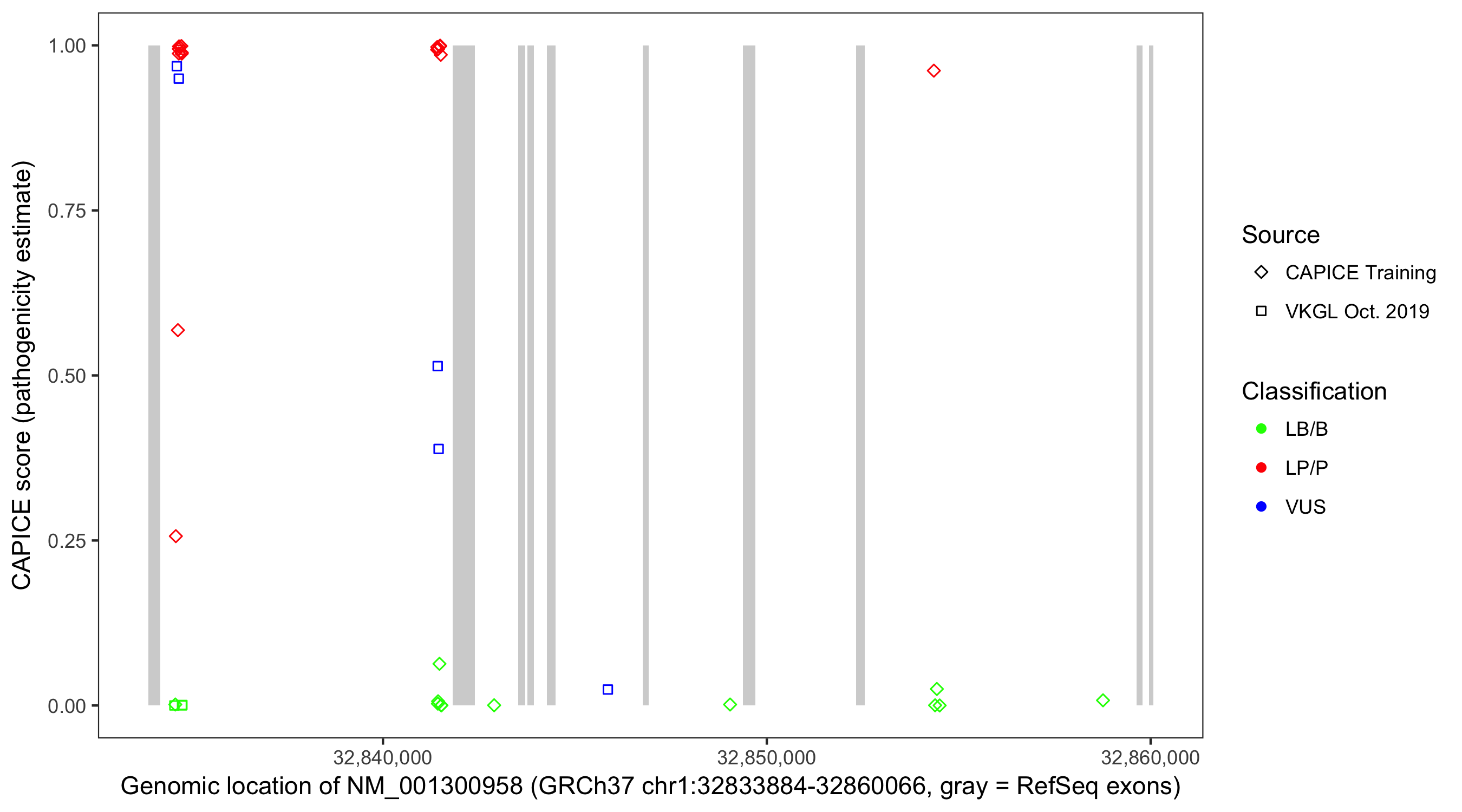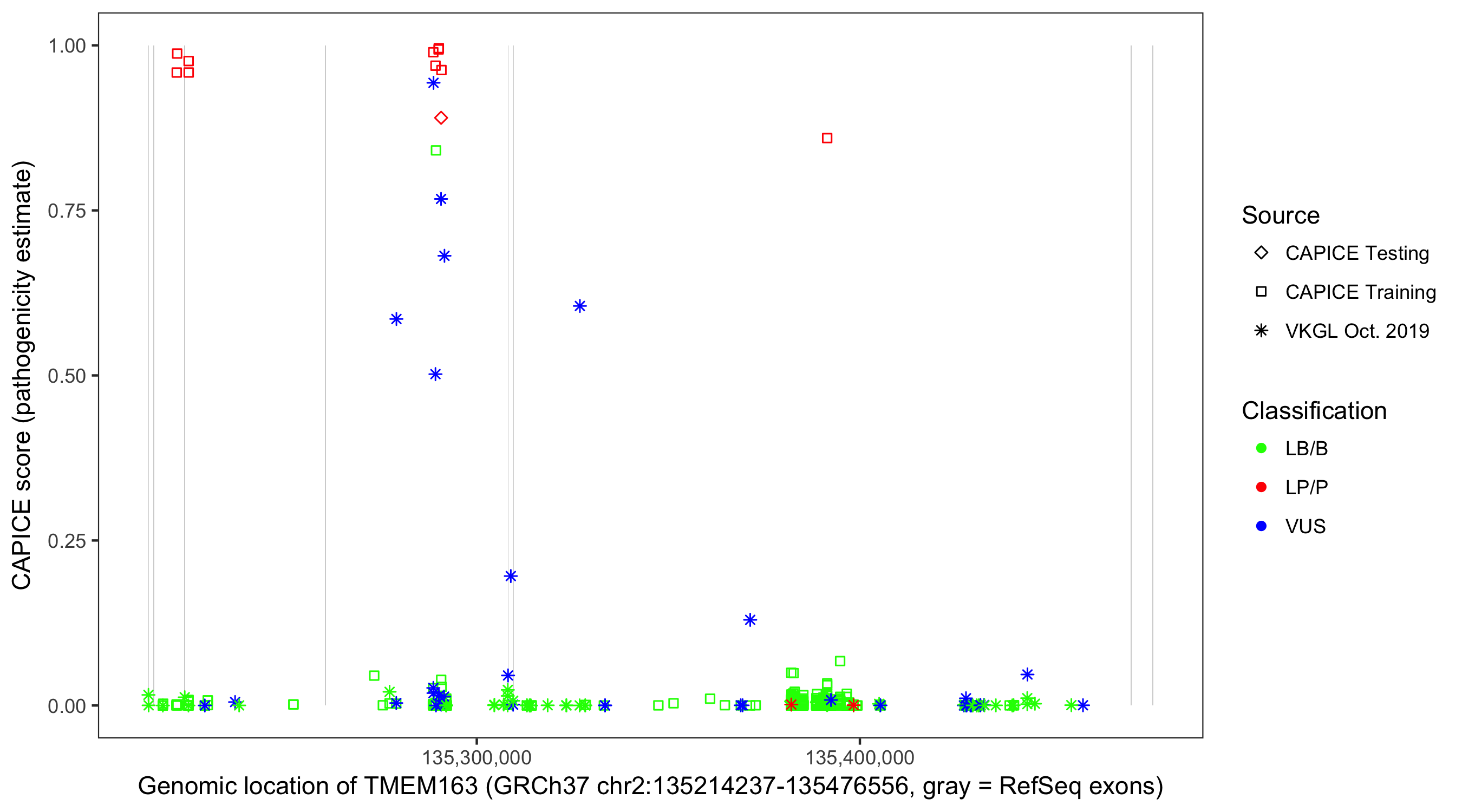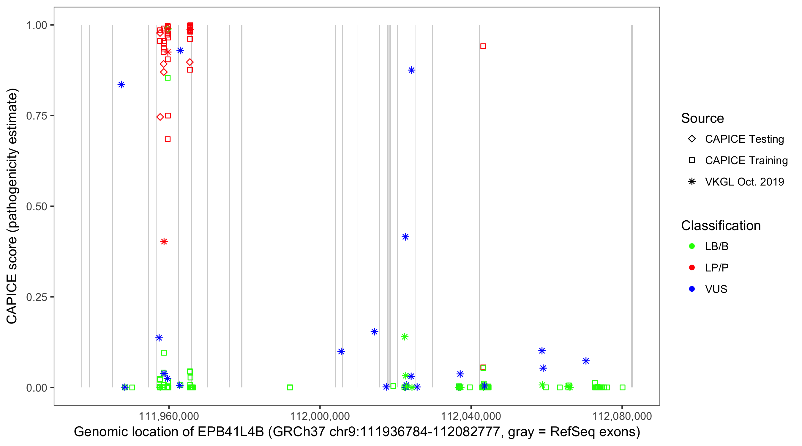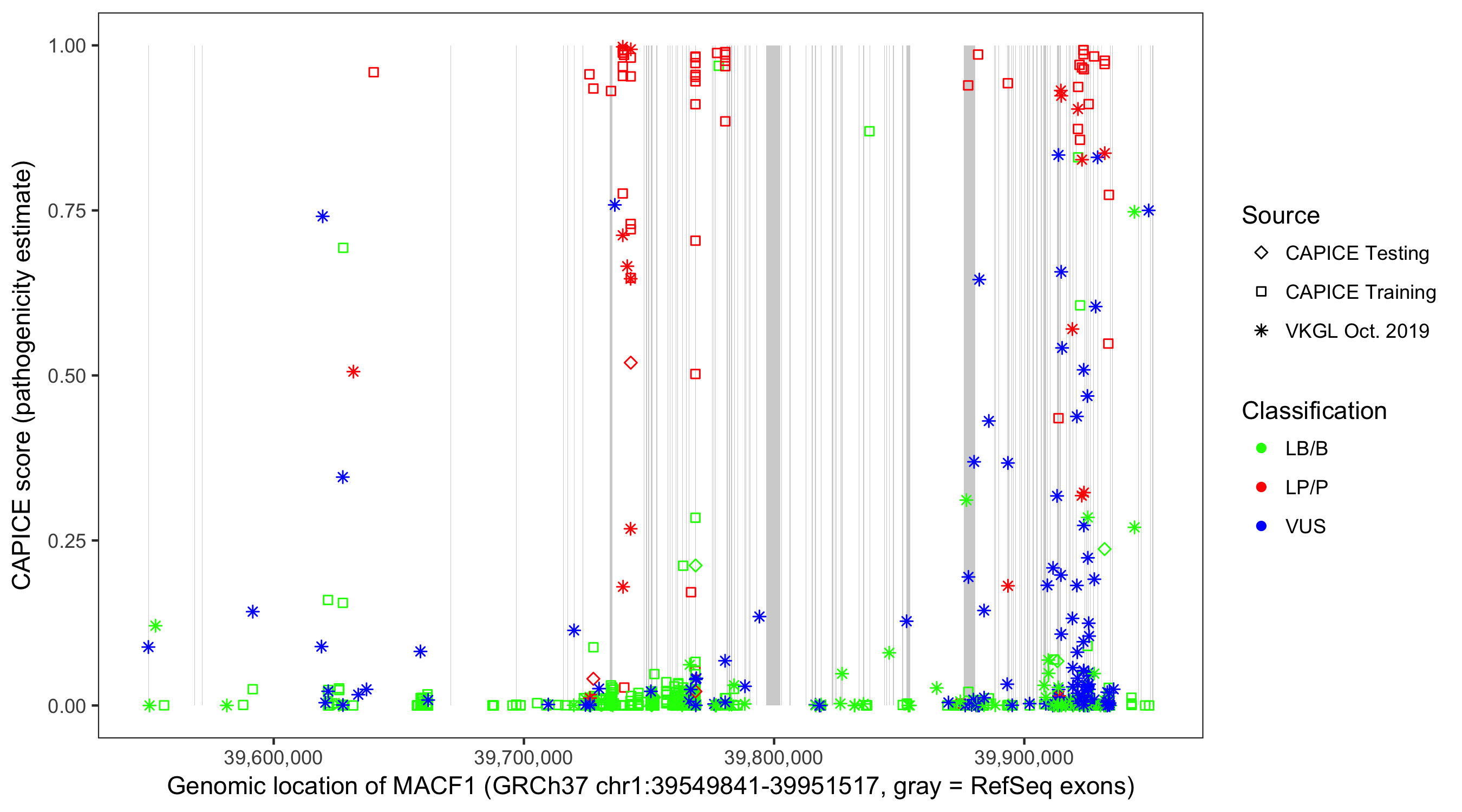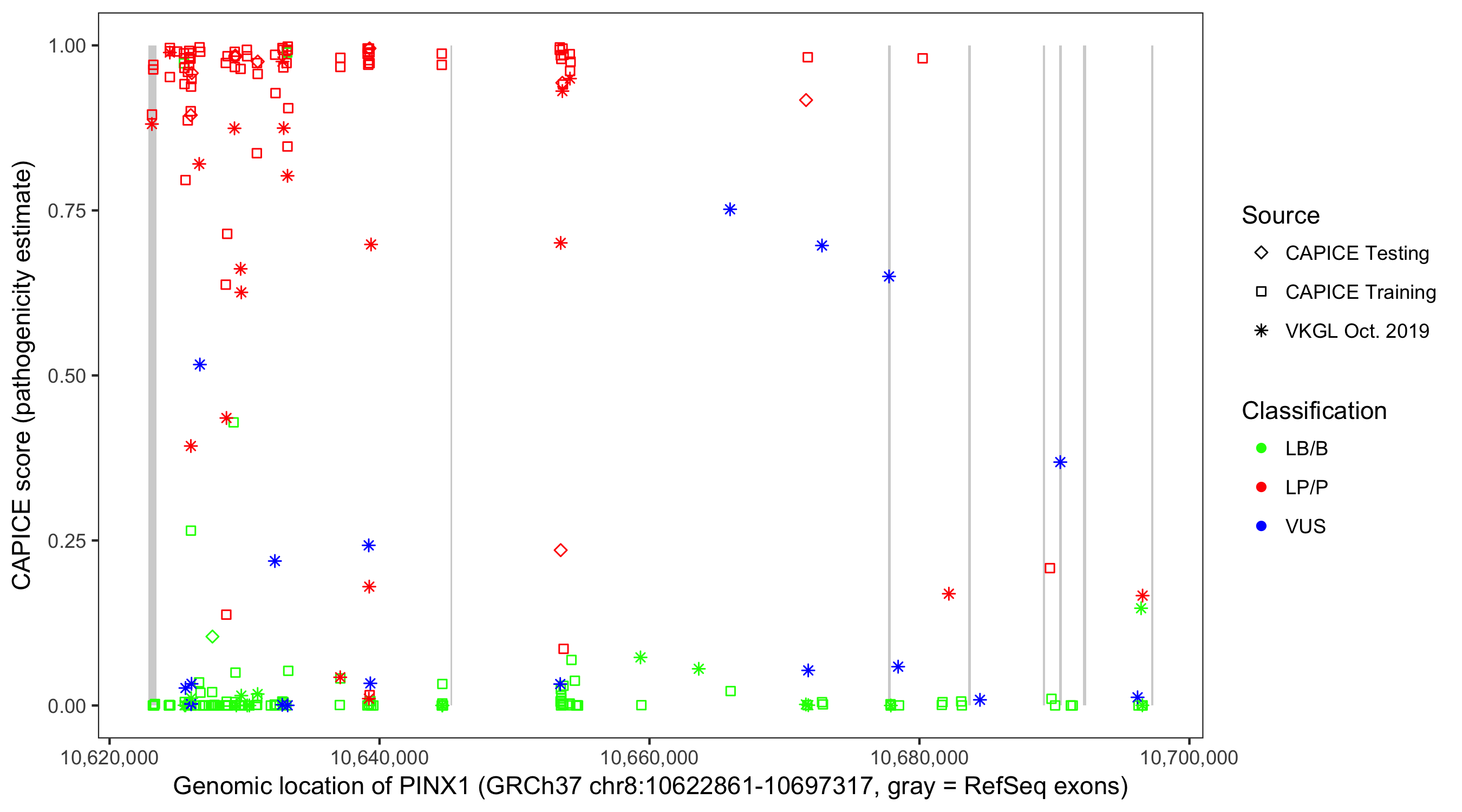 Shown are CAPICE train/test variants plus VKGL Oct 2019.