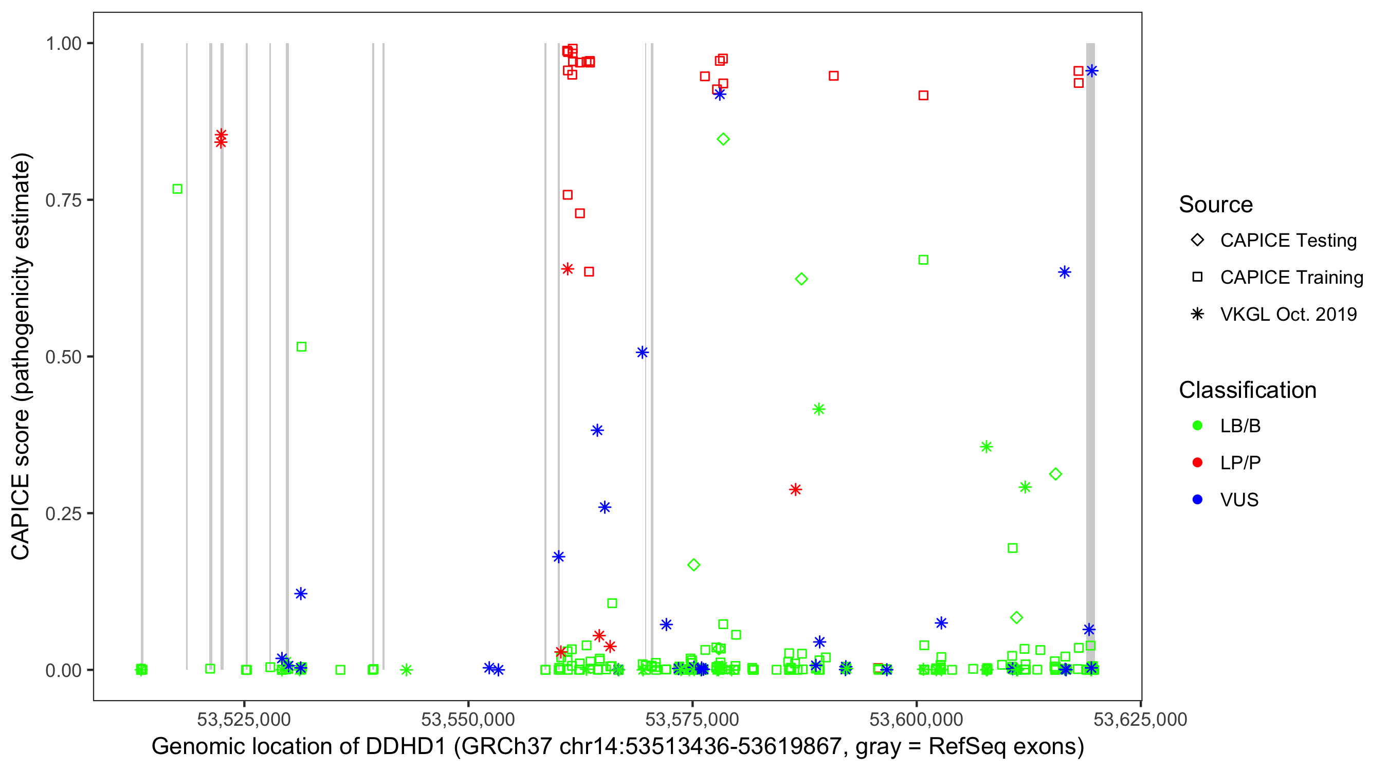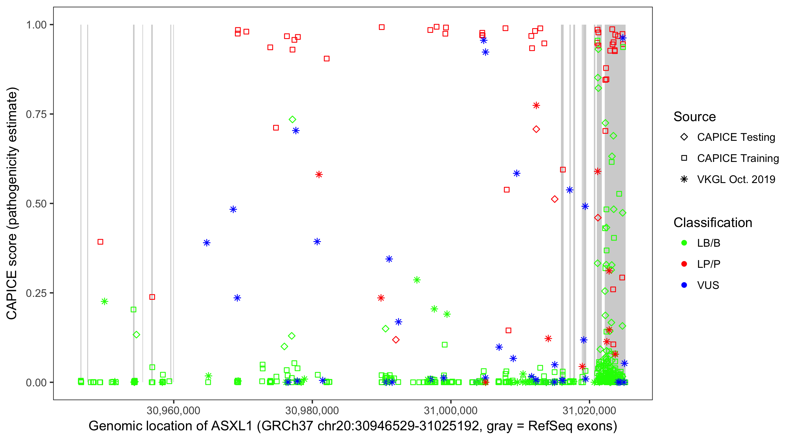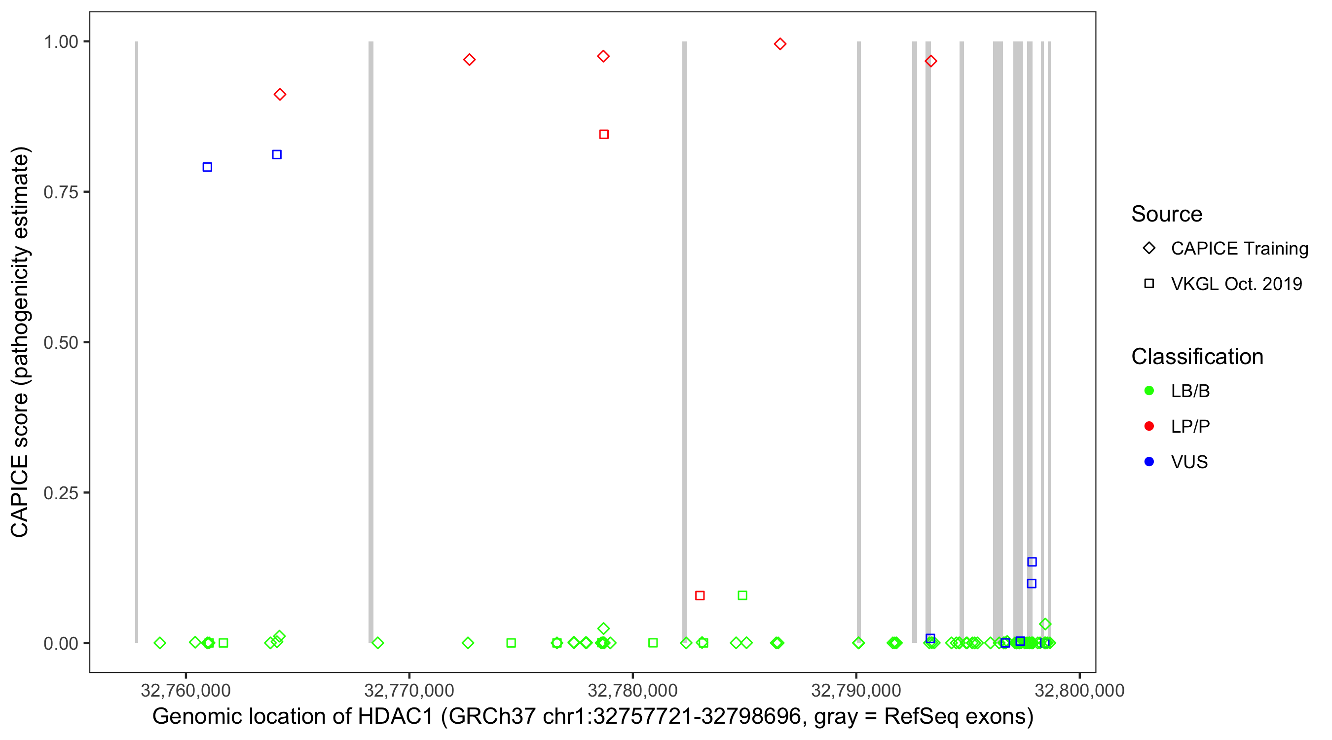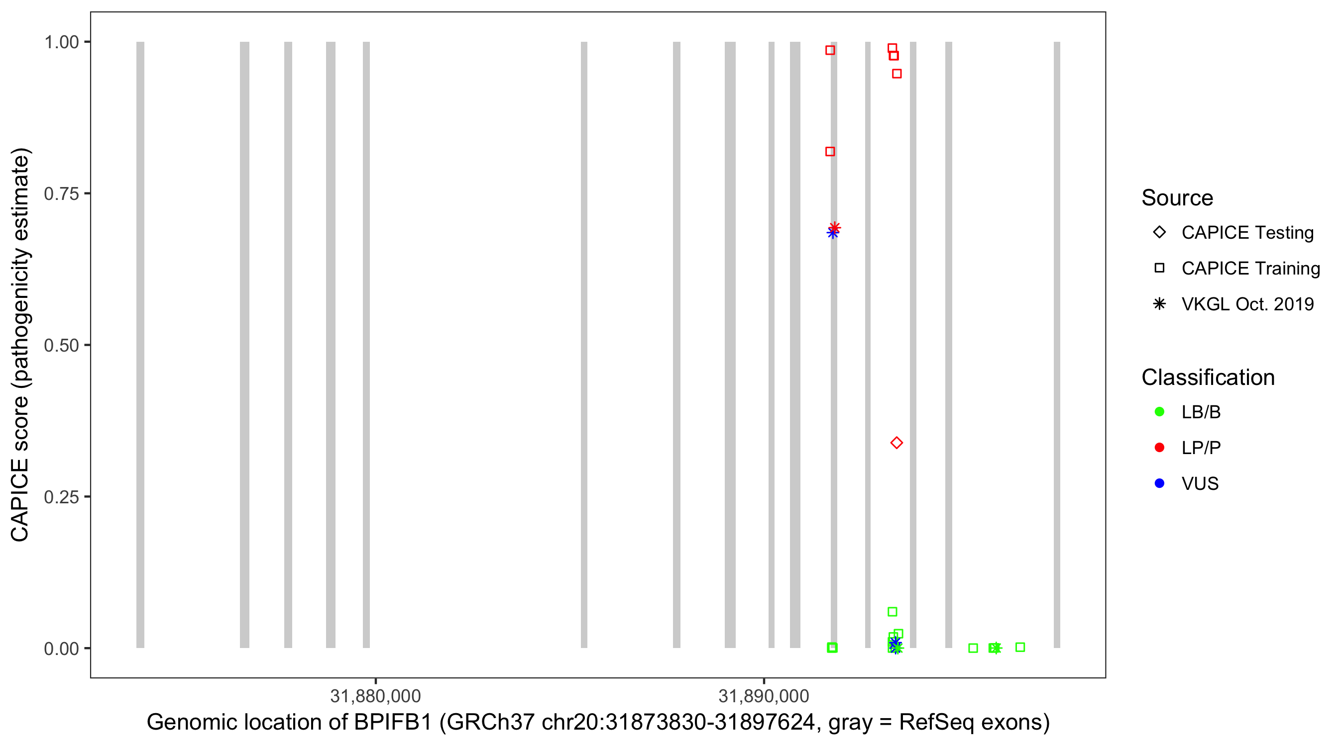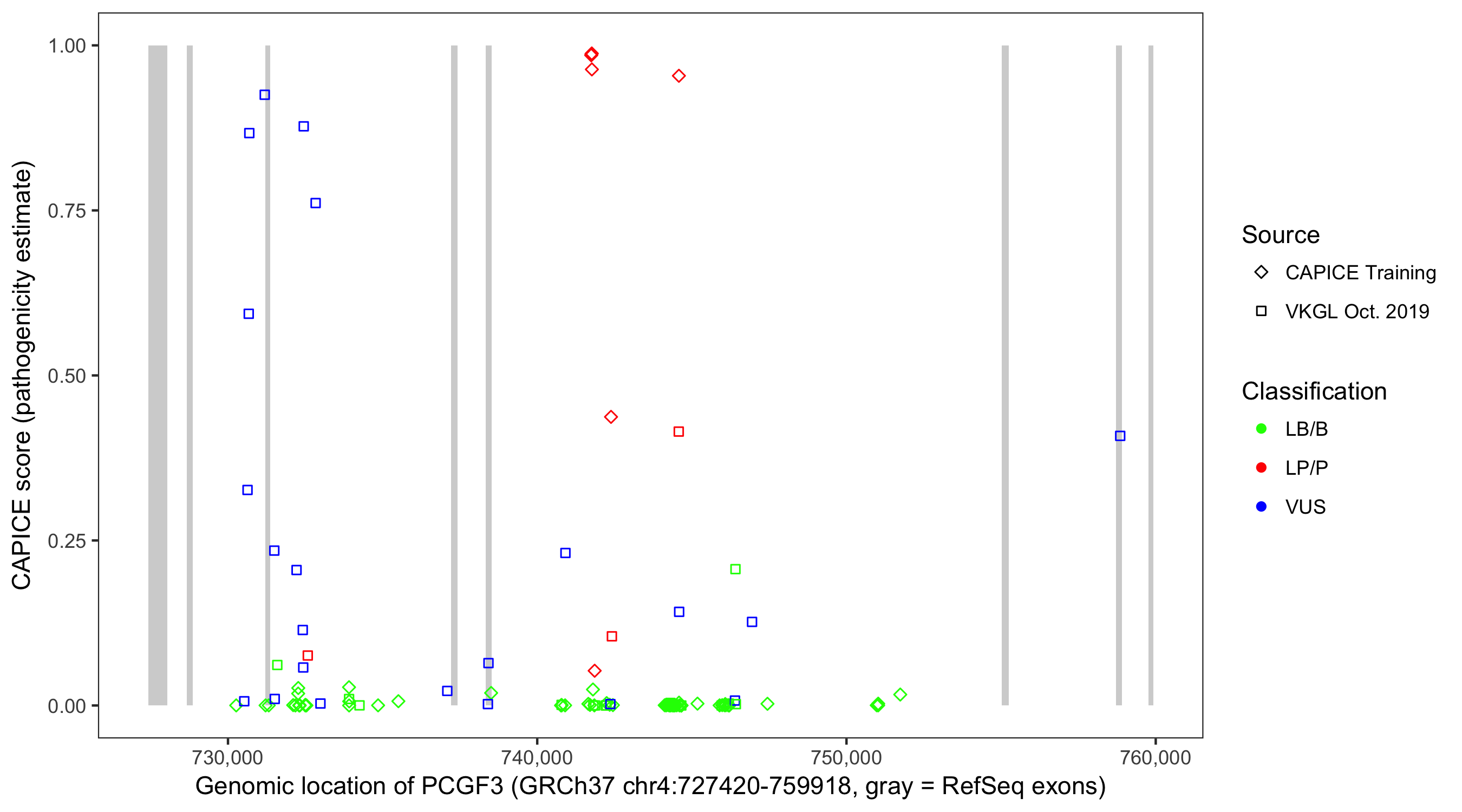 Shown are CAPICE train/test variants plus VKGL Oct 2019.