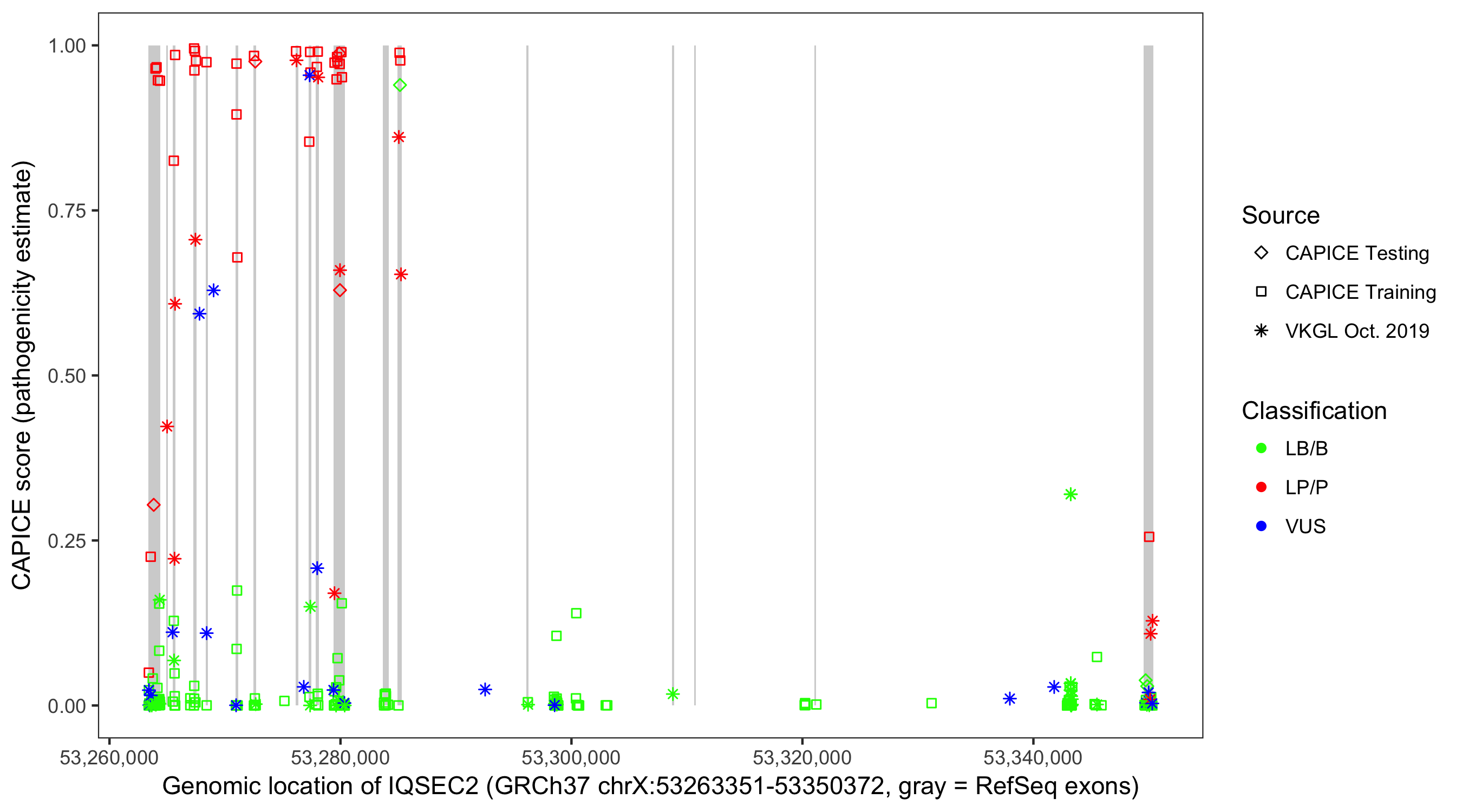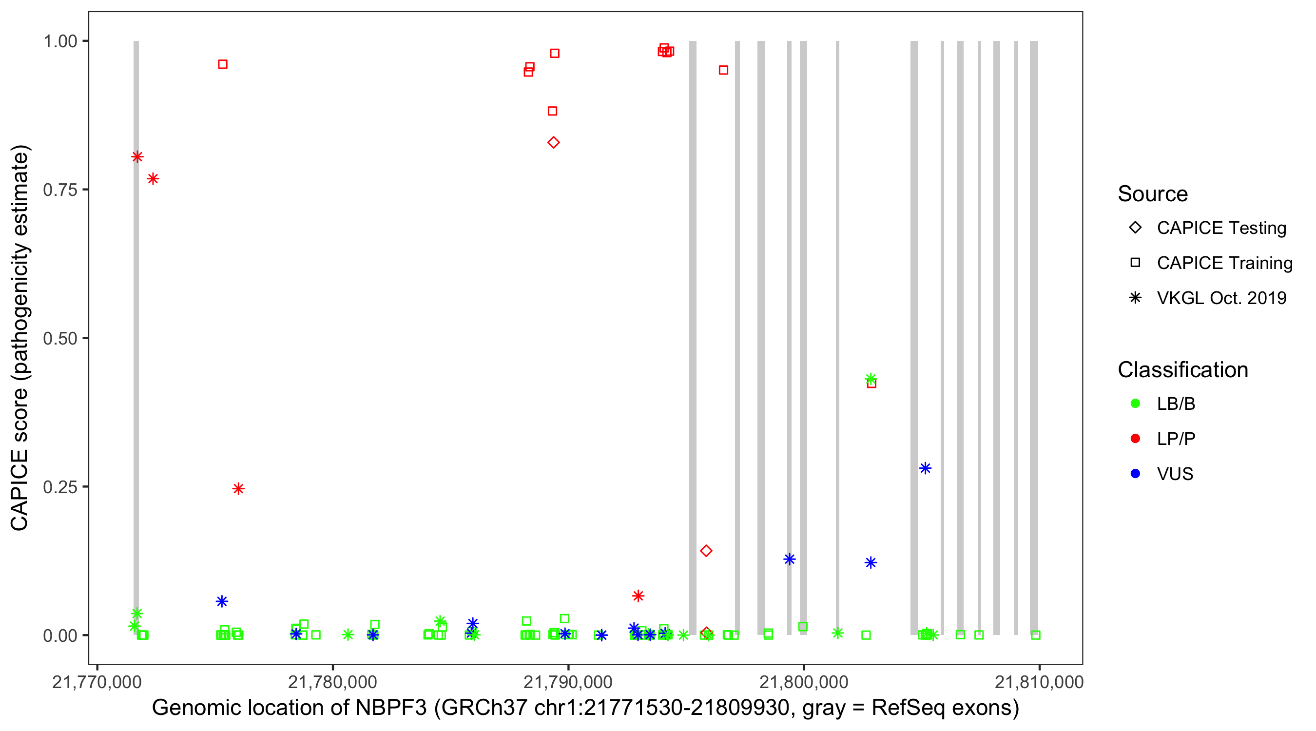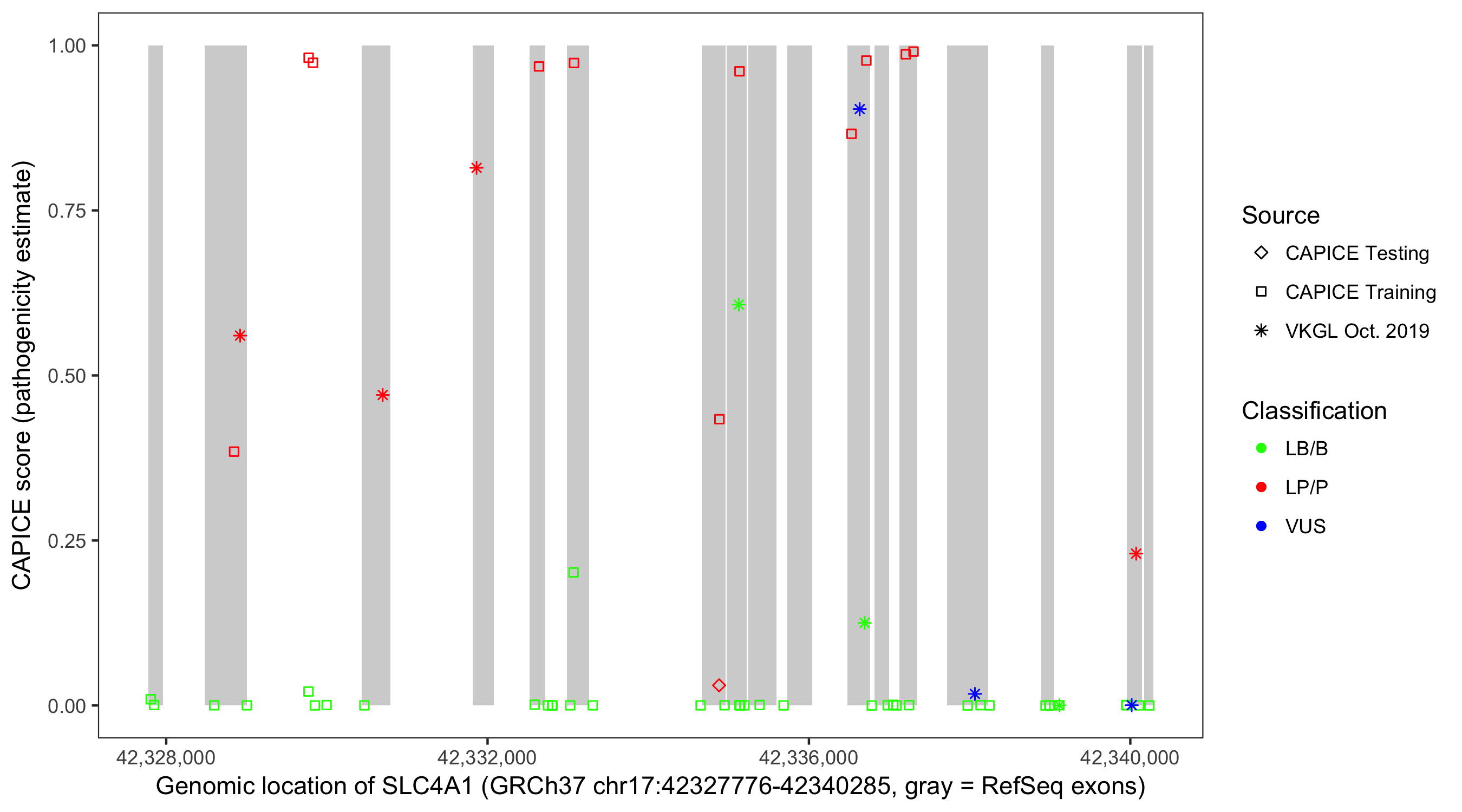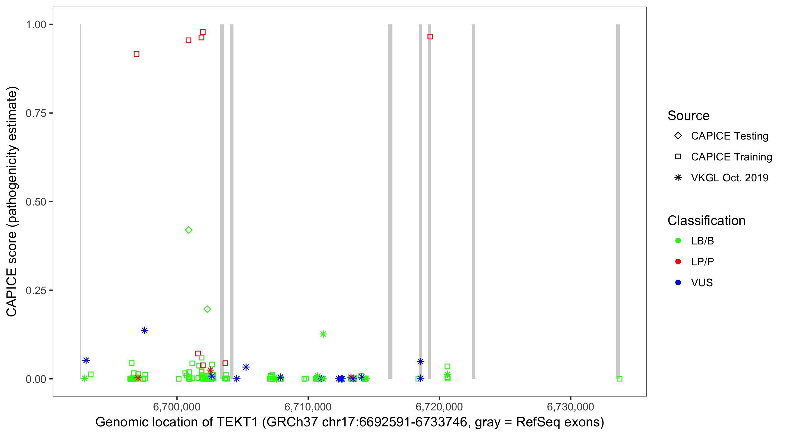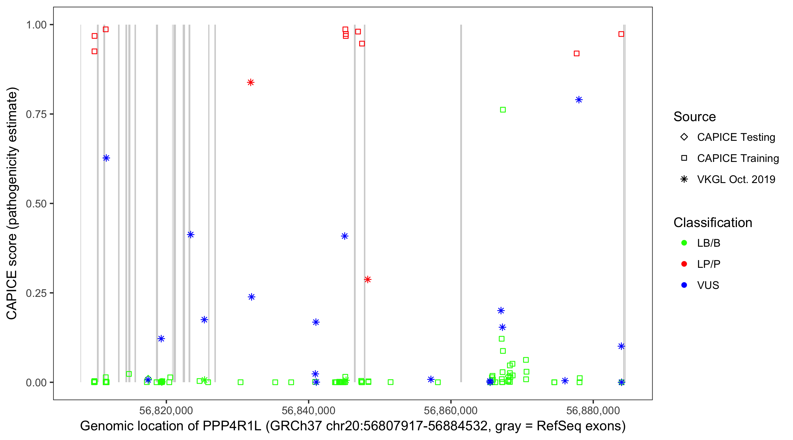 Shown are CAPICE train/test variants plus VKGL Oct 2019.