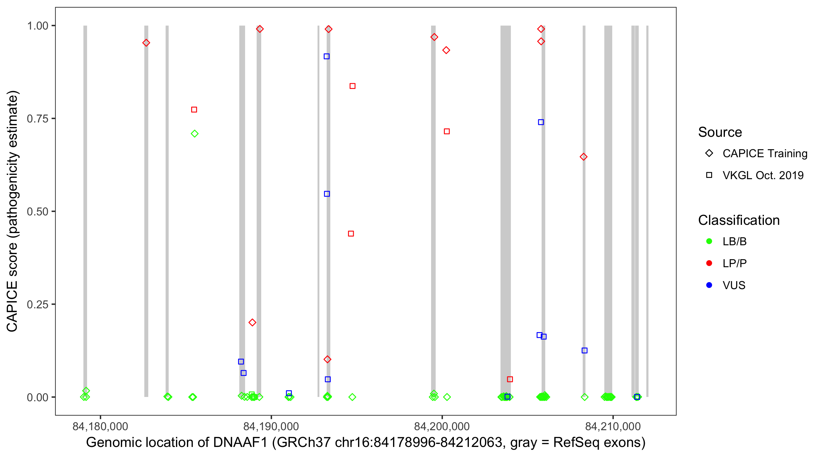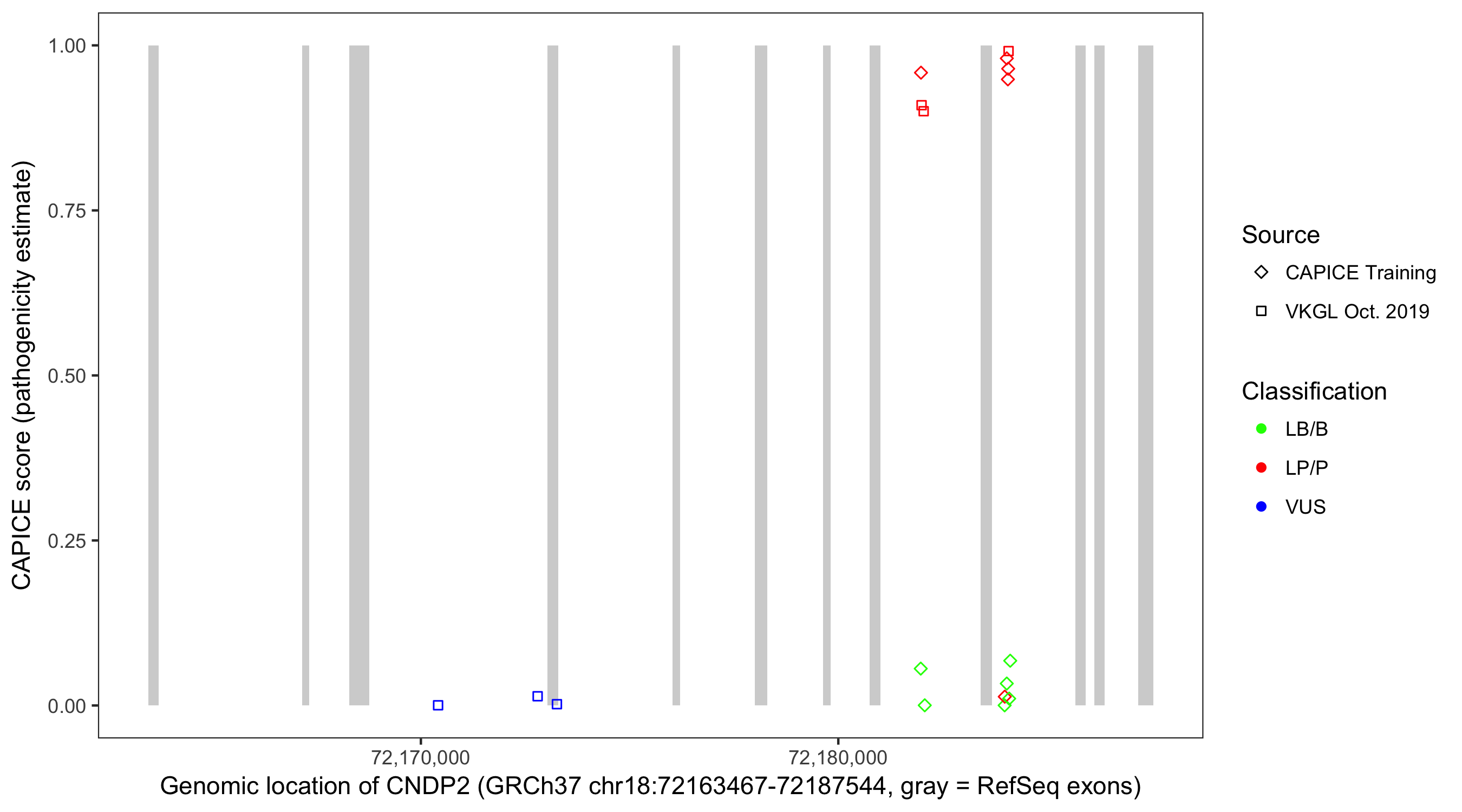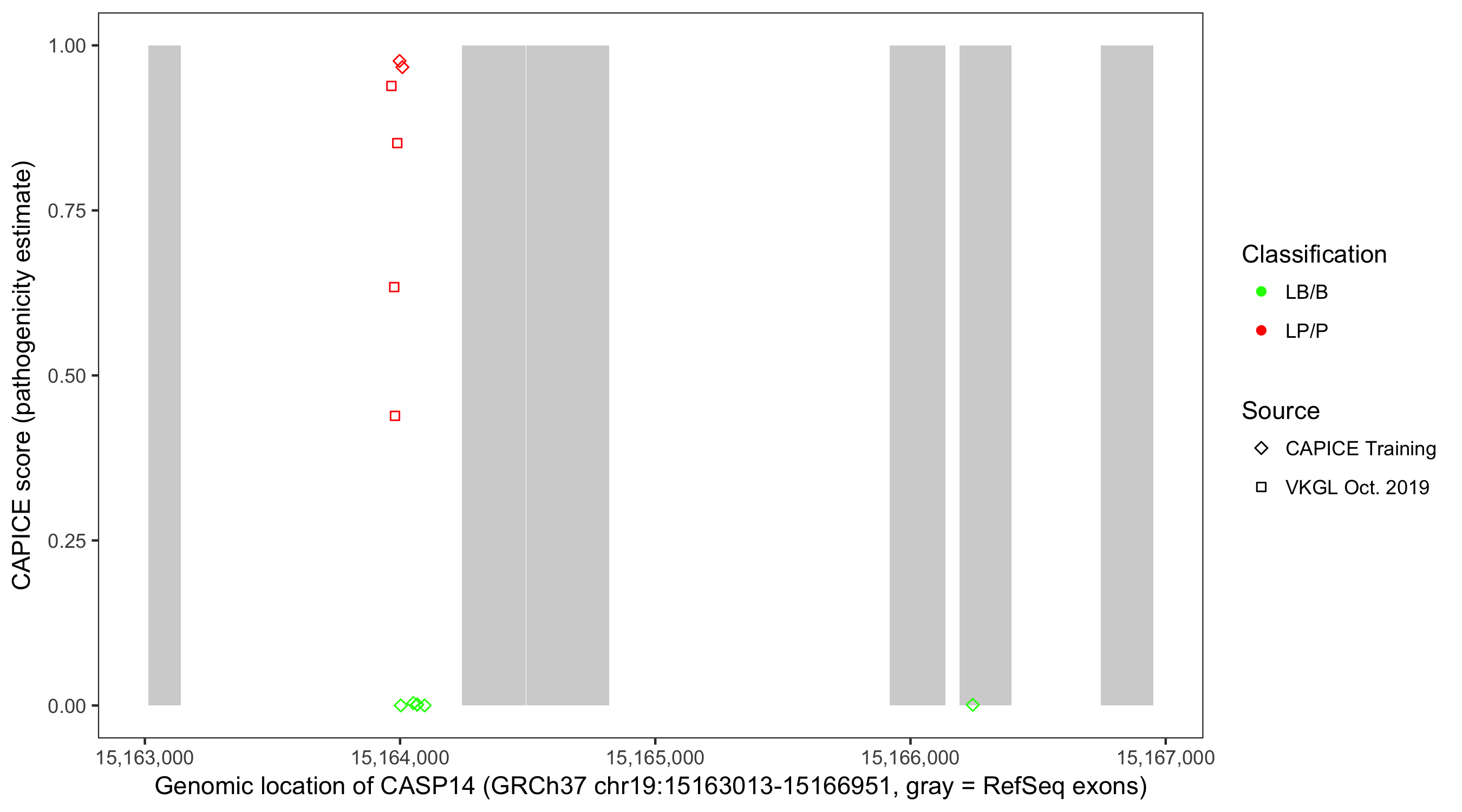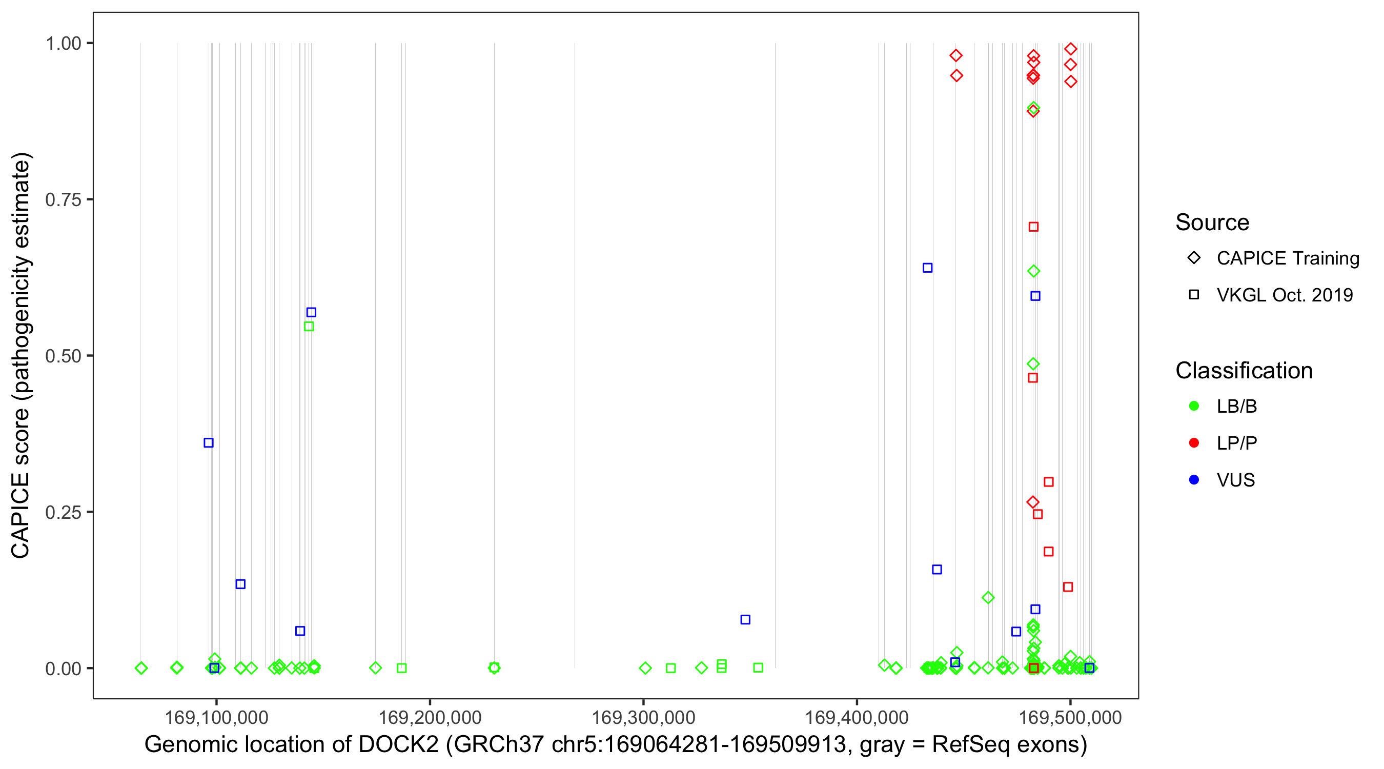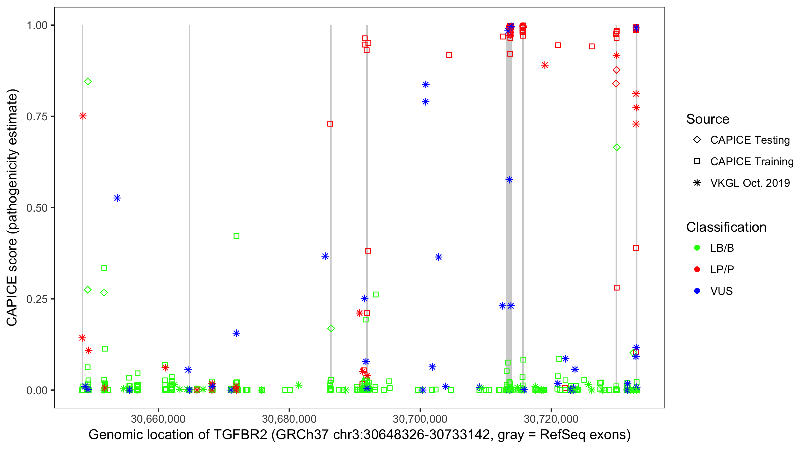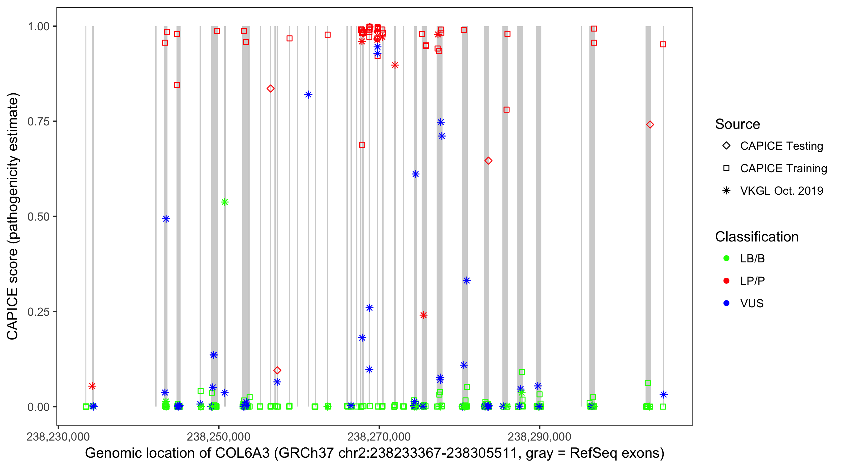 Shown are CAPICE train/test variants plus VKGL Oct 2019.