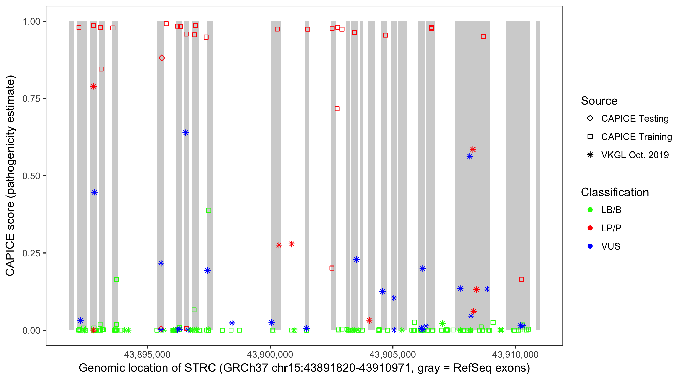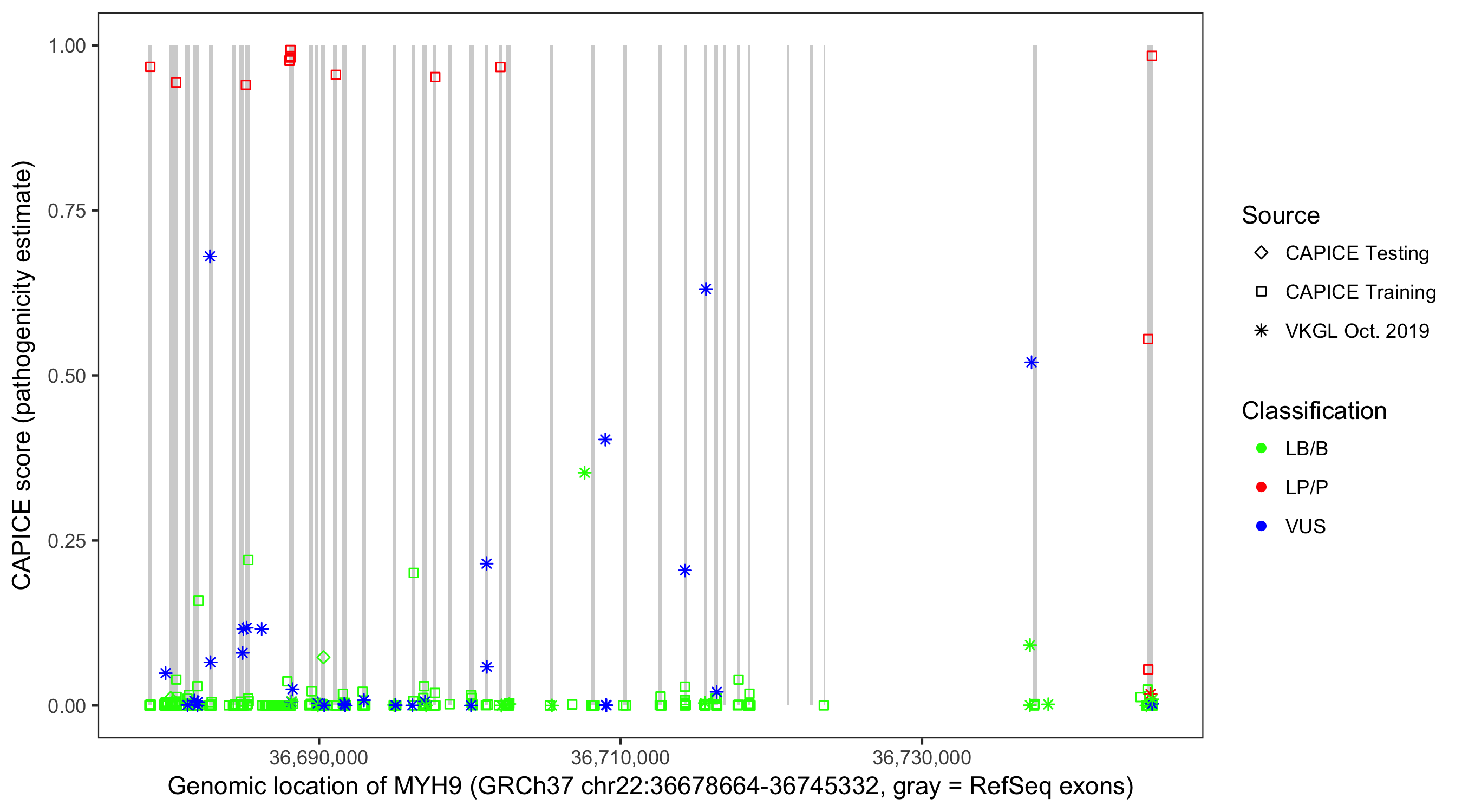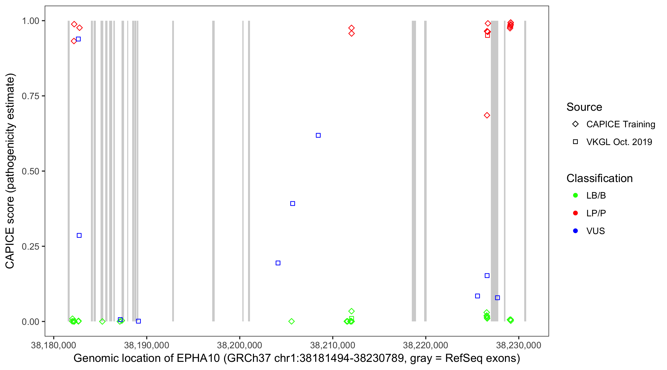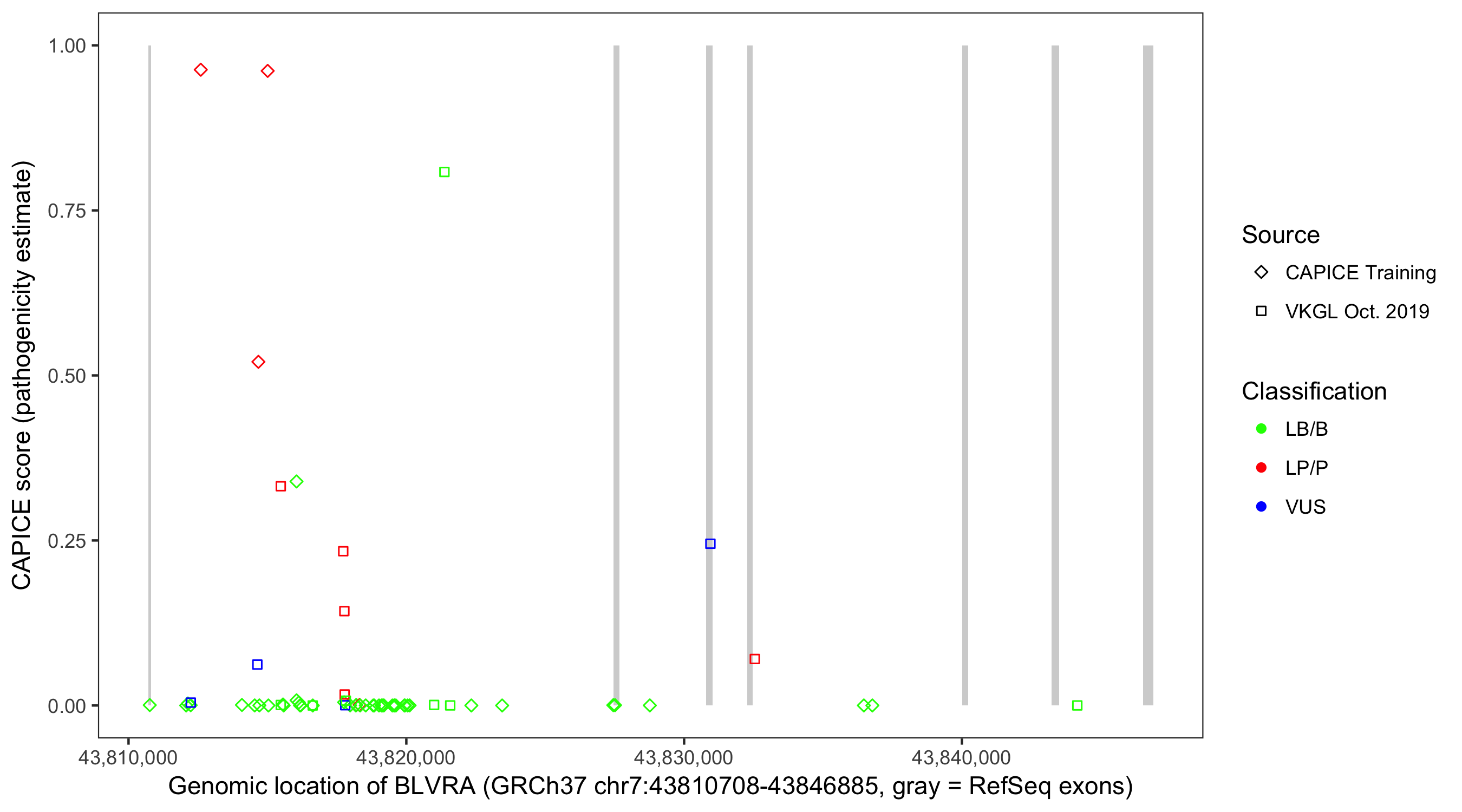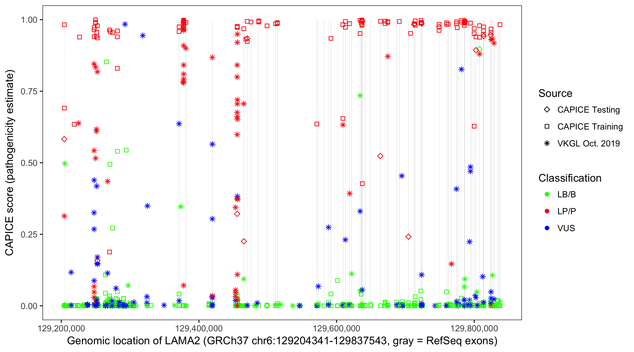 Shown are CAPICE train/test variants plus VKGL Oct 2019.