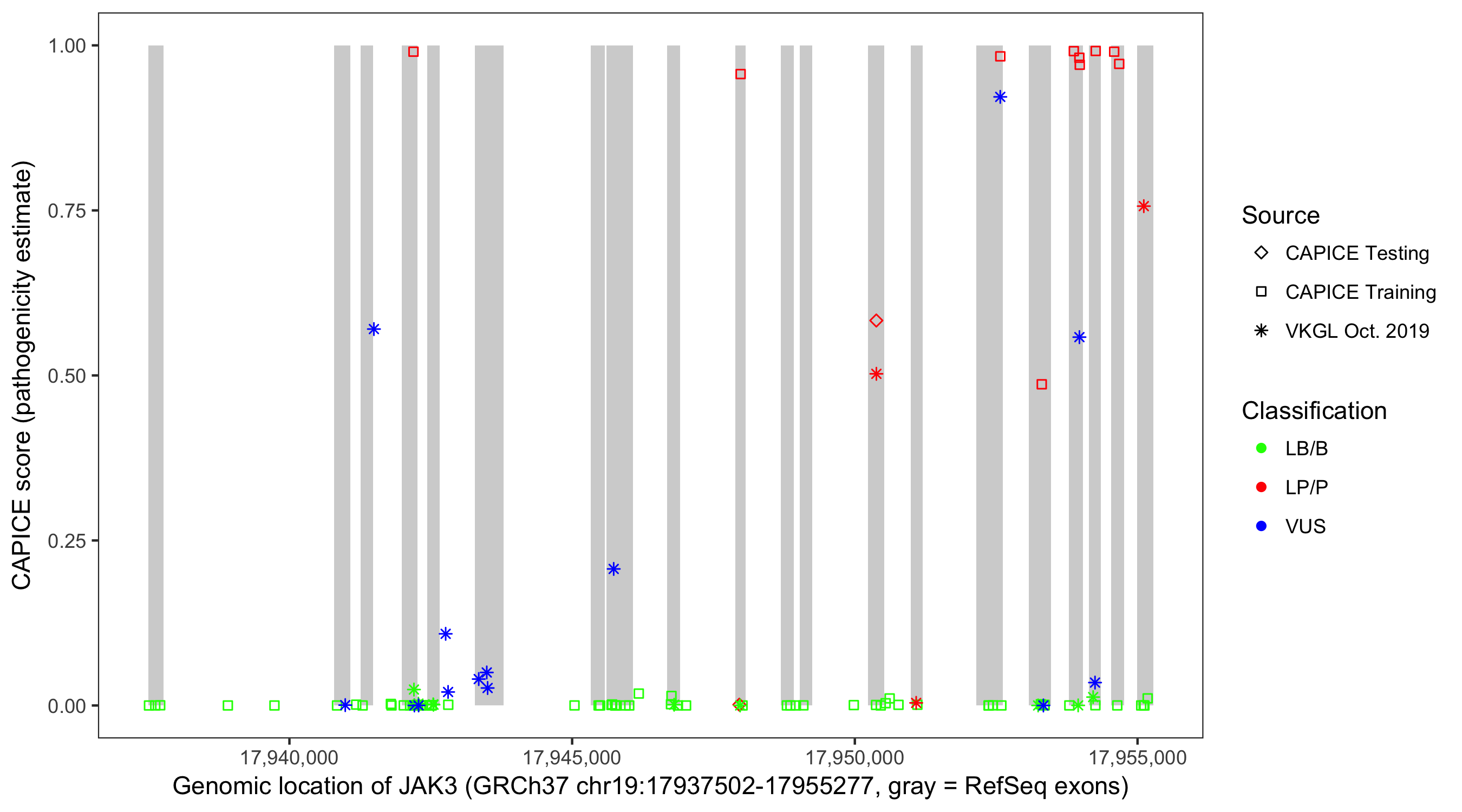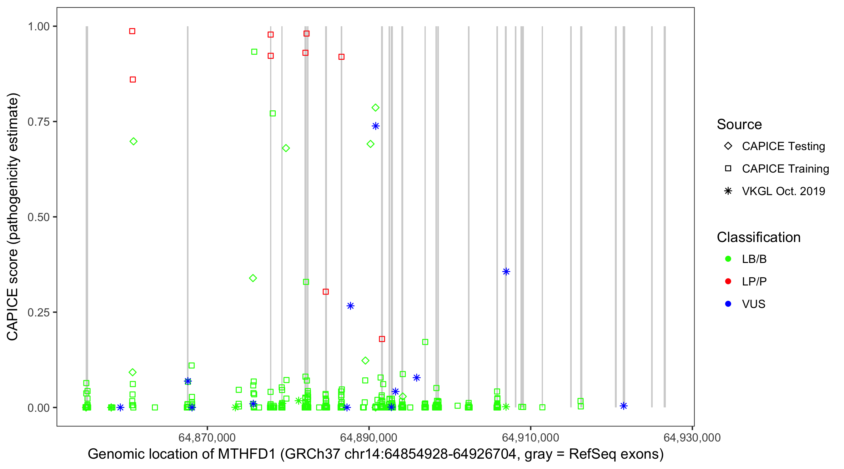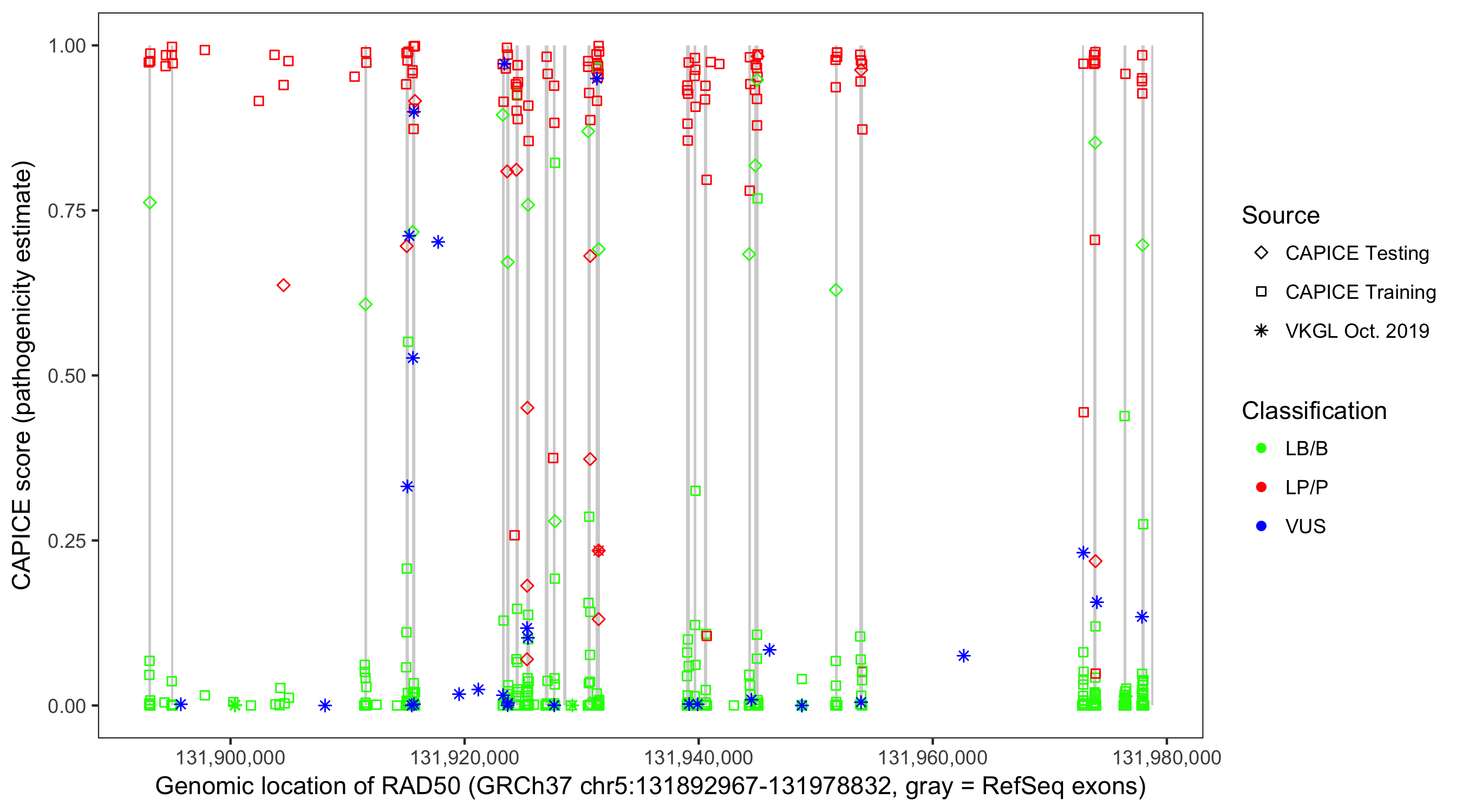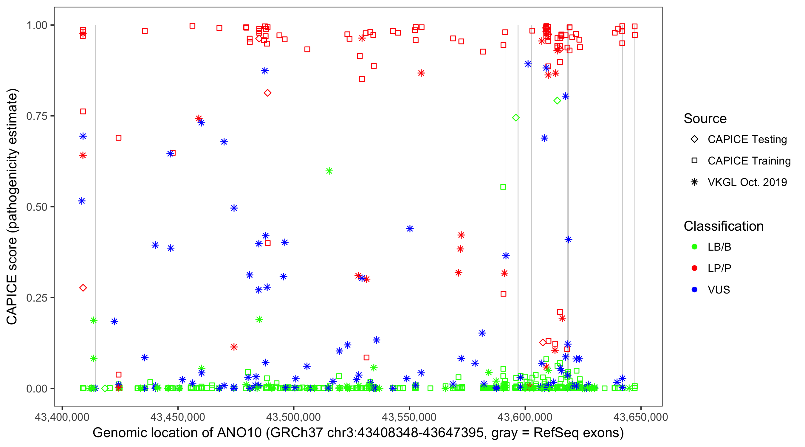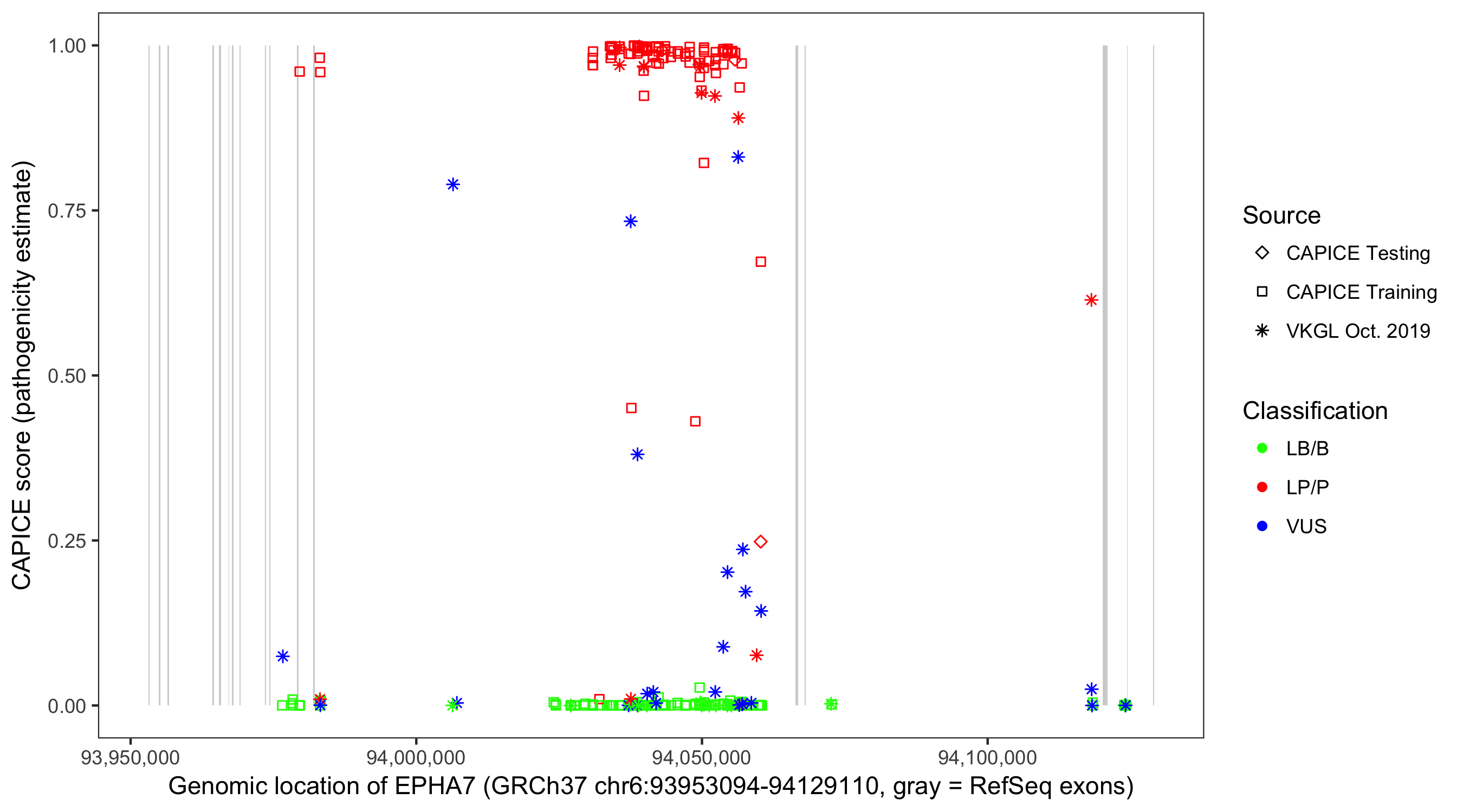 Shown are CAPICE train/test variants plus VKGL Oct 2019.
