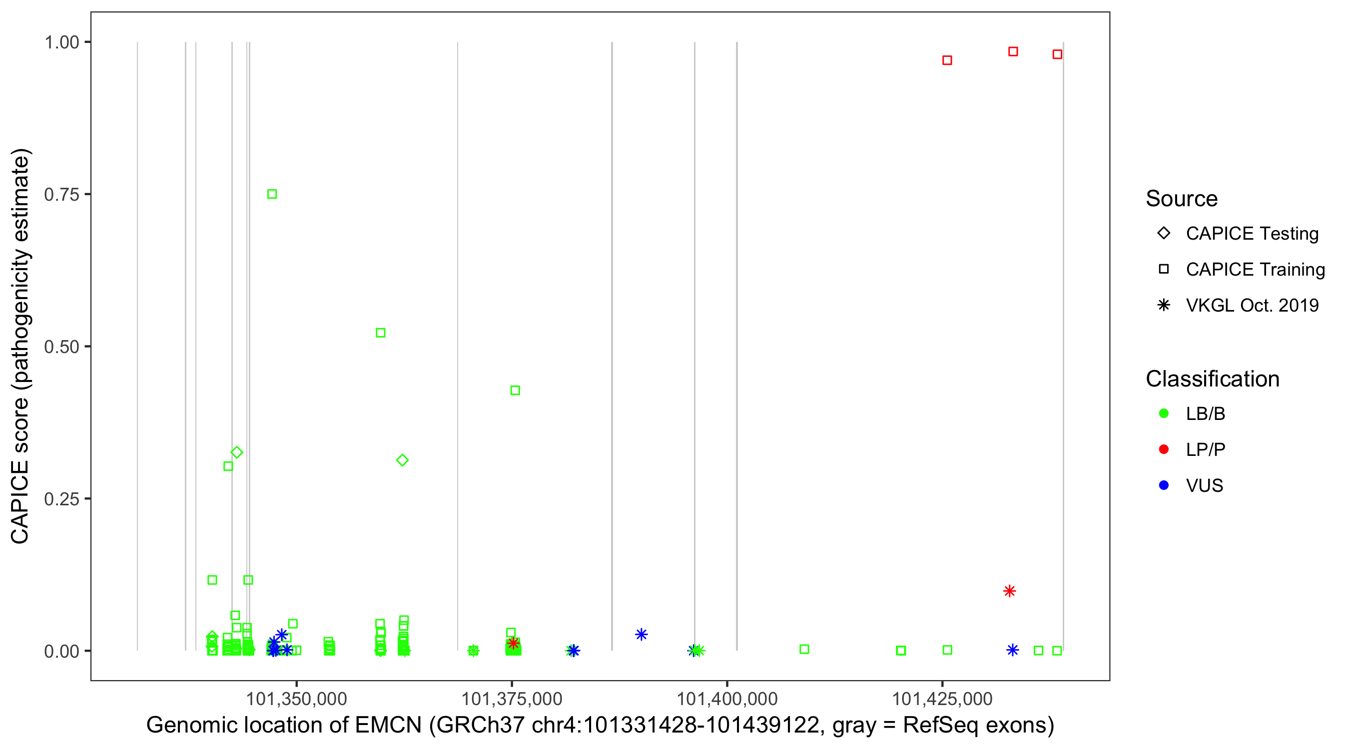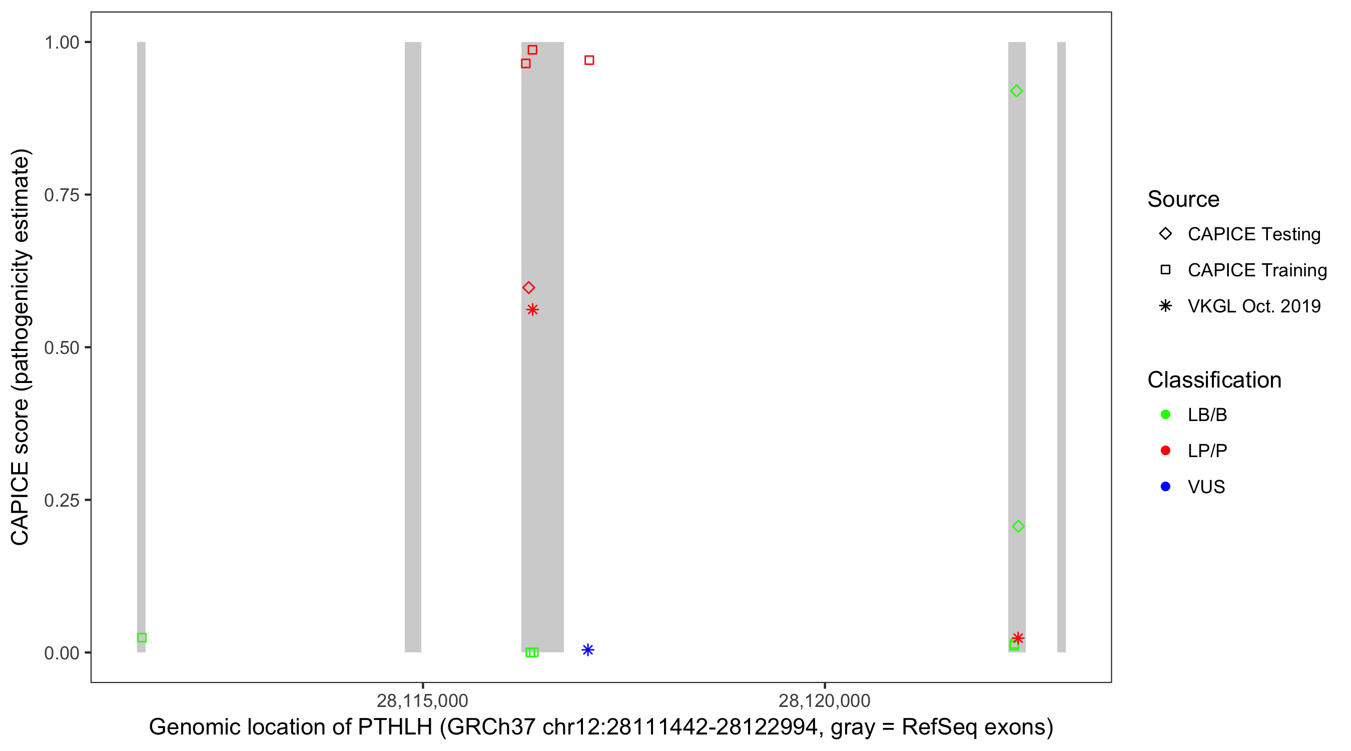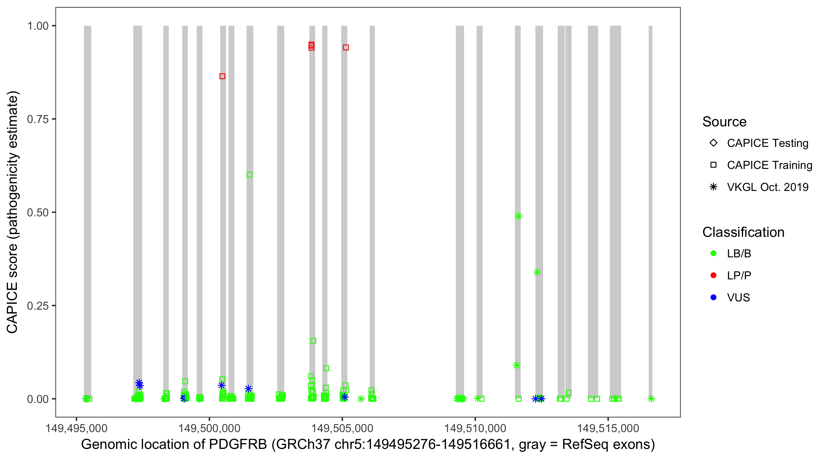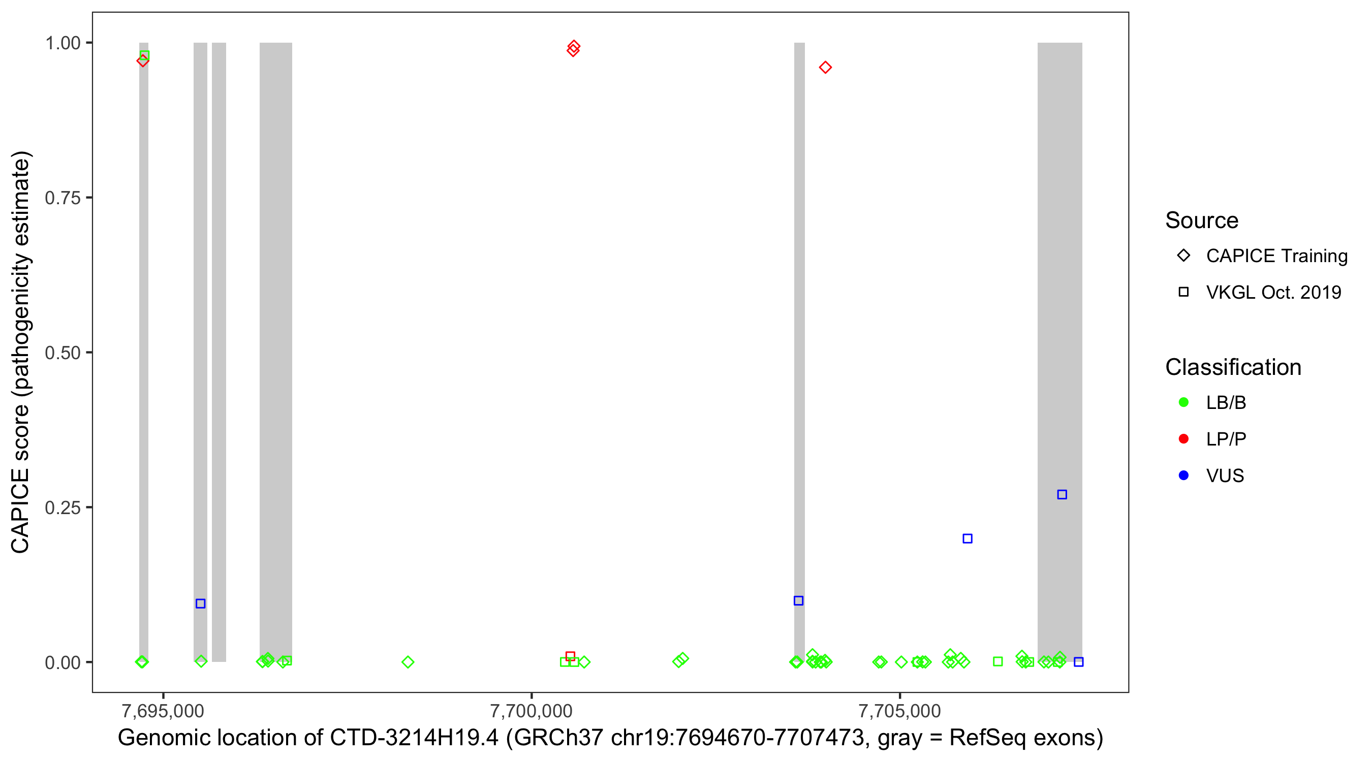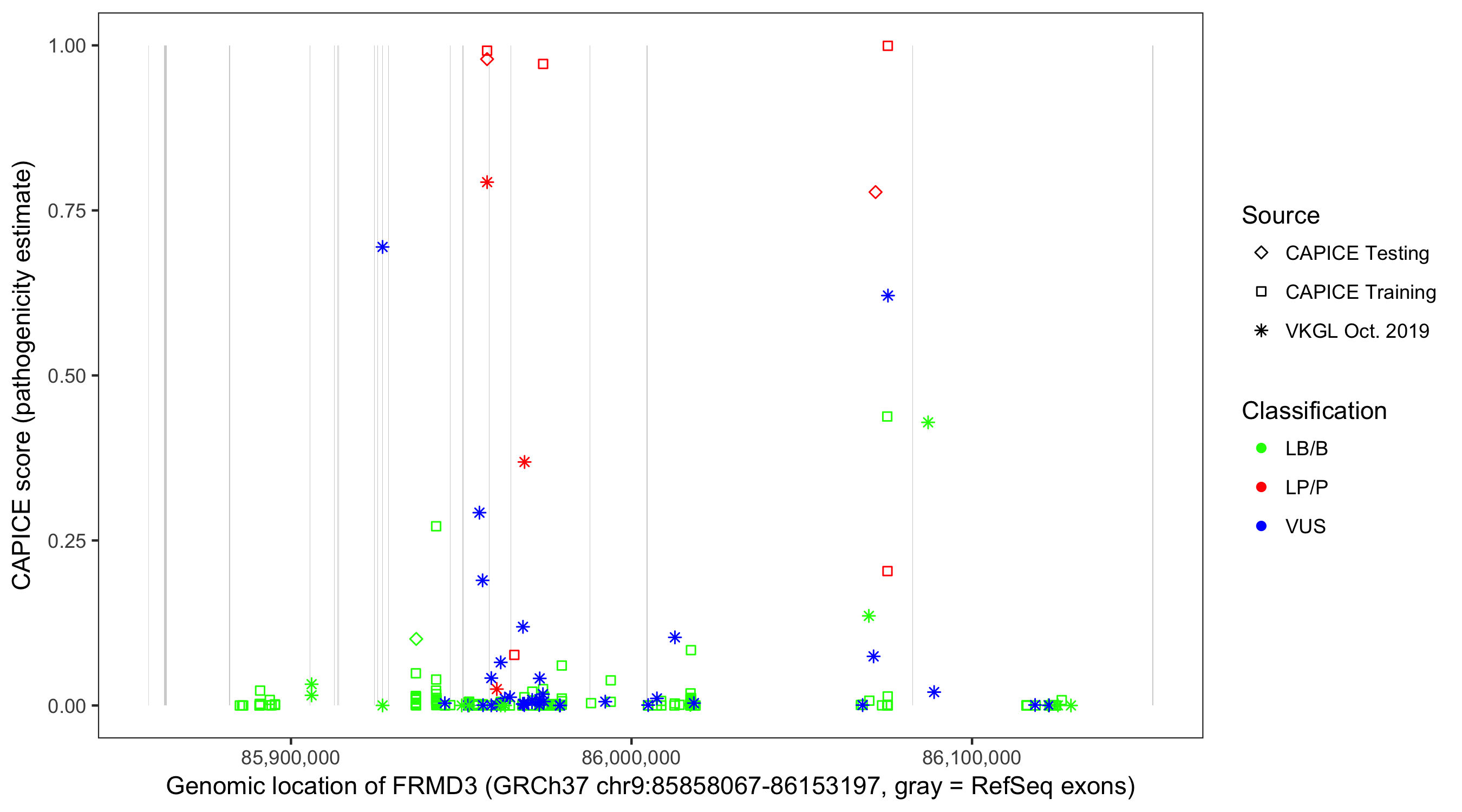 Shown are CAPICE train/test variants plus VKGL Oct 2019.