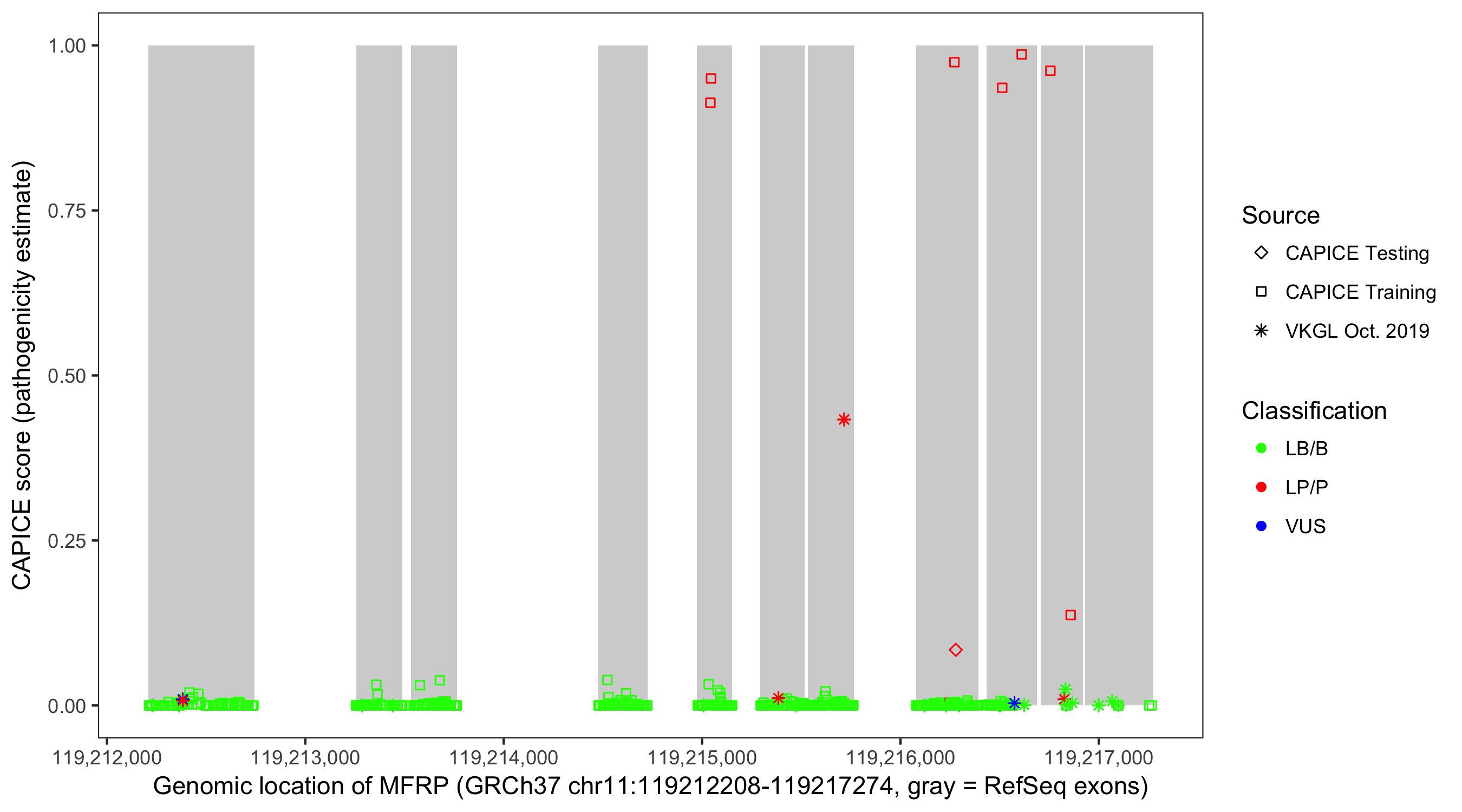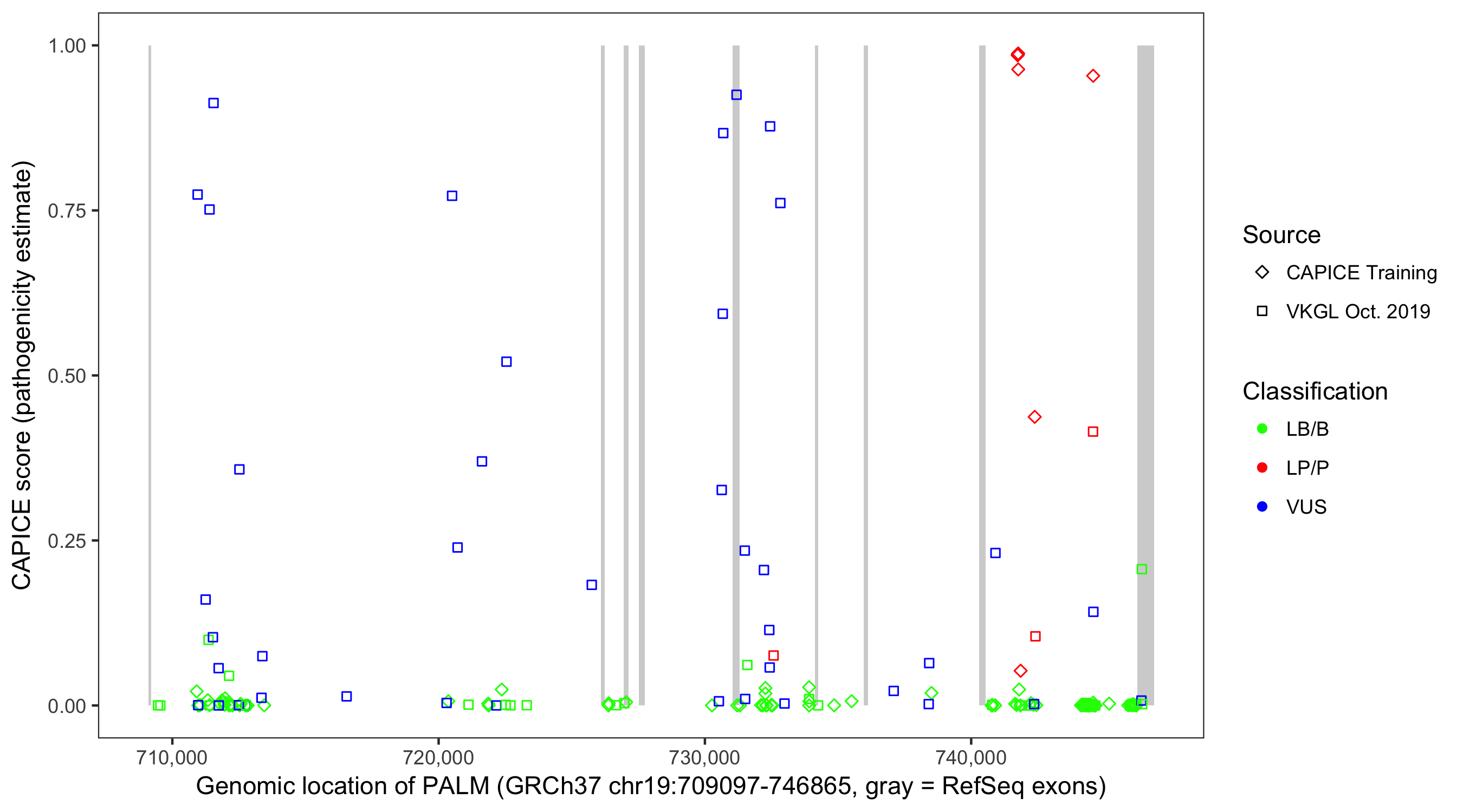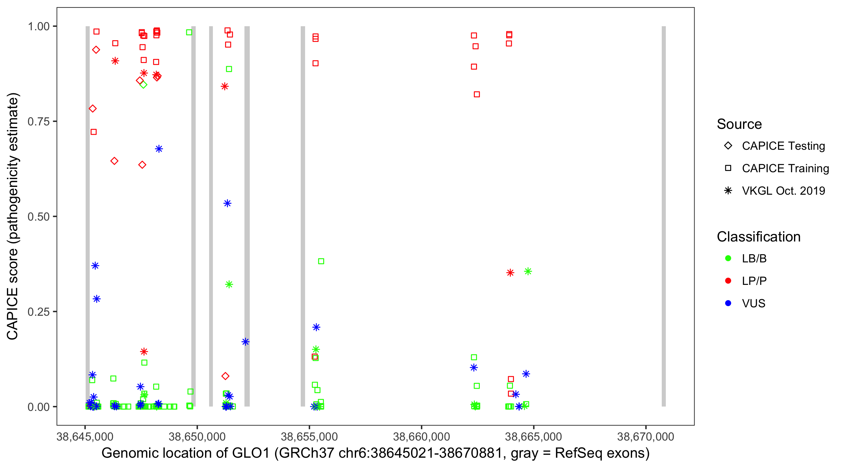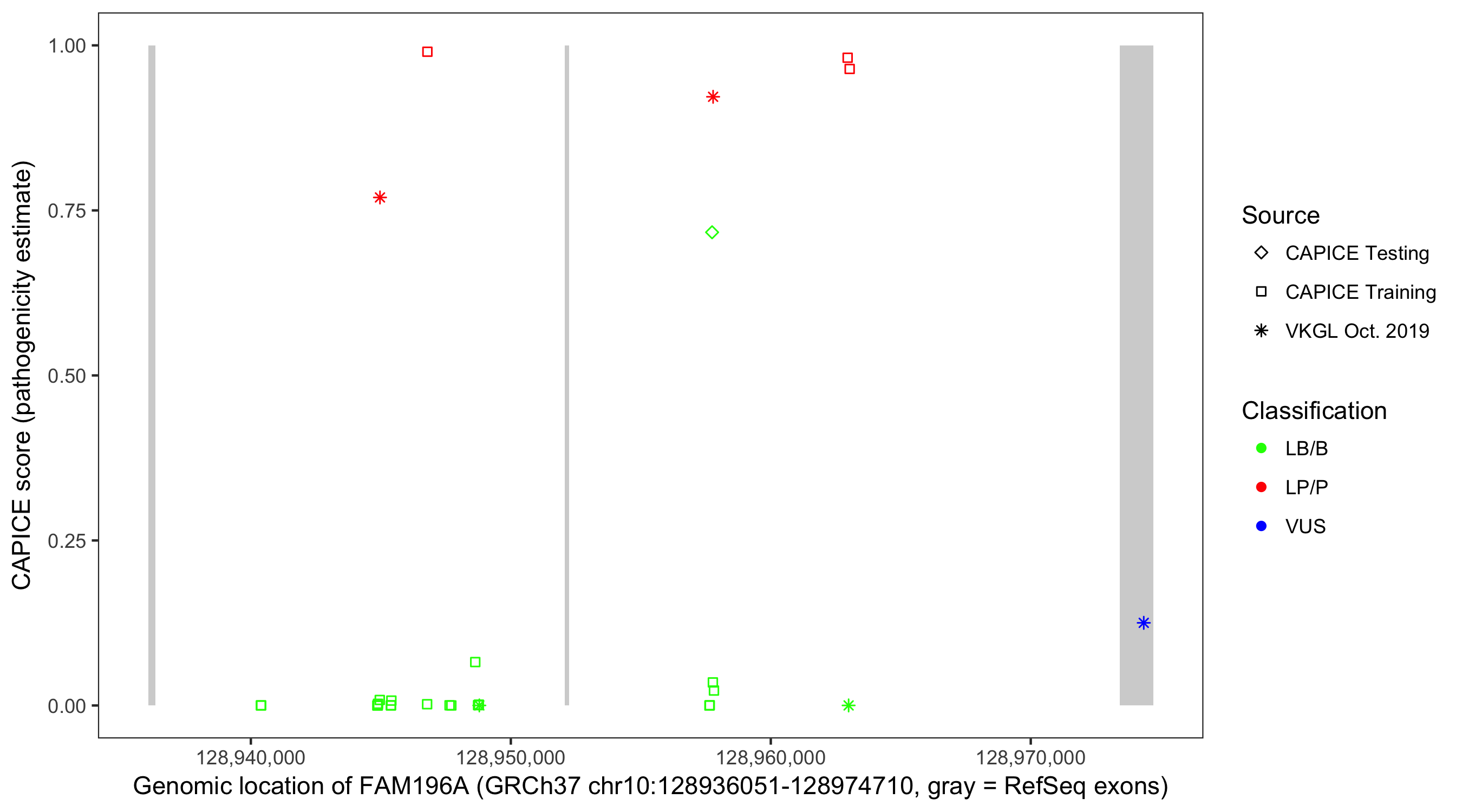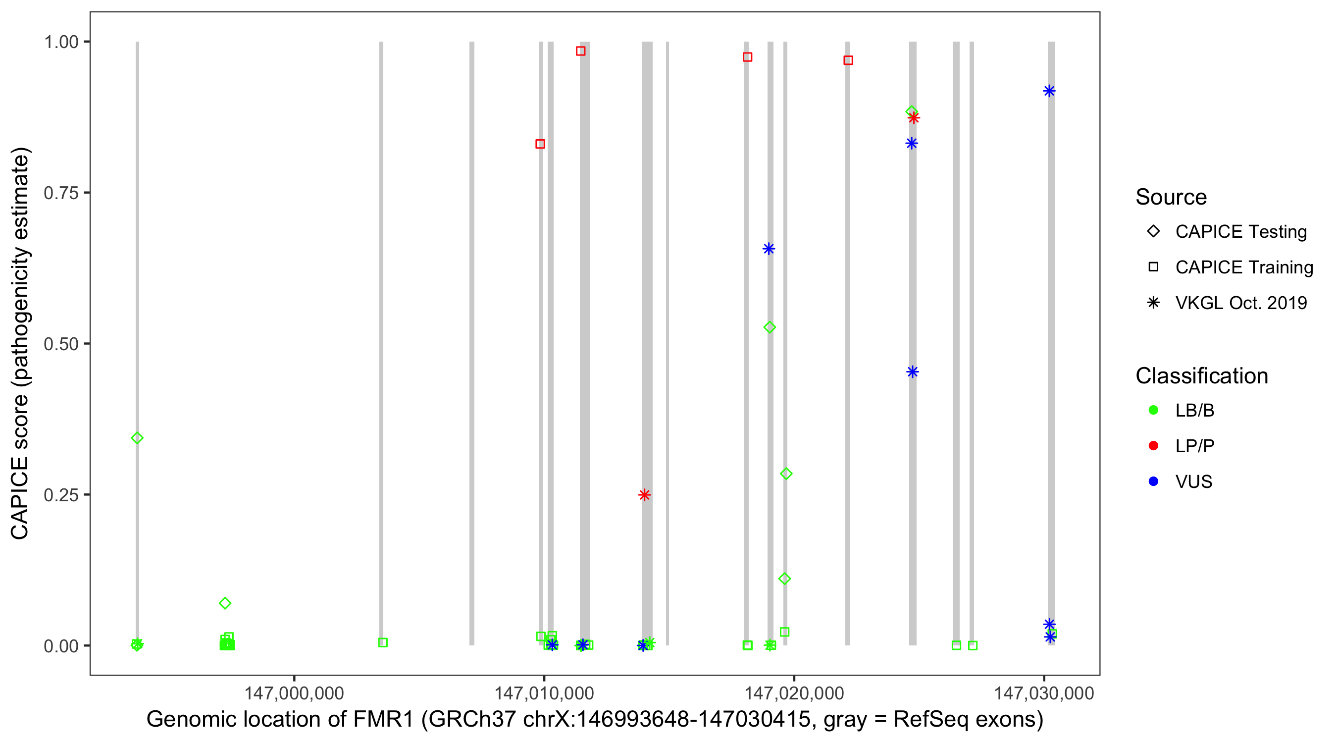 Shown are CAPICE train/test variants plus VKGL Oct 2019.