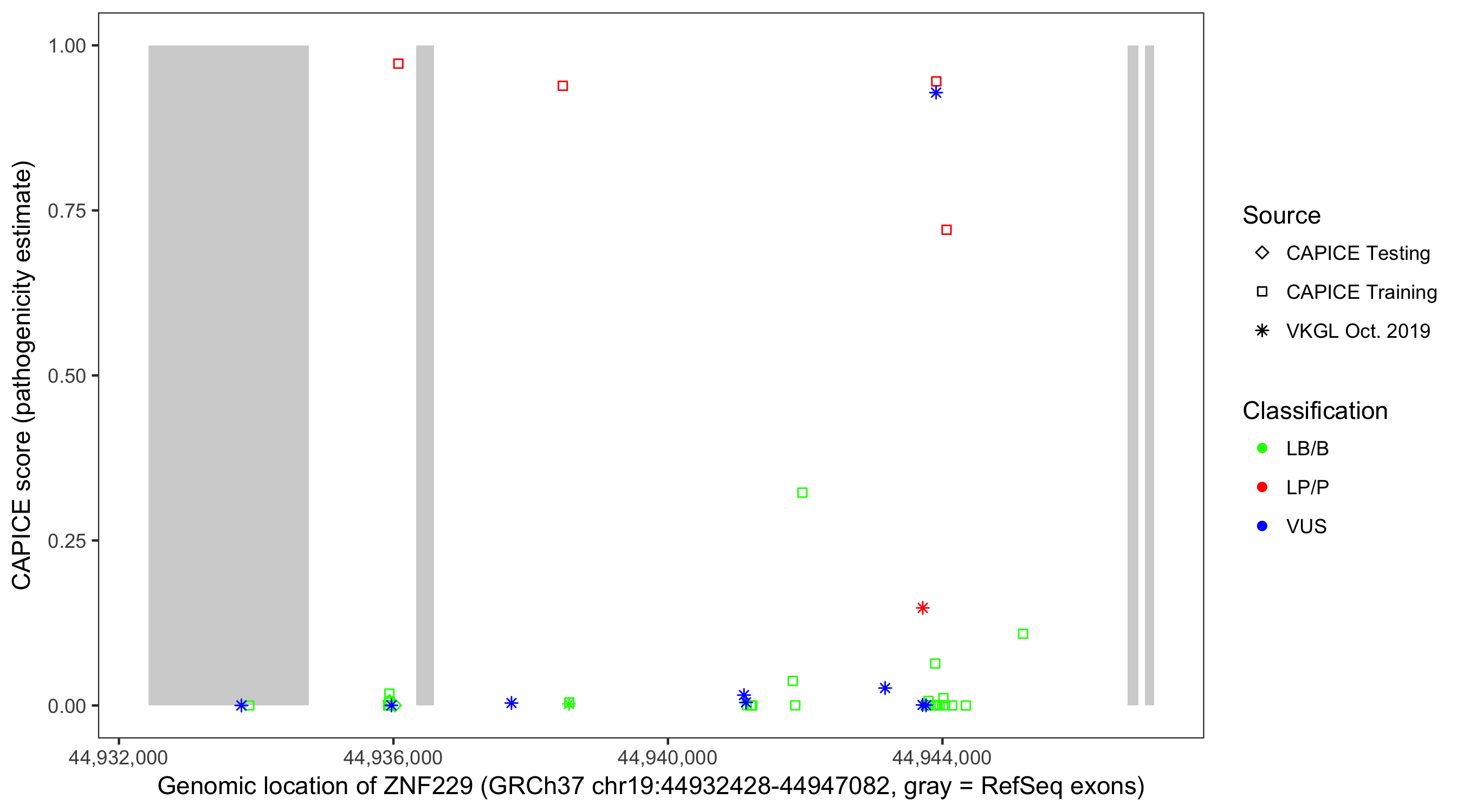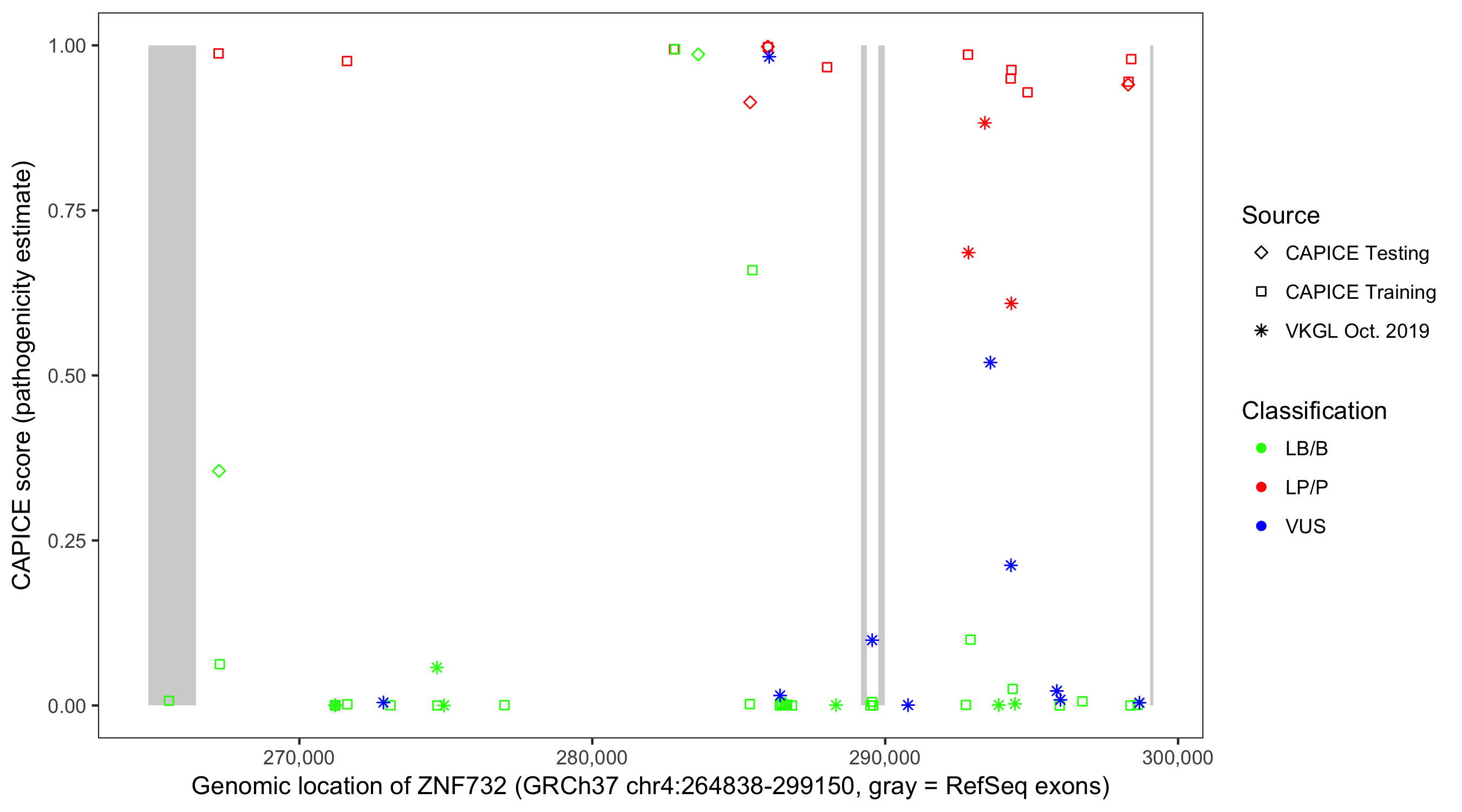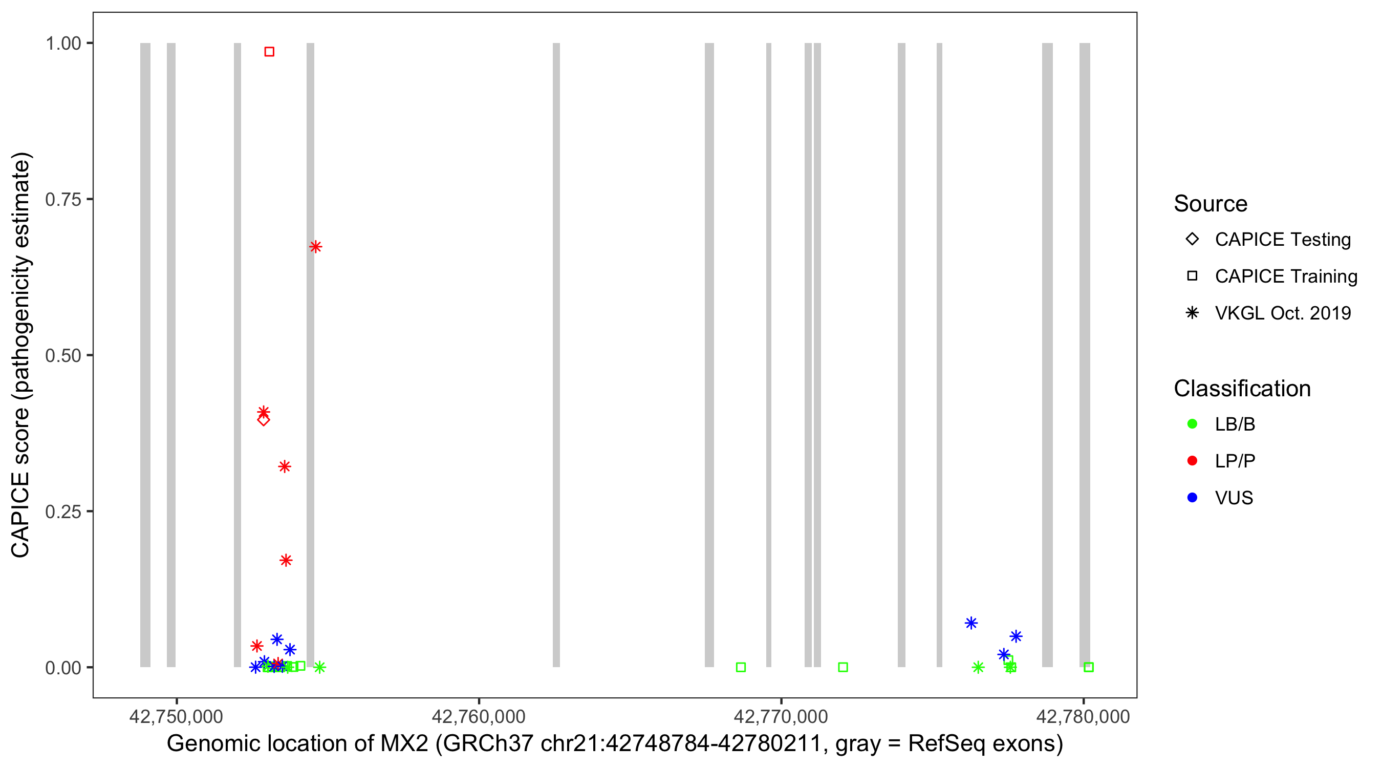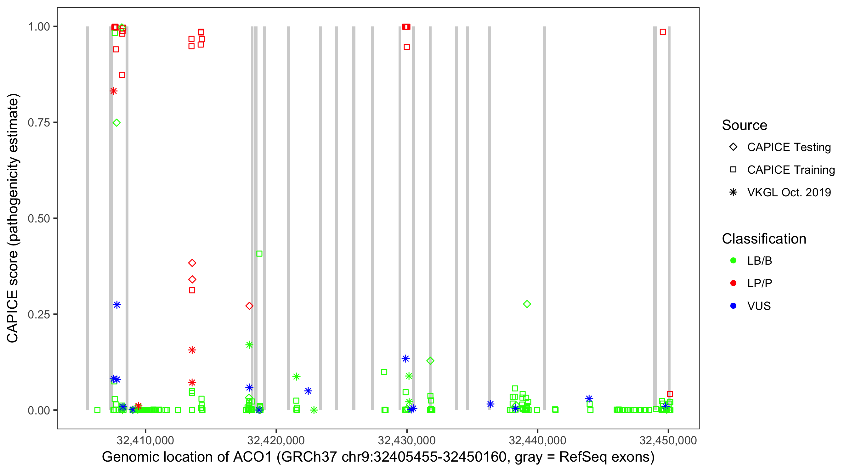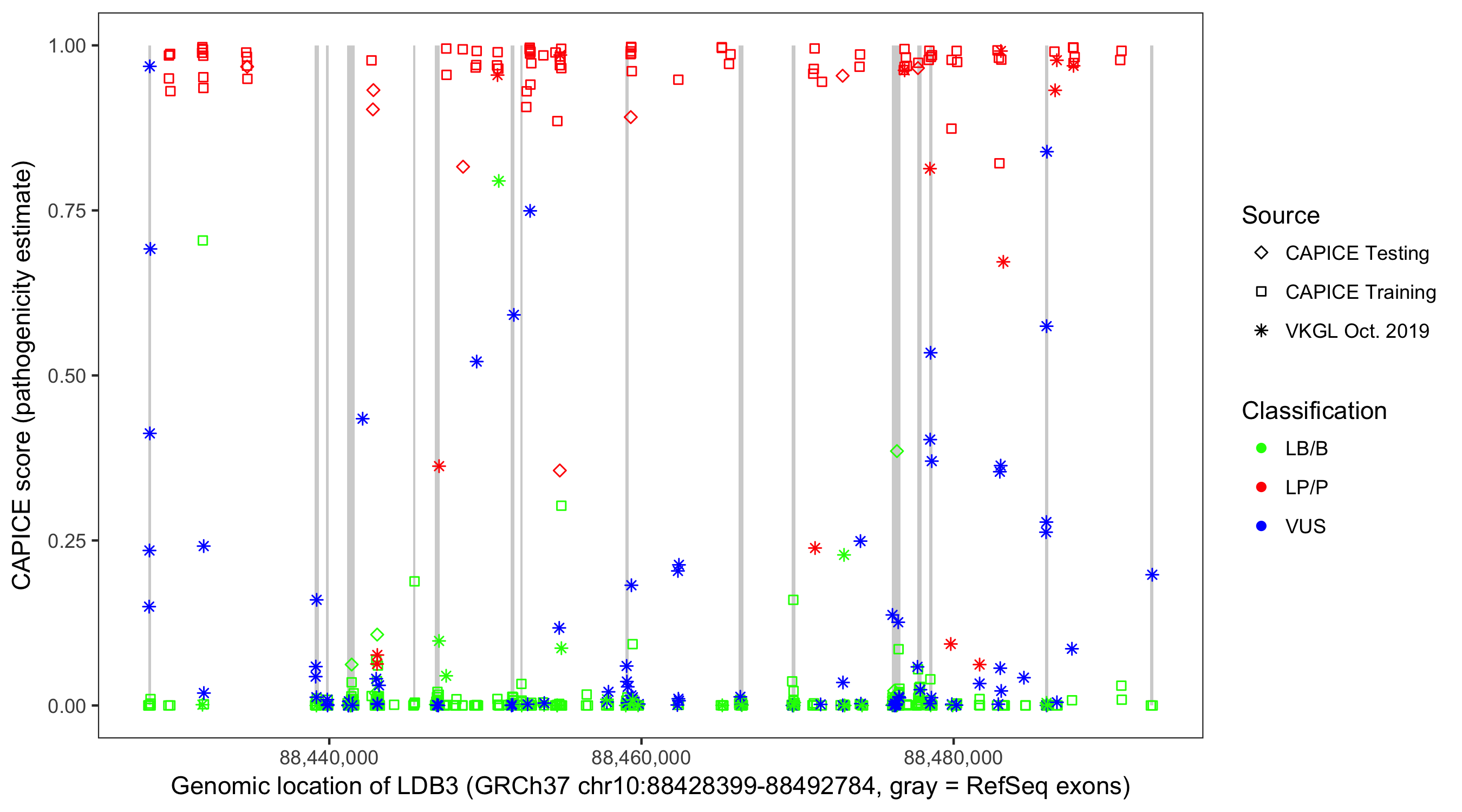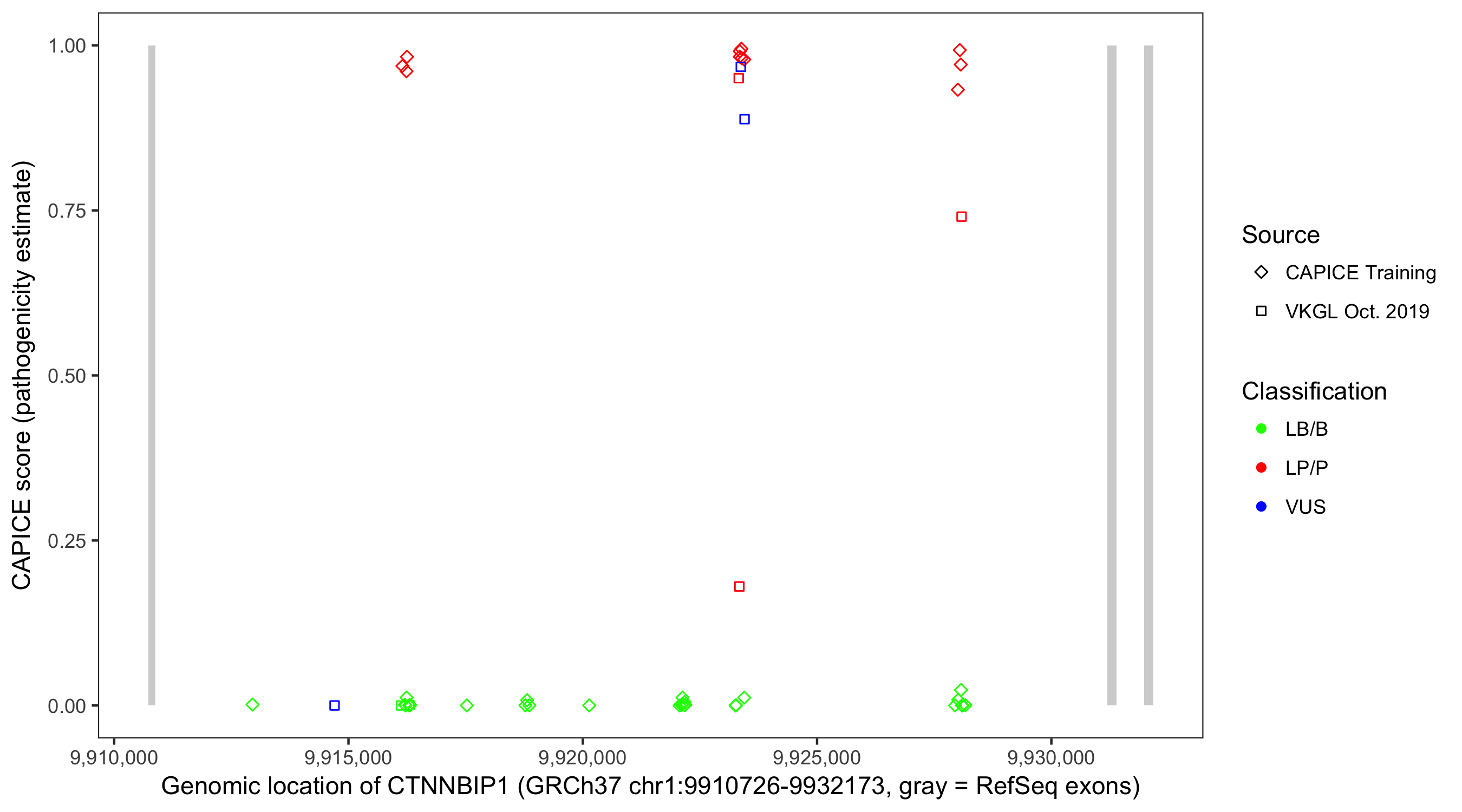Shown are CAPICE train/test variants plus VKGL Oct 2019.