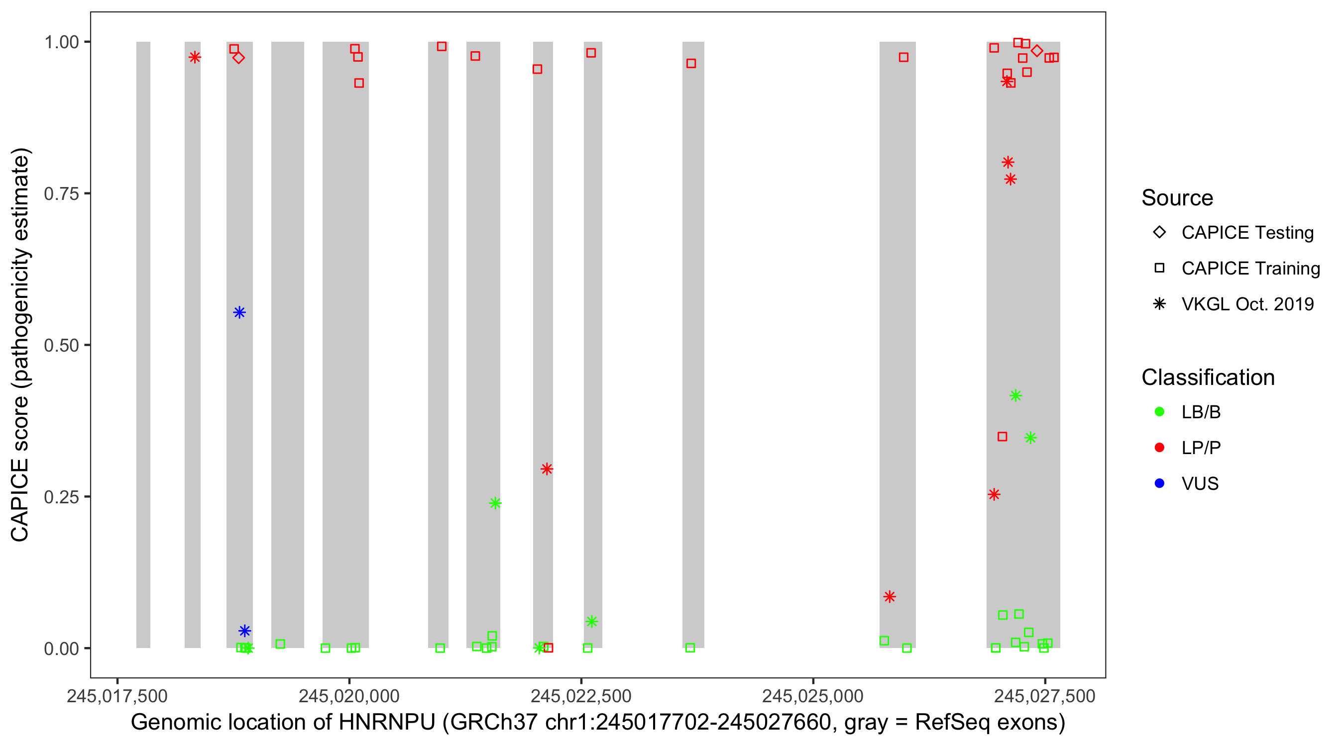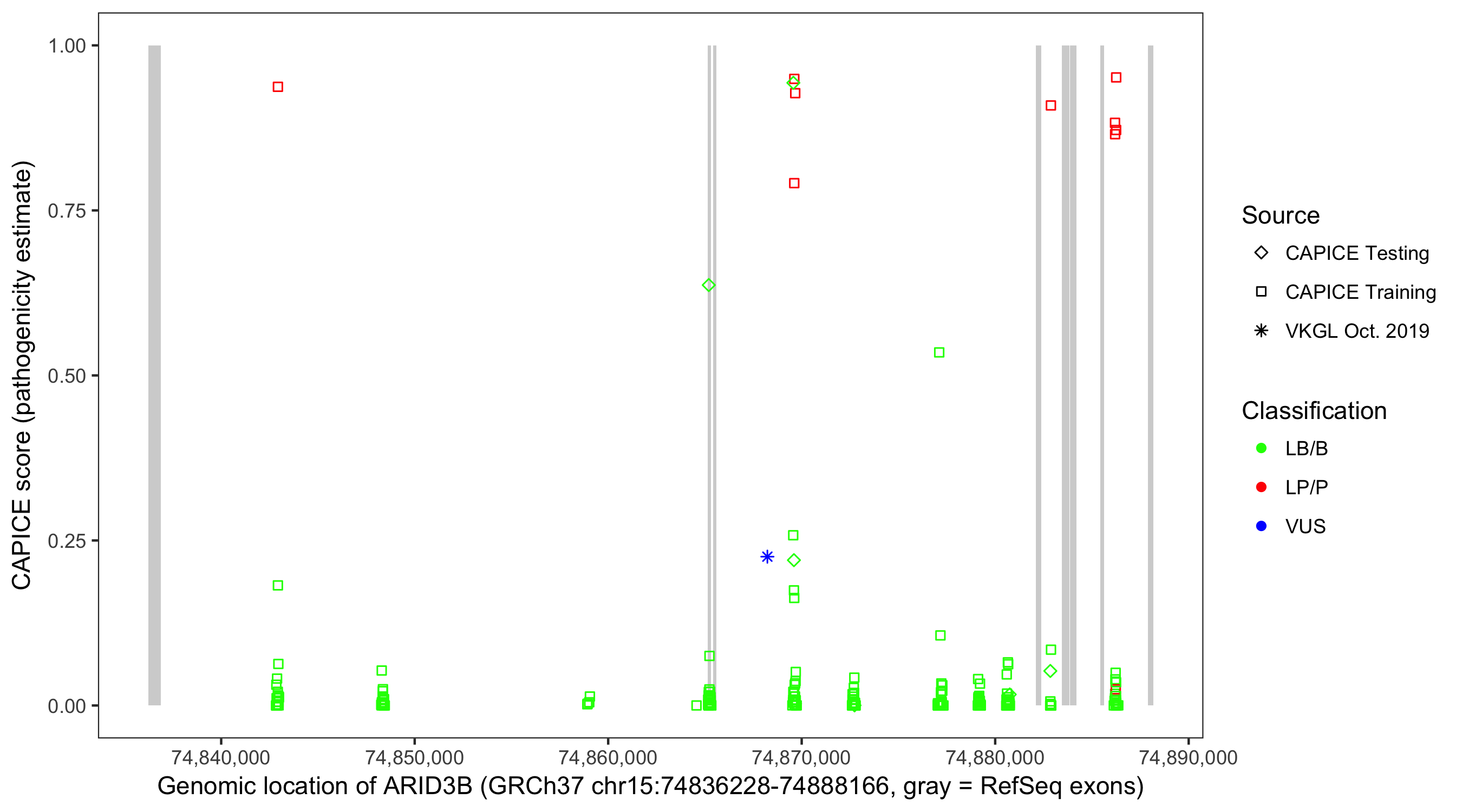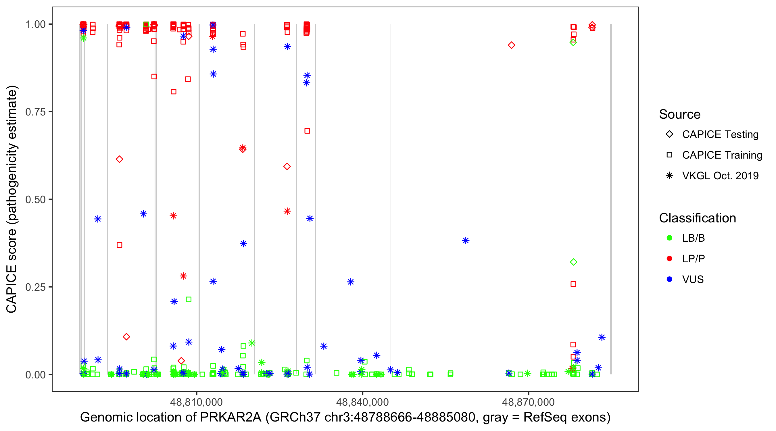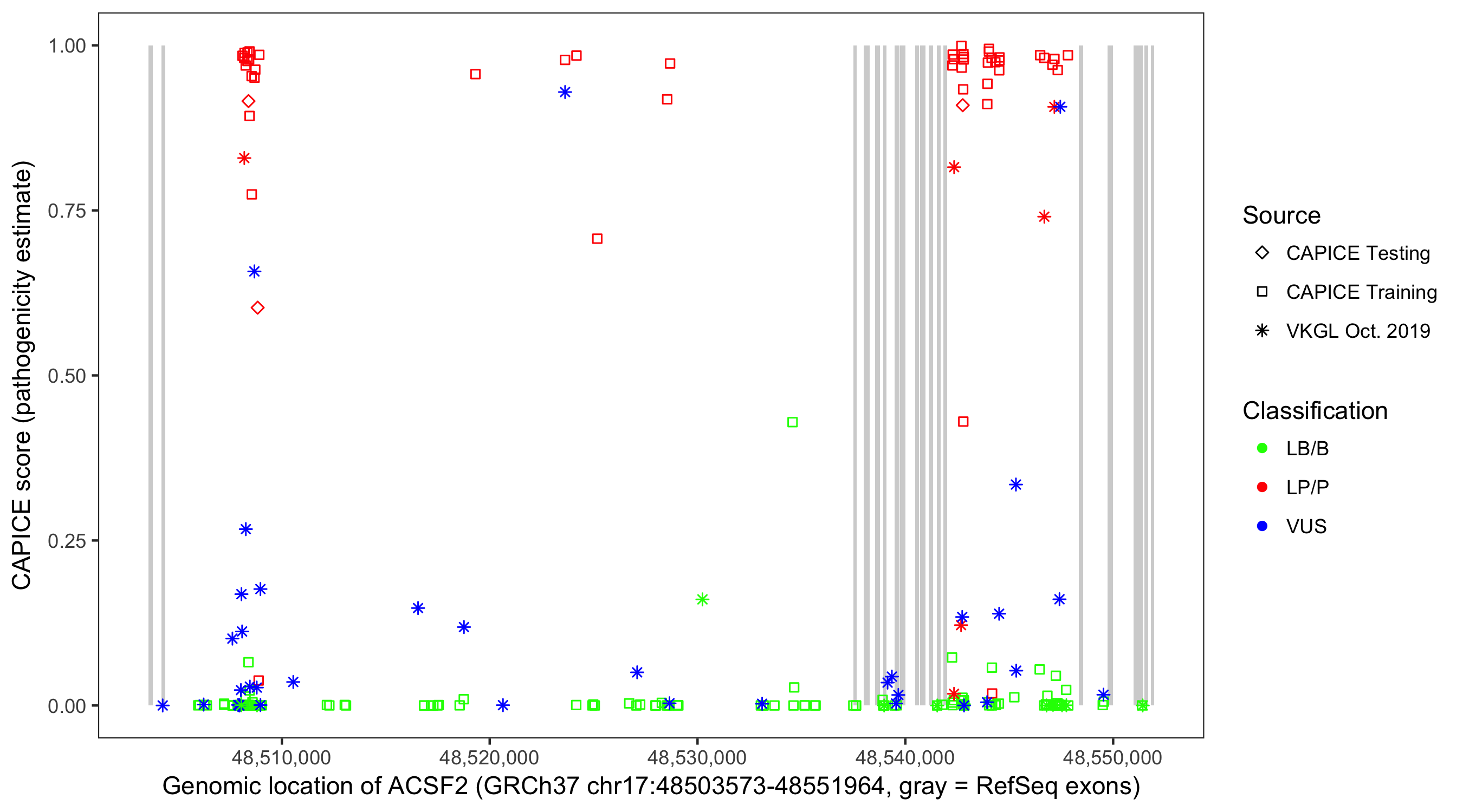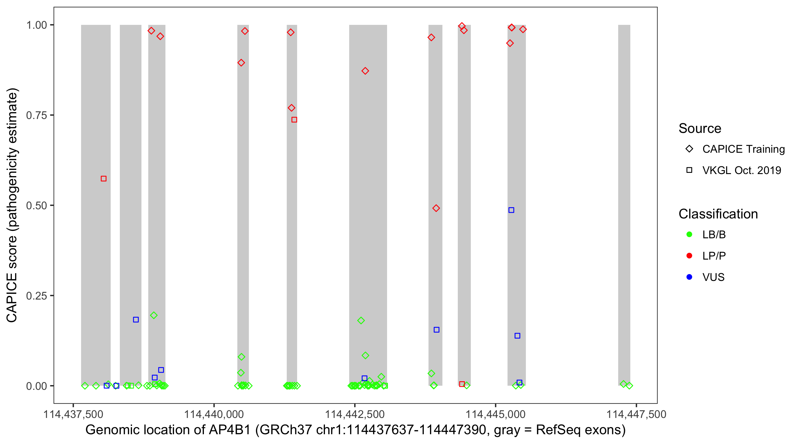 Shown are CAPICE train/test variants plus VKGL Oct 2019.