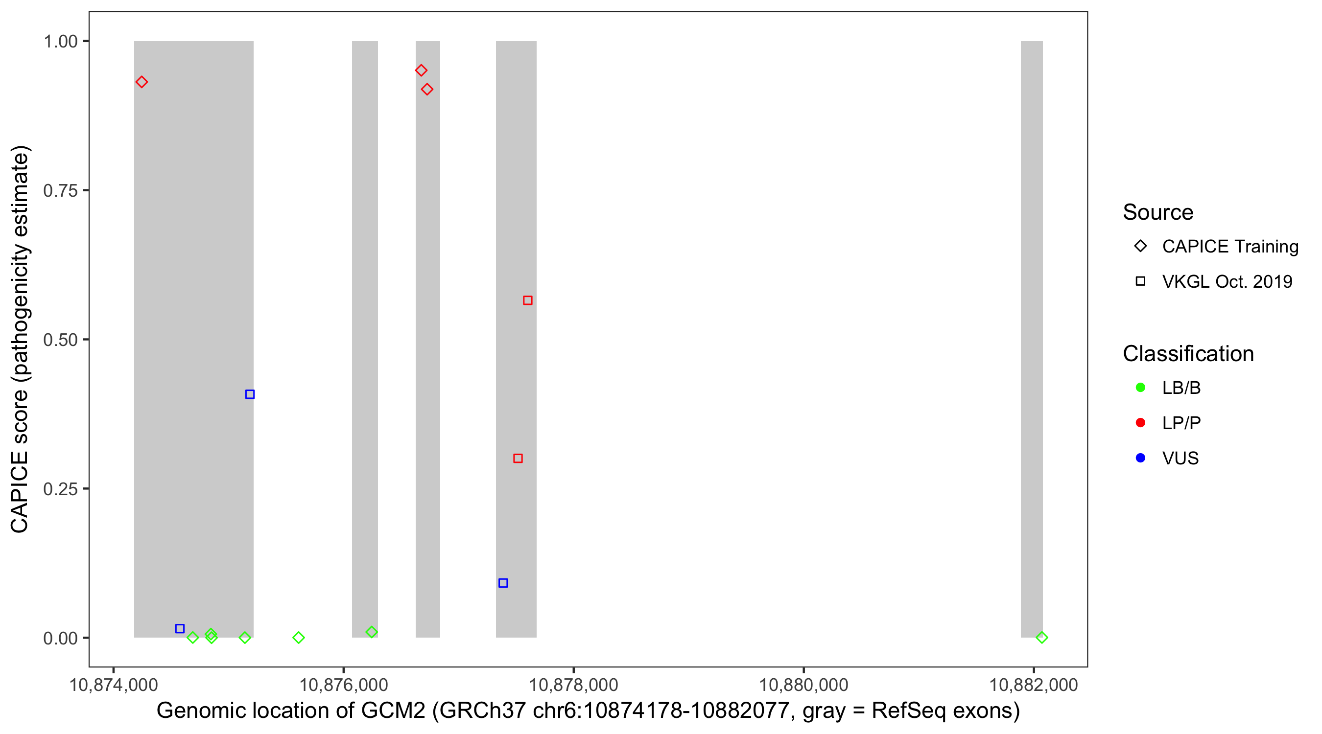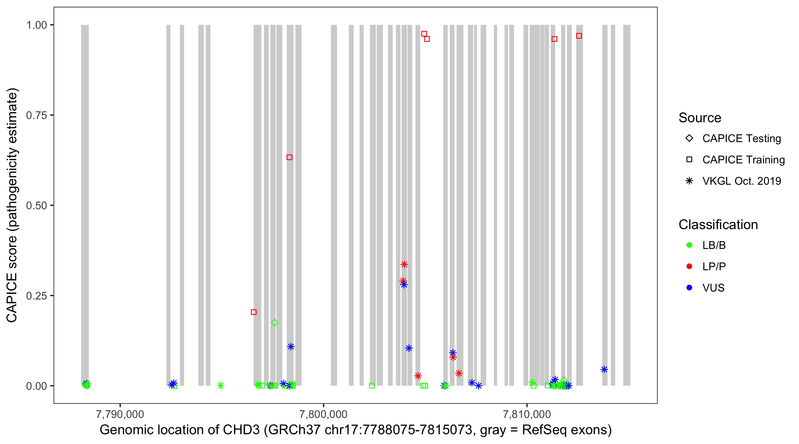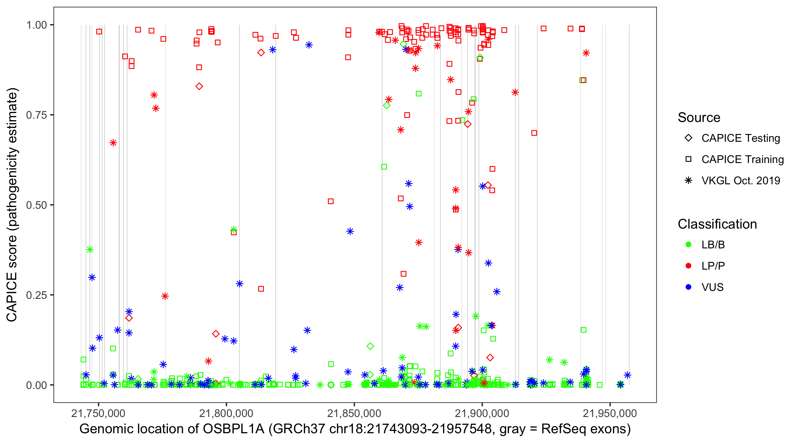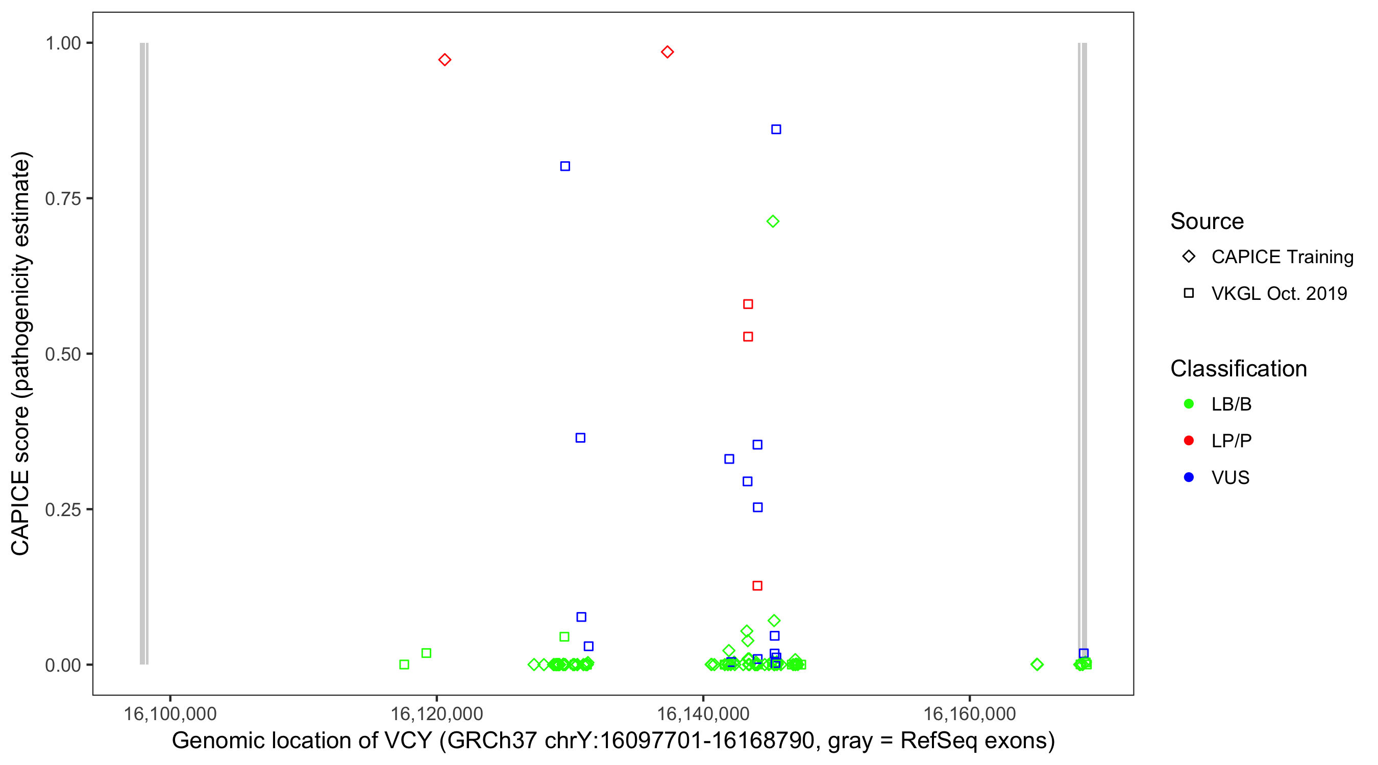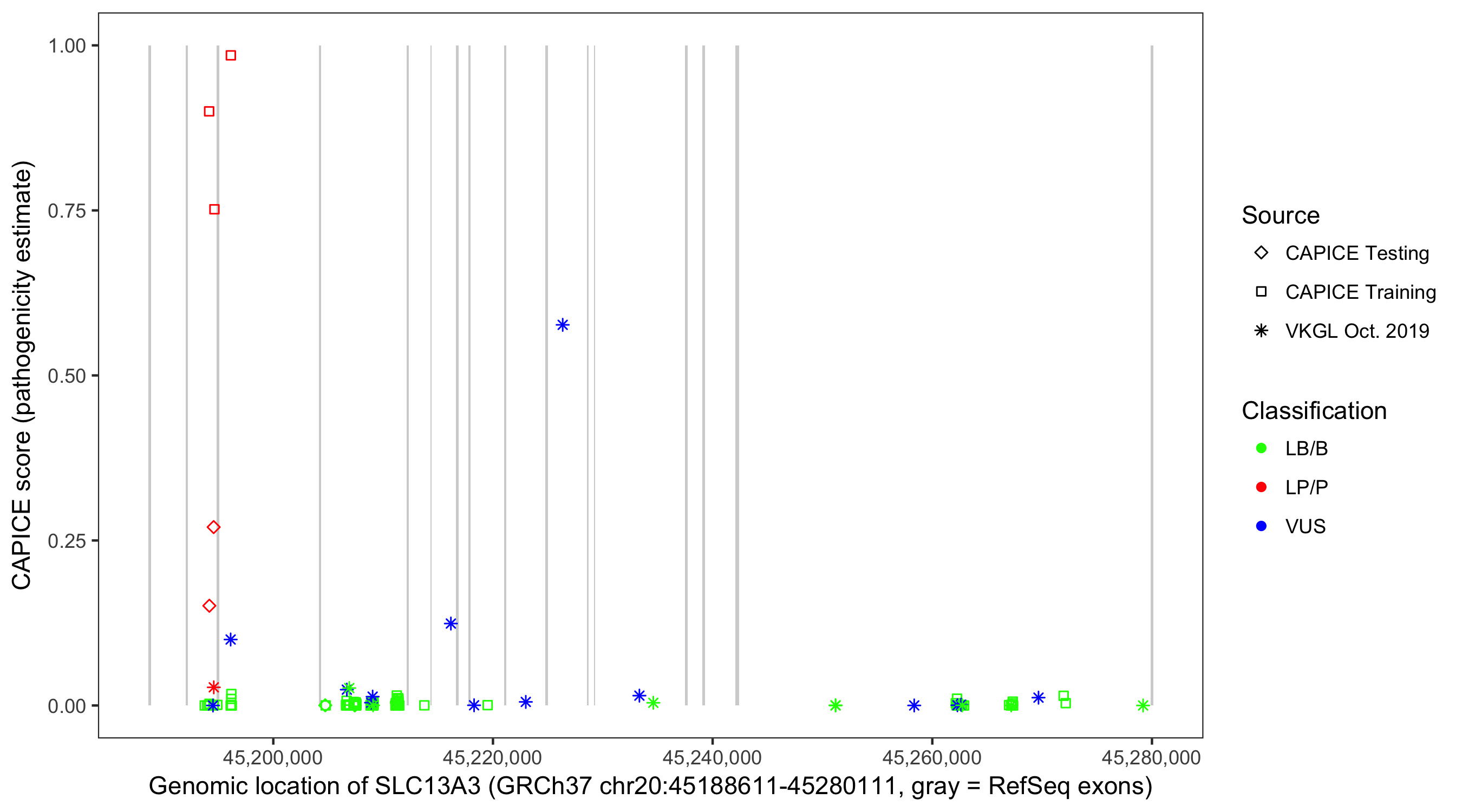 Shown are CAPICE train/test variants plus VKGL Oct 2019.