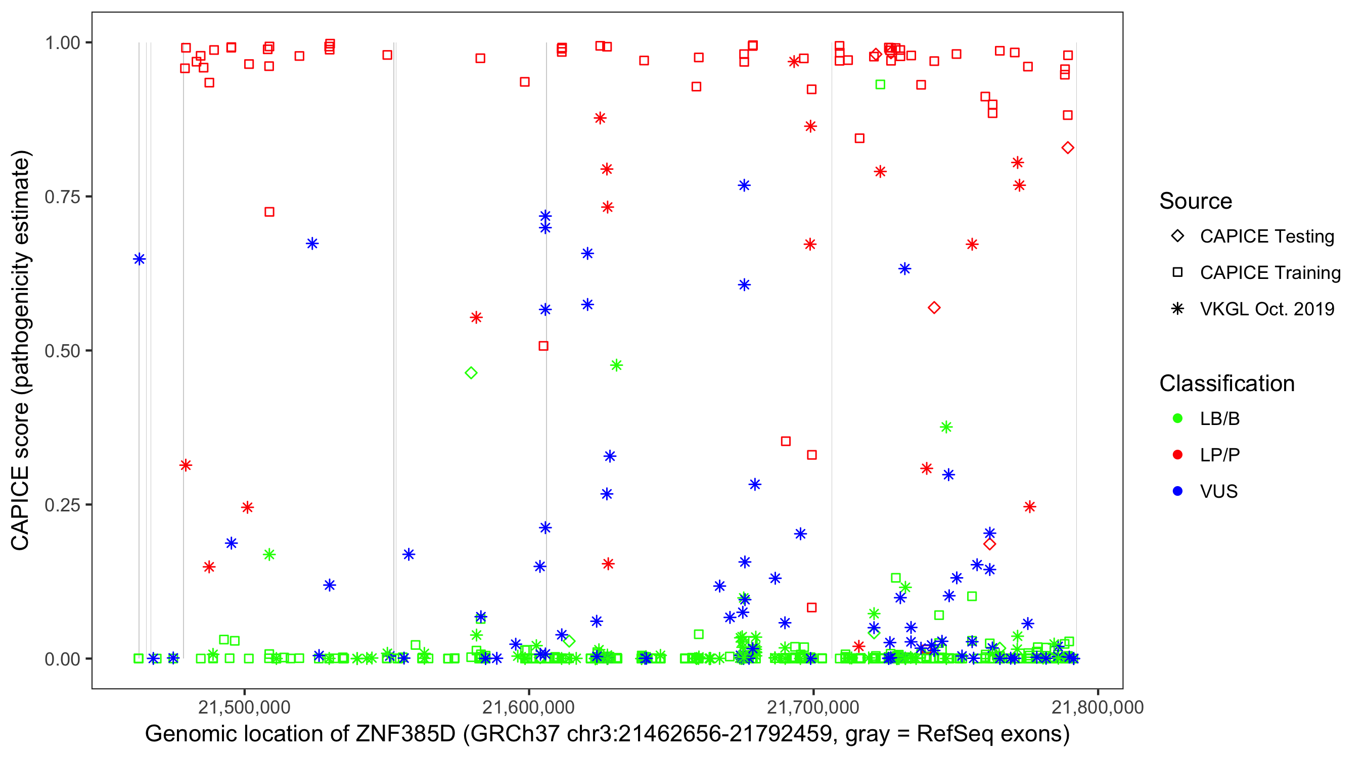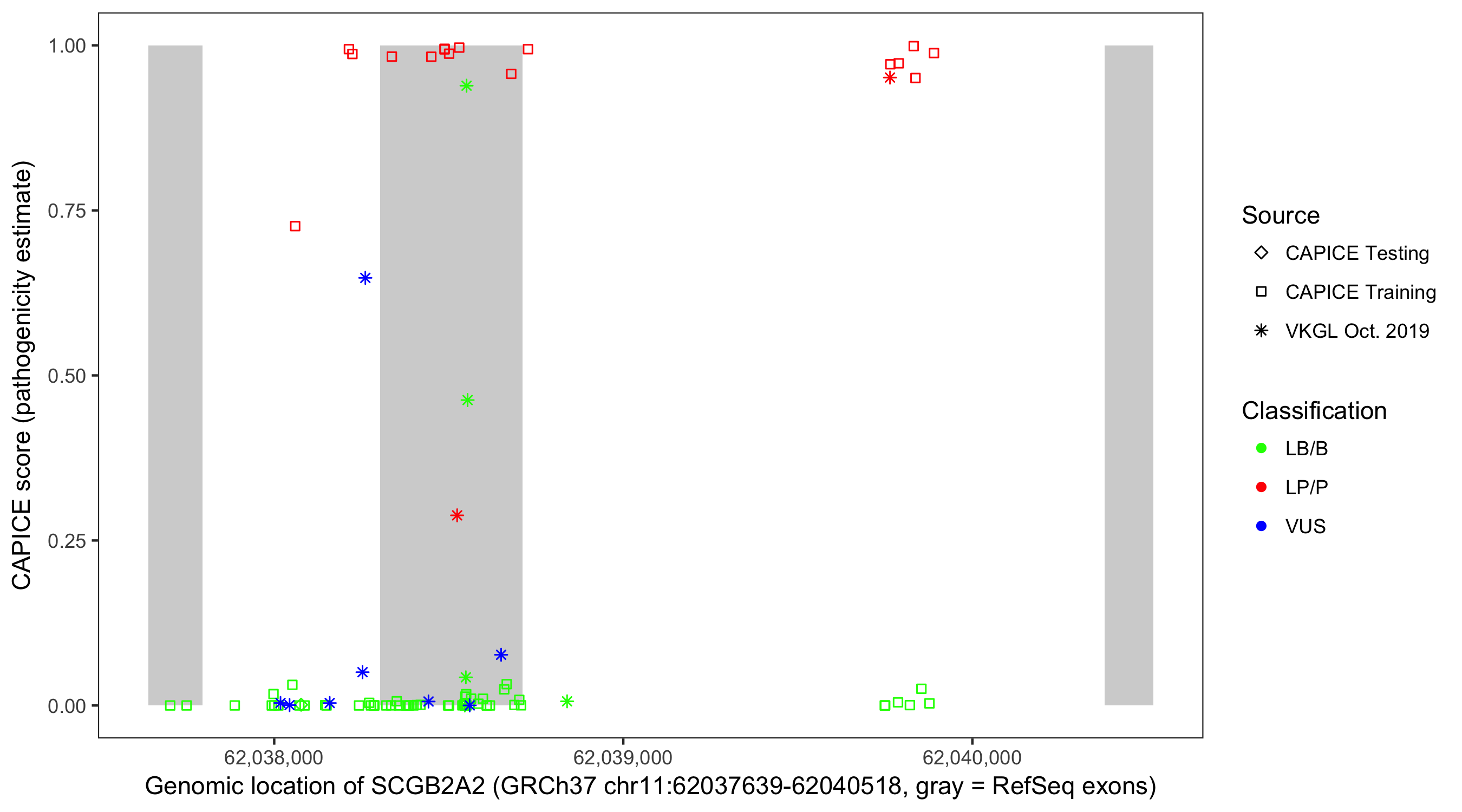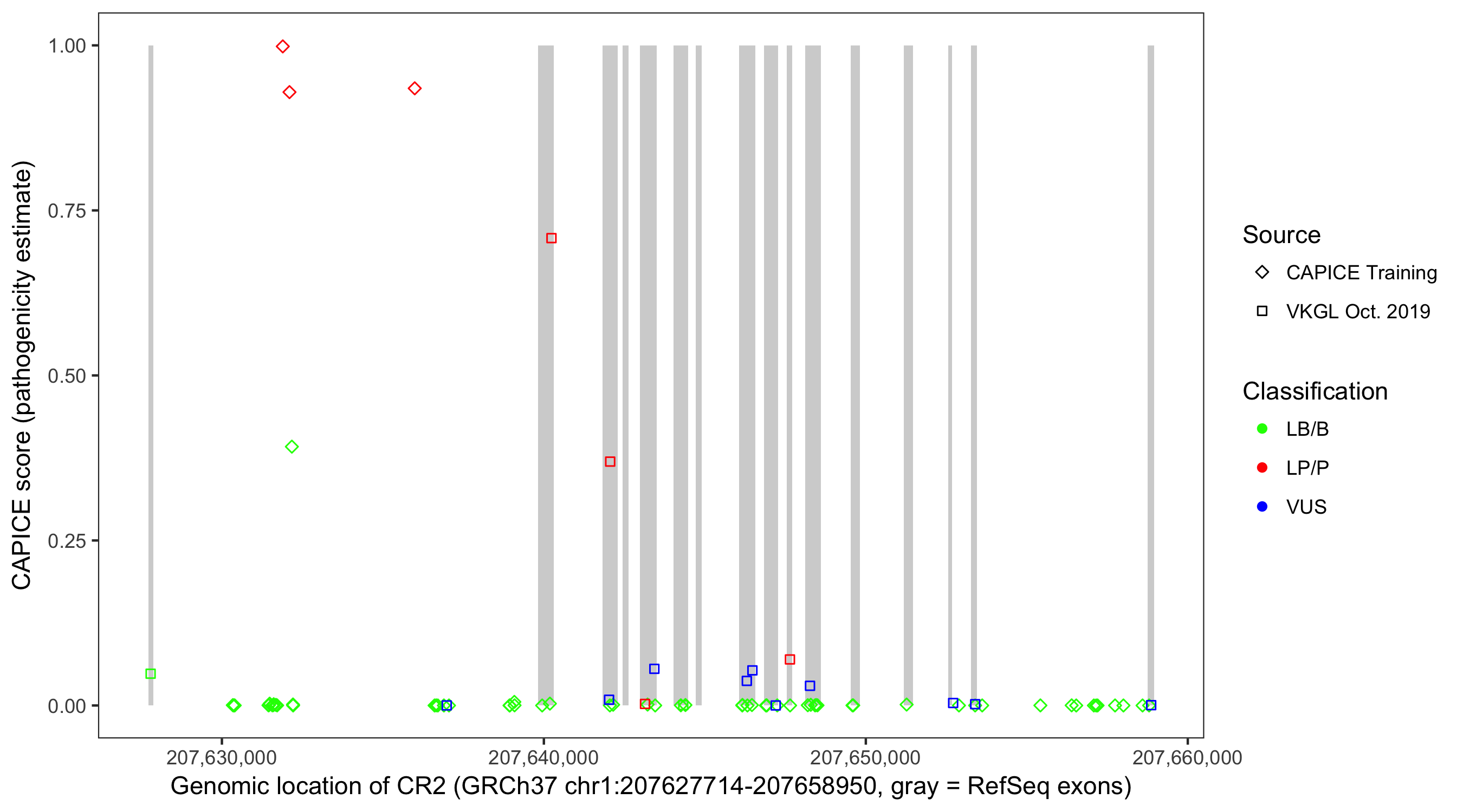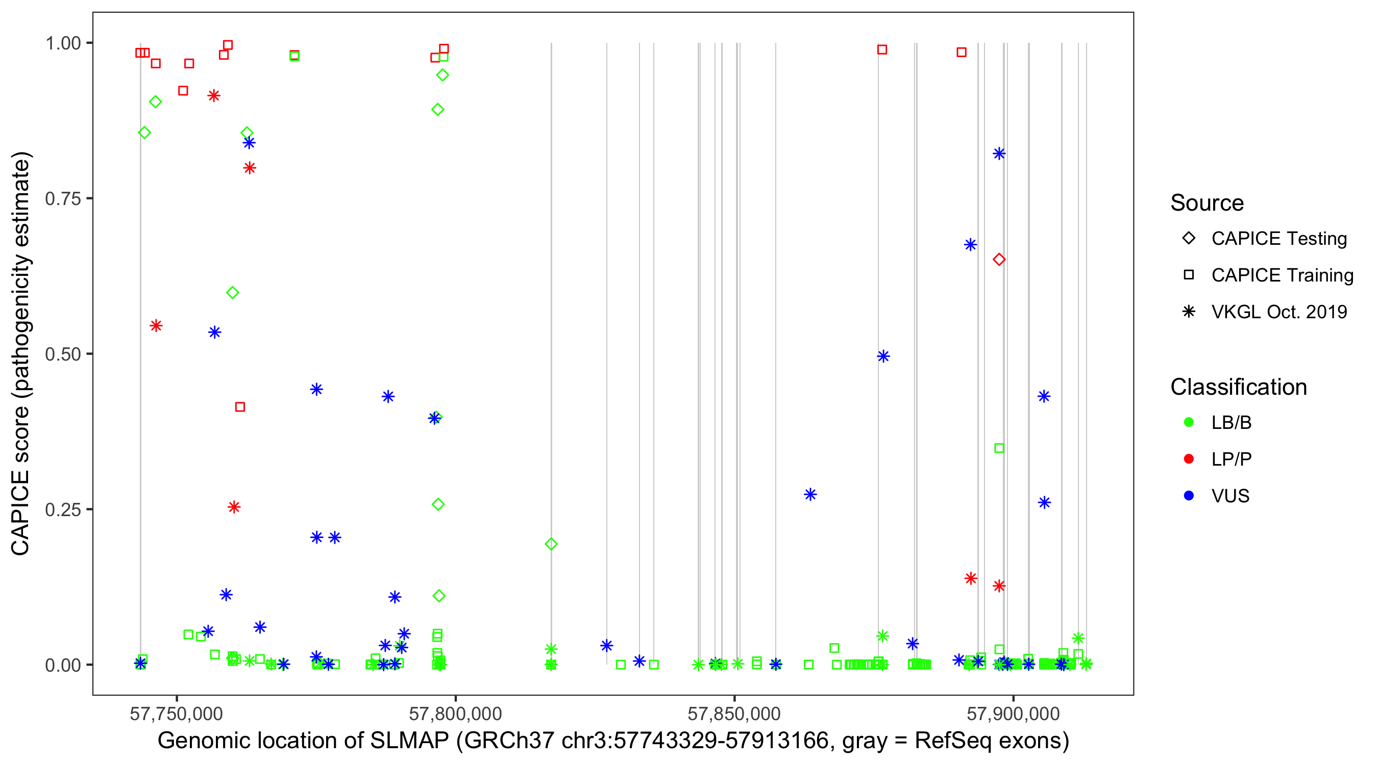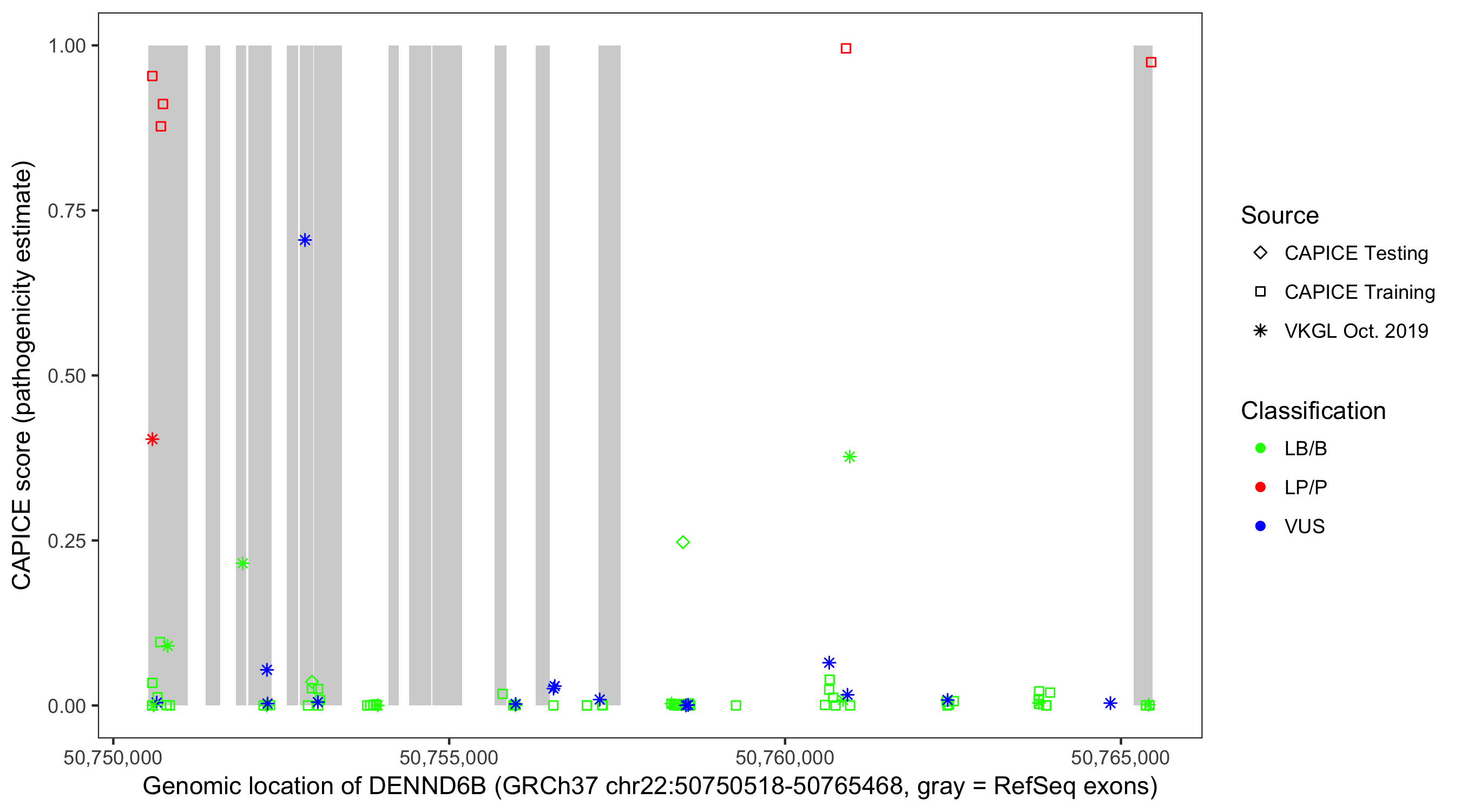 Shown are CAPICE train/test variants plus VKGL Oct 2019.