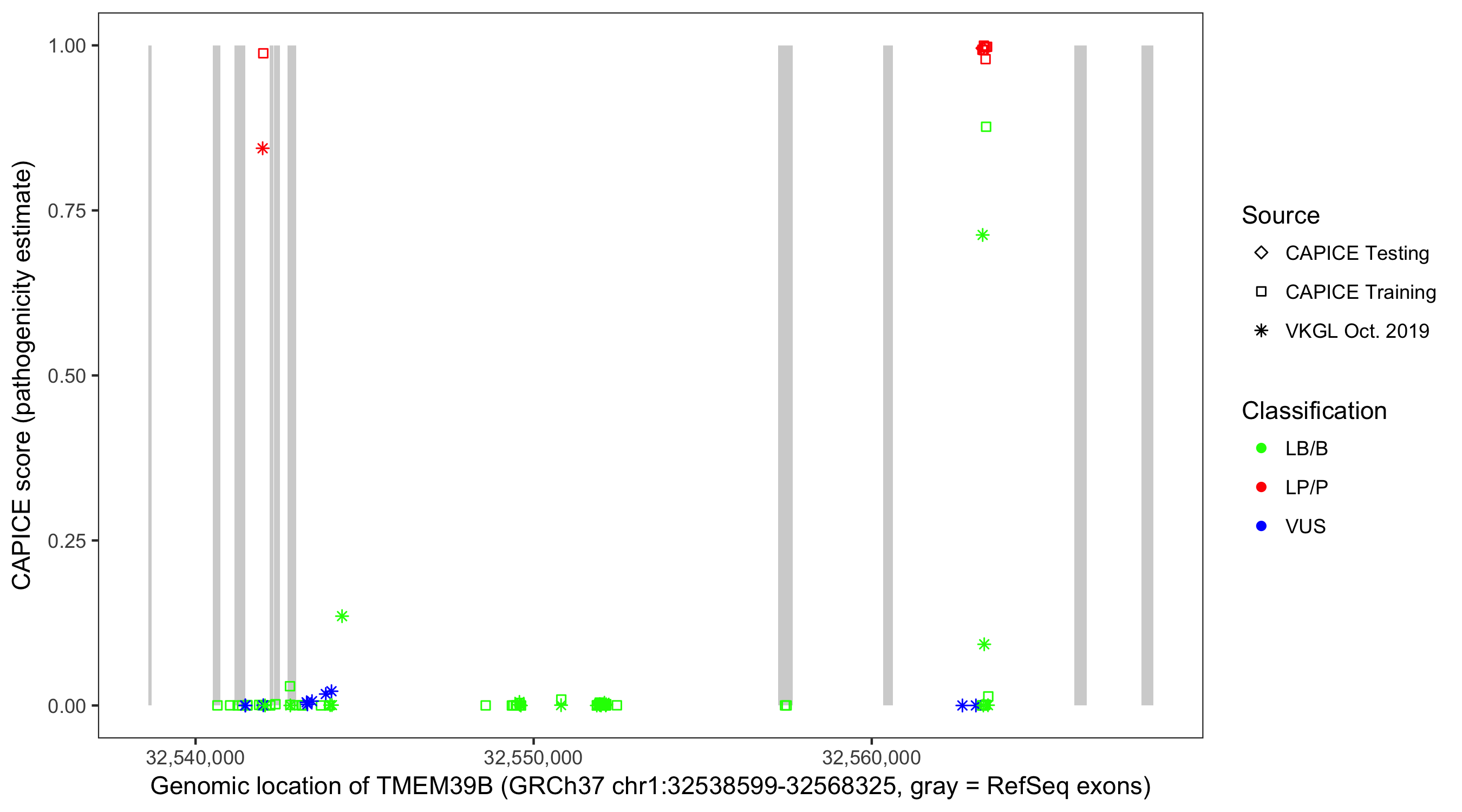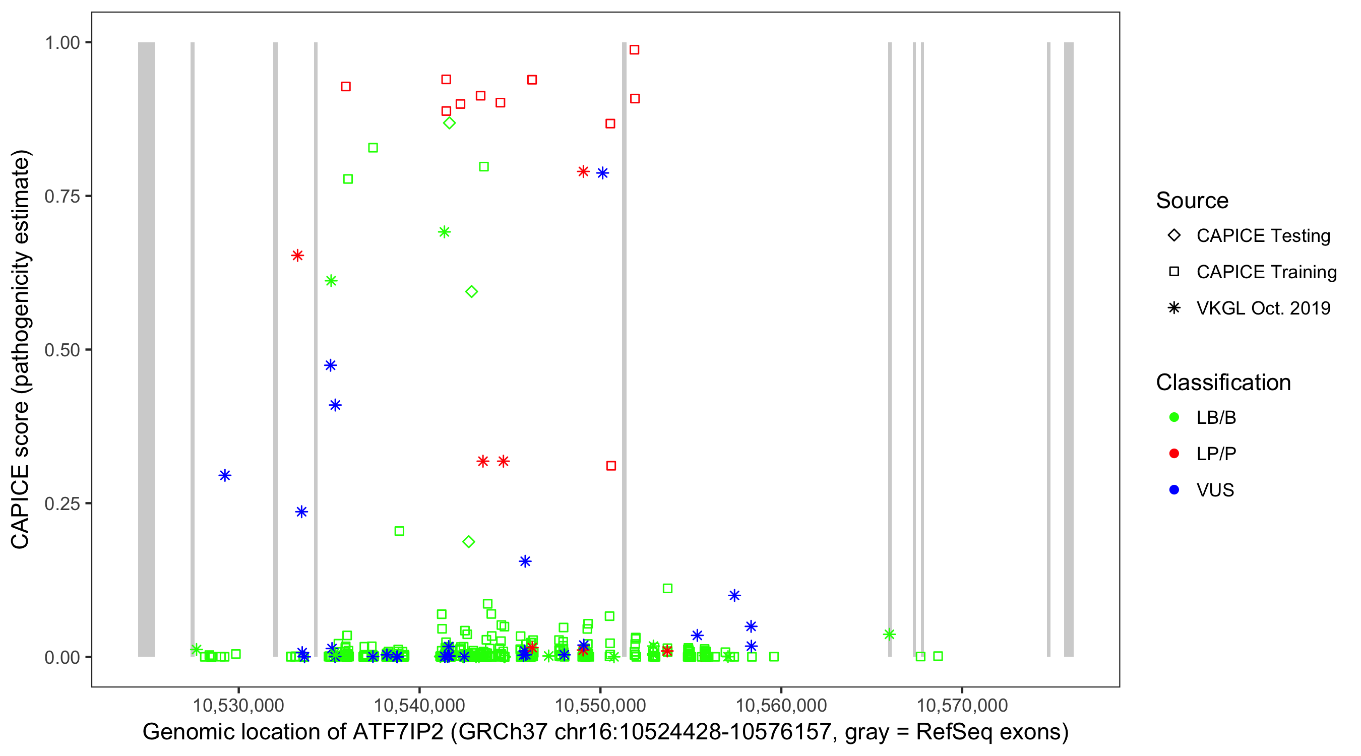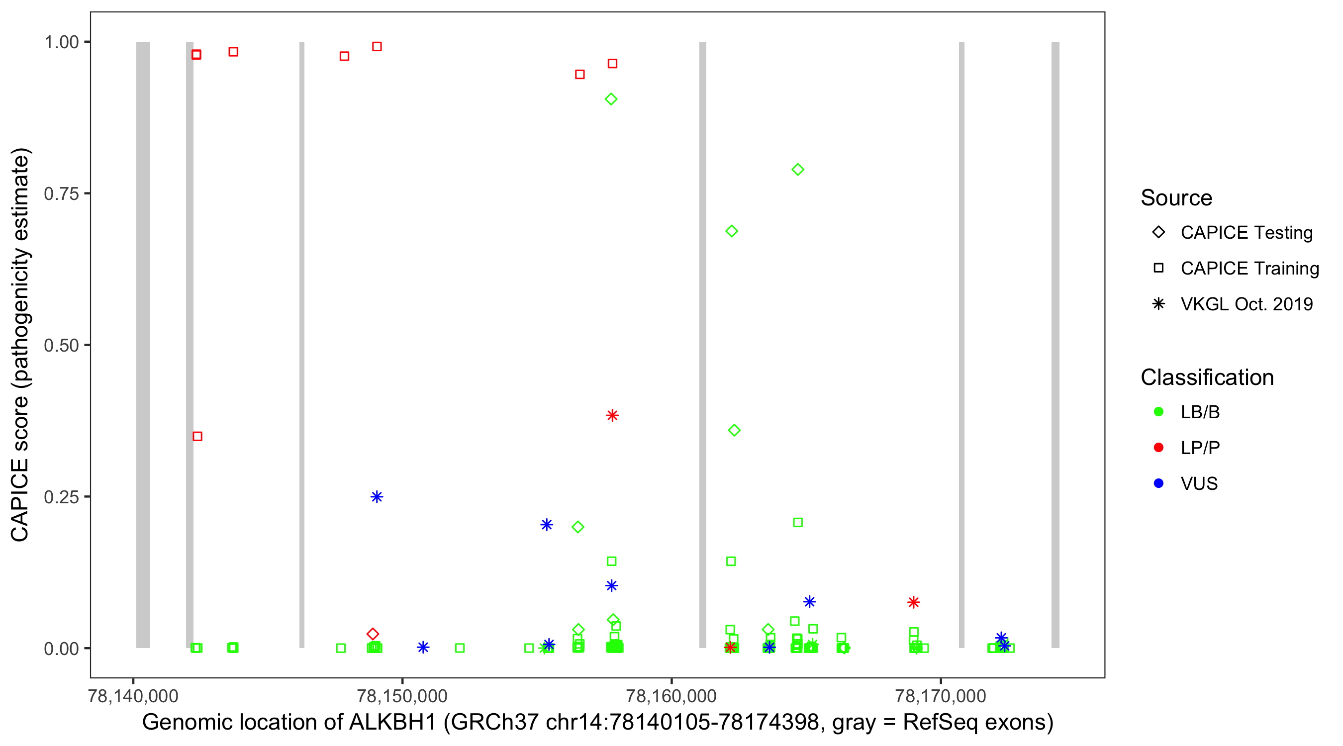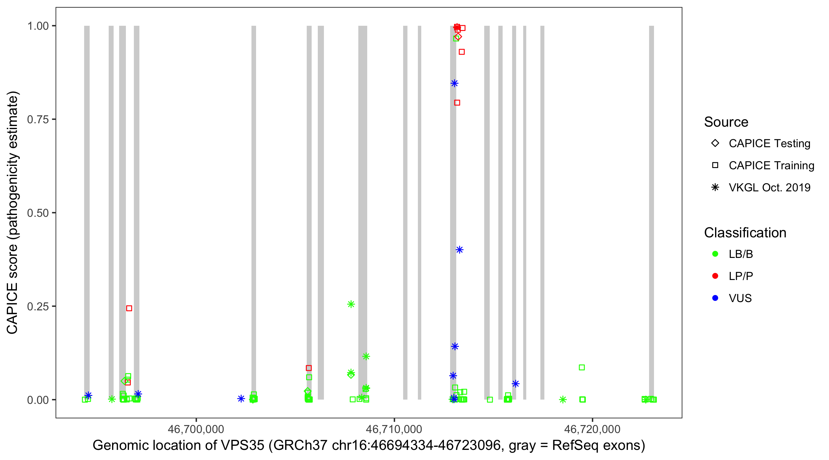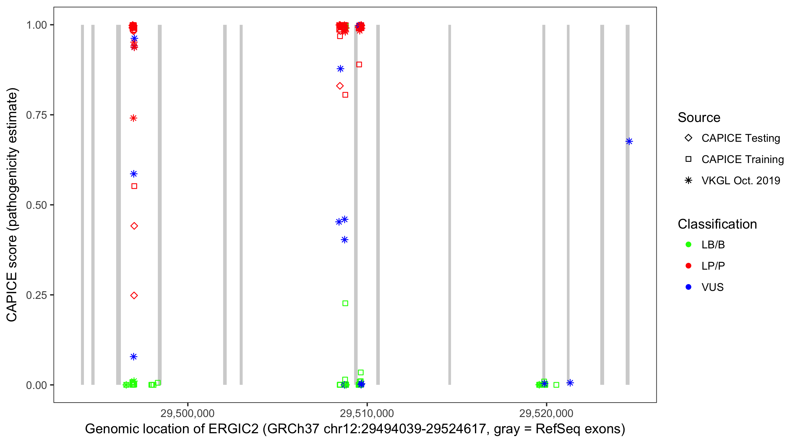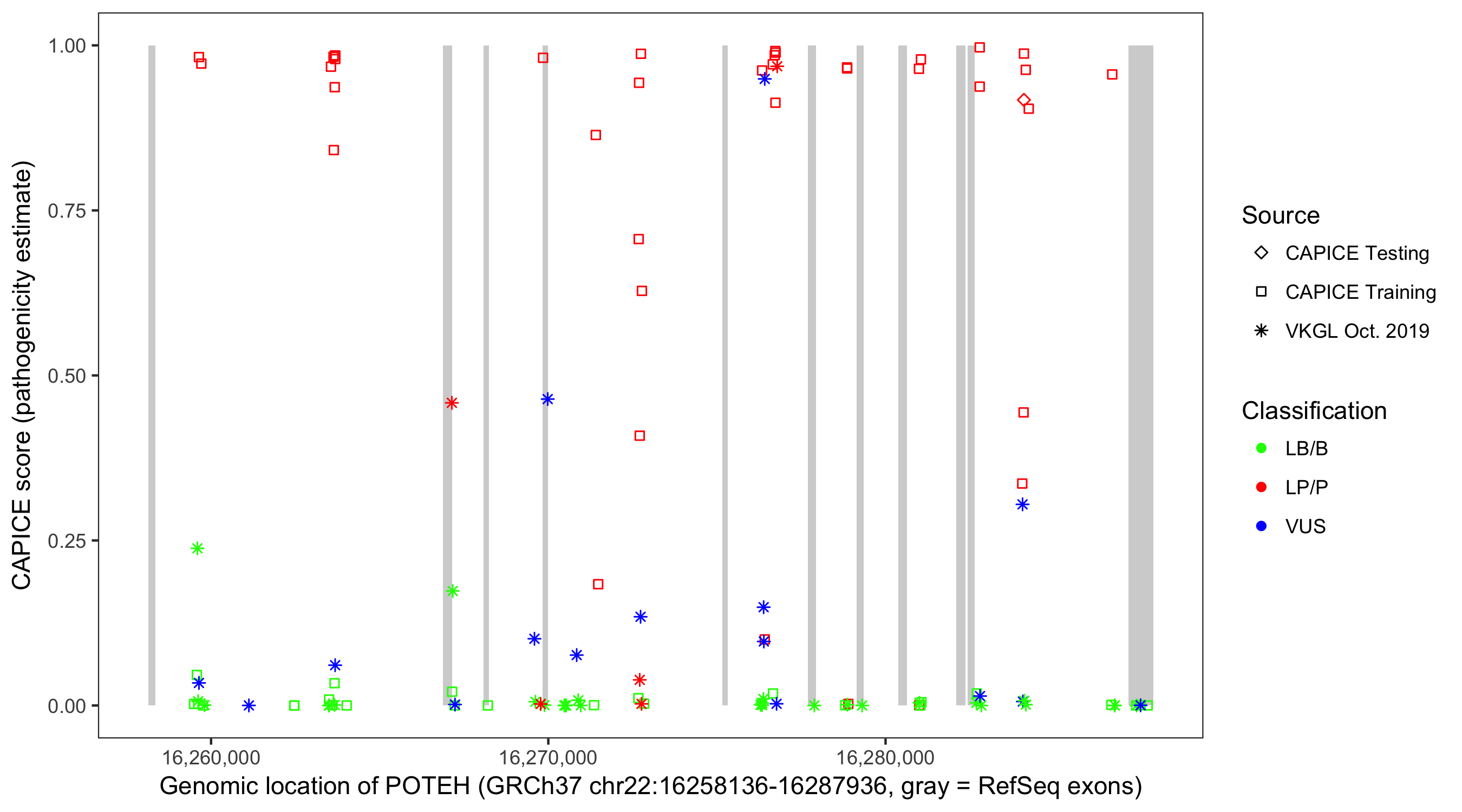 Shown are CAPICE train/test variants plus VKGL Oct 2019.