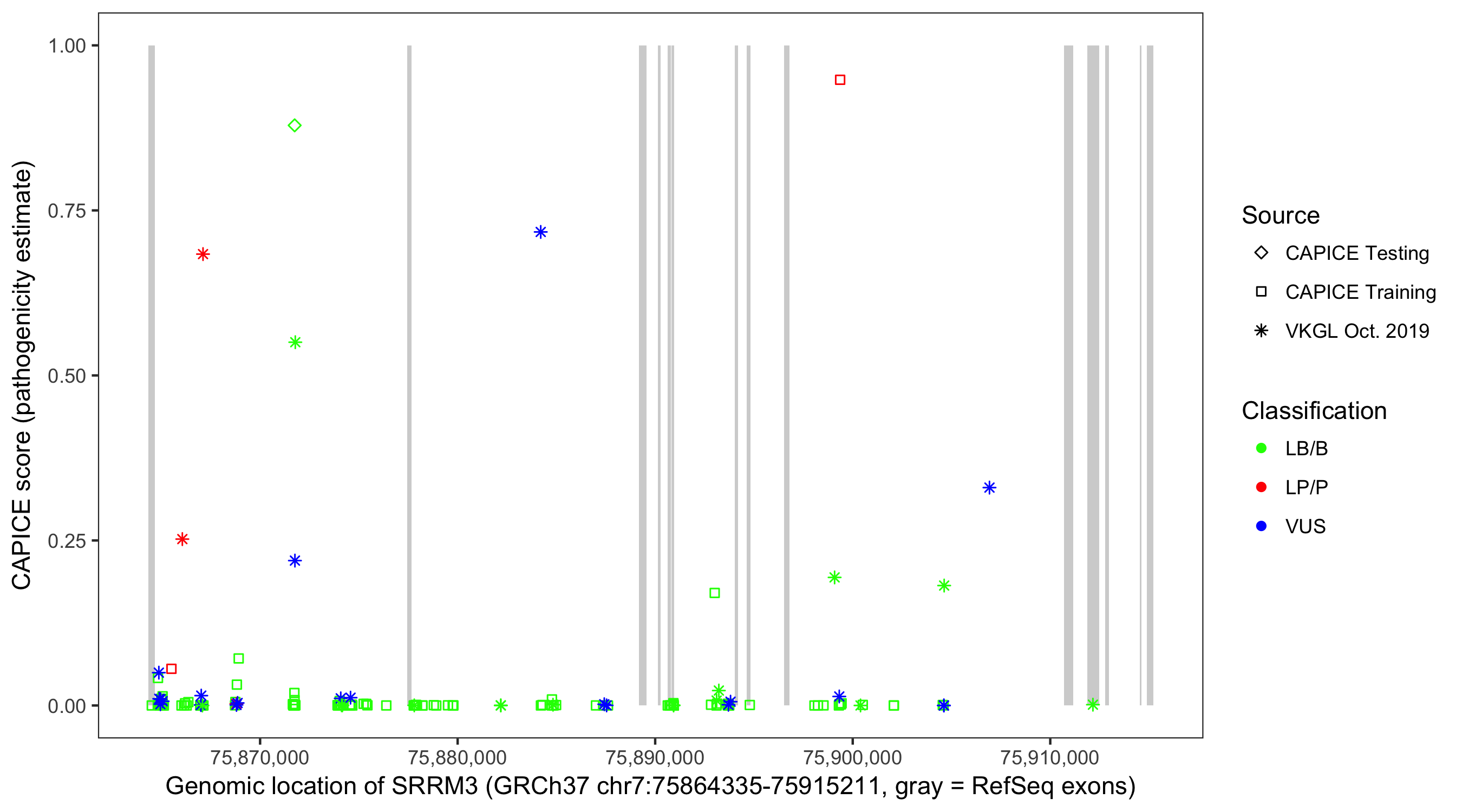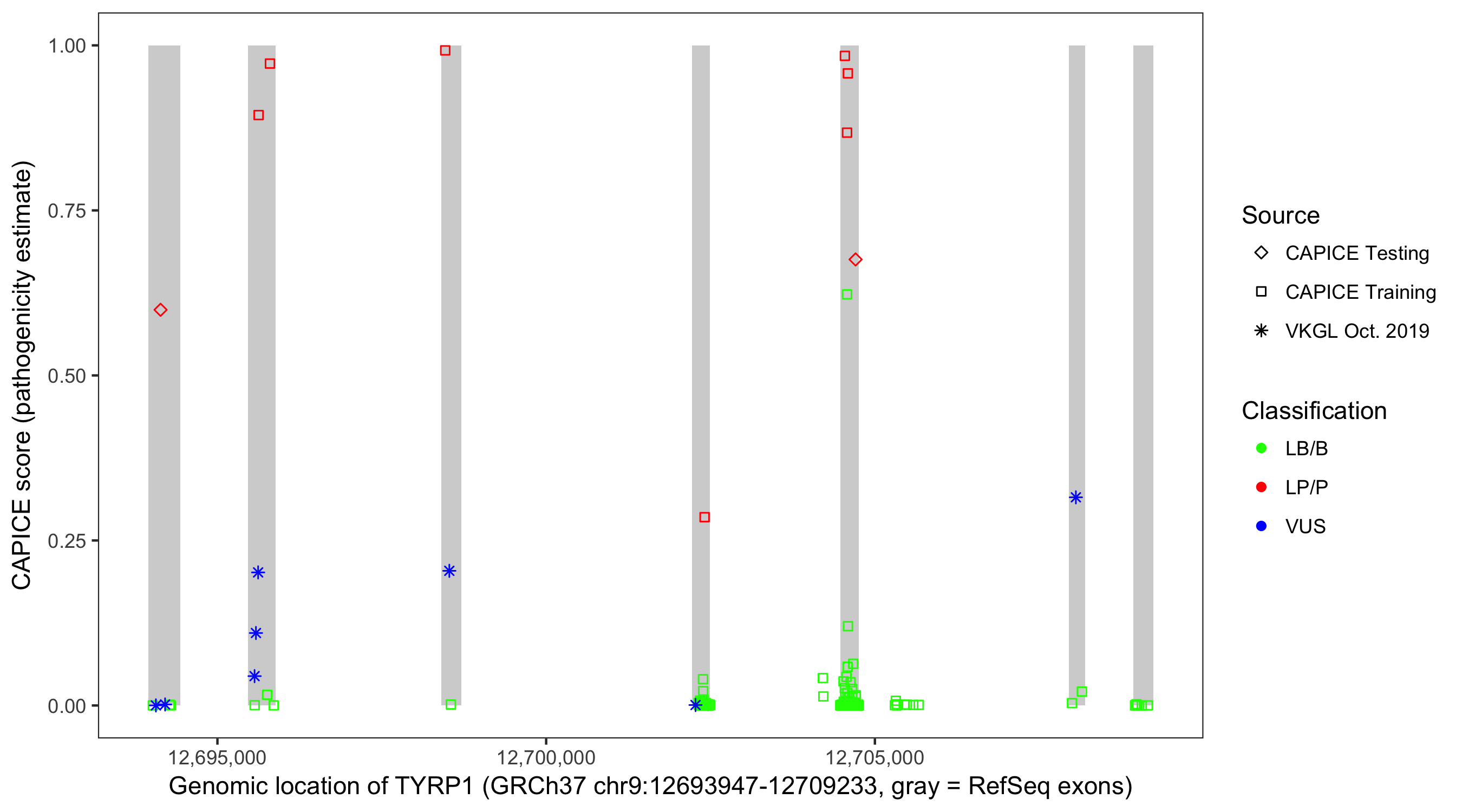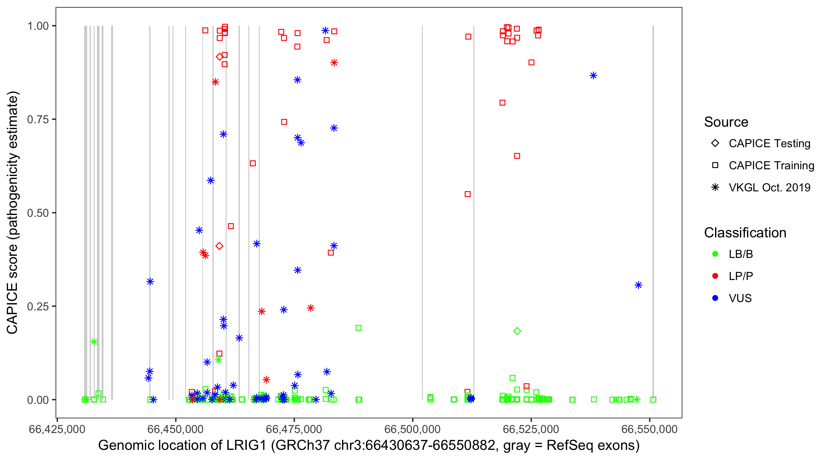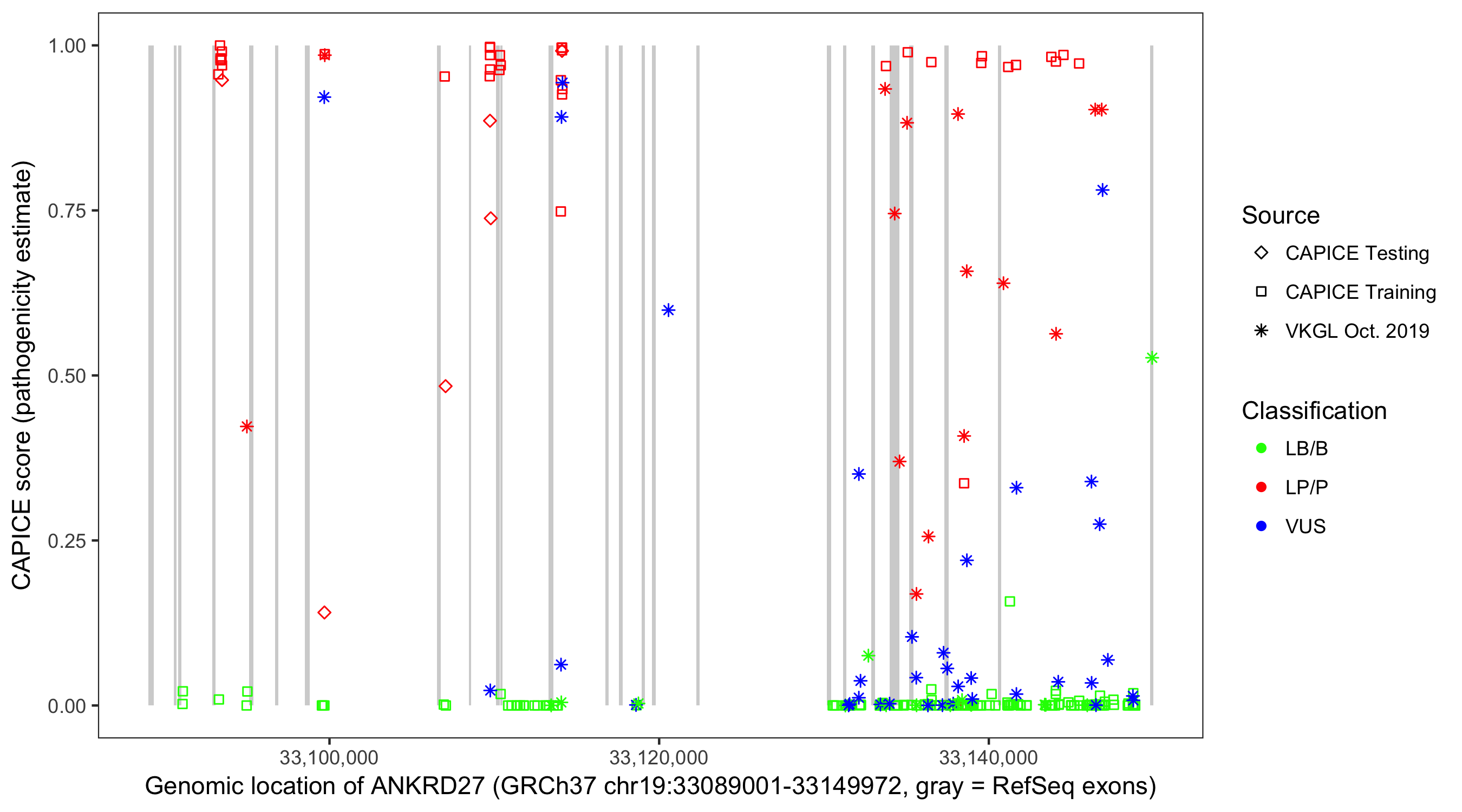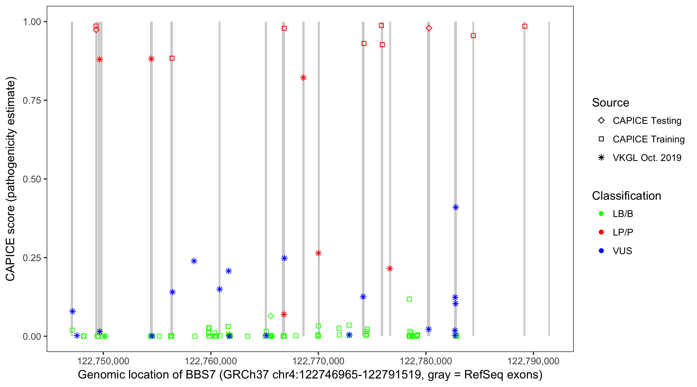 Shown are CAPICE train/test variants plus VKGL Oct 2019.