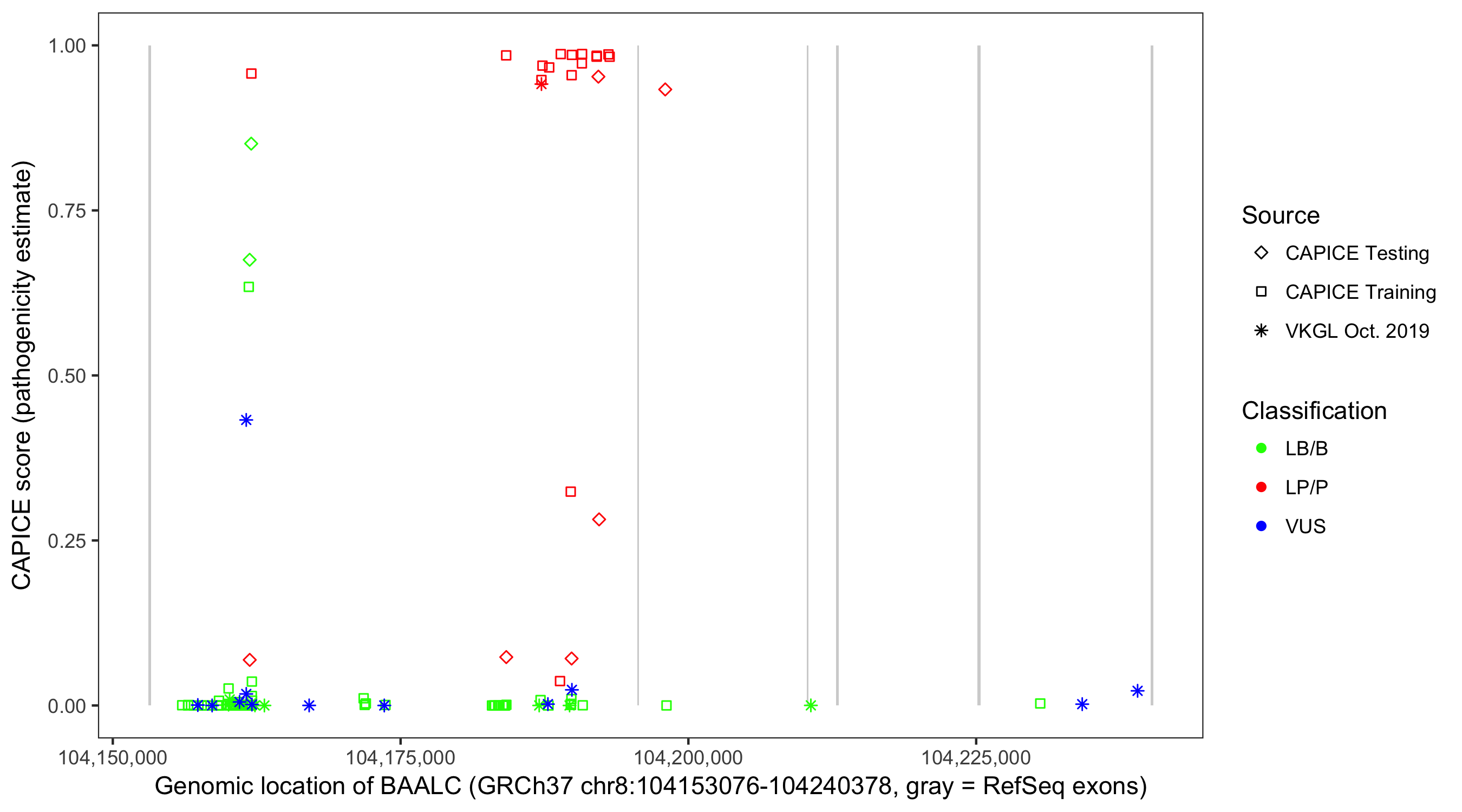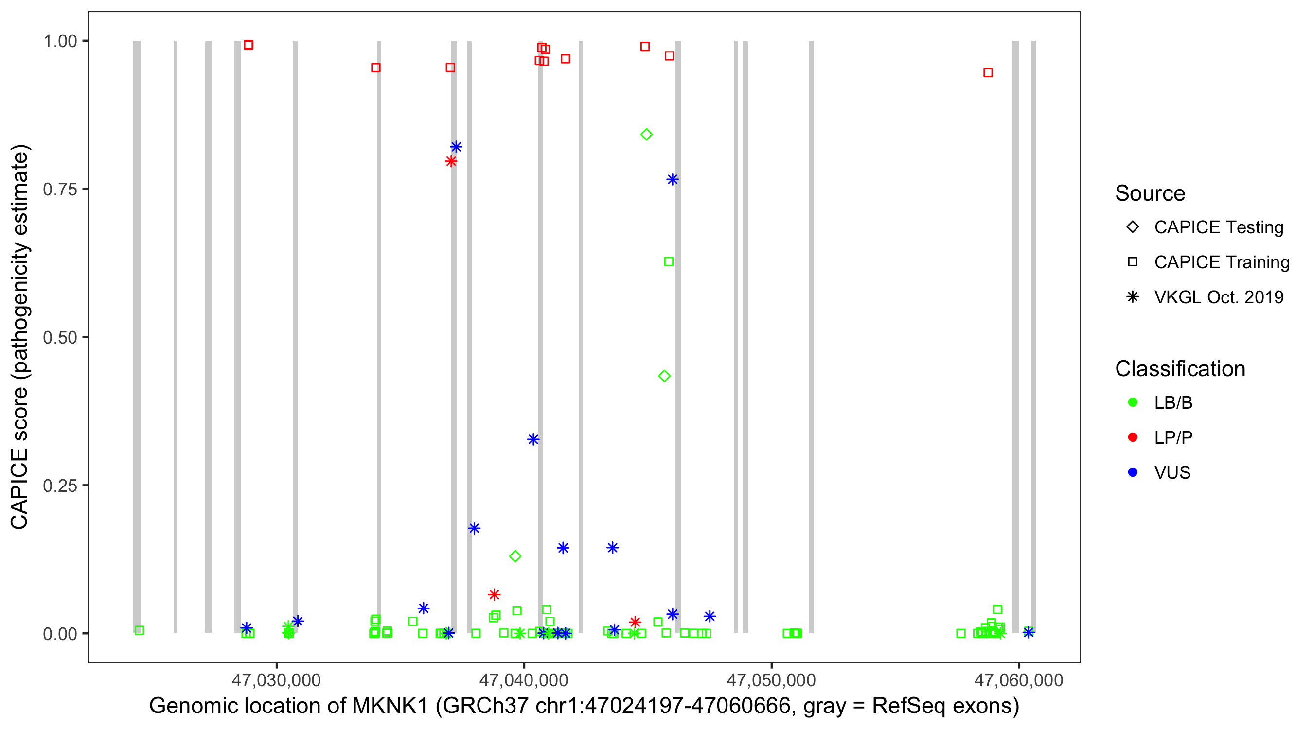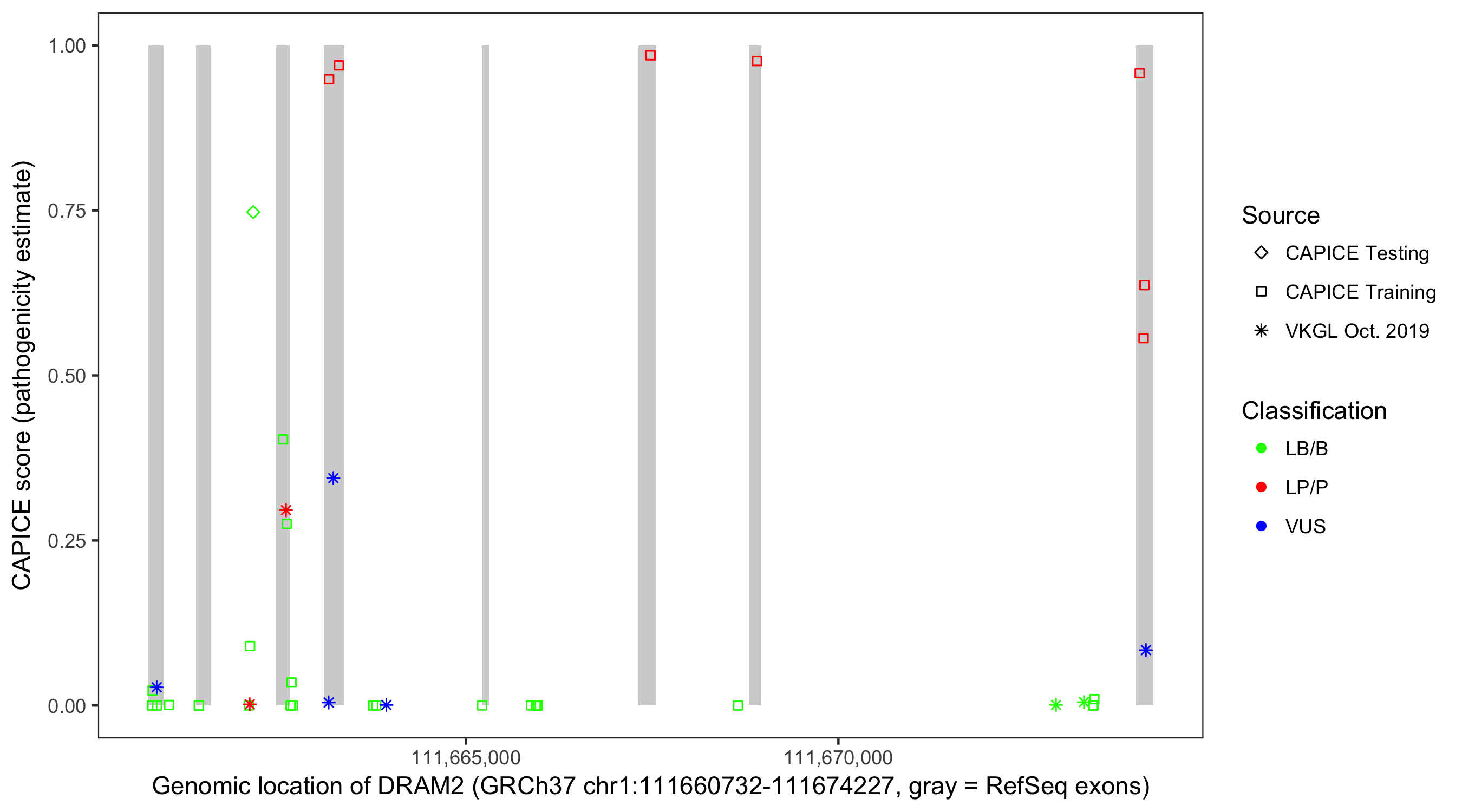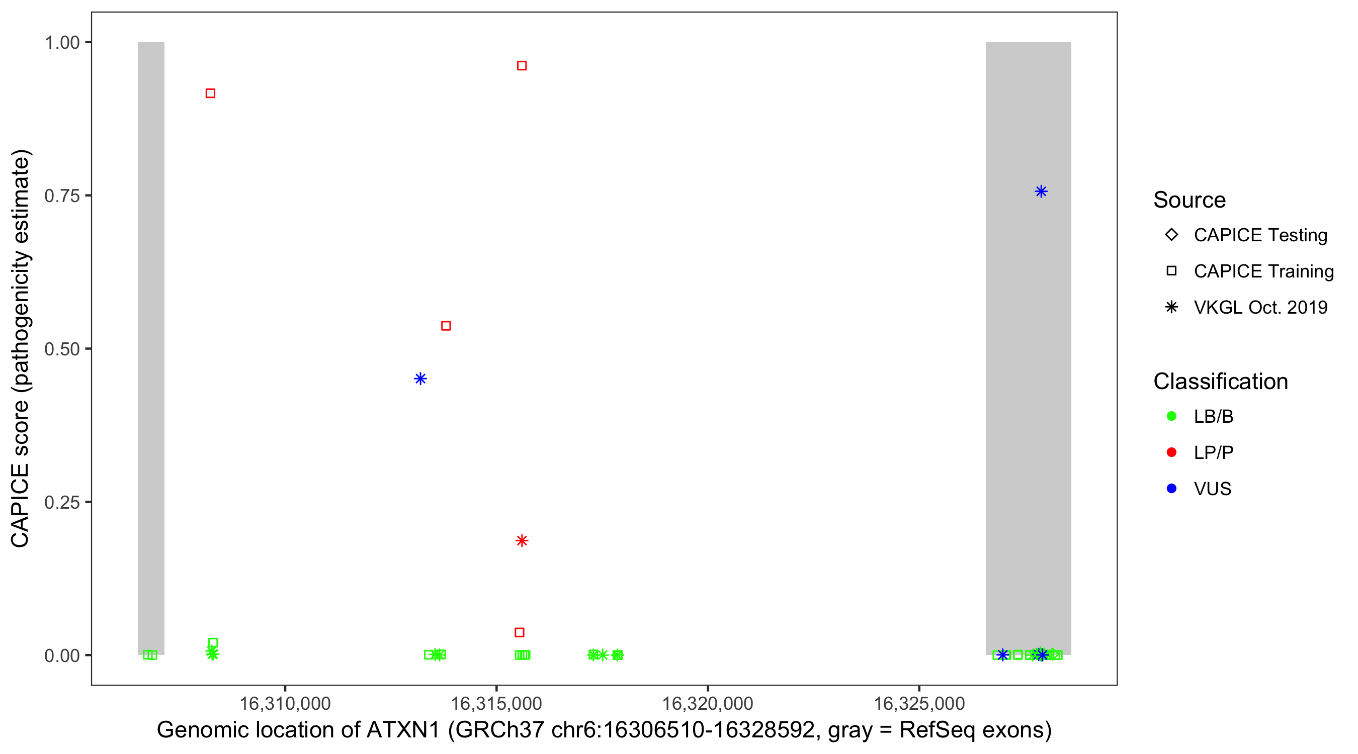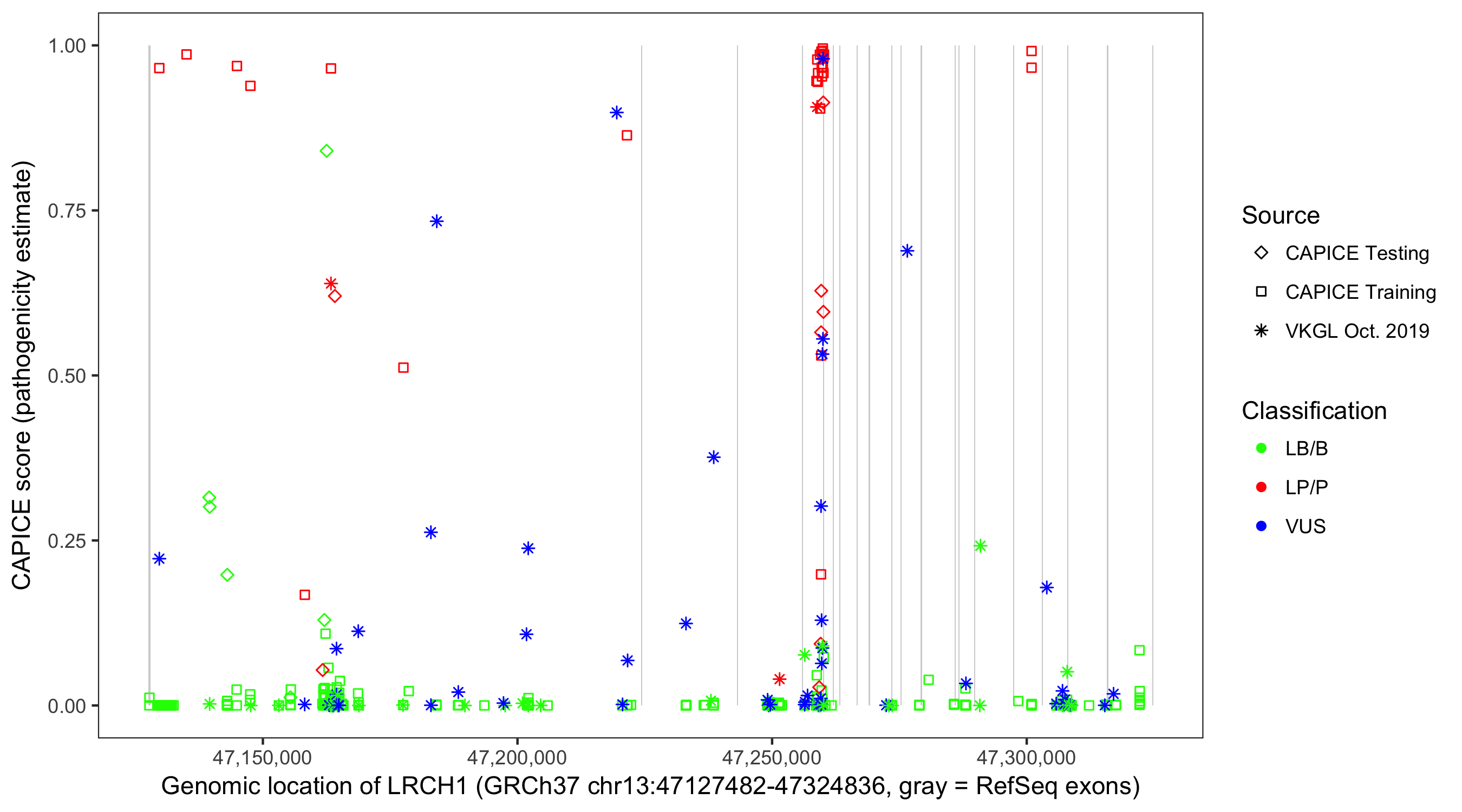 Shown are CAPICE train/test variants plus VKGL Oct 2019.