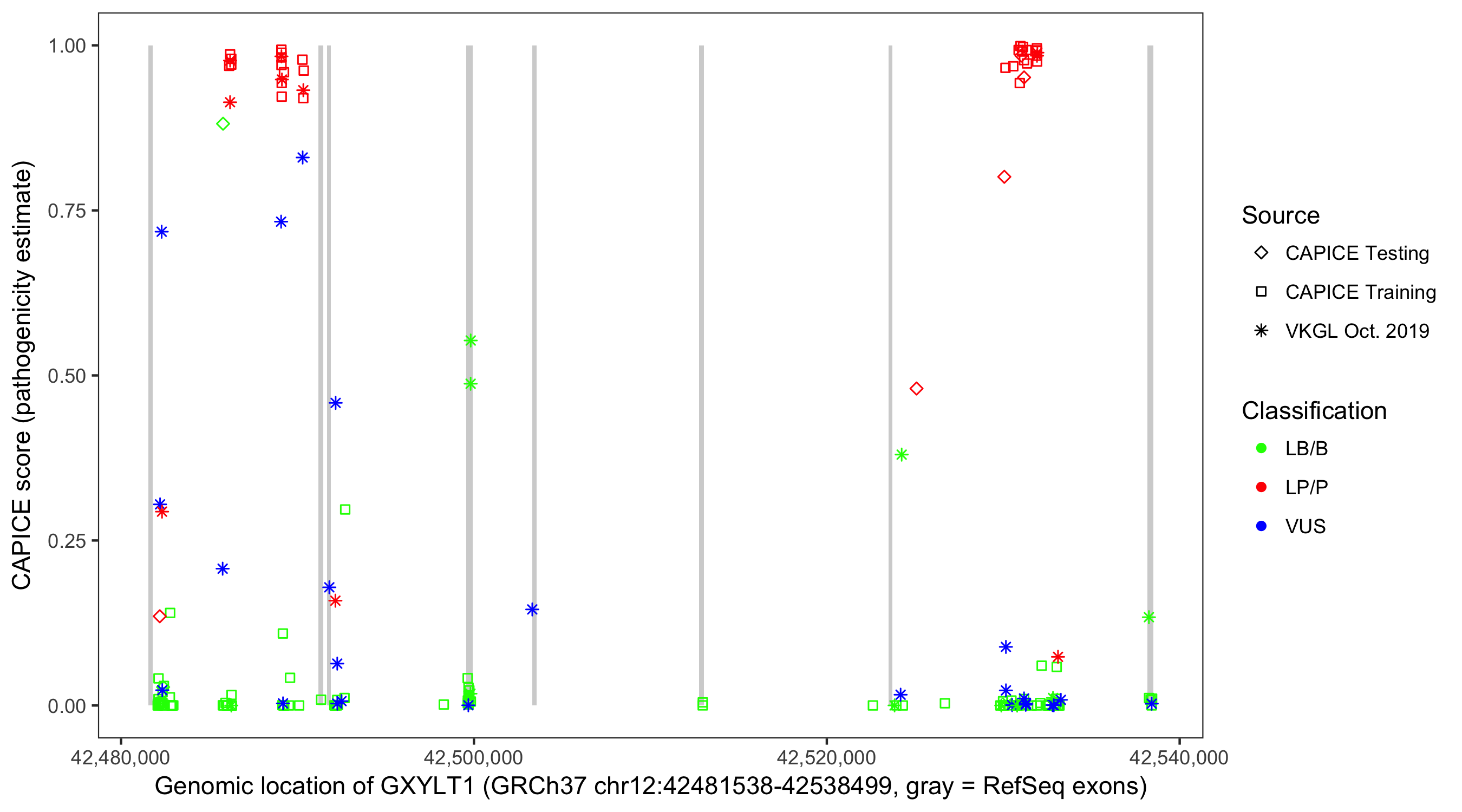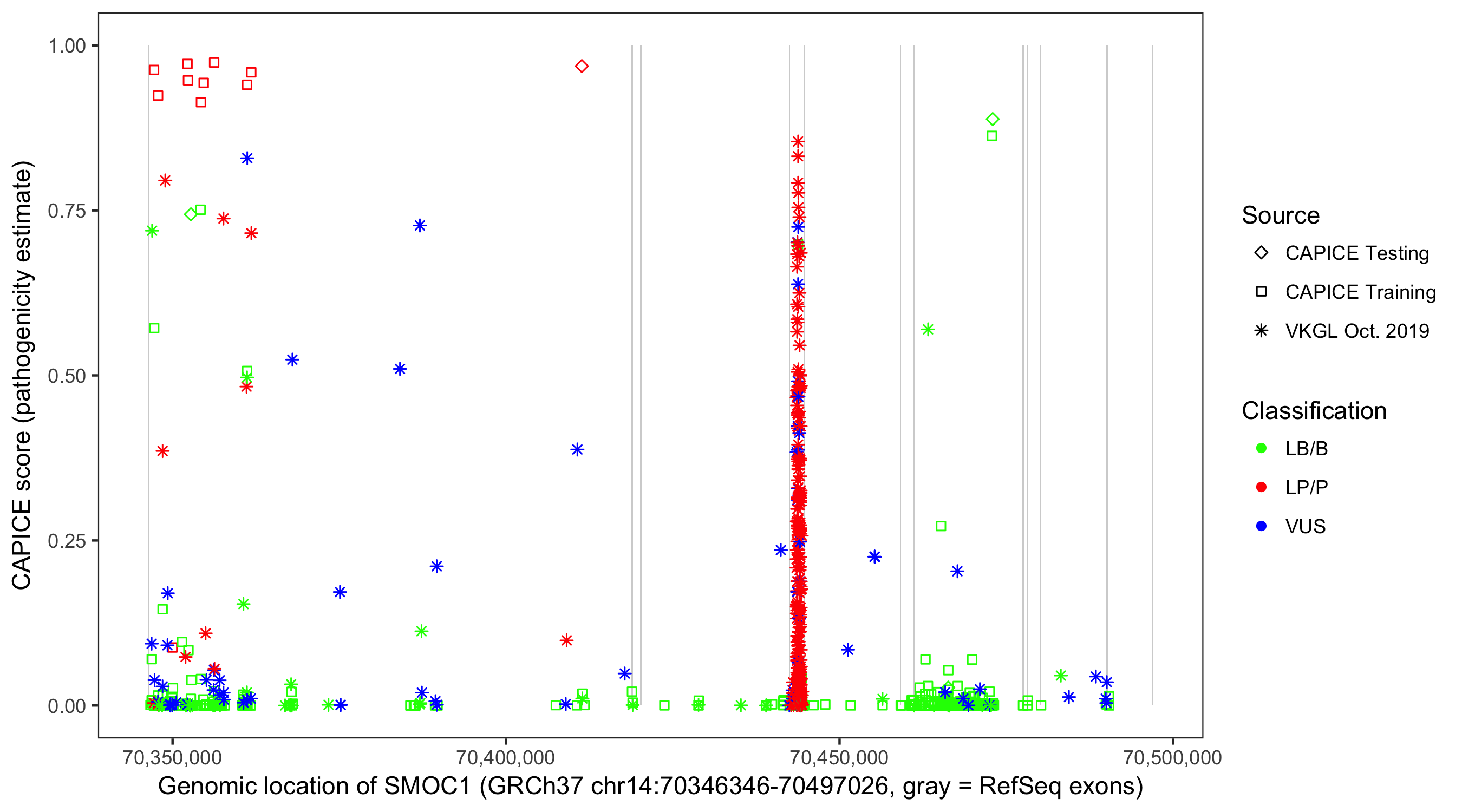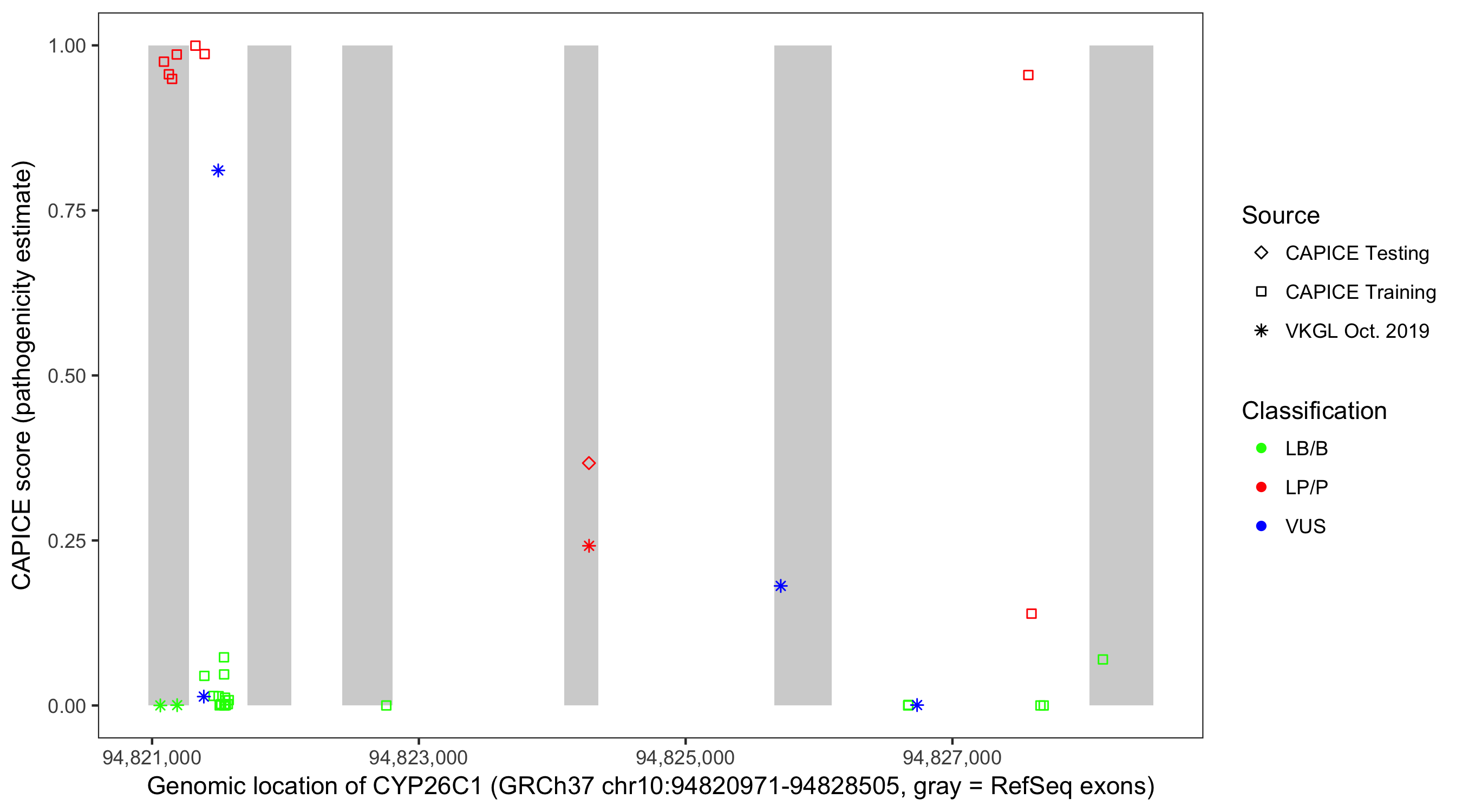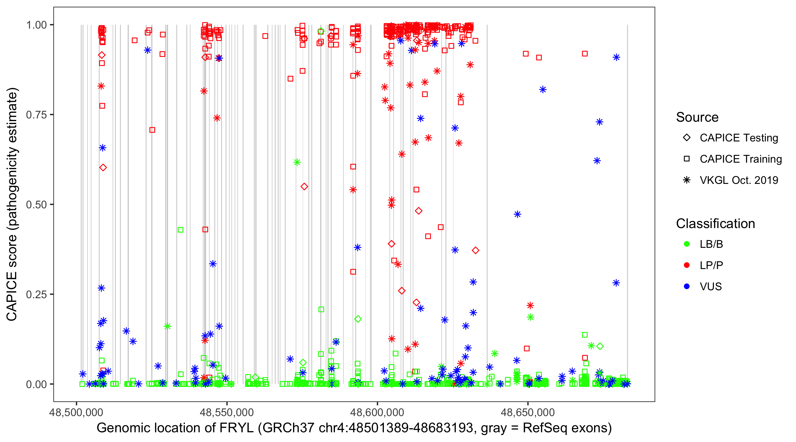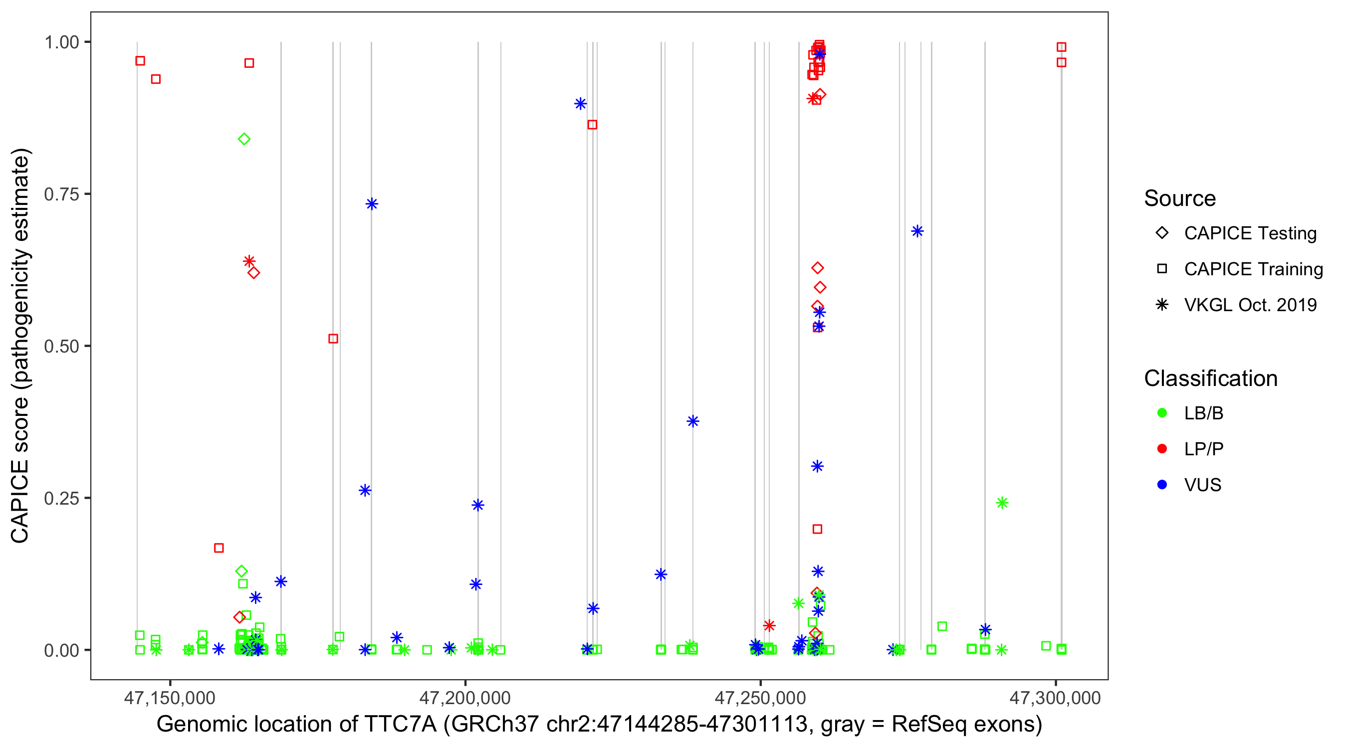 Shown are CAPICE train/test variants plus VKGL Oct 2019.