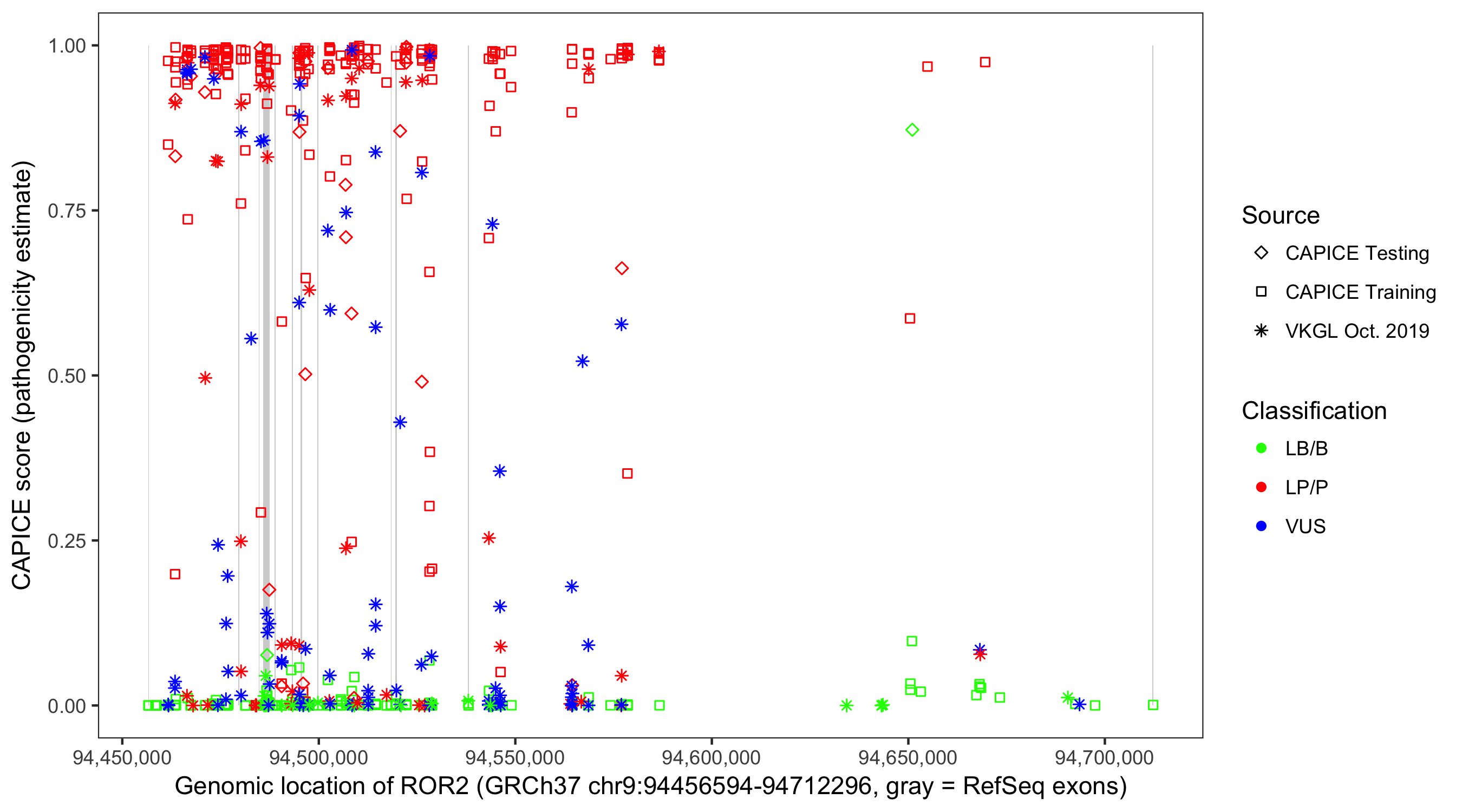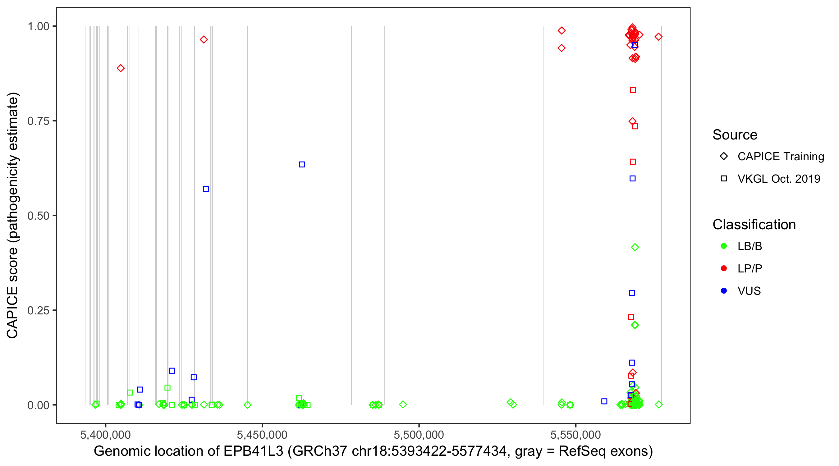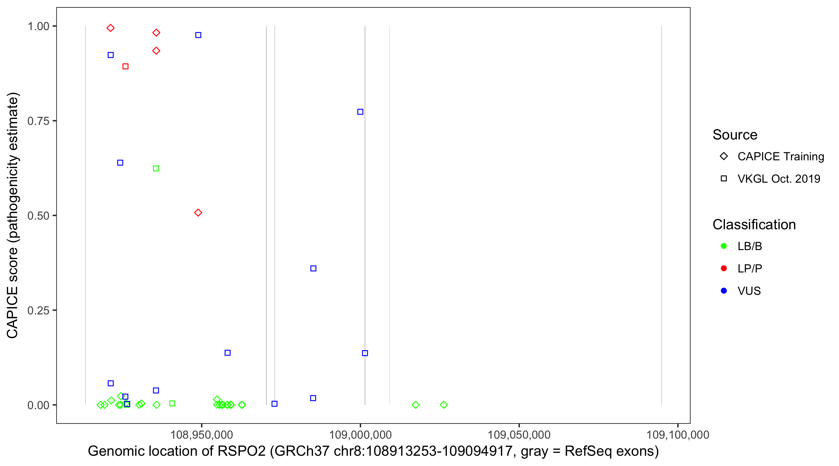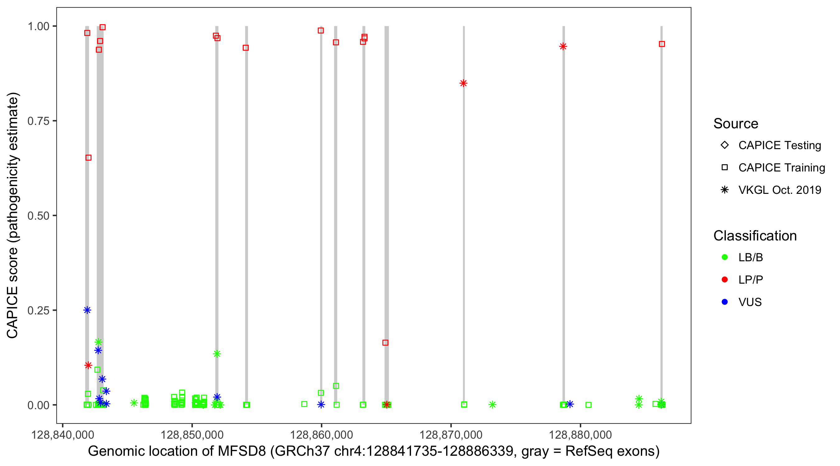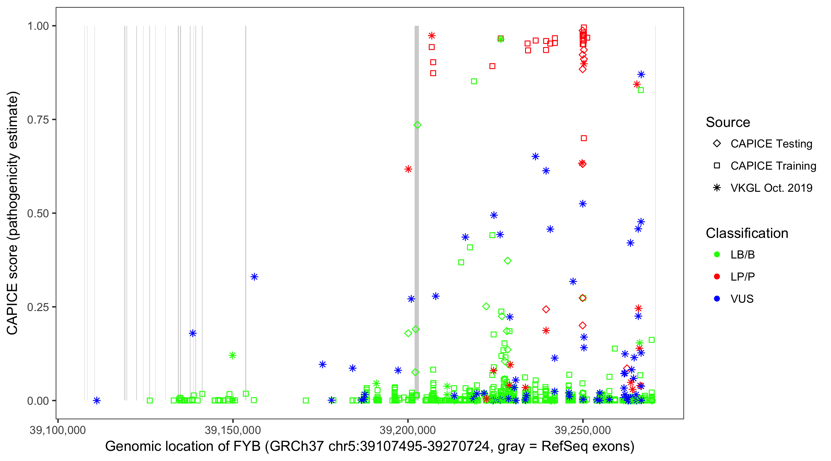 Shown are CAPICE train/test variants plus VKGL Oct 2019.