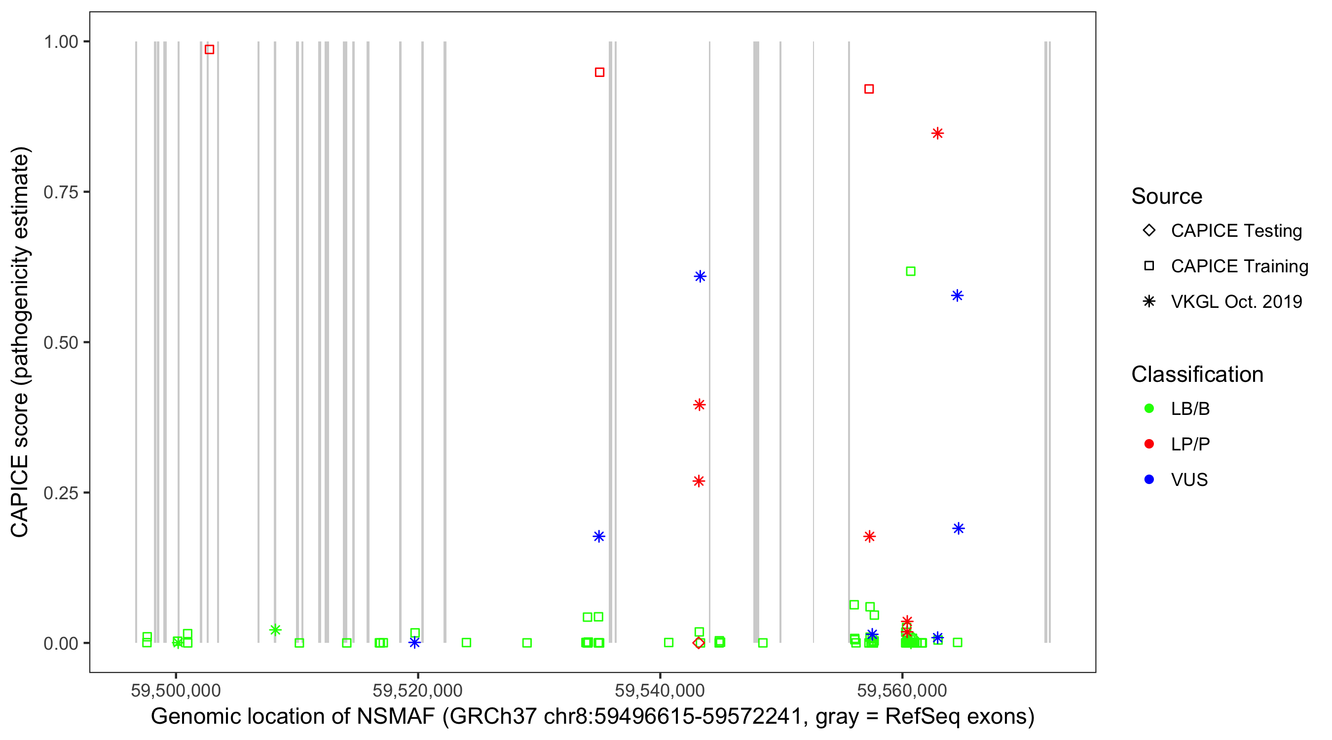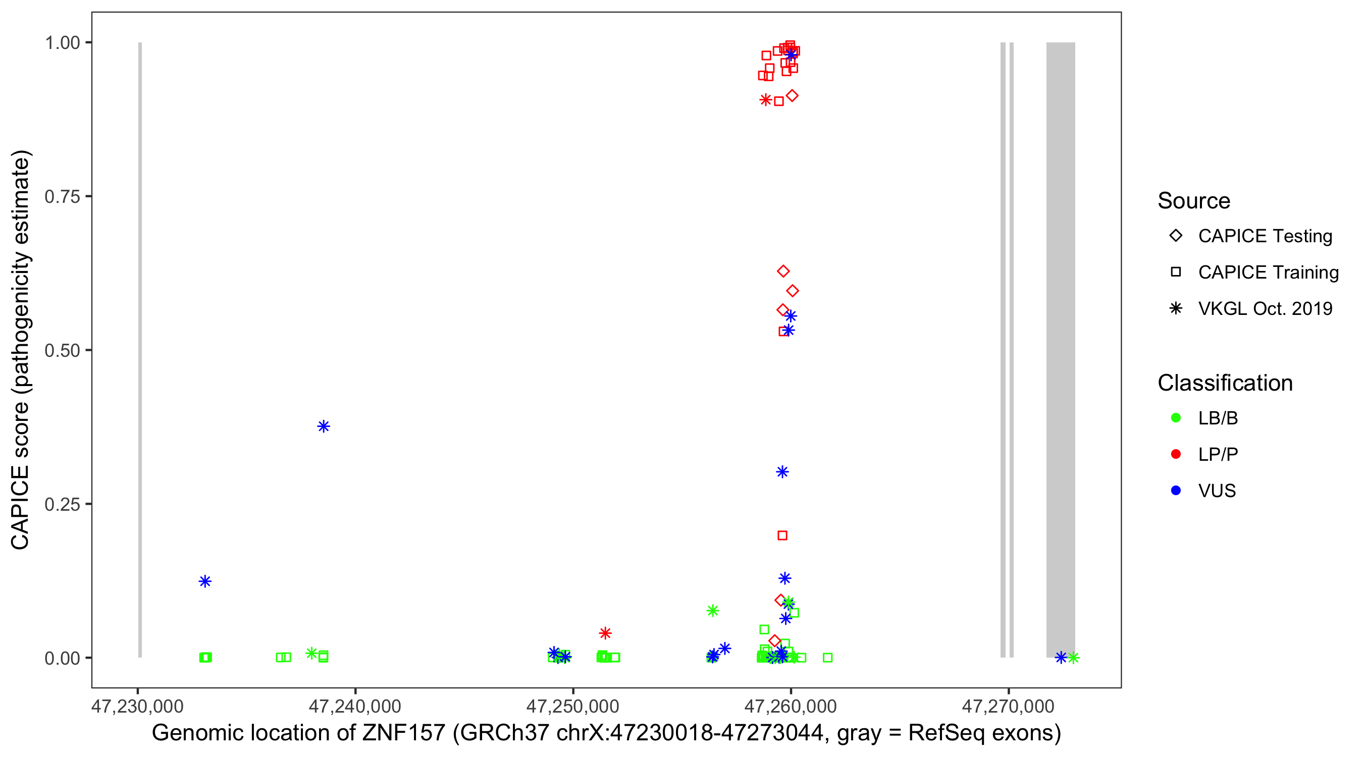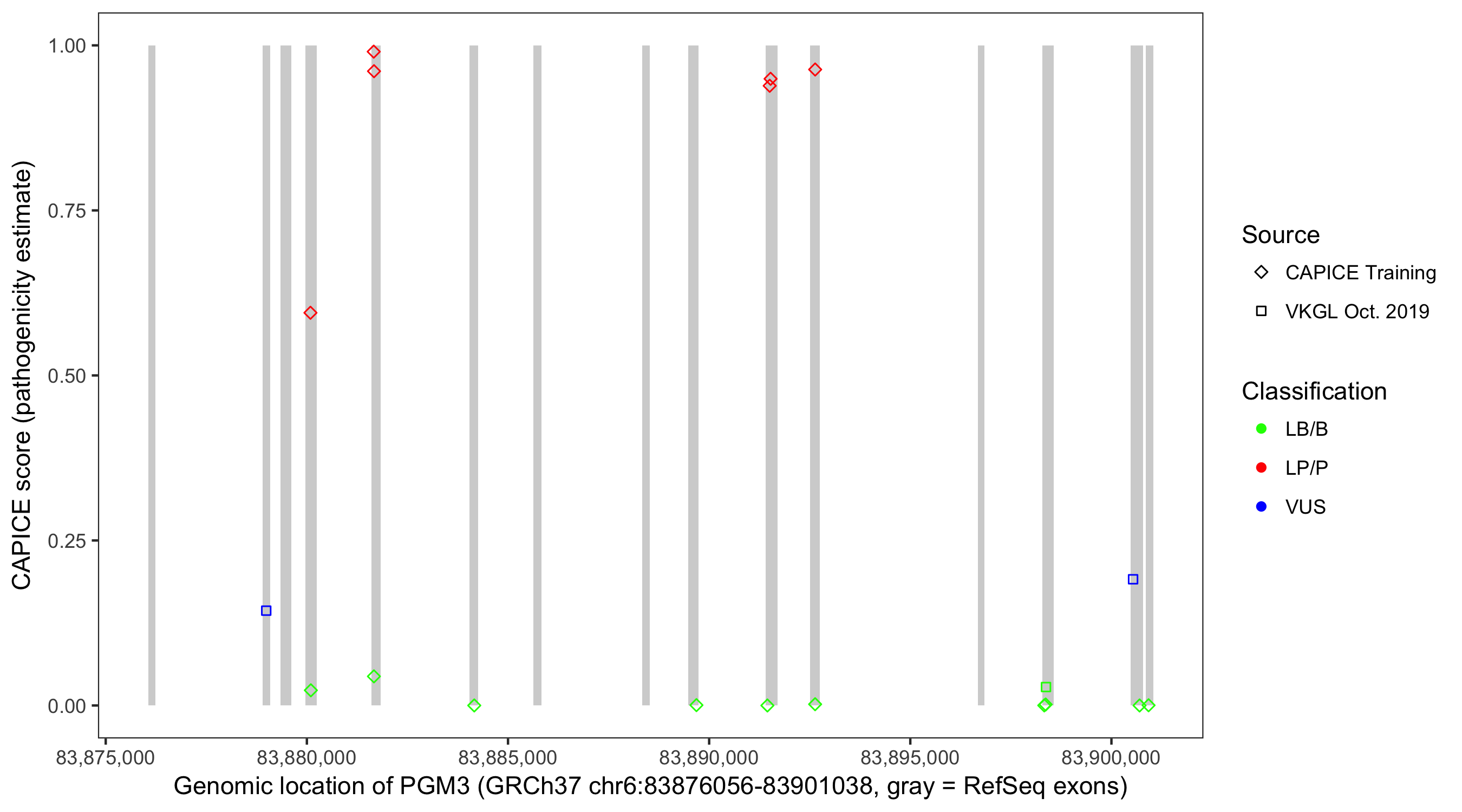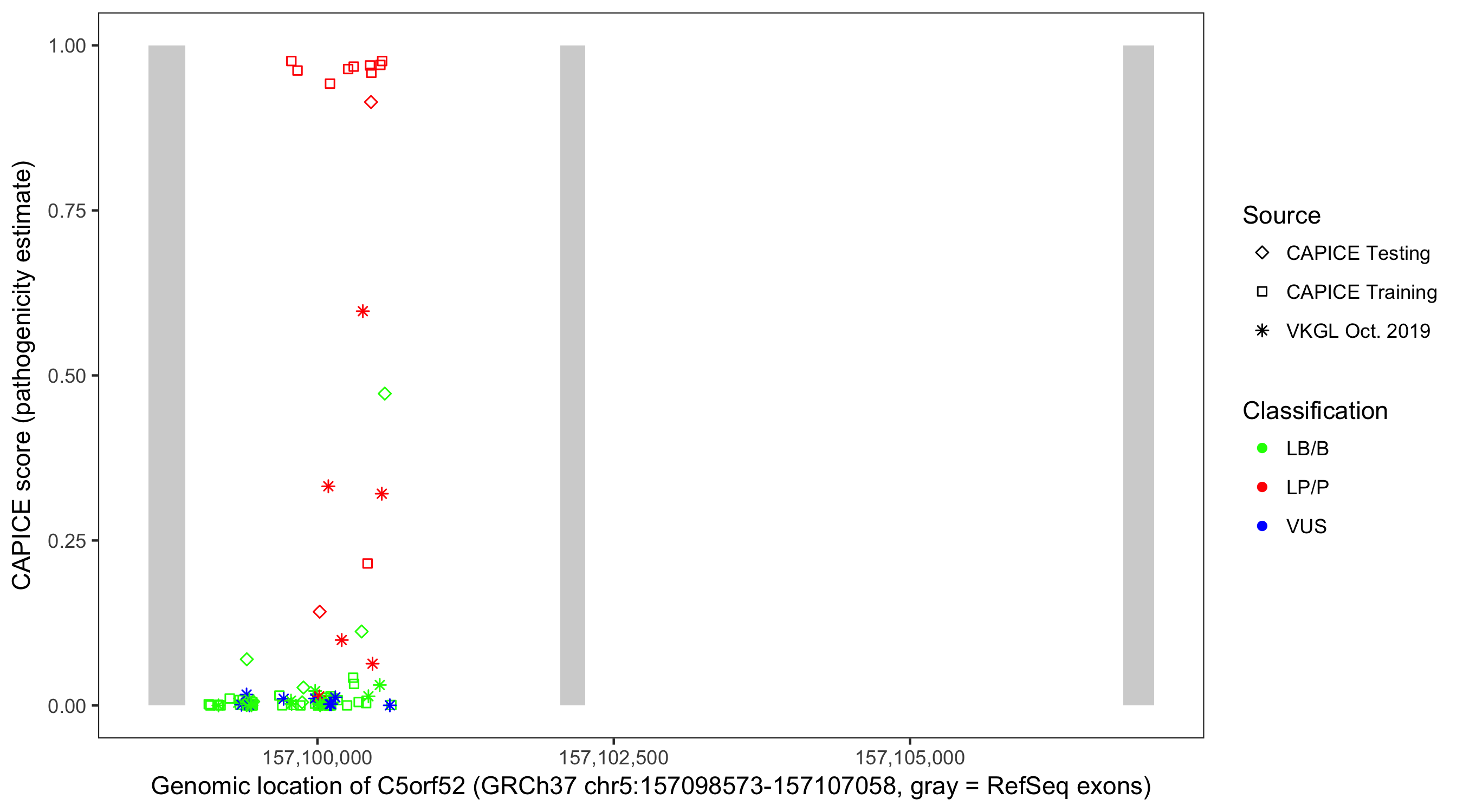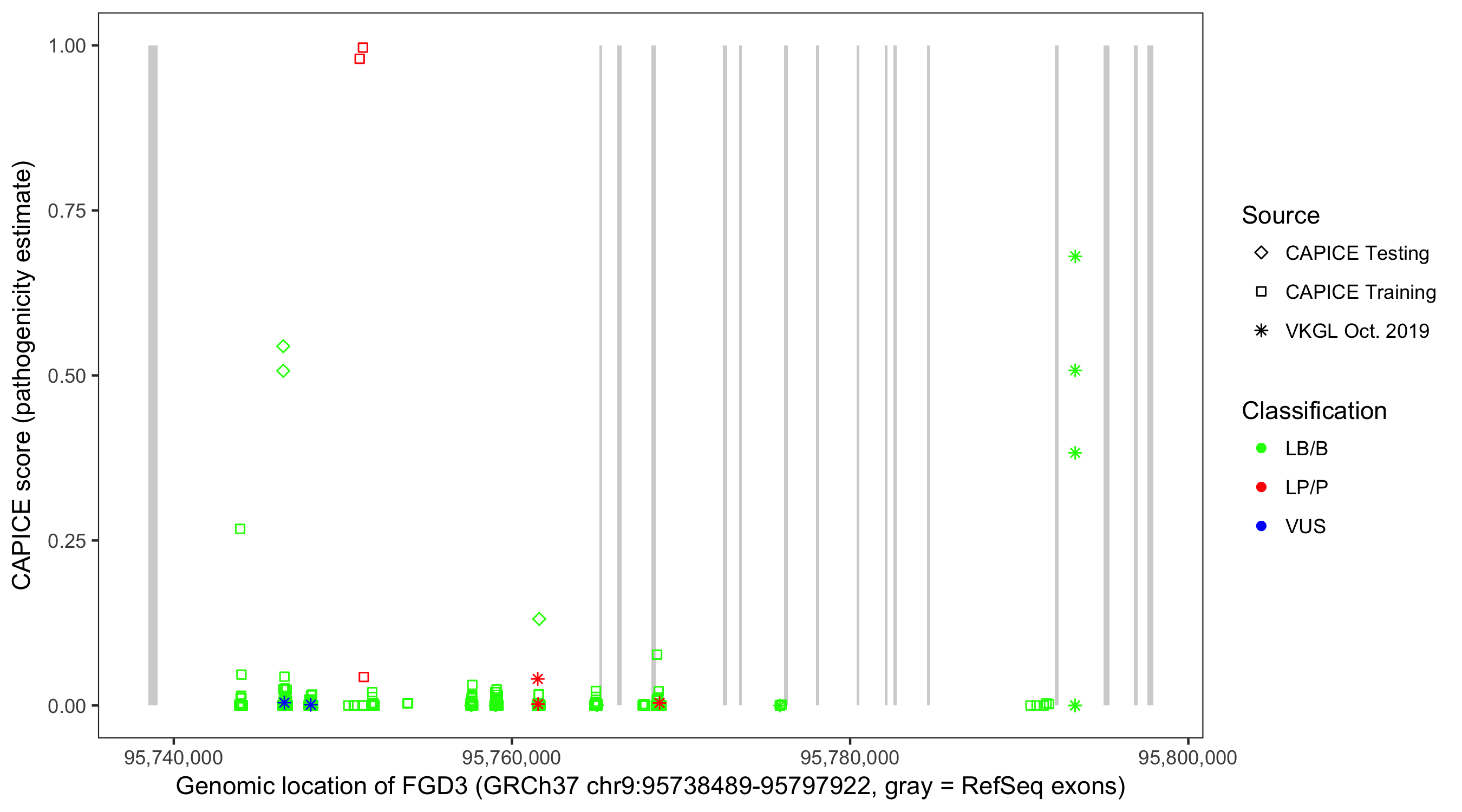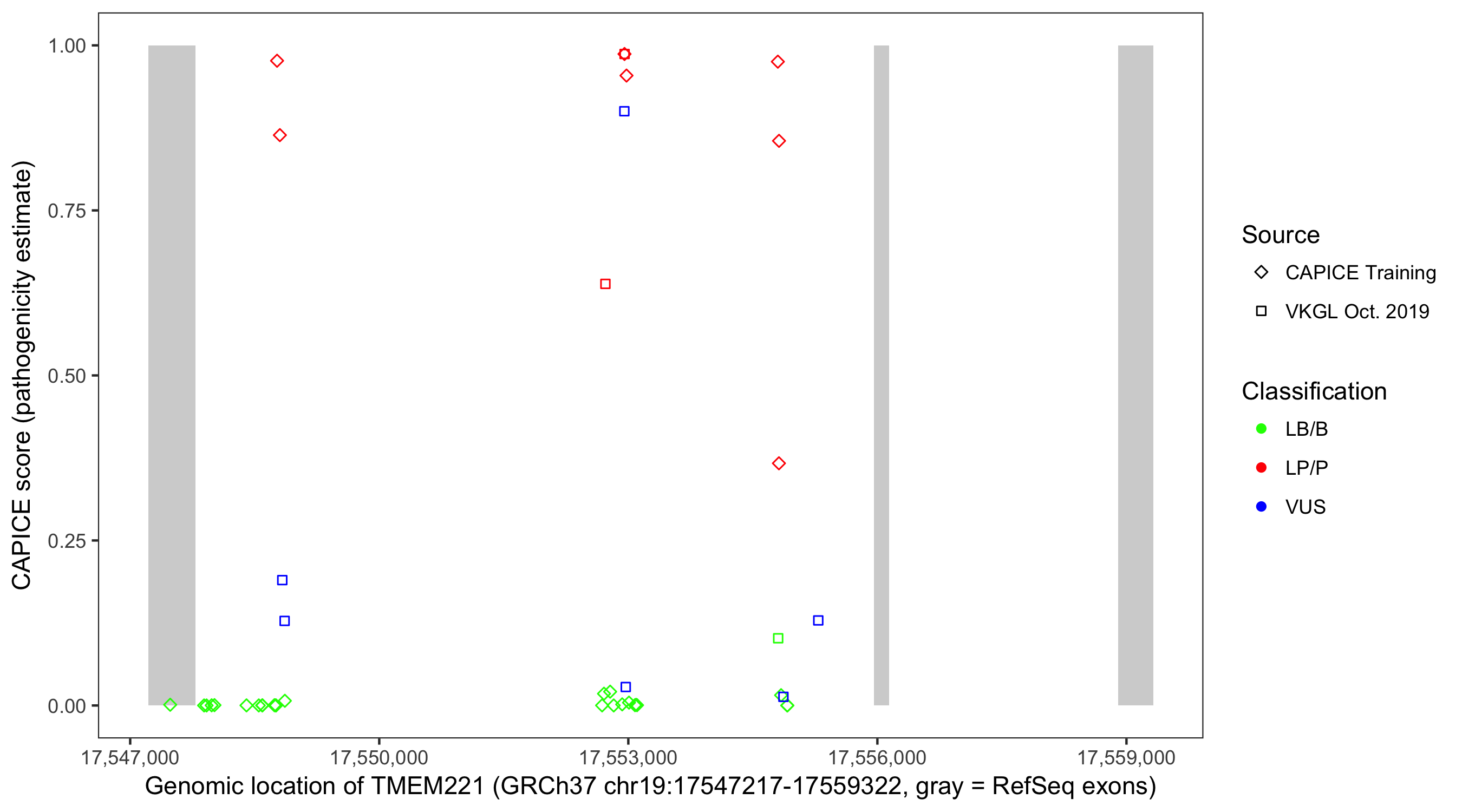 Shown are CAPICE train/test variants plus VKGL Oct 2019.