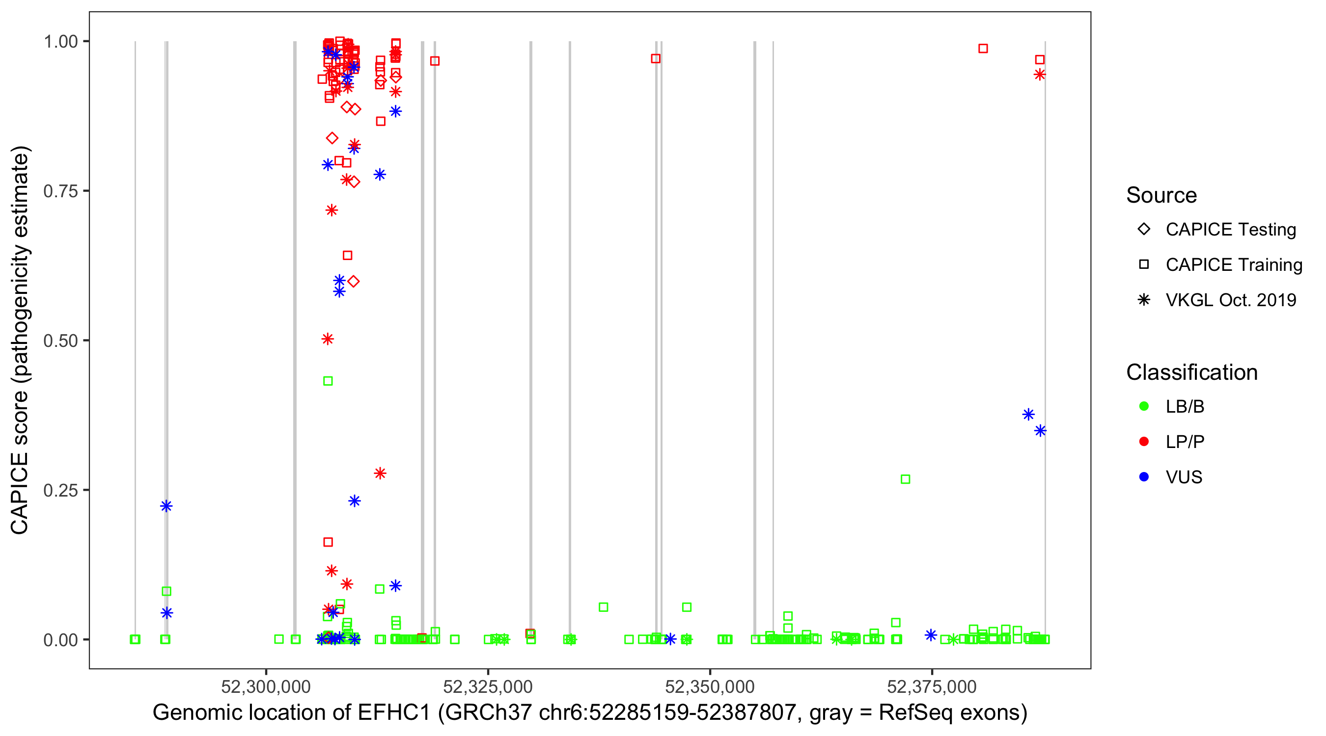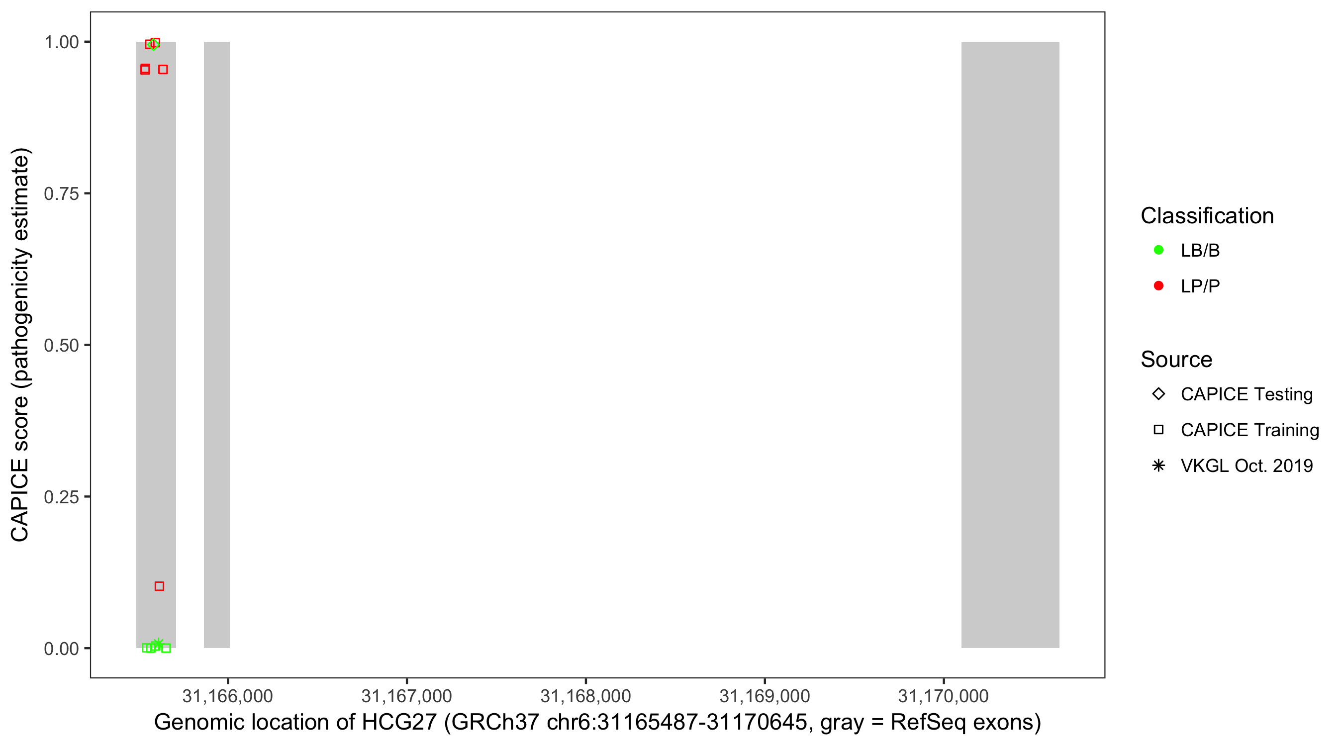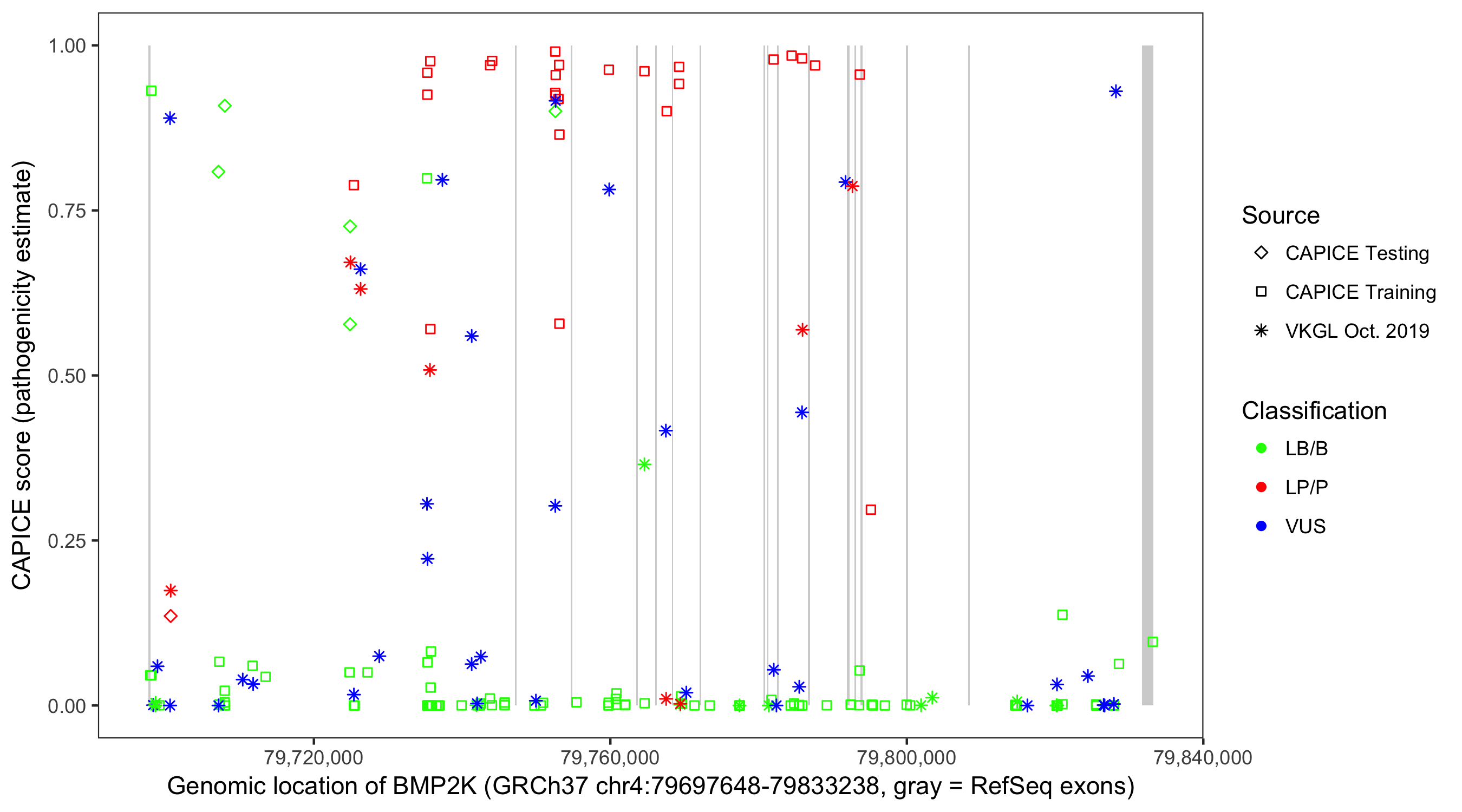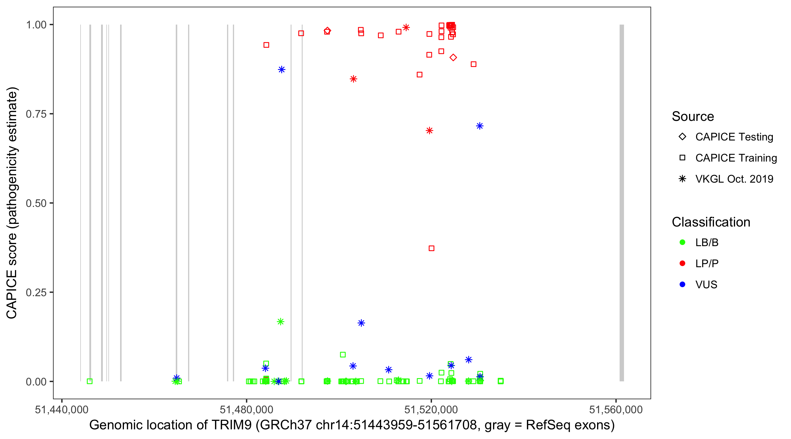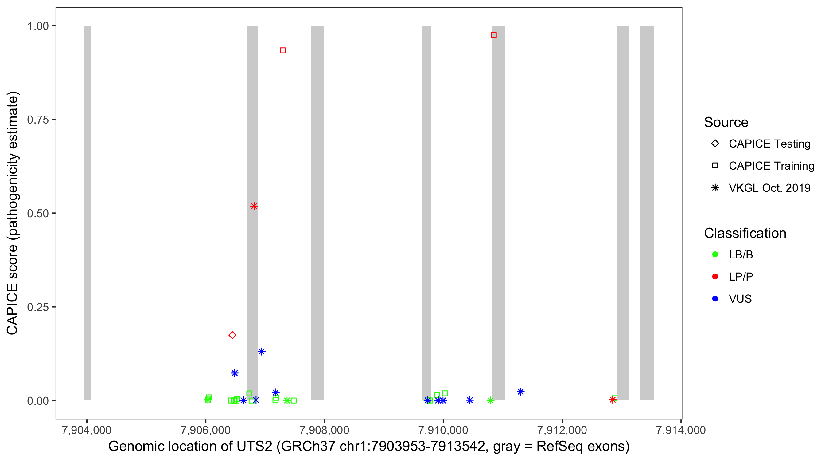 Shown are CAPICE train/test variants plus VKGL Oct 2019.