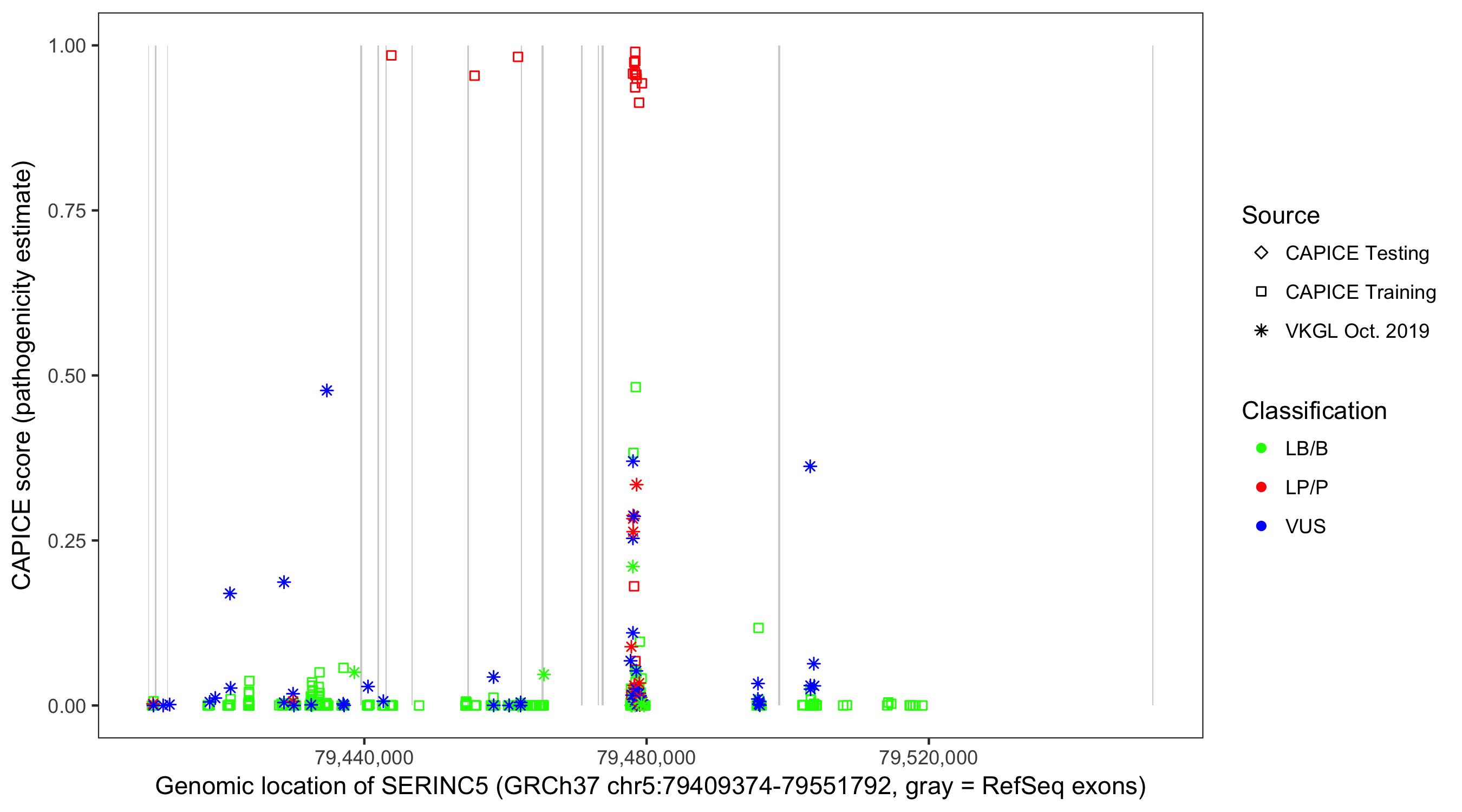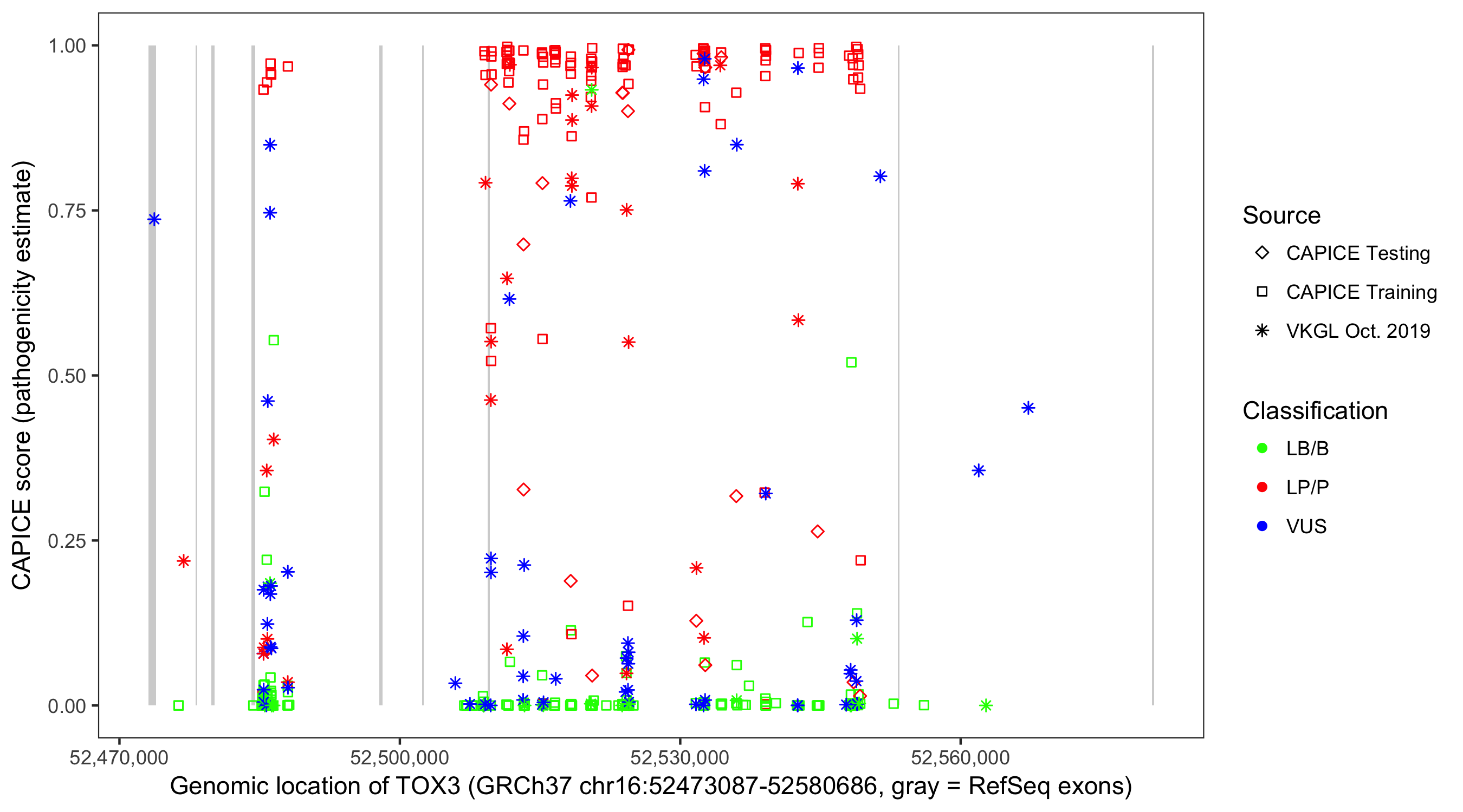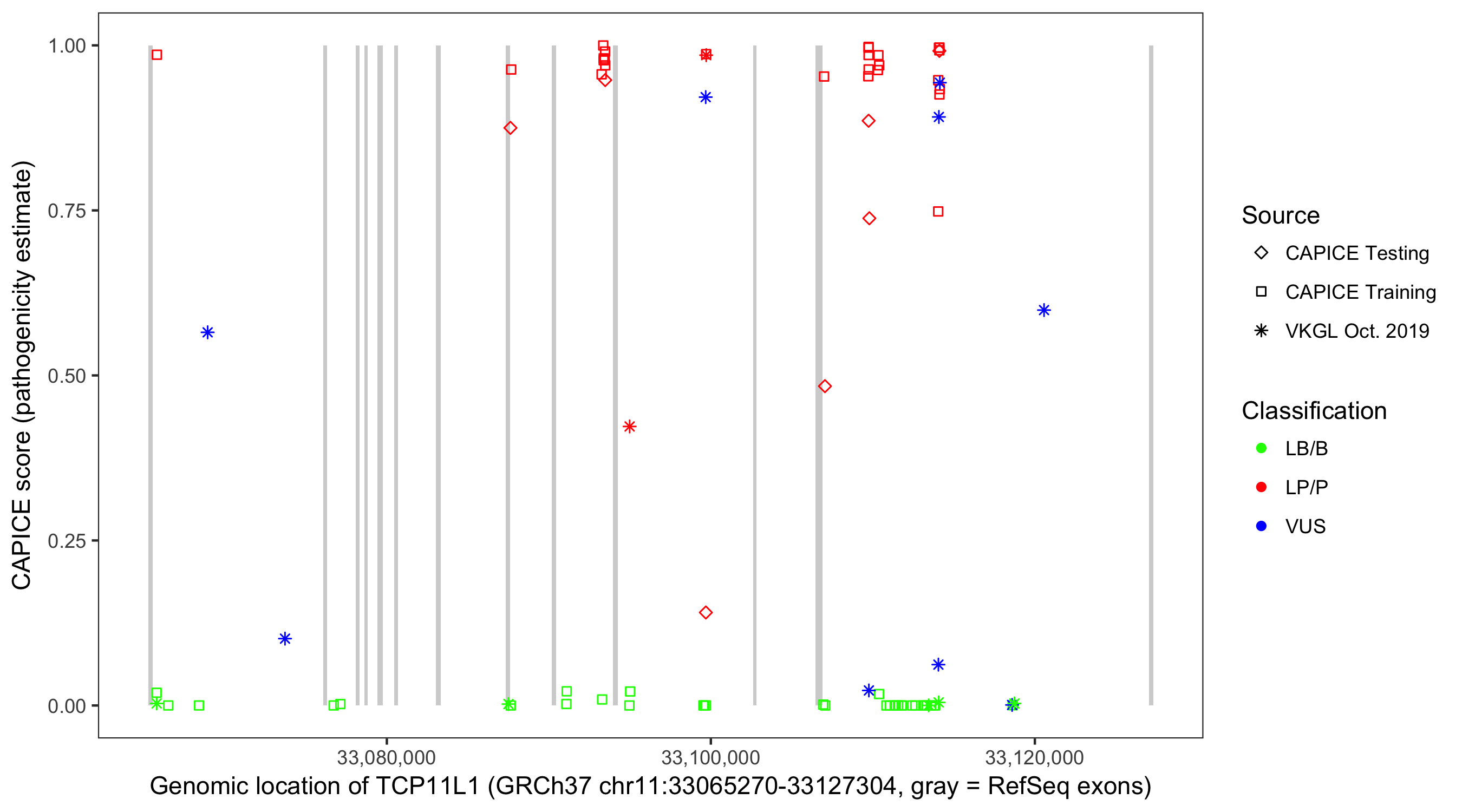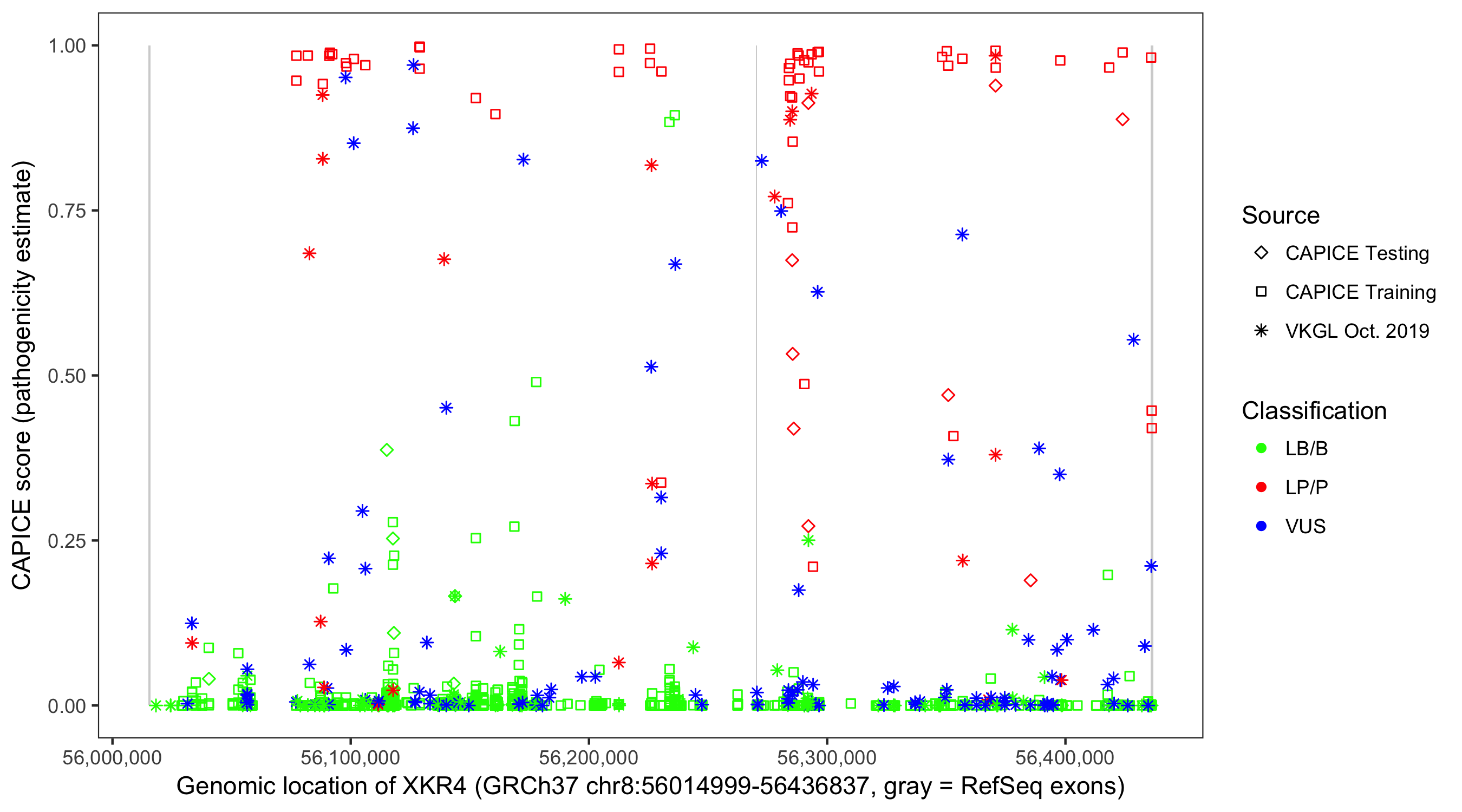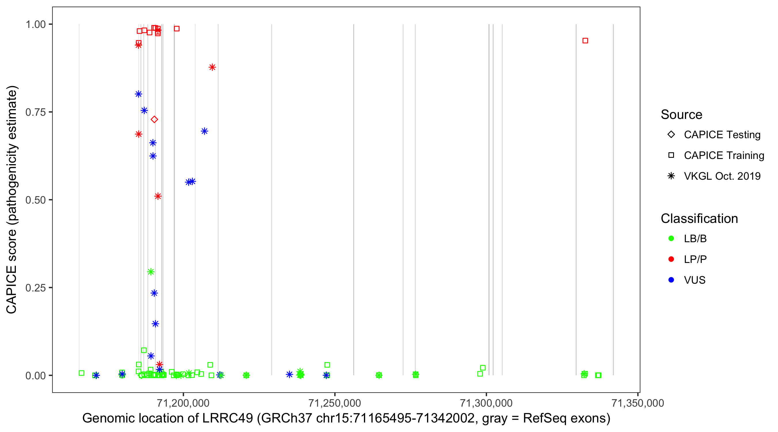 Shown are CAPICE train/test variants plus VKGL Oct 2019.