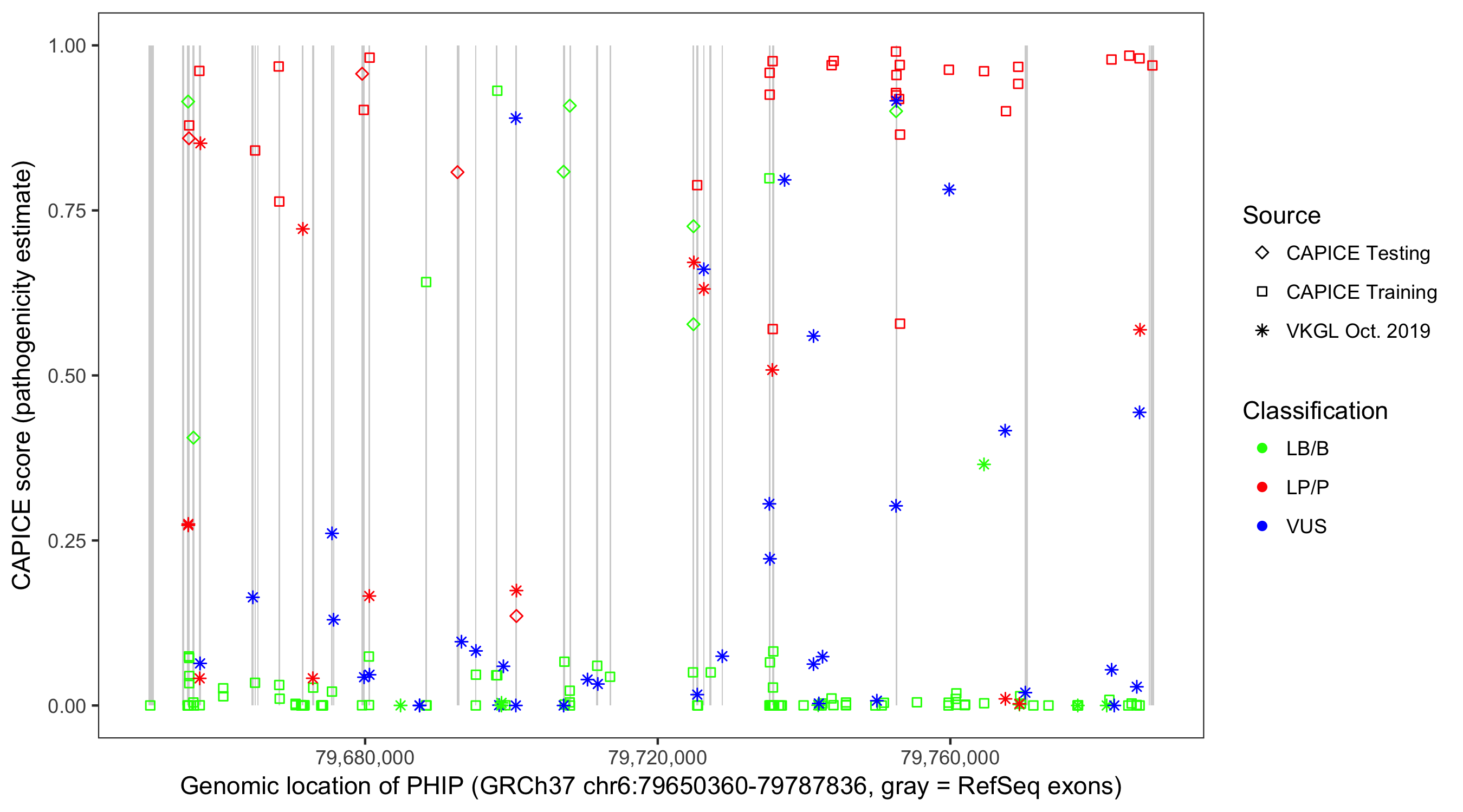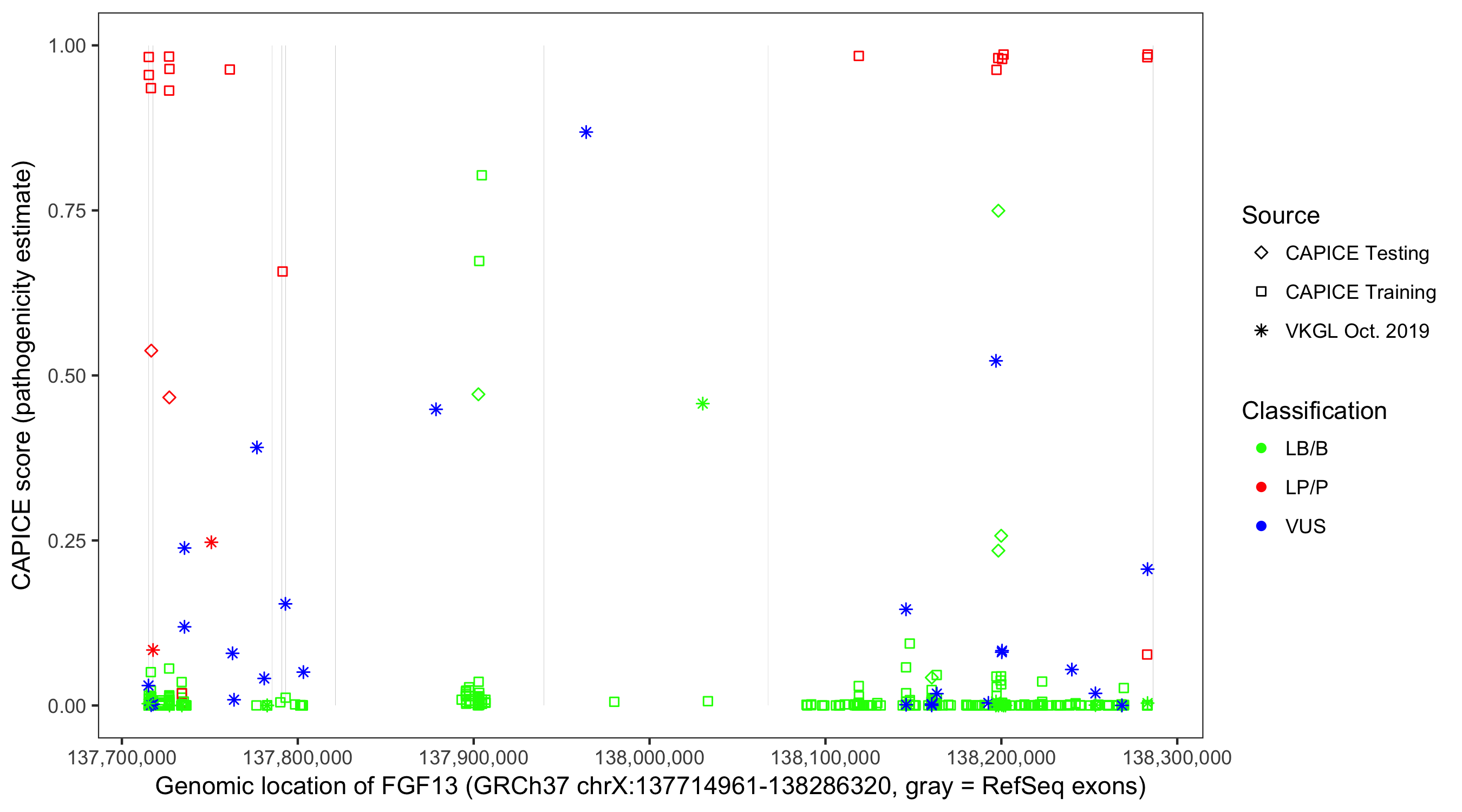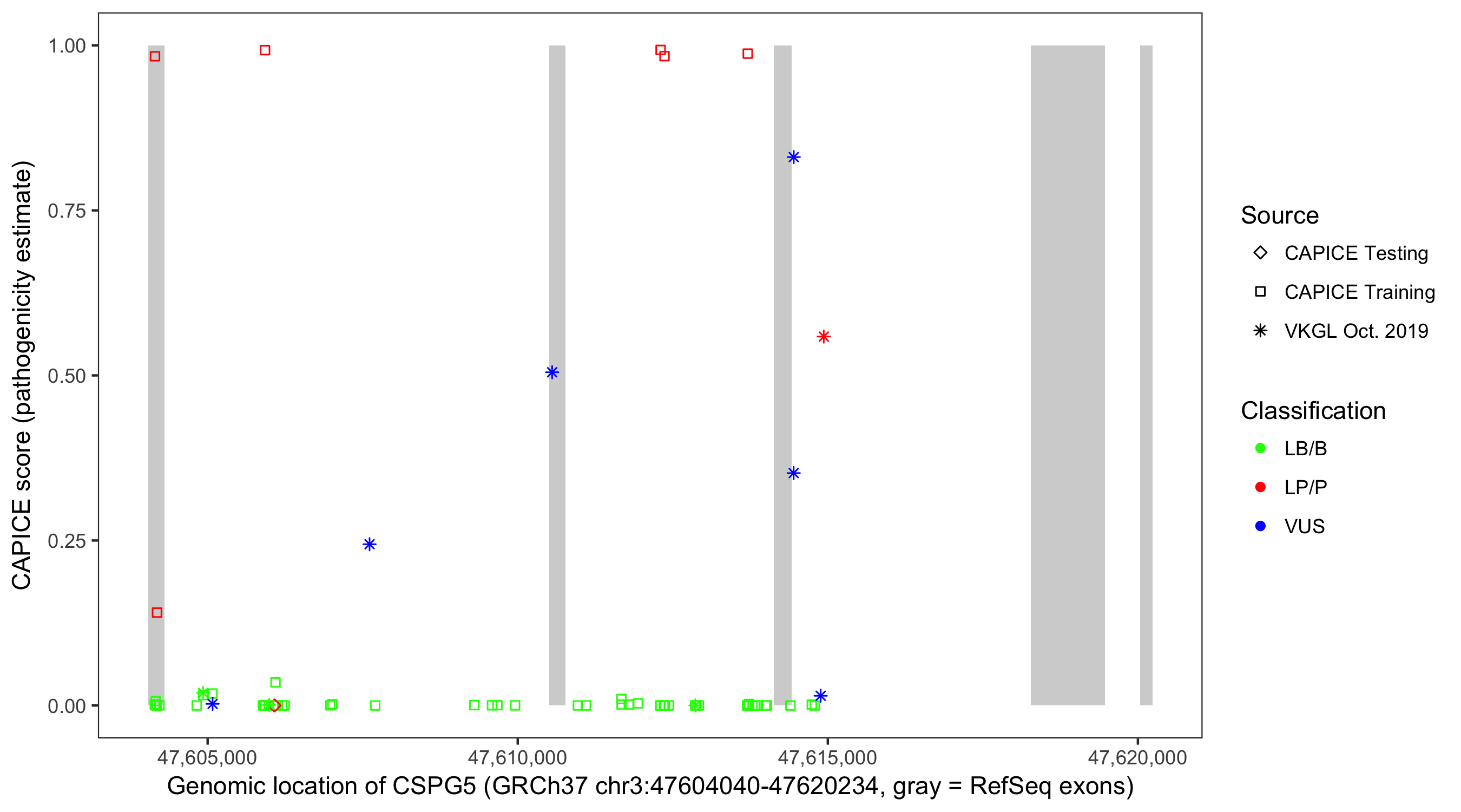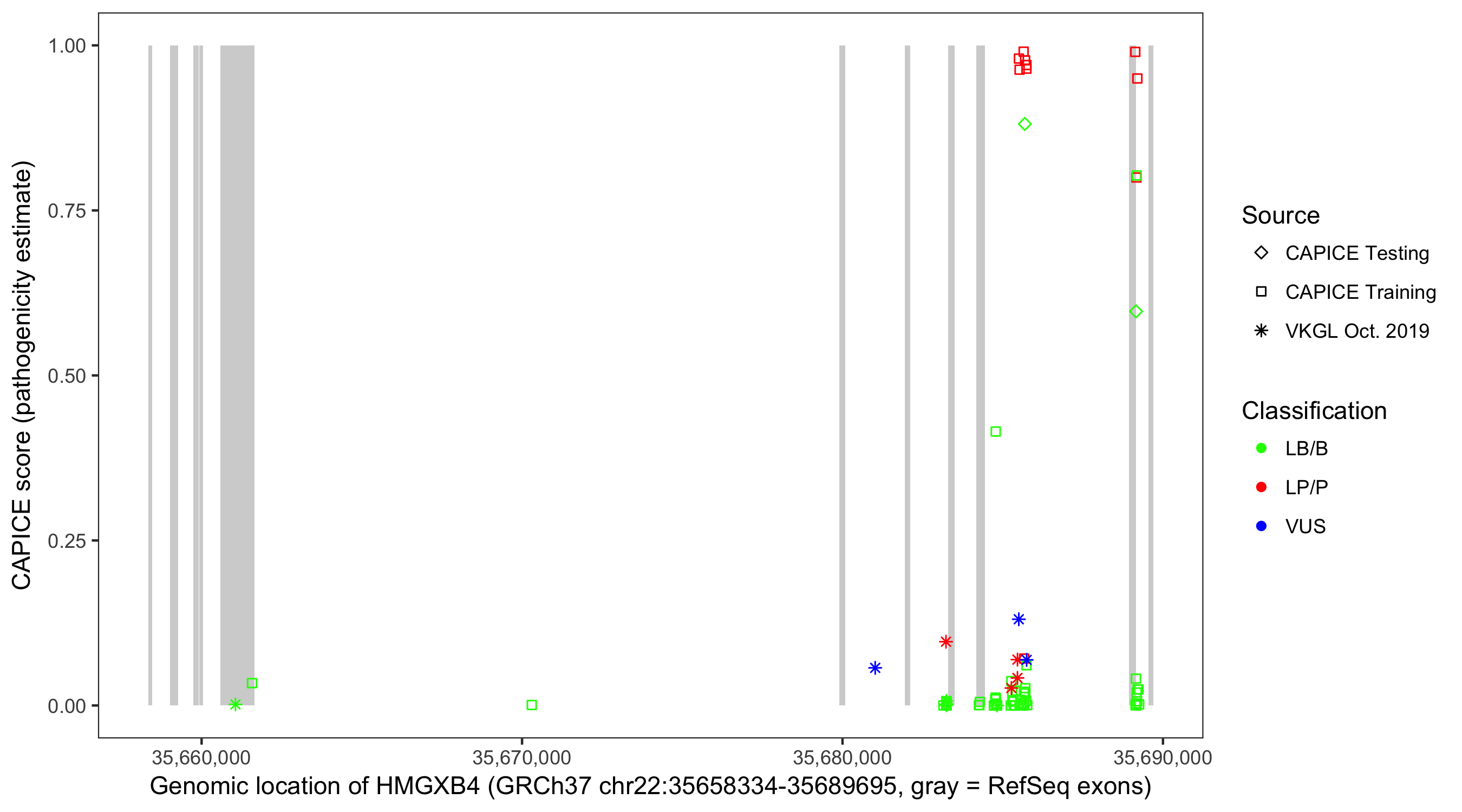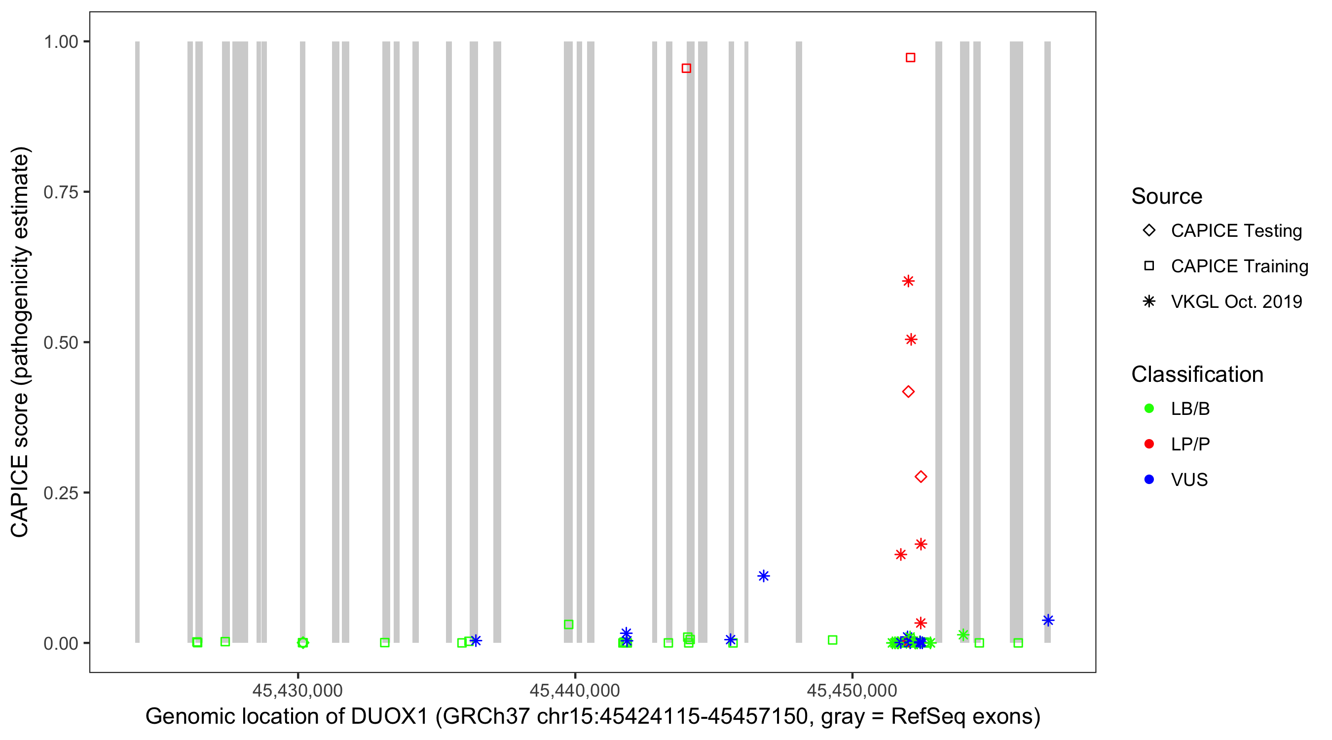 Shown are CAPICE train/test variants plus VKGL Oct 2019.