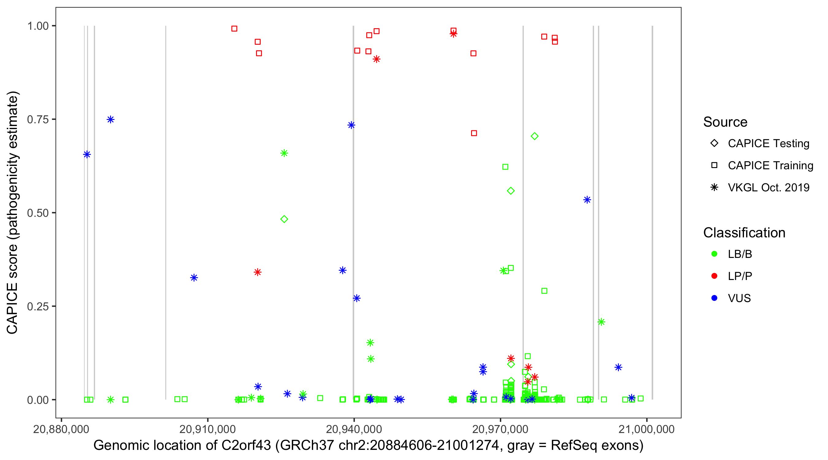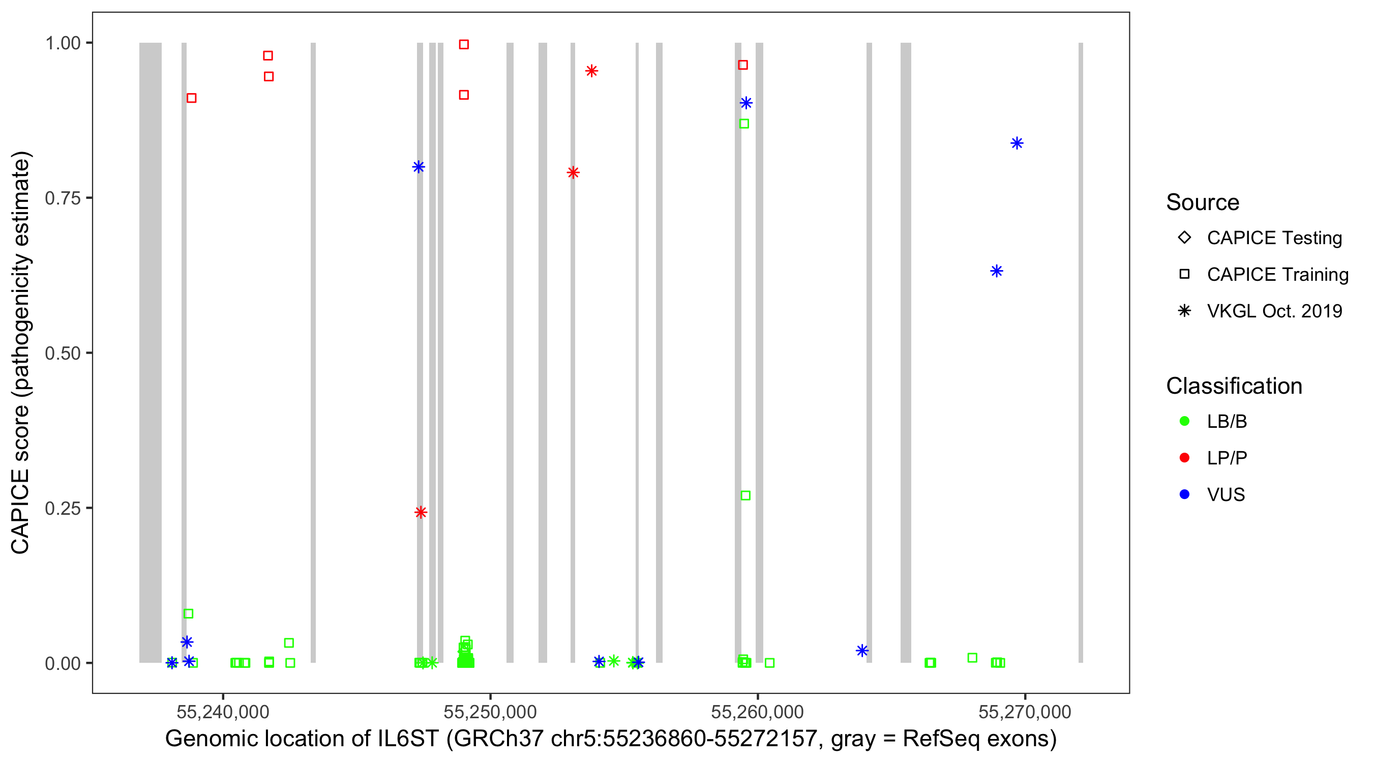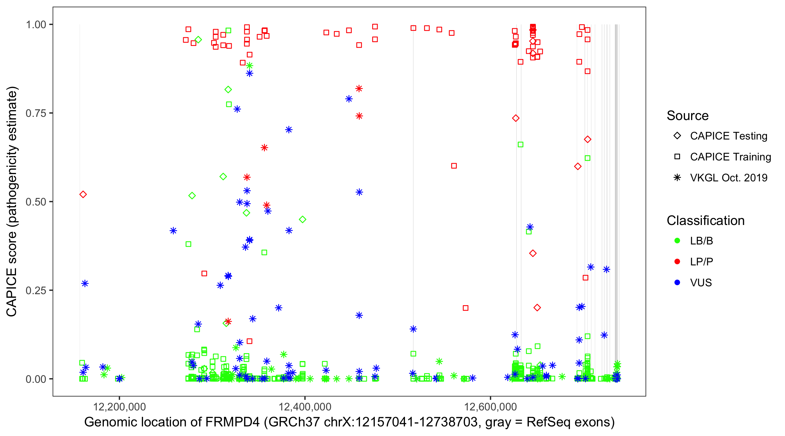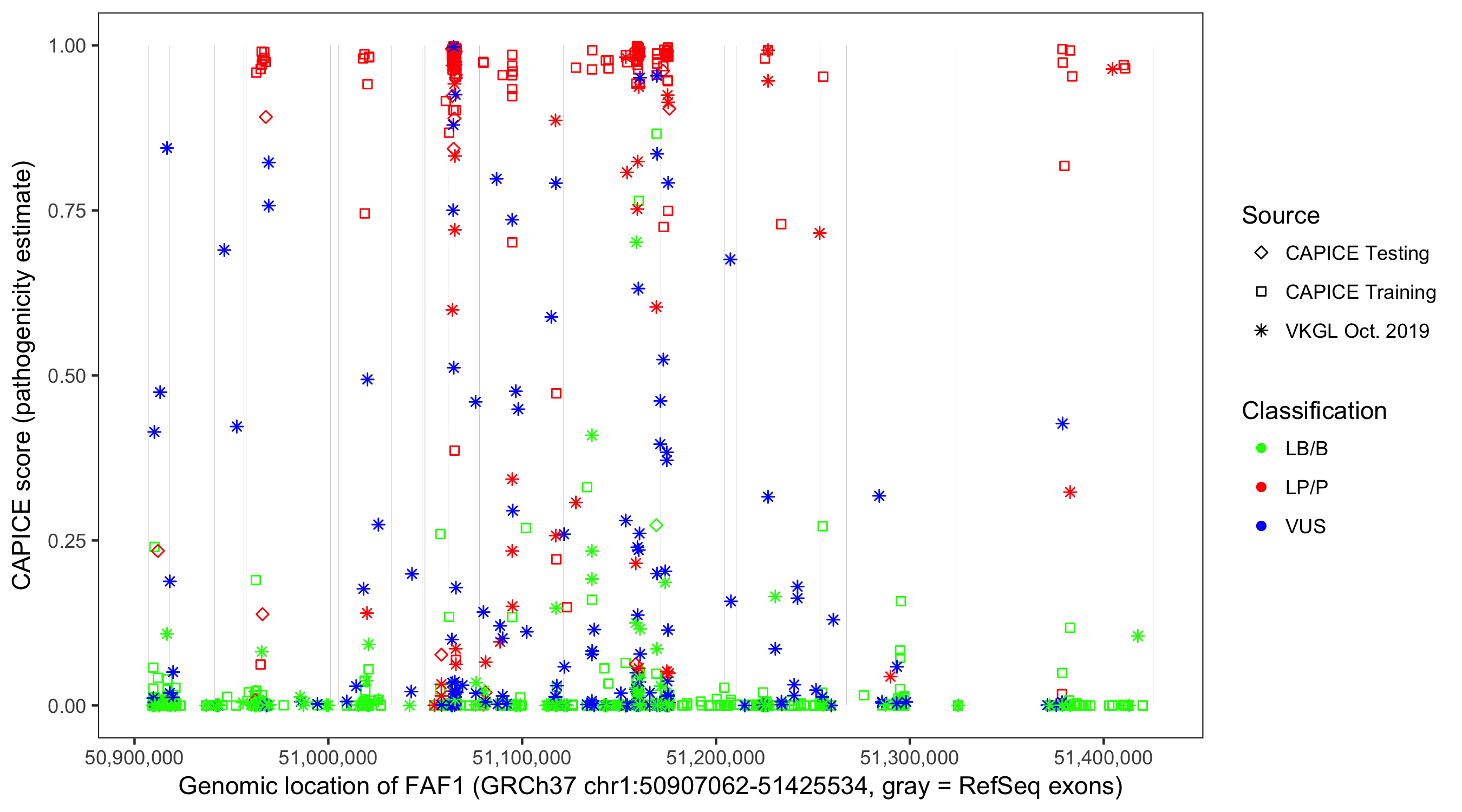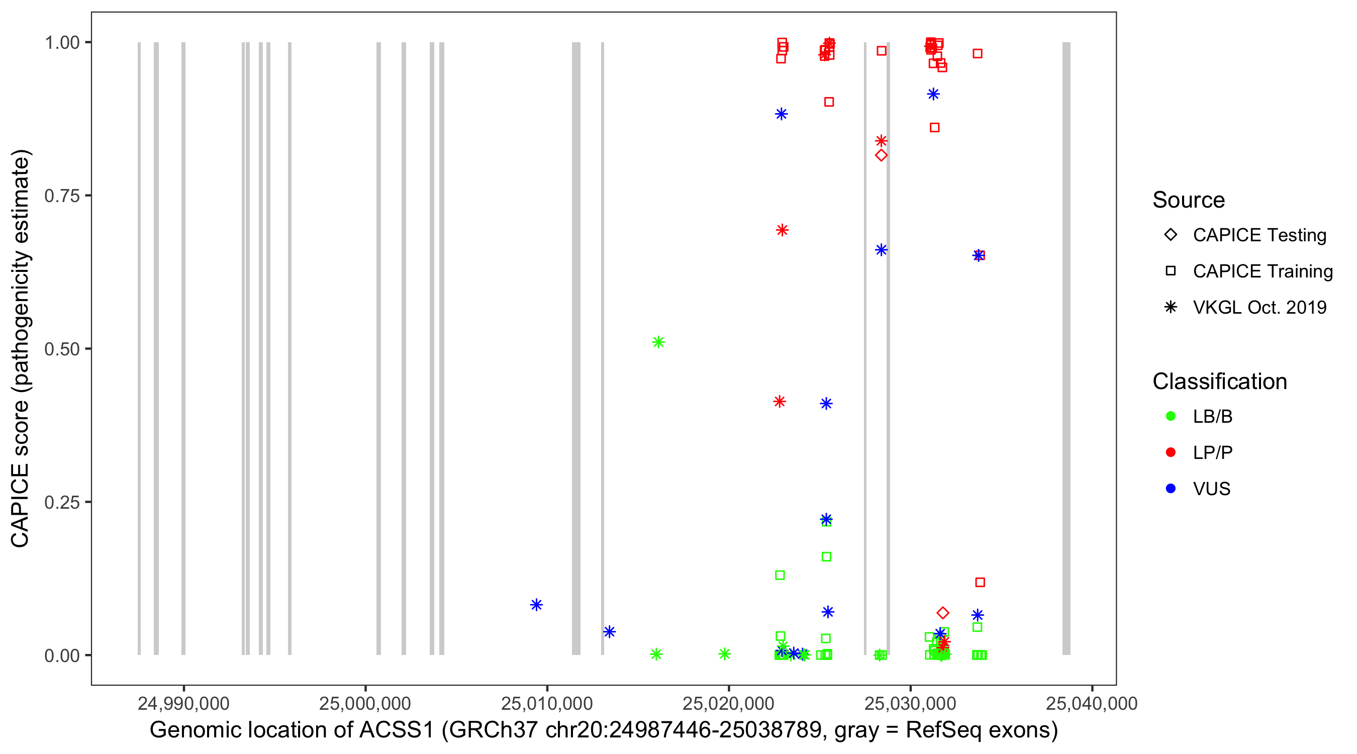 Shown are CAPICE train/test variants plus VKGL Oct 2019.