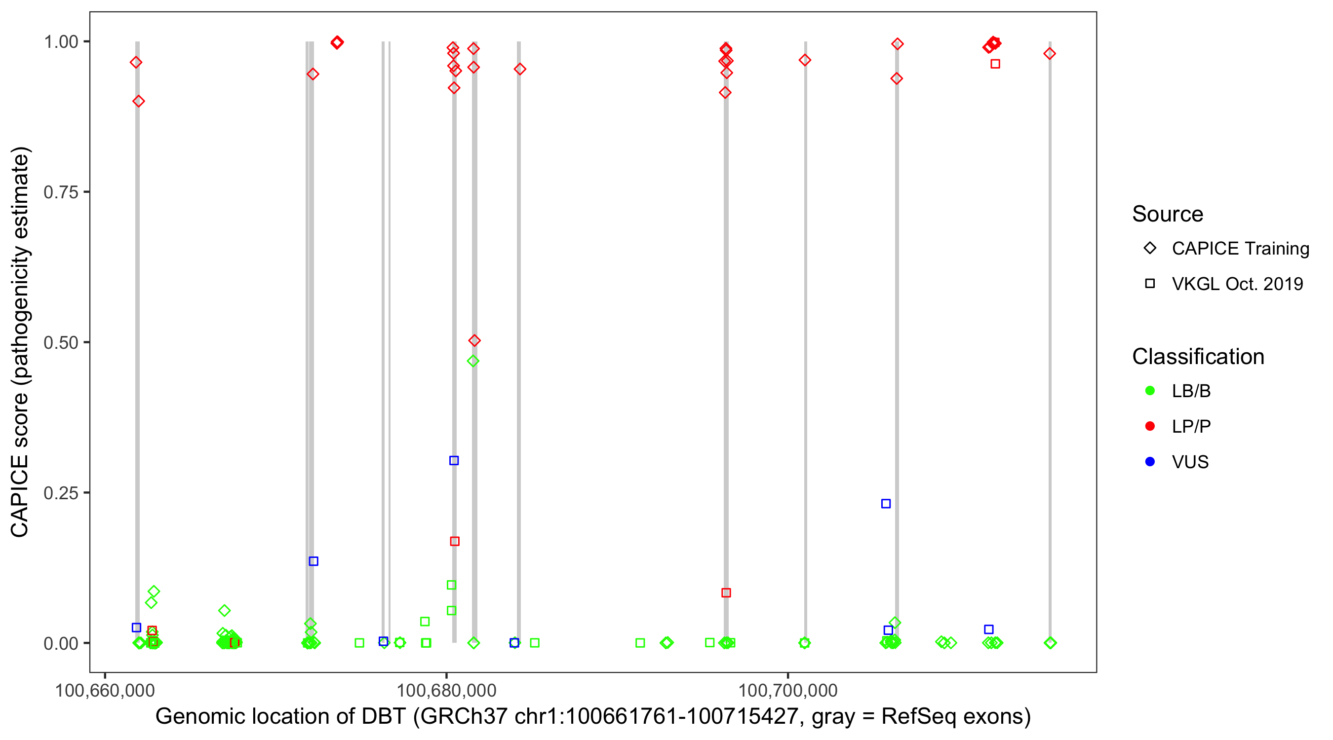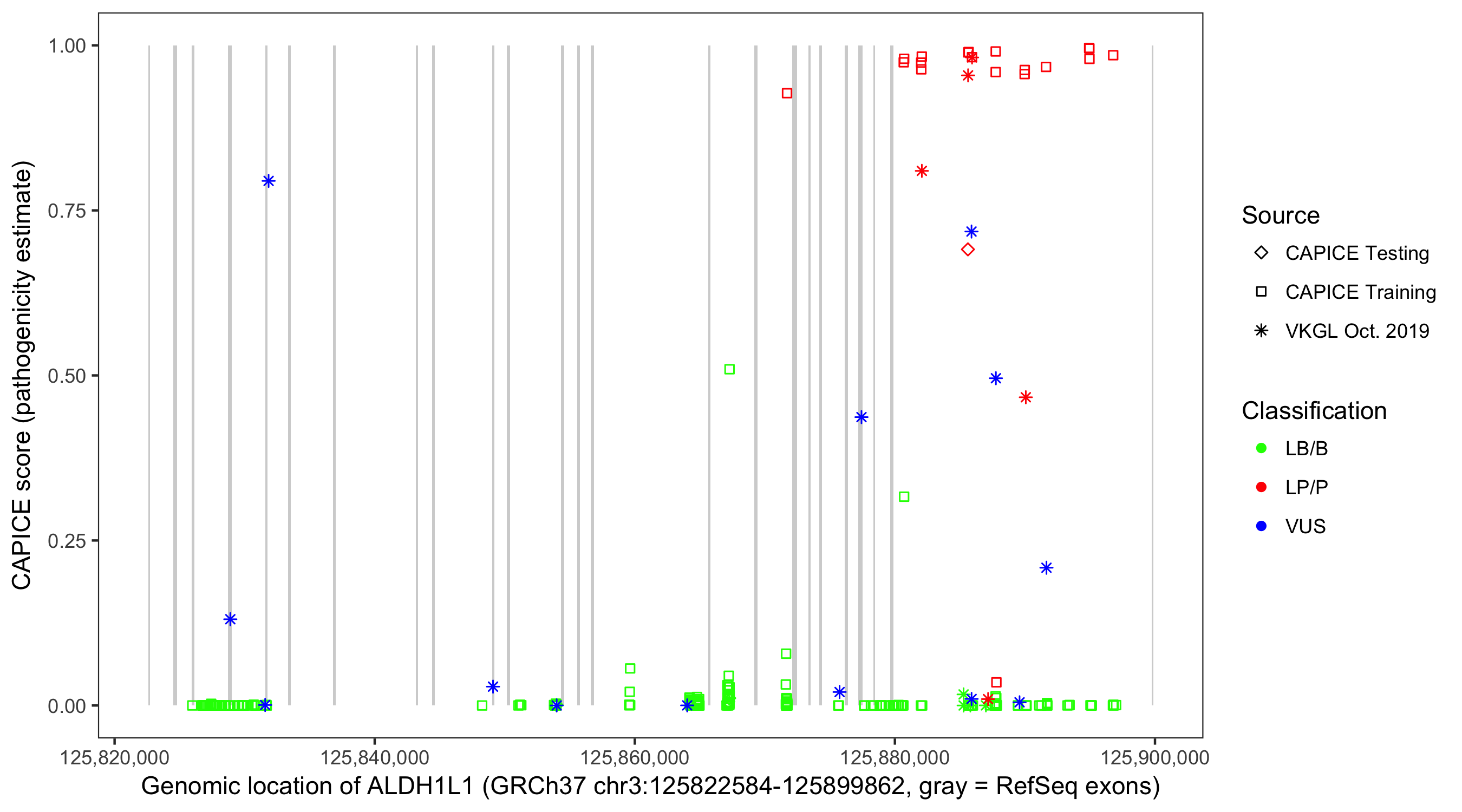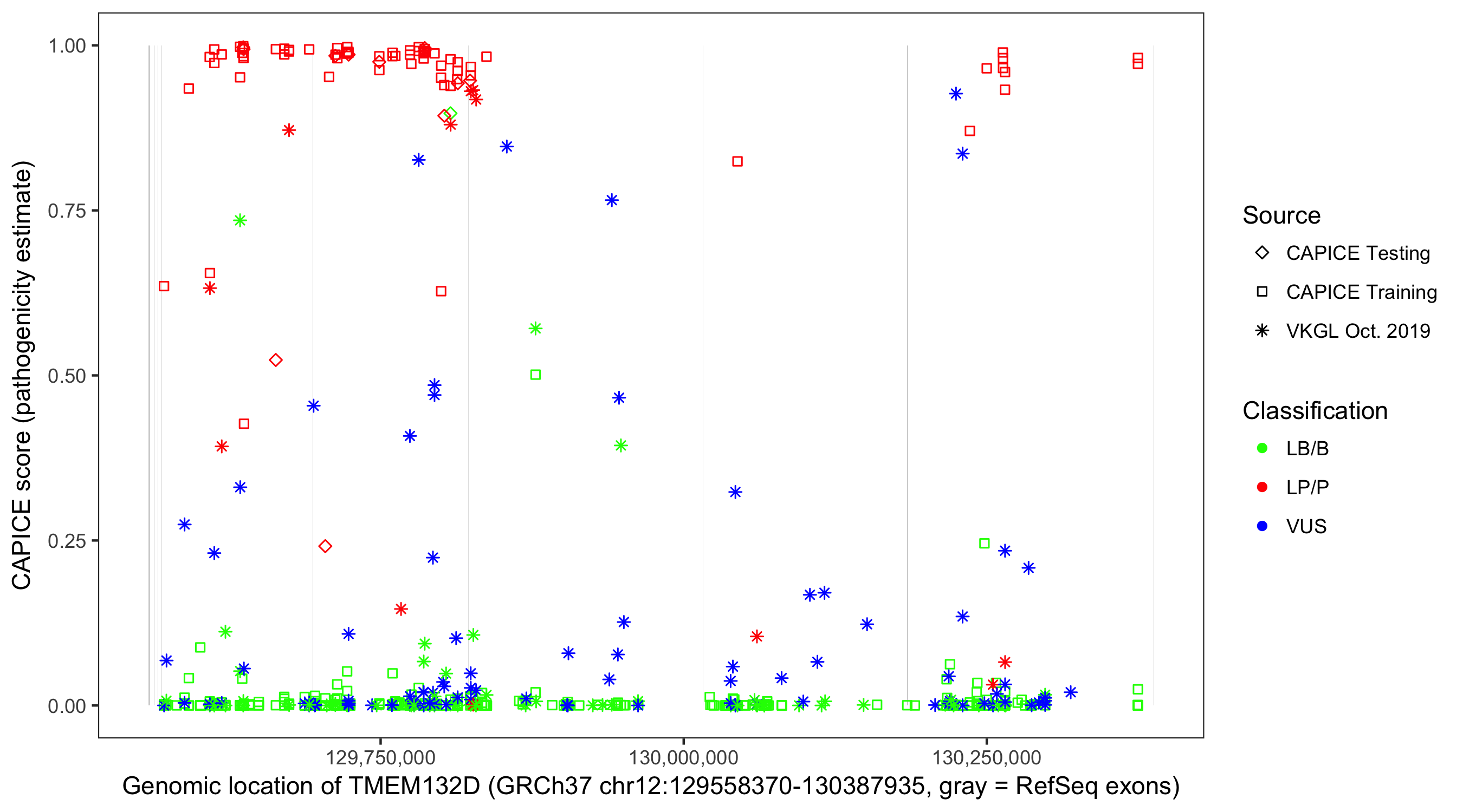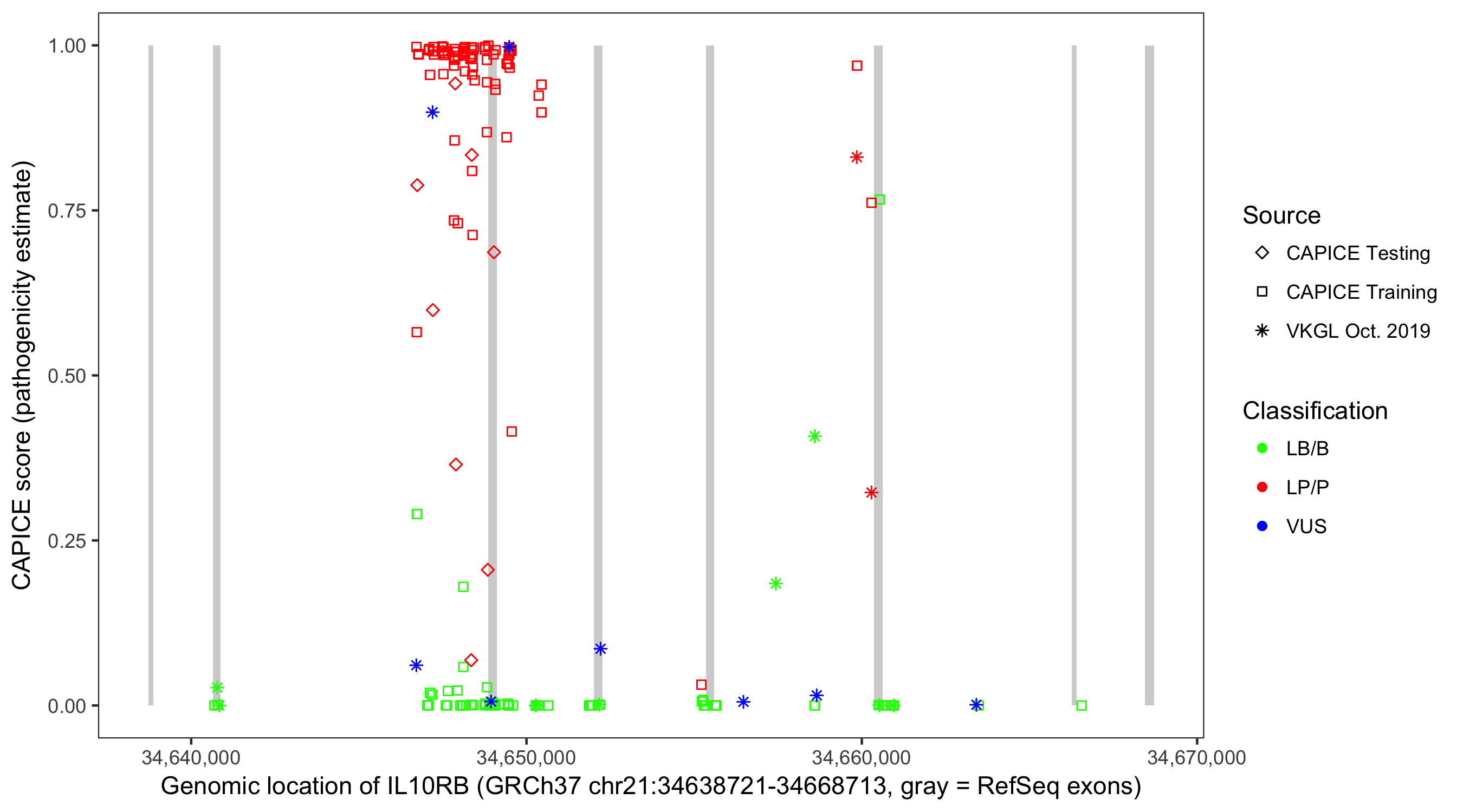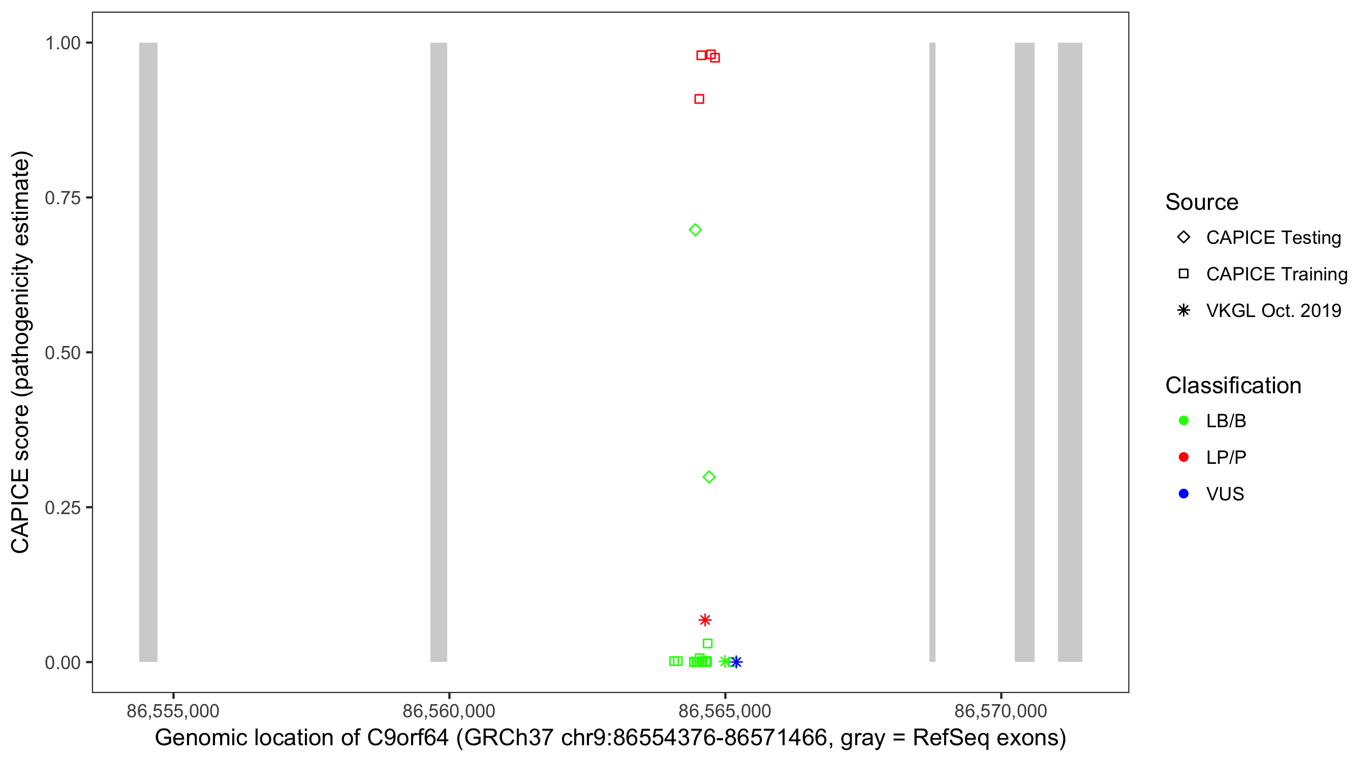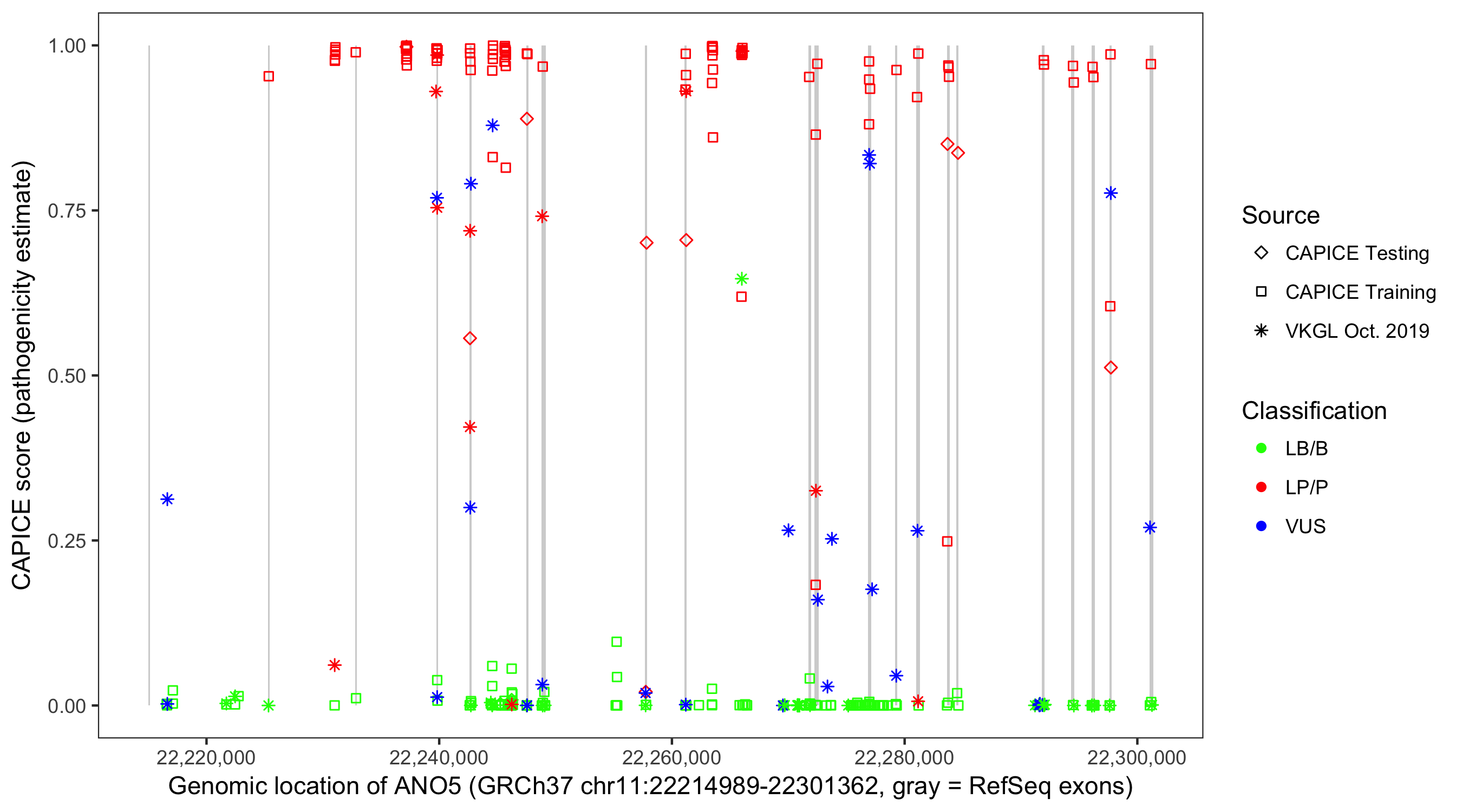 Shown are CAPICE train/test variants plus VKGL Oct 2019.